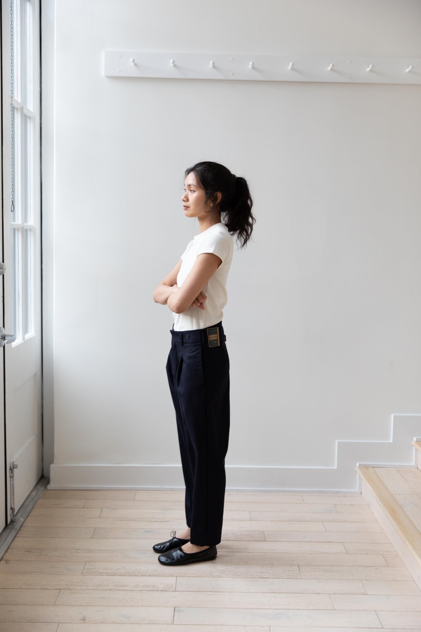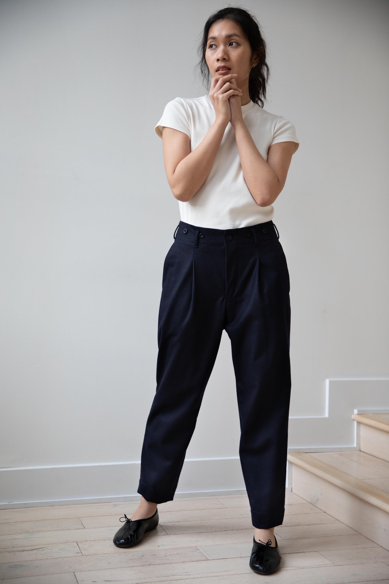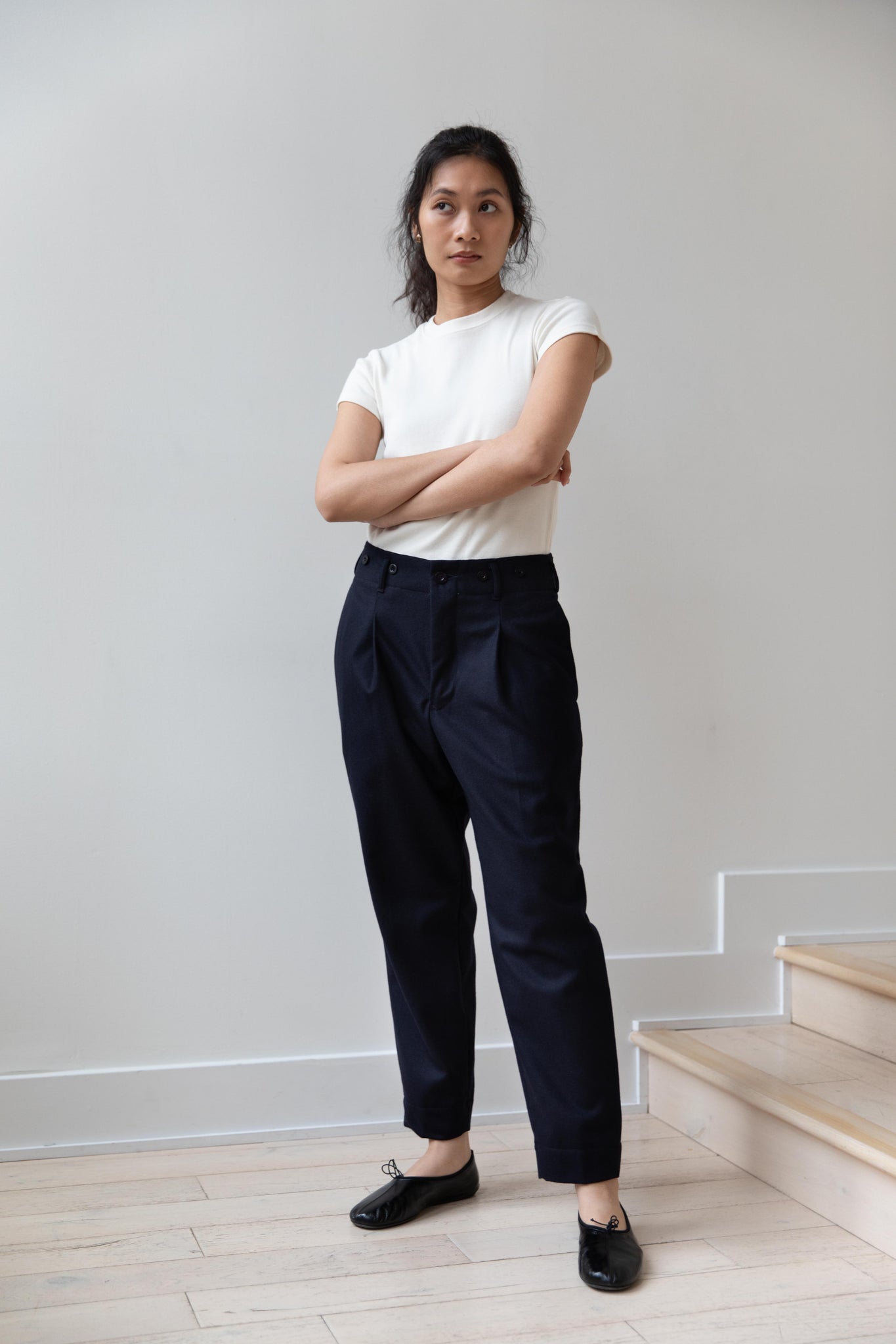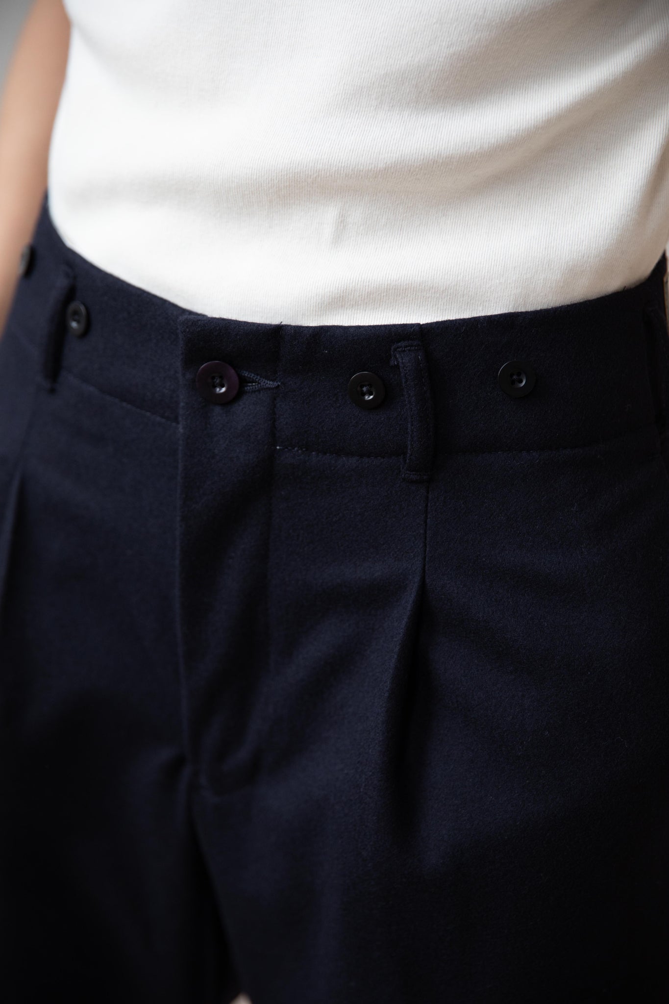 This easy narrow leg trousers is made of the softest wool blend that drapes oh so perfectly! There are pleats on the front and an adjustable tab on the back too. There are extra buttons on the front of the waist band and some on the back too if you feel the need to style them at any point with suspenders. Until then they are a nice decorative feature.