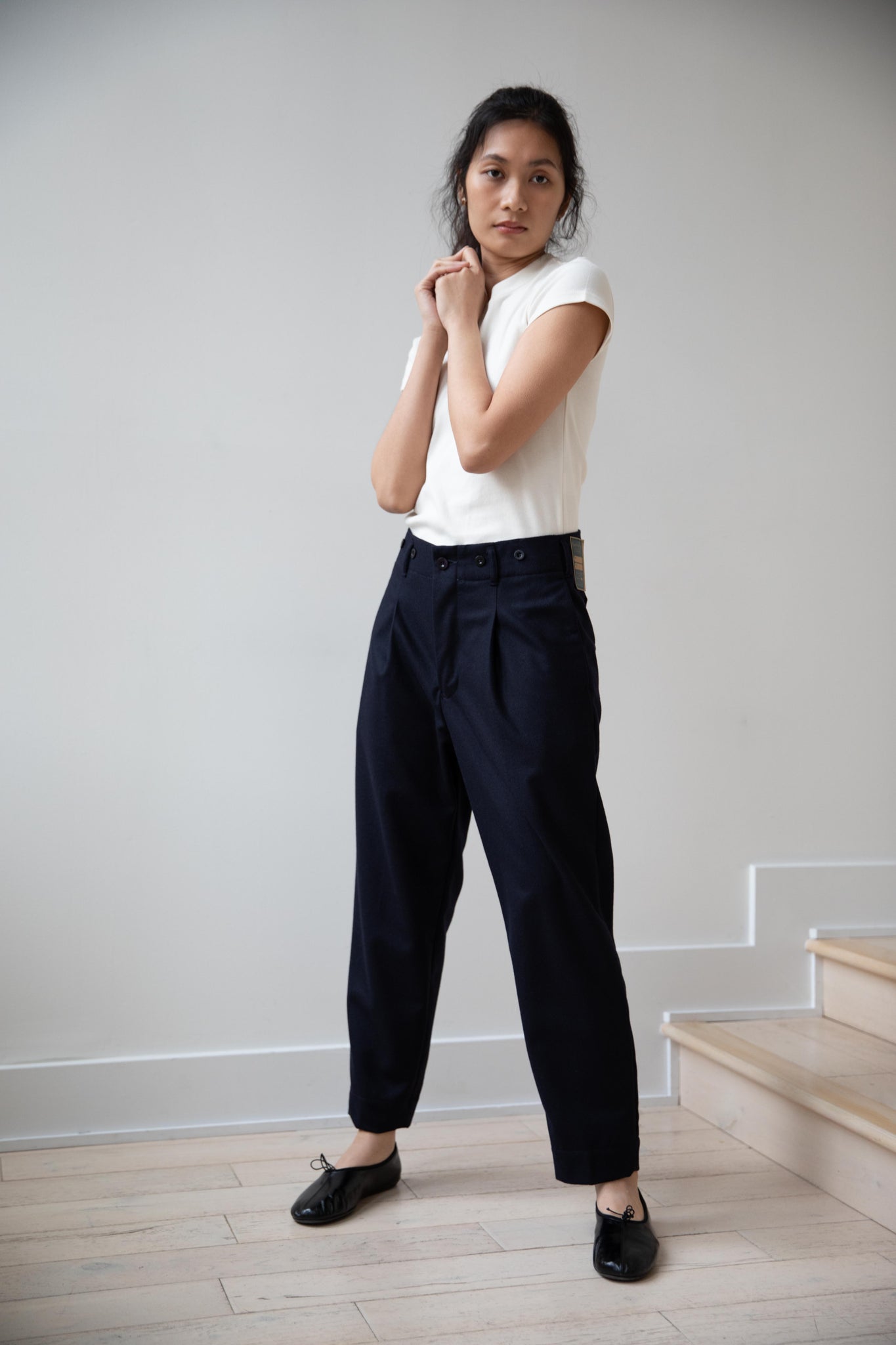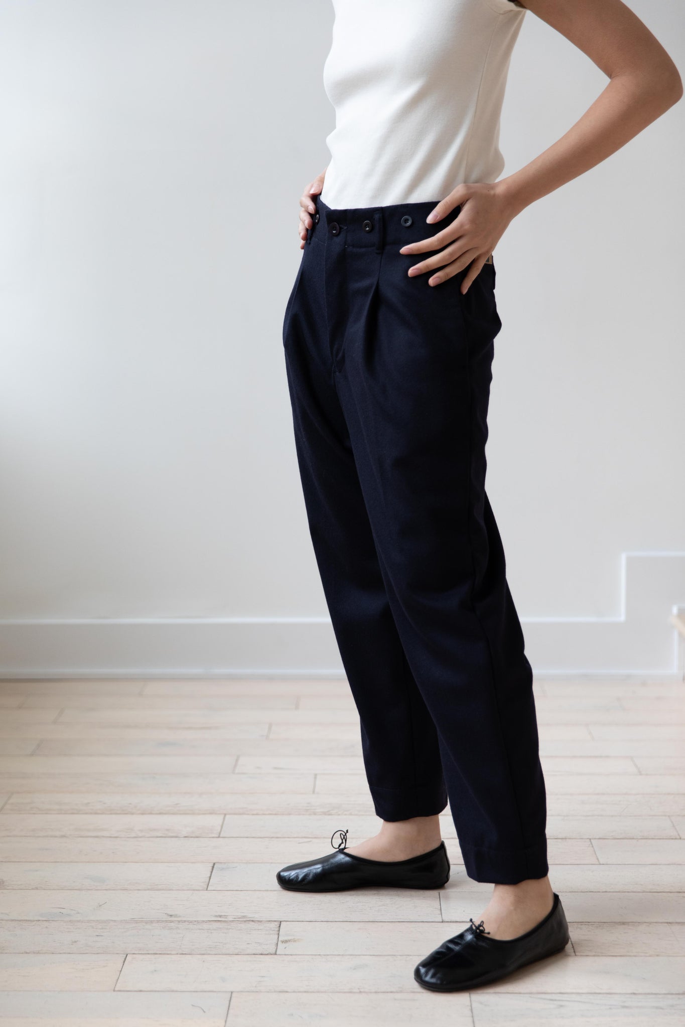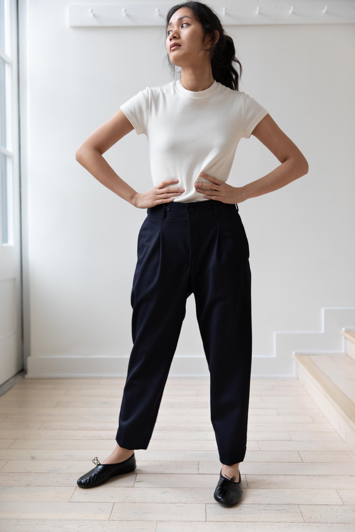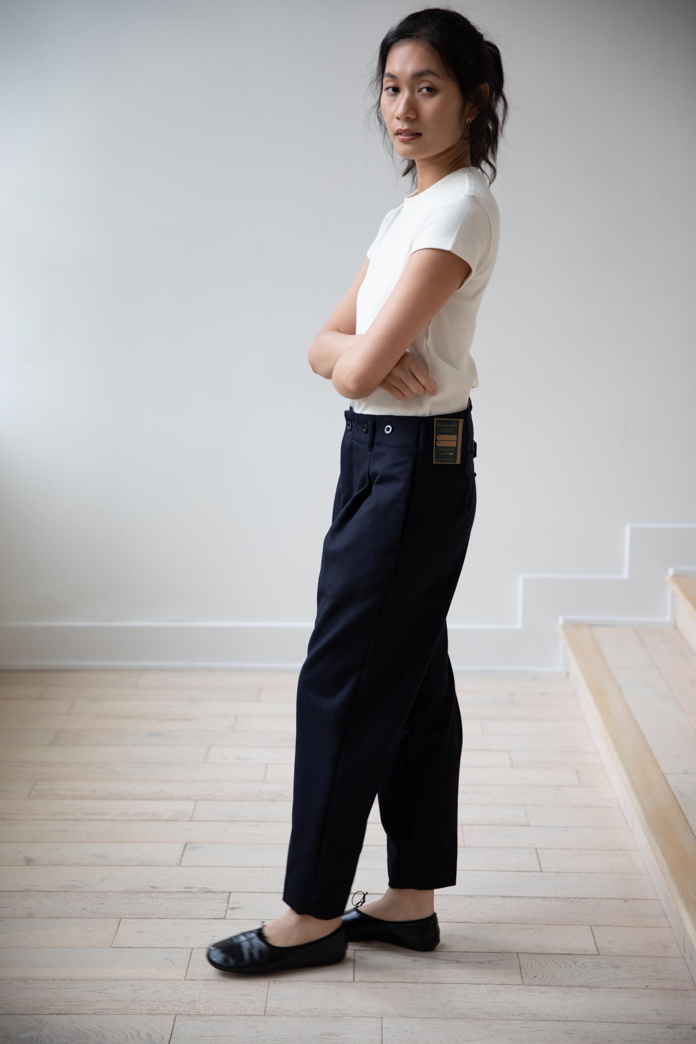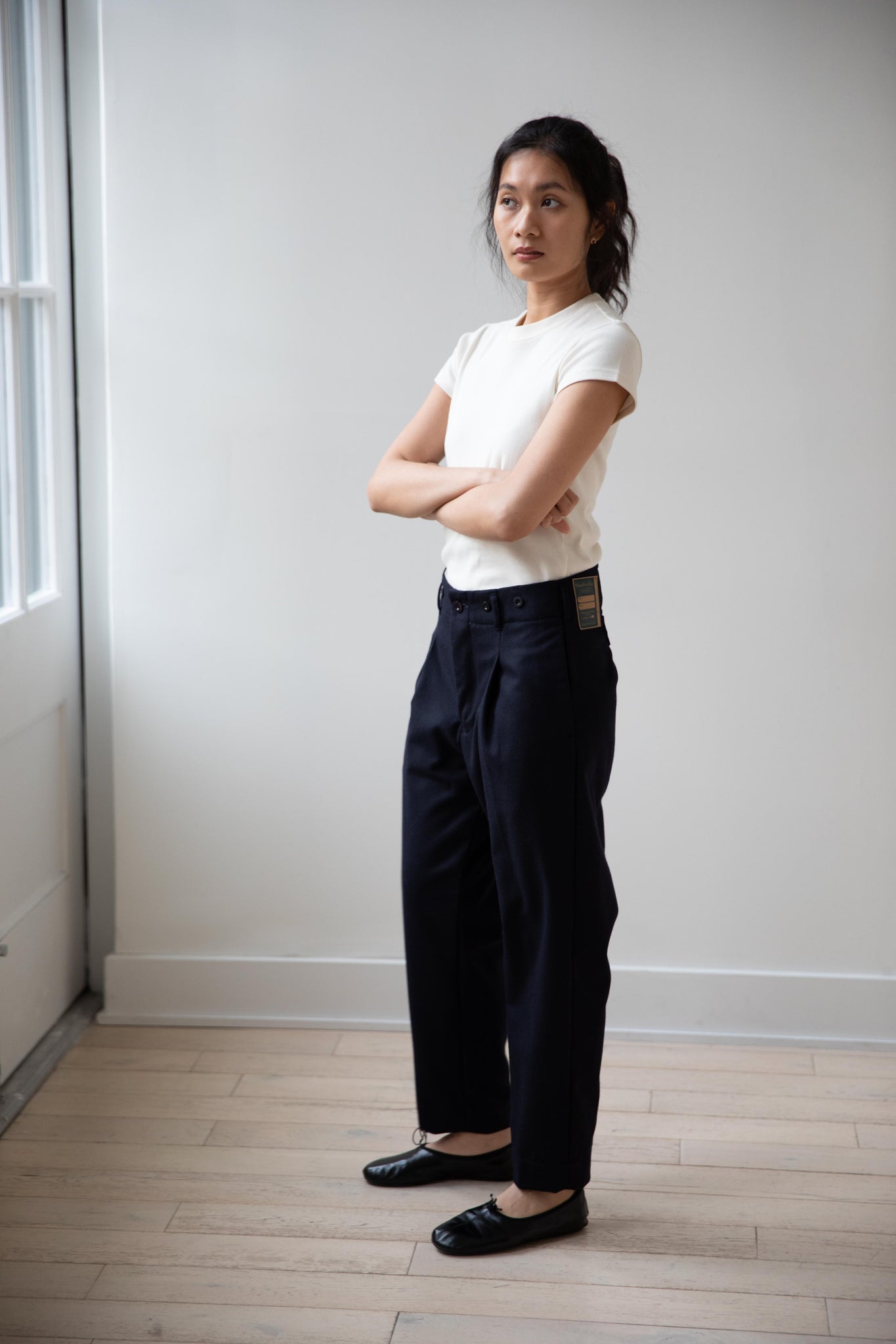 This easy narrow leg trousers is made of the softest wool blend that drapes oh so perfectly! There are pleats on the front and an adjustable tab on the back too. There are extra buttons on the front of the waist band and some on the back too if you feel the need to style them at any point with suspenders. Until then they are a nice decorative feature.