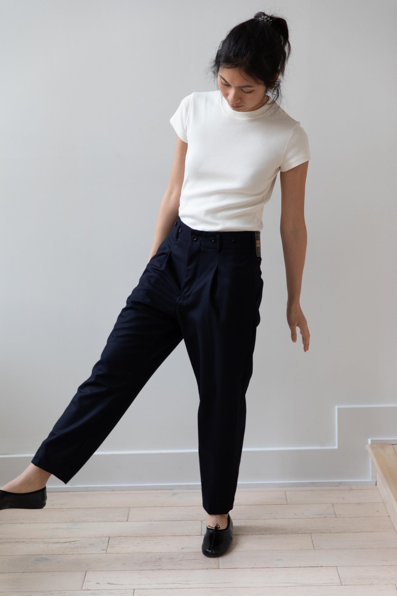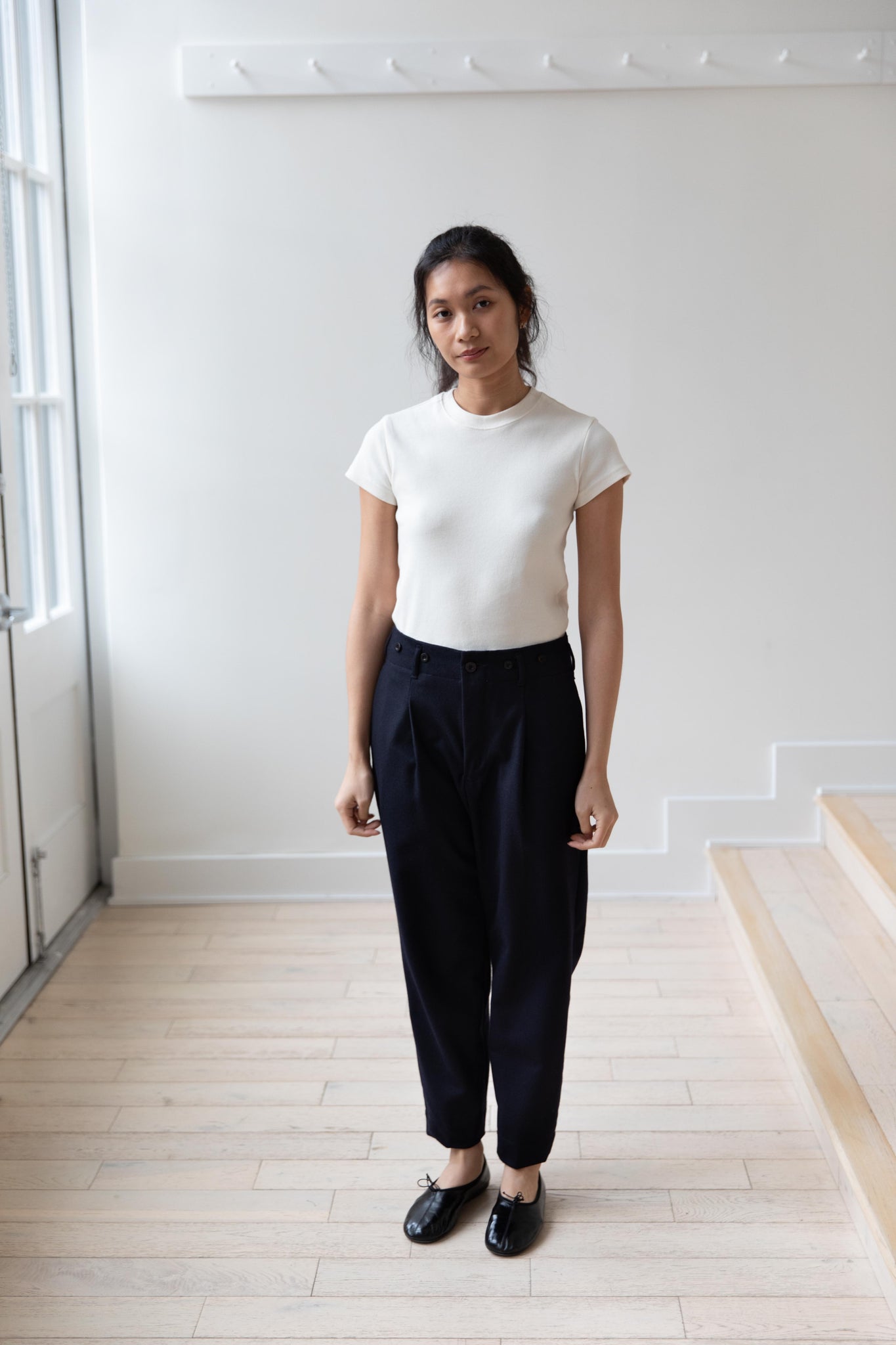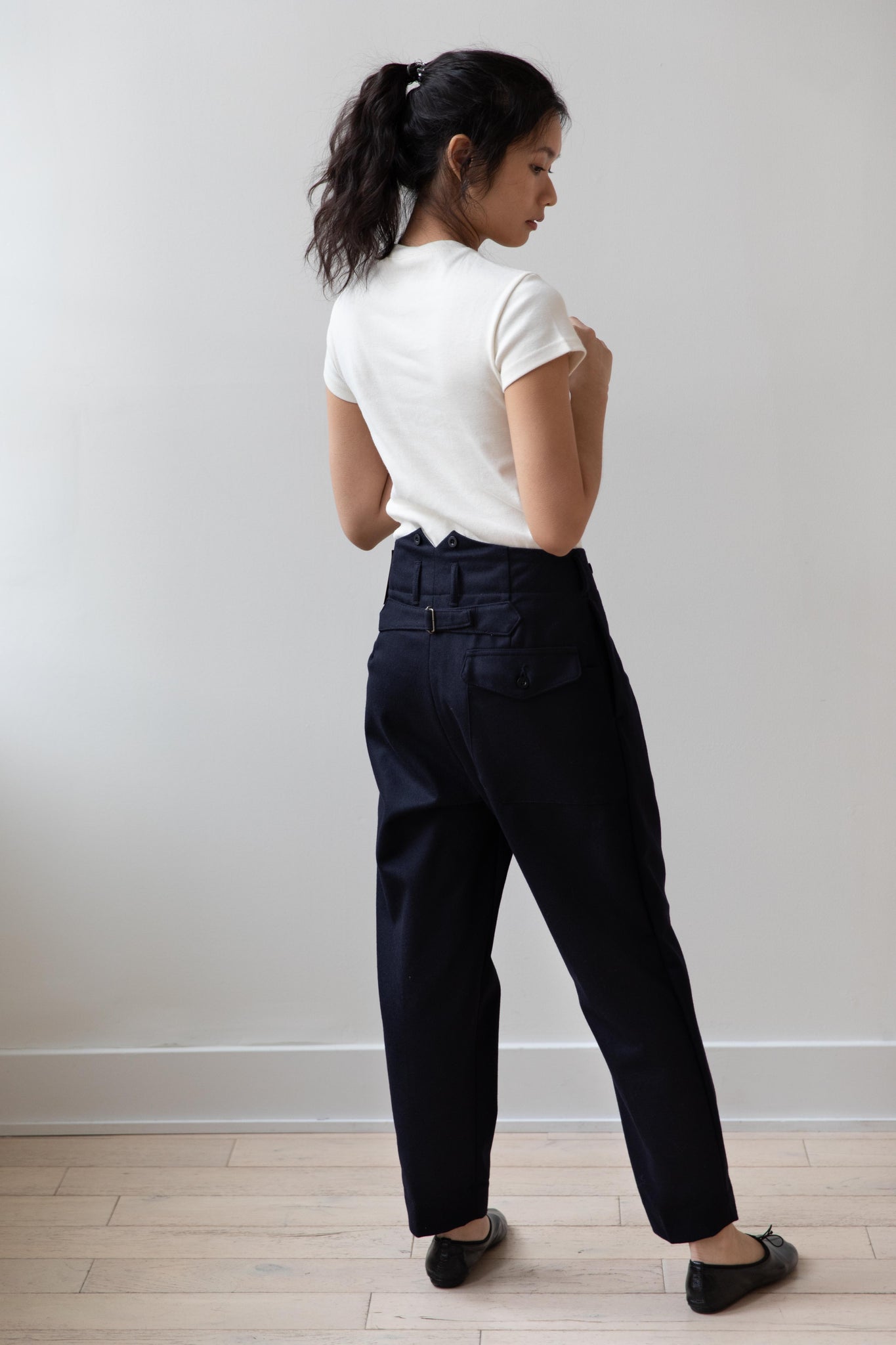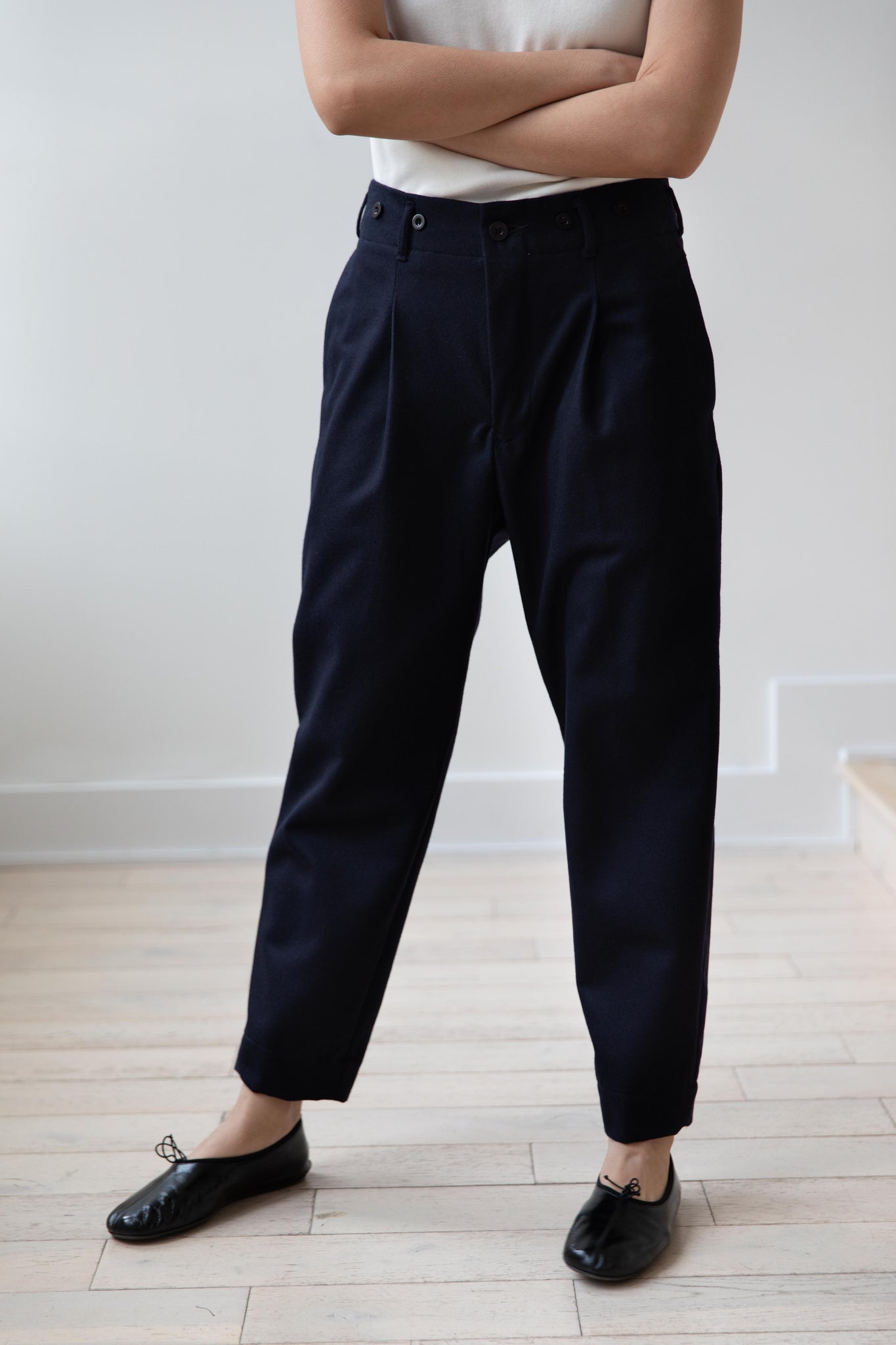 This easy narrow leg trousers is made of the softest wool blend that drapes oh so perfectly! There are pleats on the front and an adjustable tab on the back too. There are extra buttons on the front of the waist band and some on the back too if you feel the need to style them at any point with suspenders. Until then they are a nice decorative feature.