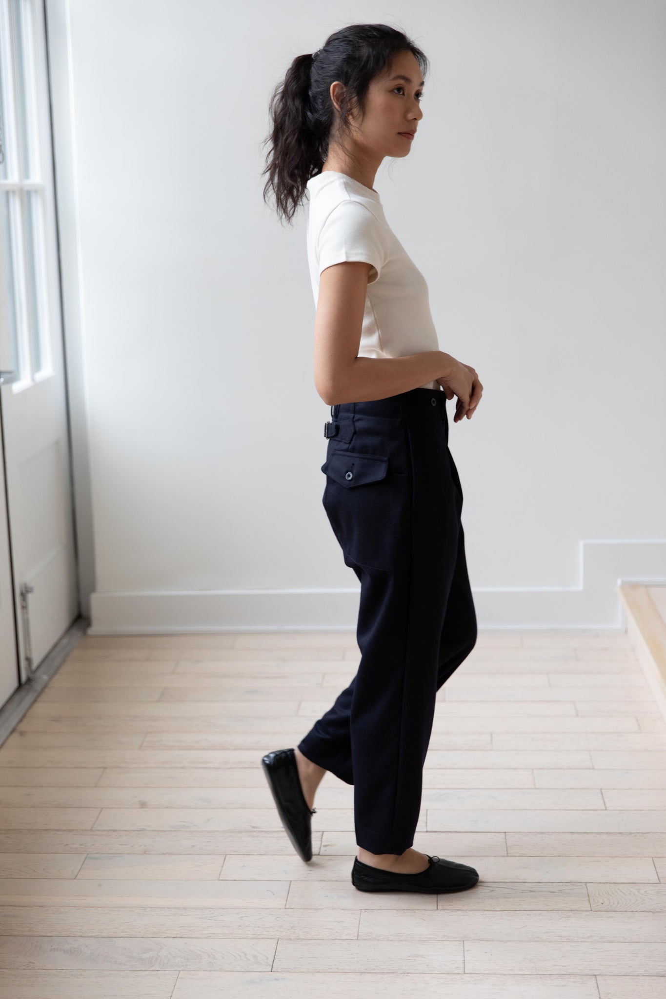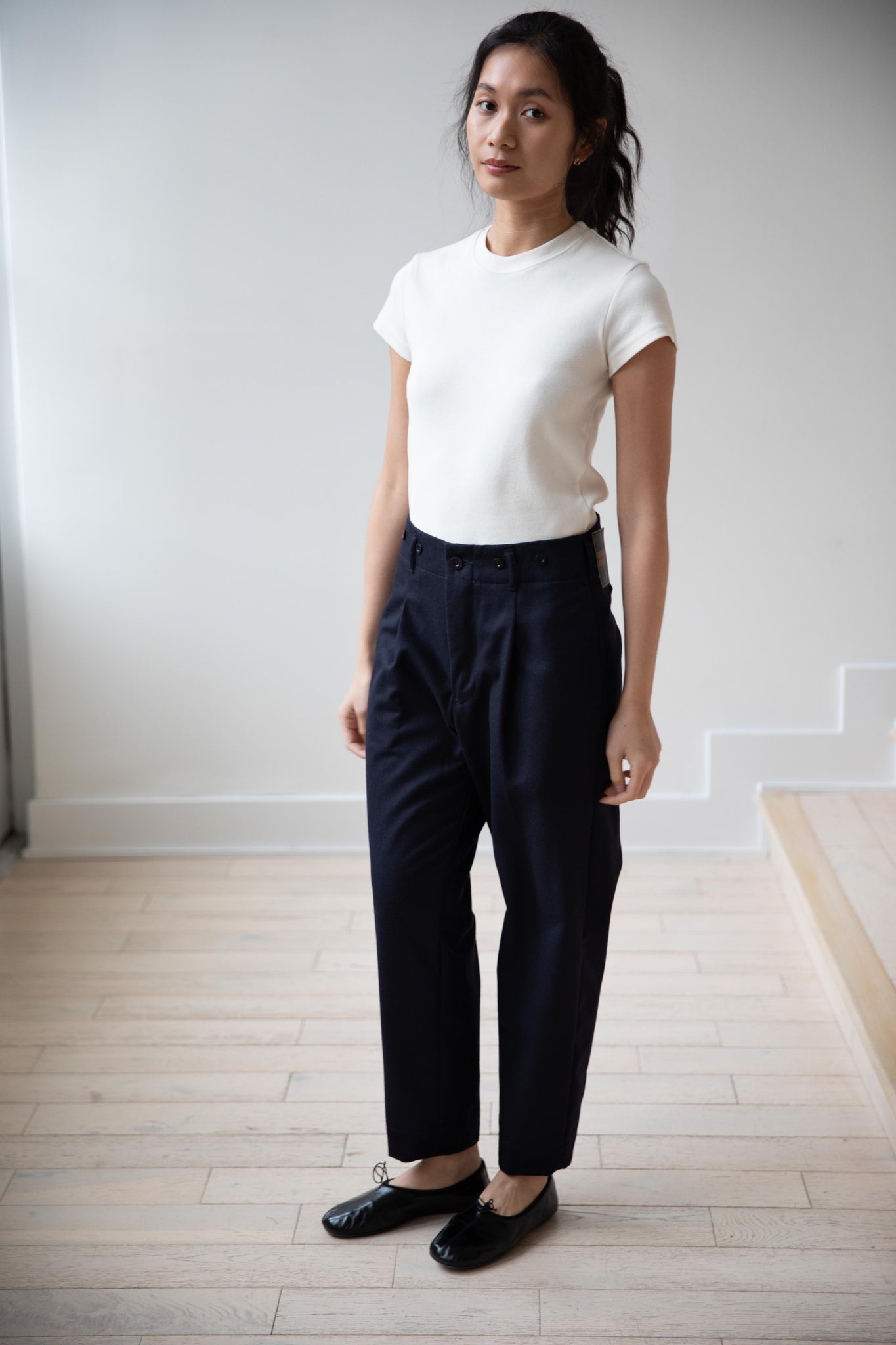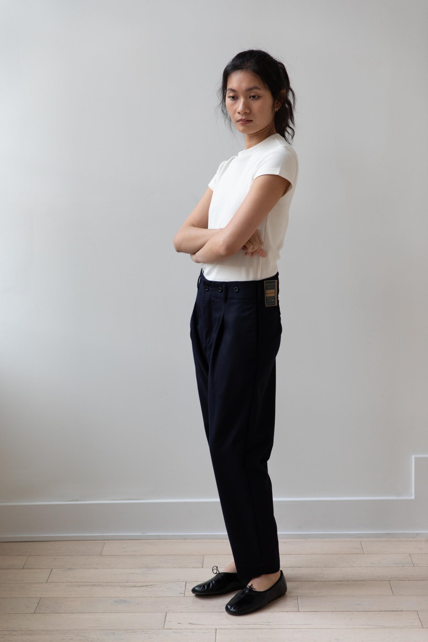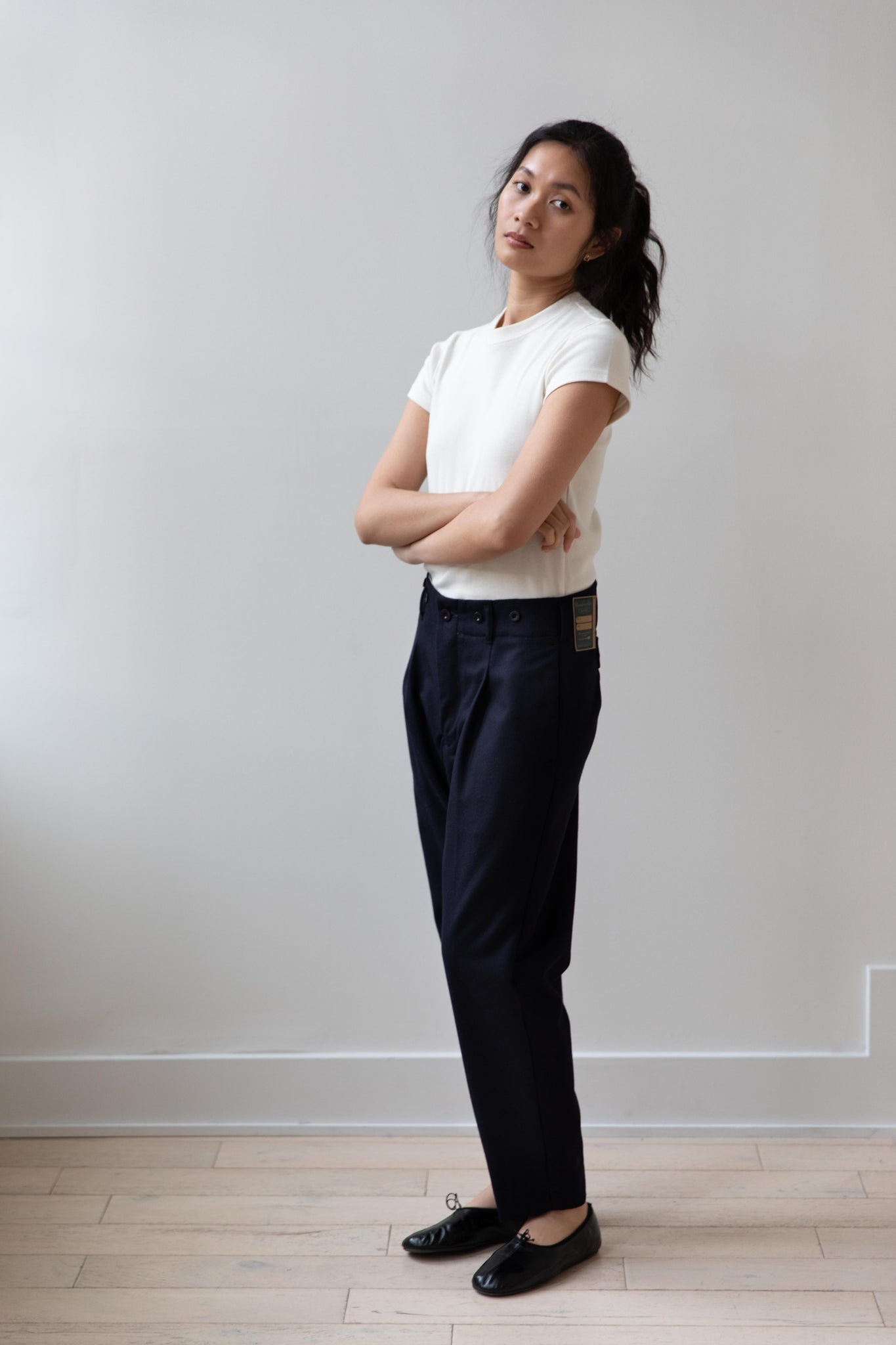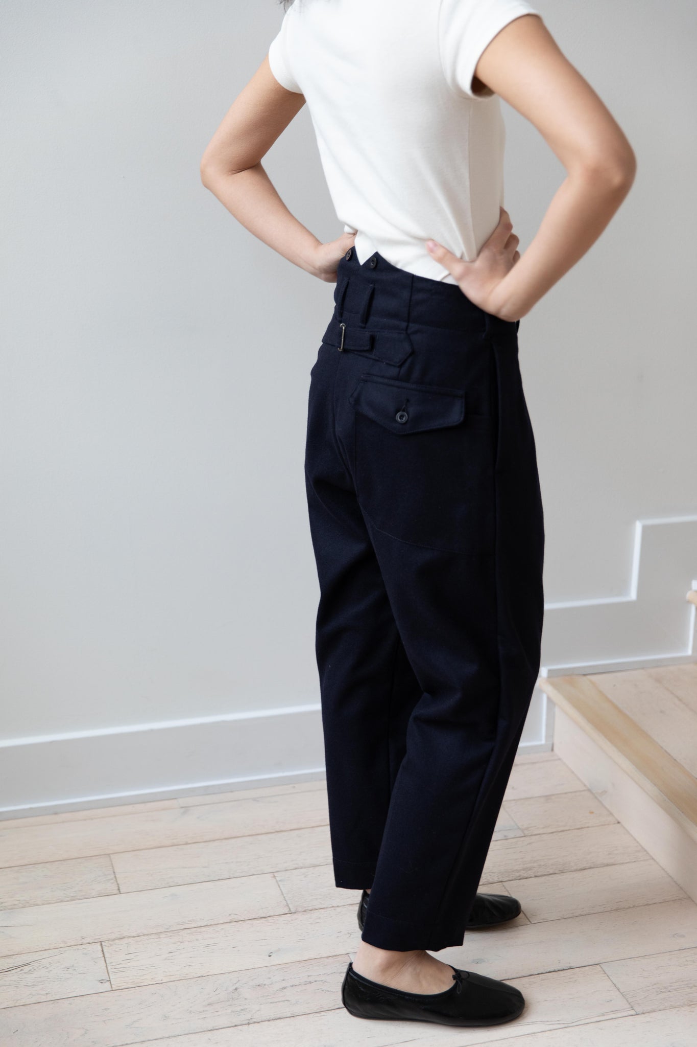 This easy narrow leg trousers is made of the softest wool blend that drapes oh so perfectly! There are pleats on the front and an adjustable tab on the back too. There are extra buttons on the front of the waist band and some on the back too if you feel the need to style them at any point with suspenders. Until then they are a nice decorative feature.