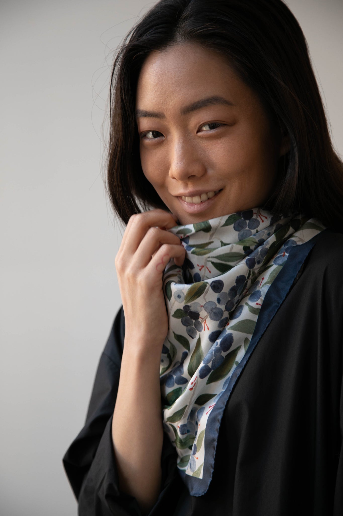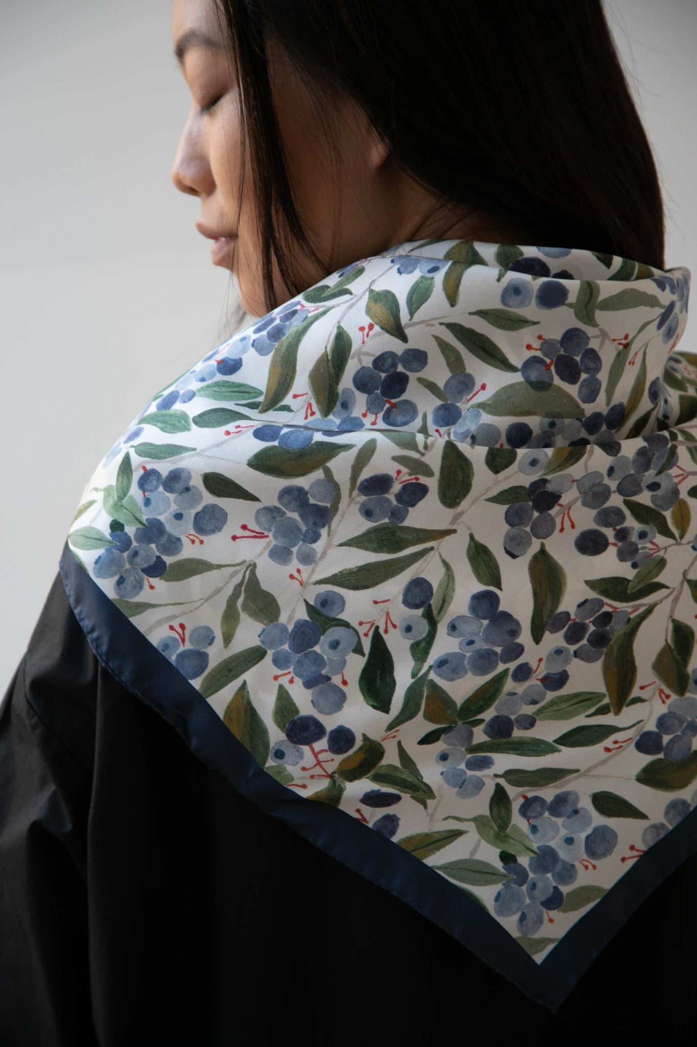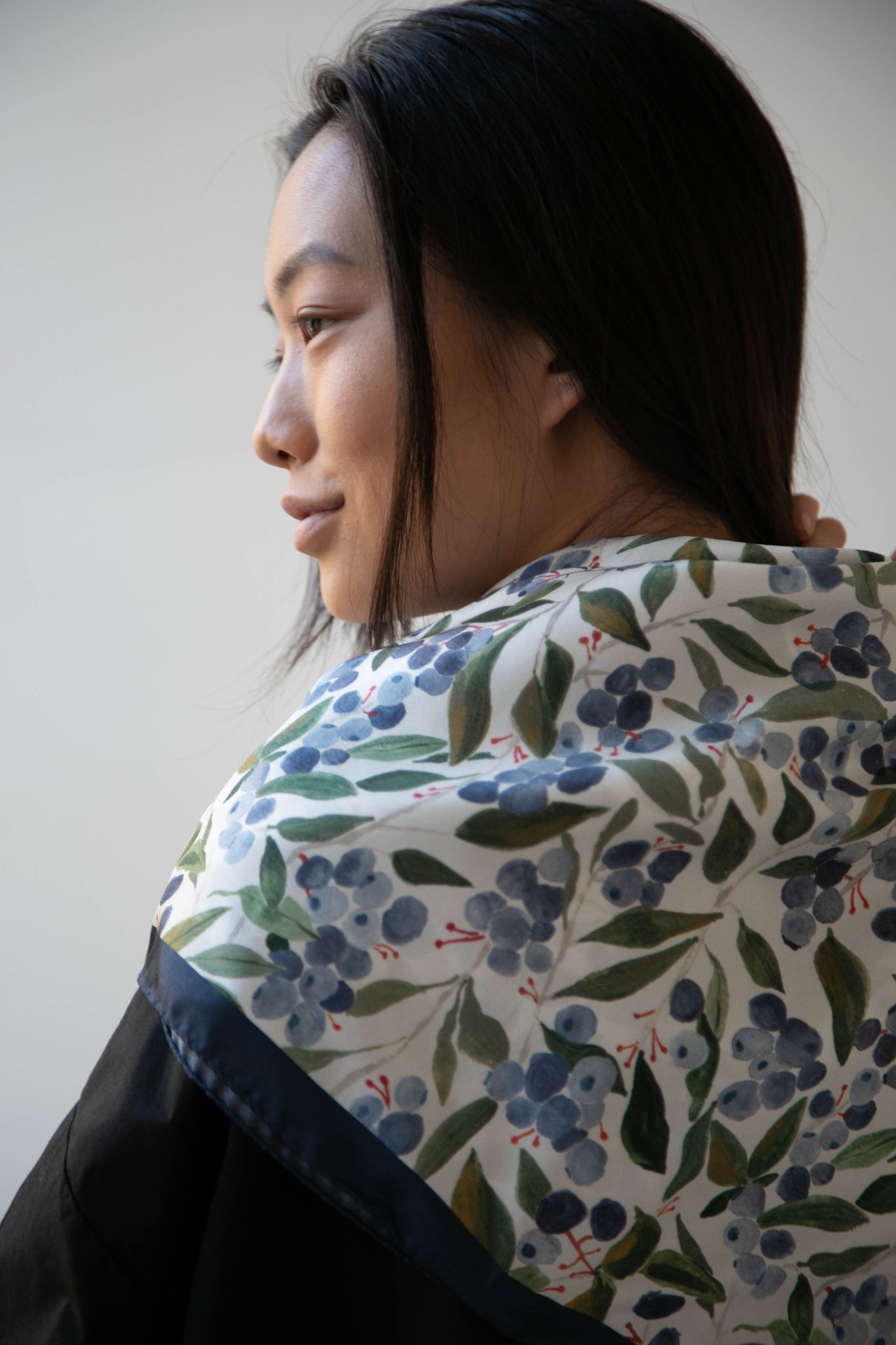 A beautiful scarf from Lettie Brigs in a fun blueberry print. We are over the moon about the designers illustrations and can imagine so many ways to wear and style it. Made of the softest silk and a perfect accent to any look.About Lettie Briggs
