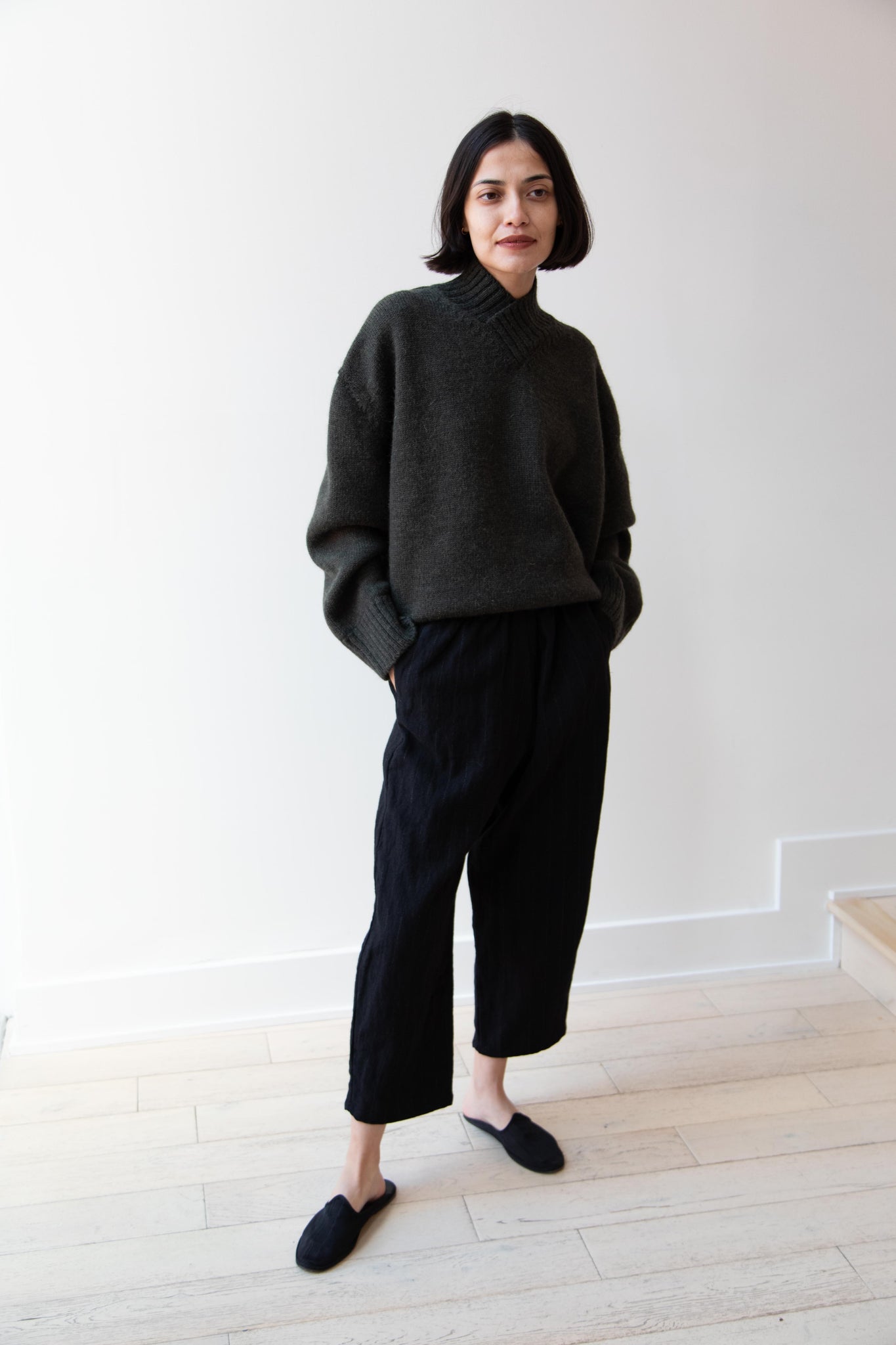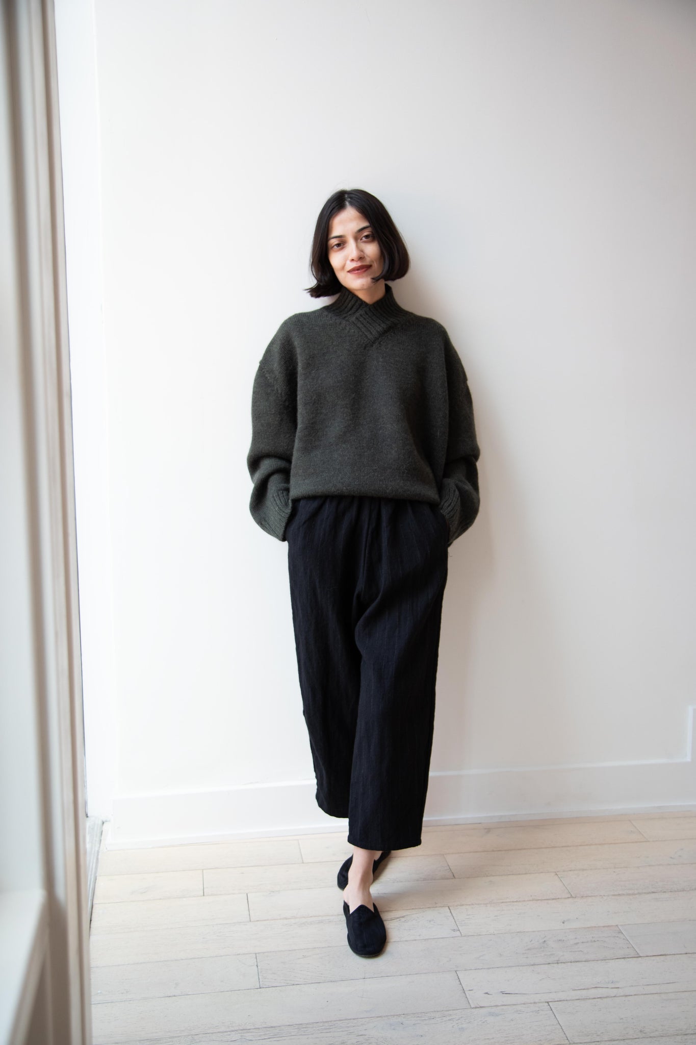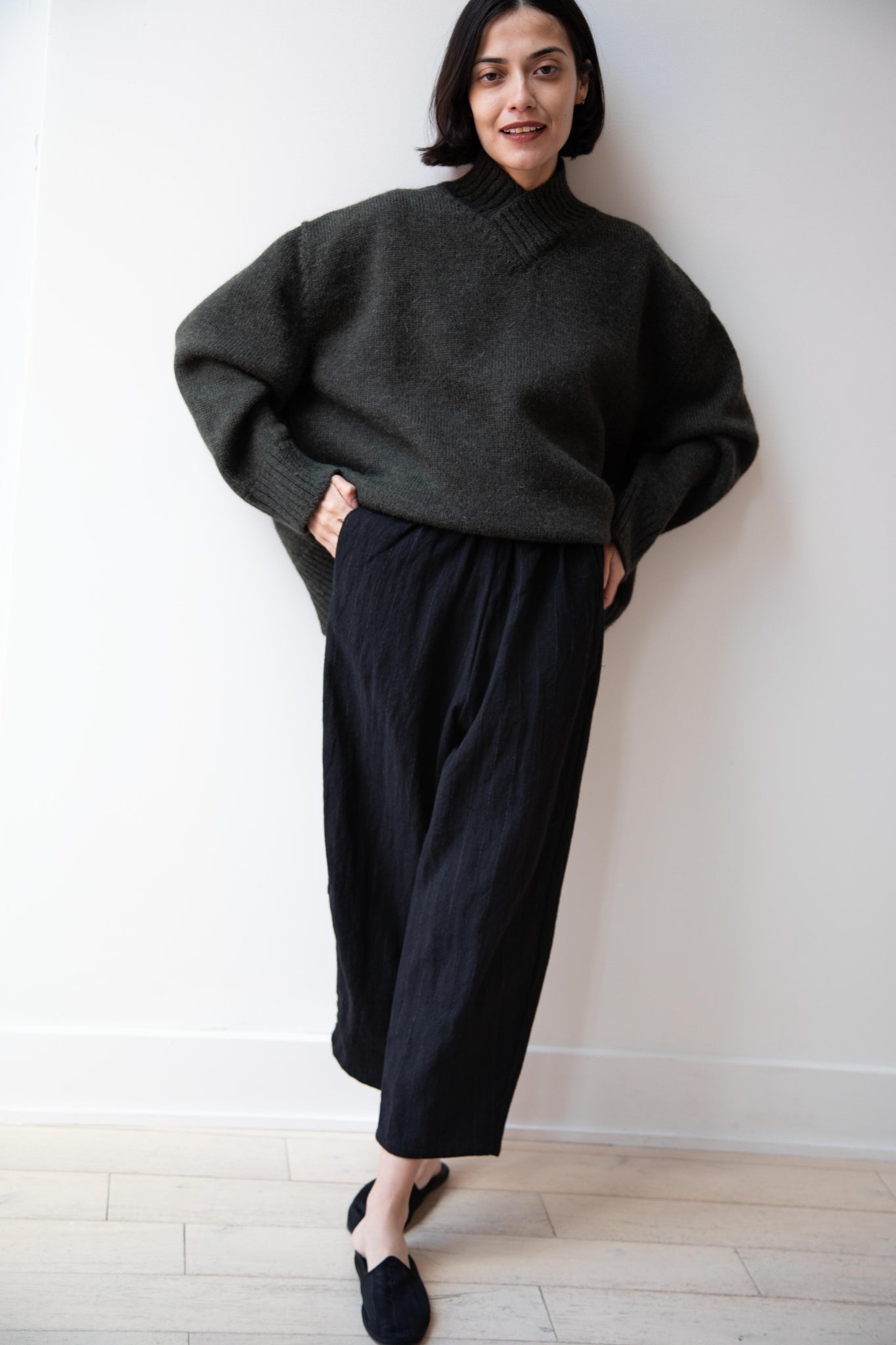 We love these easy pull on trousers, an Apuntob classic. With a slight taper and the perfect crop, they are casual yet elevated. The fabric is a subtle wool linen pin stripe - the pin stripe you can't quite see from a distance, but on closer inspection it's such a nice detail. A great all rounder!