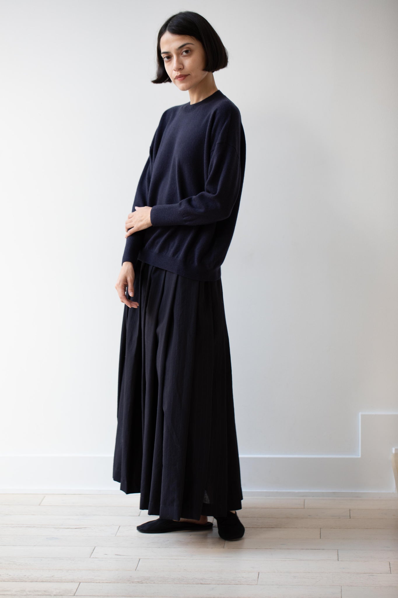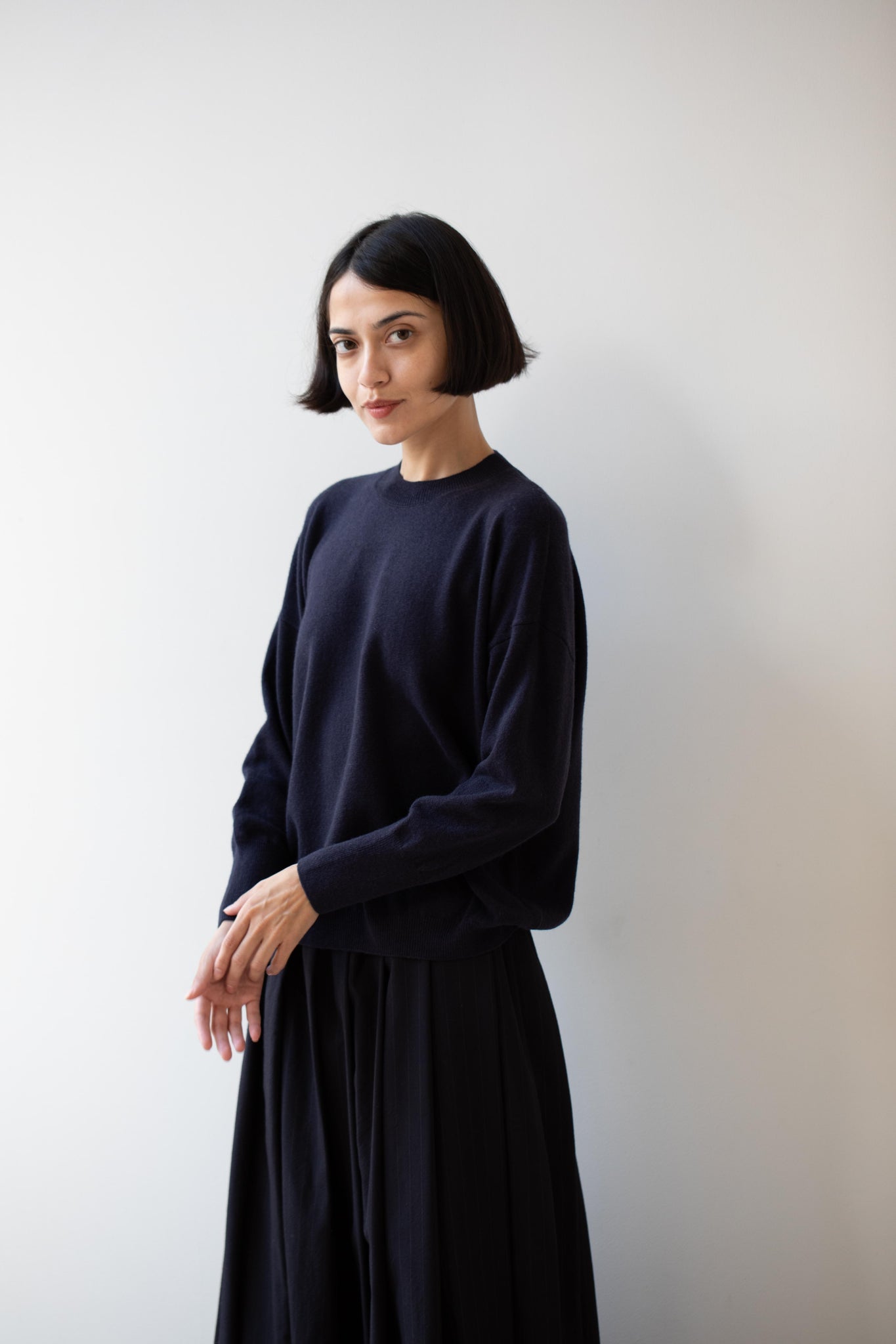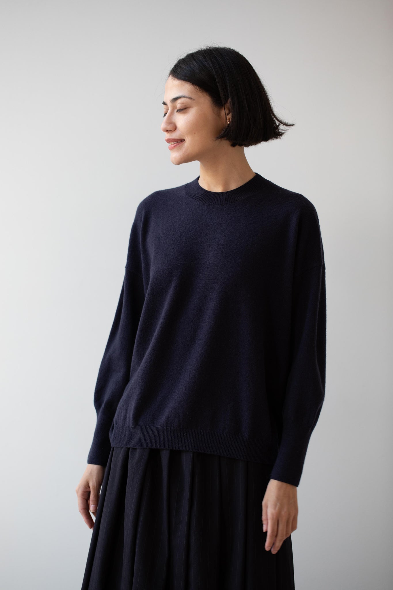 This pullover sweater is made from a beautiful lightweight cashmere yarn. It has a crew neck and a ribbed hem and sleeves.