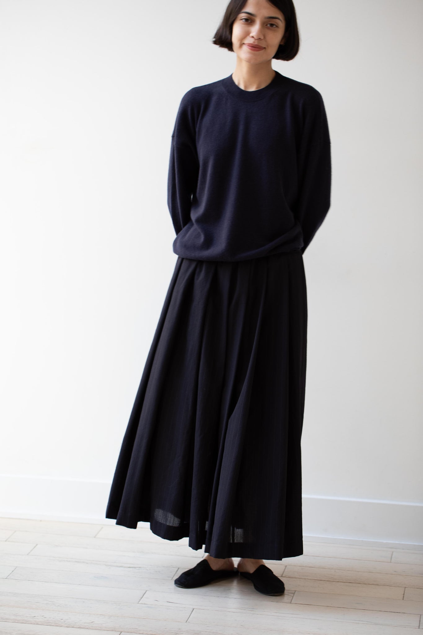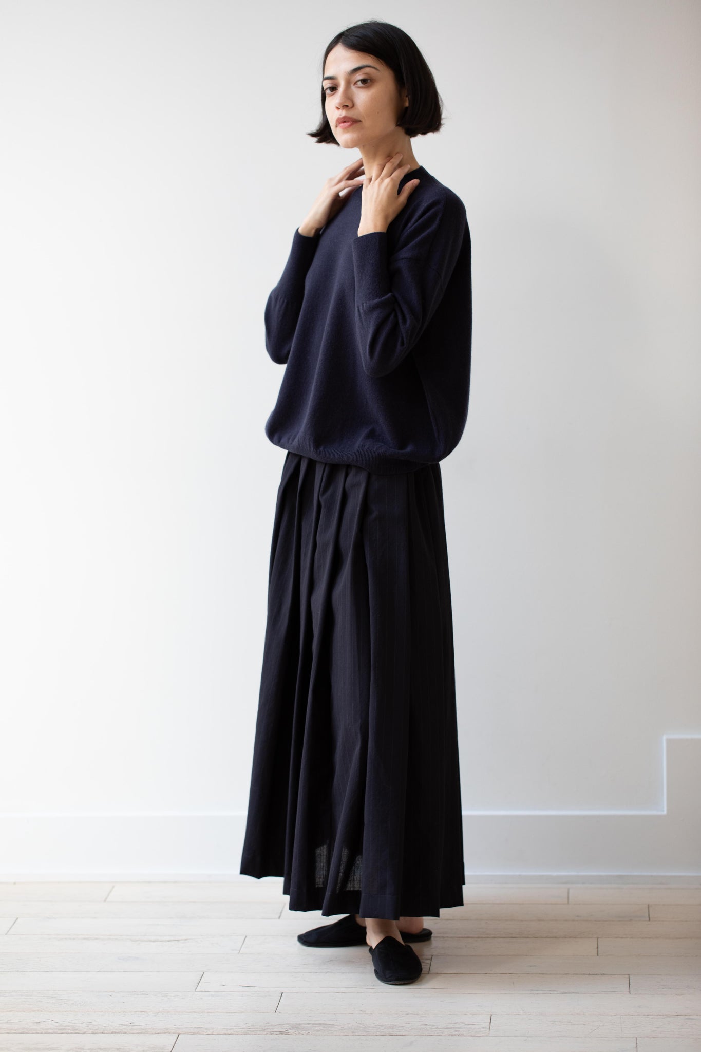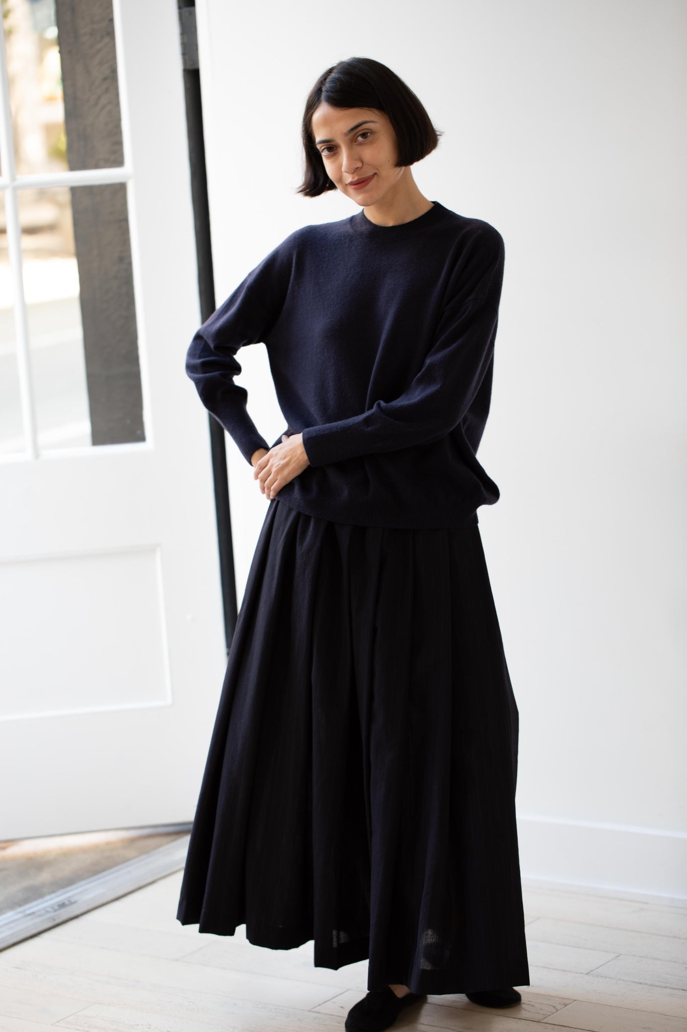 This pullover sweater is made from a beautiful lightweight cashmere yarn. It has a crew neck and a ribbed hem and sleeves.