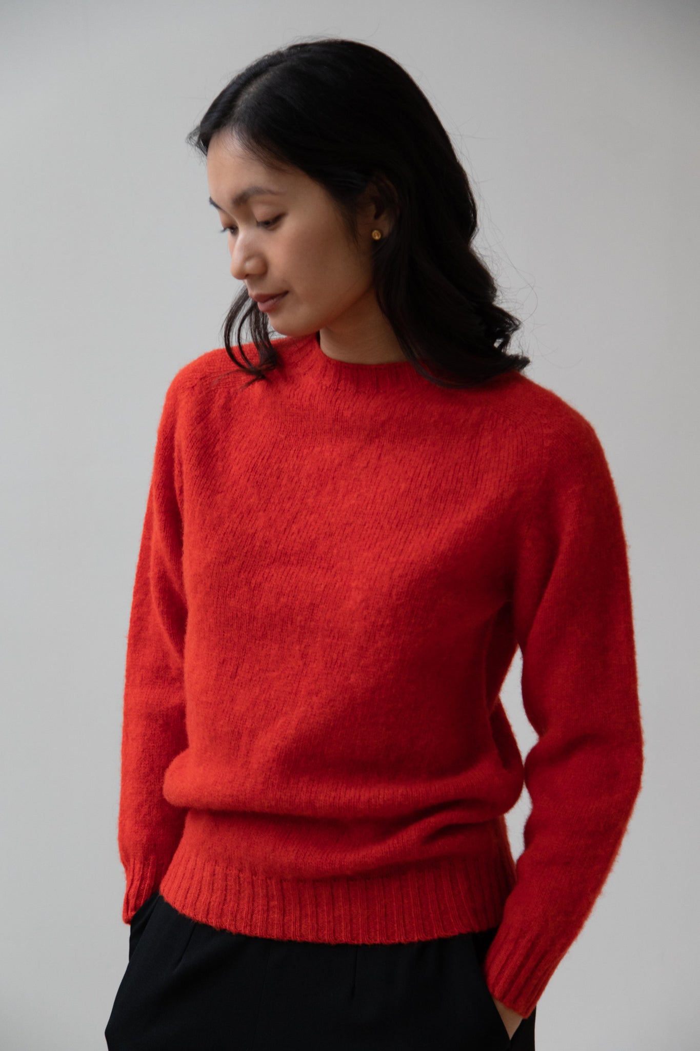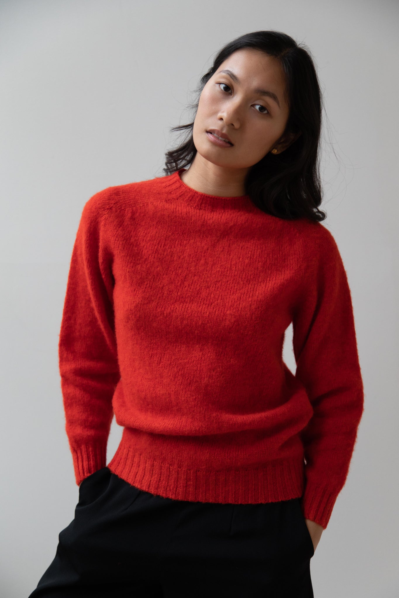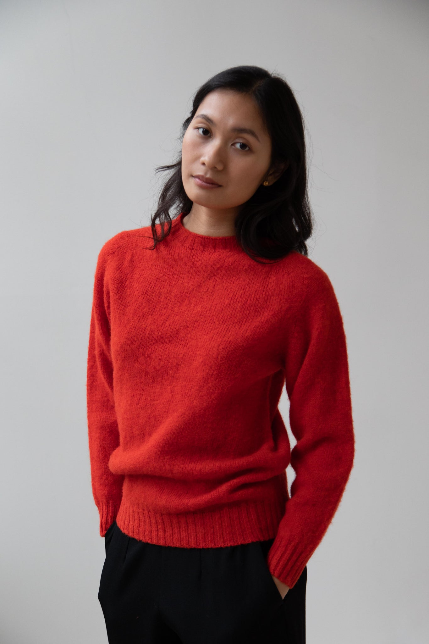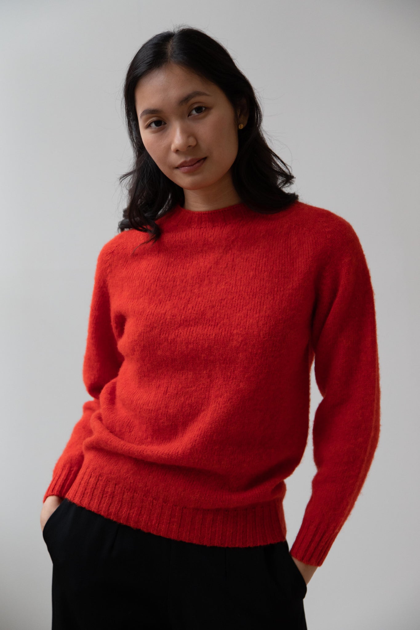 This sweater is so fun! Made of a wonderful soft and almost foamy wool this sweater has the best texture and color. It is a classic crewneck fit and perfect for layering and mixing and matching!