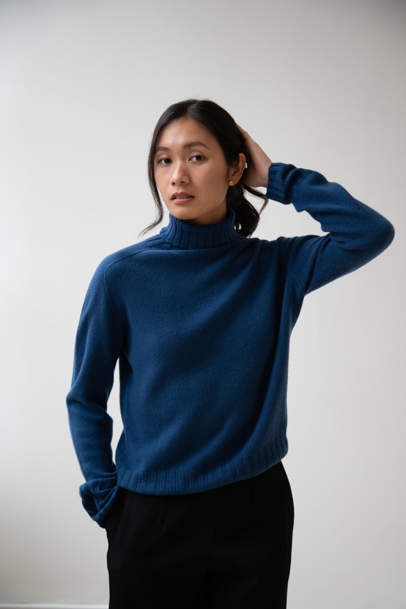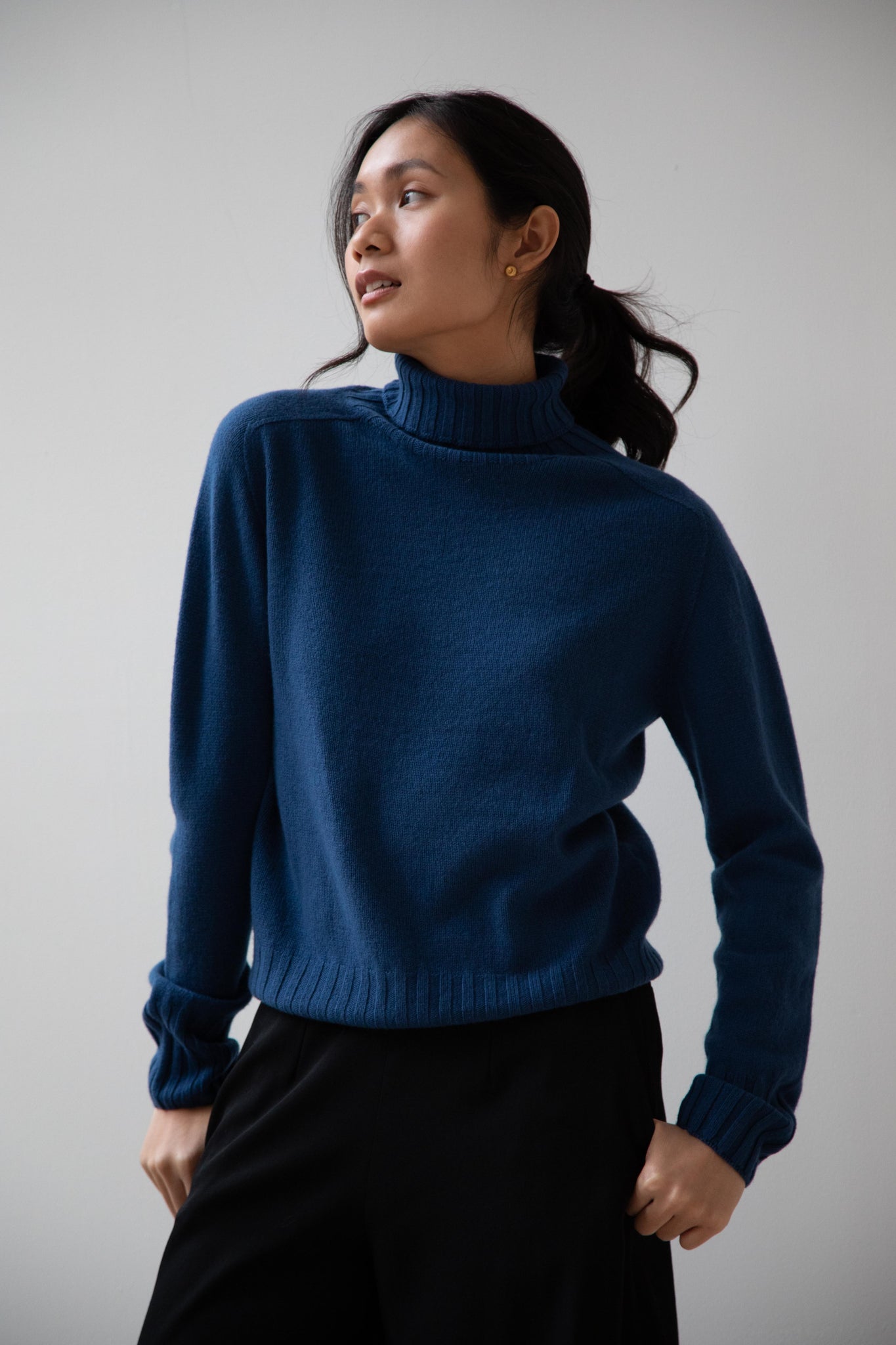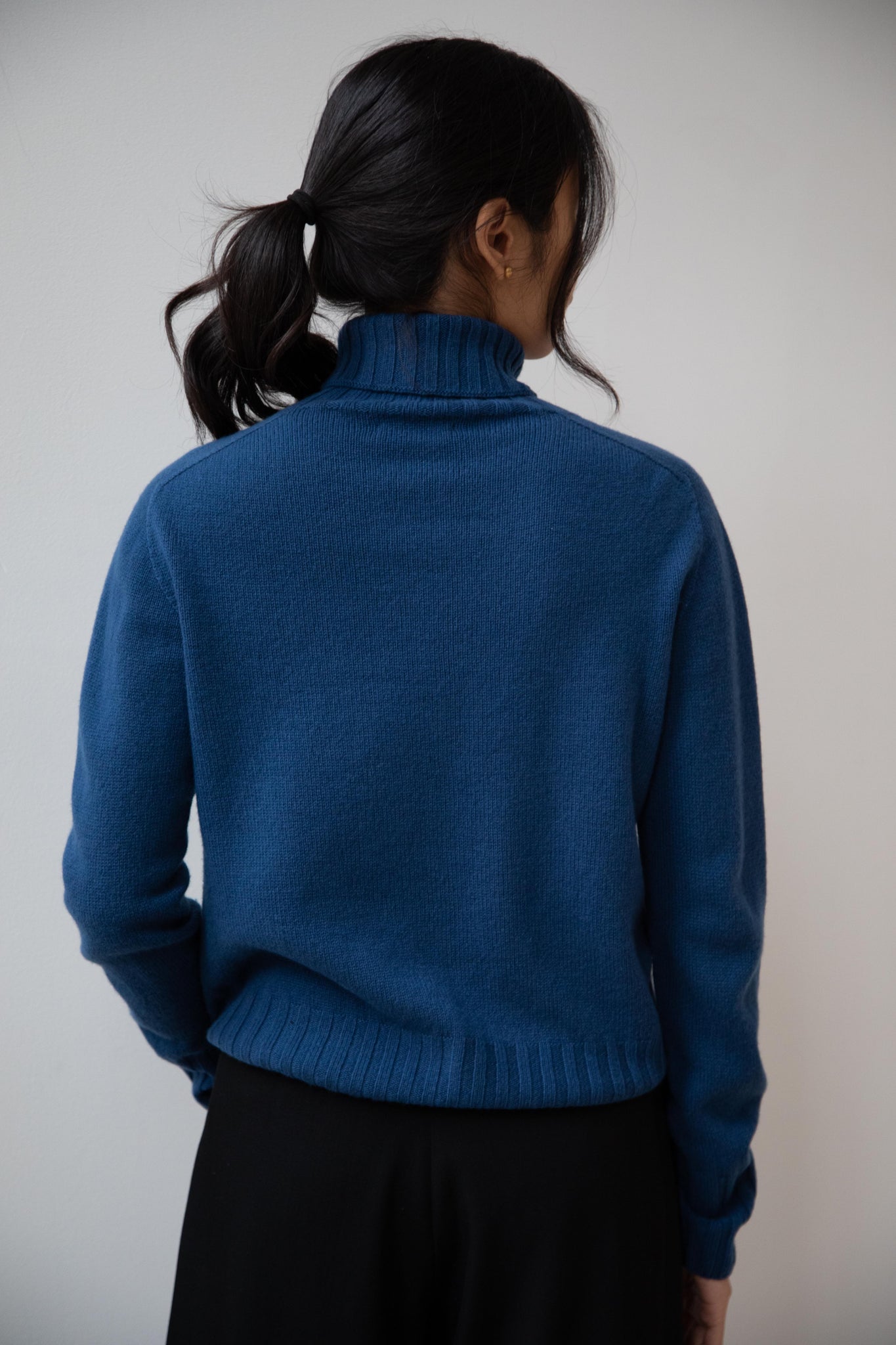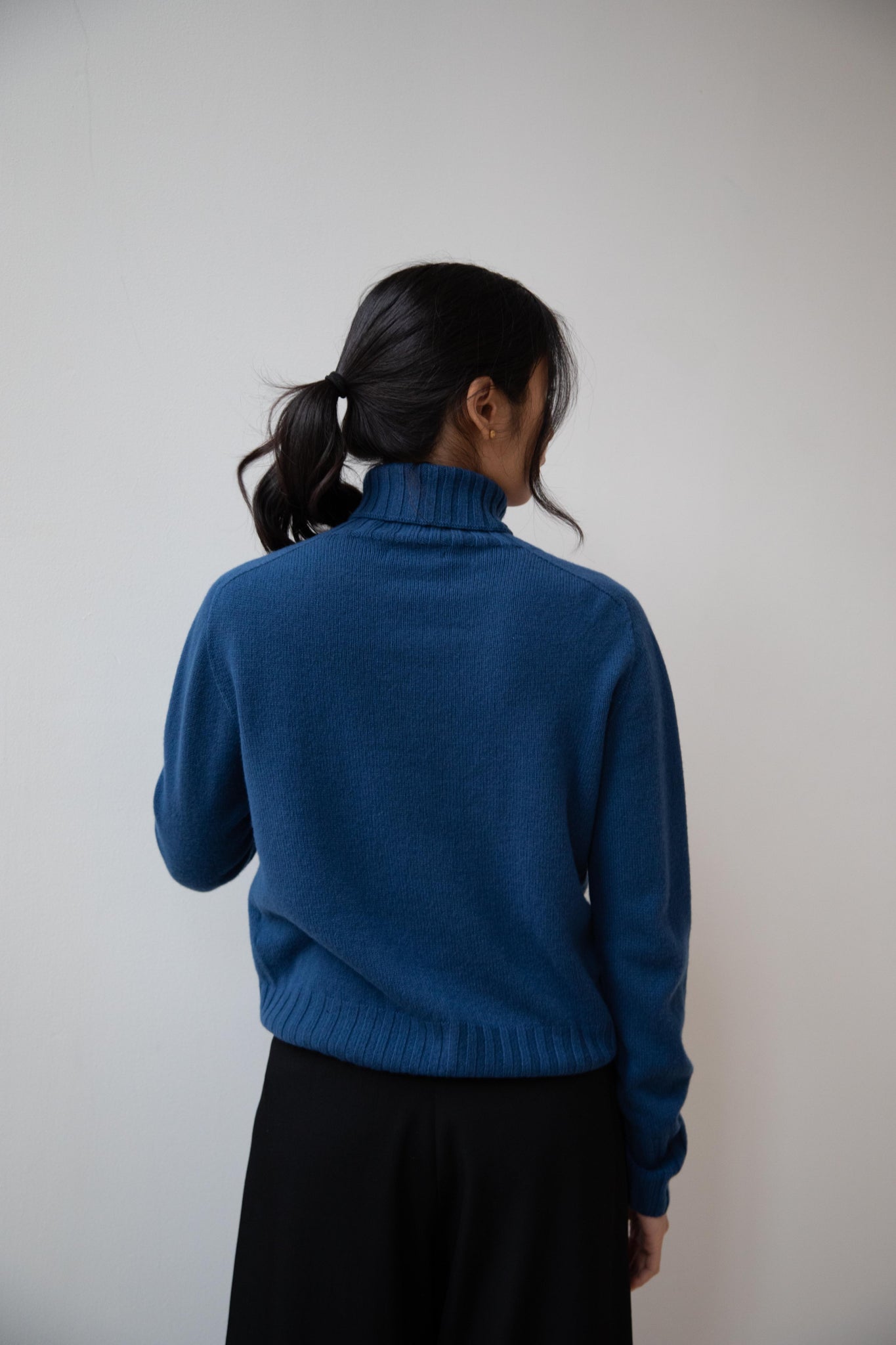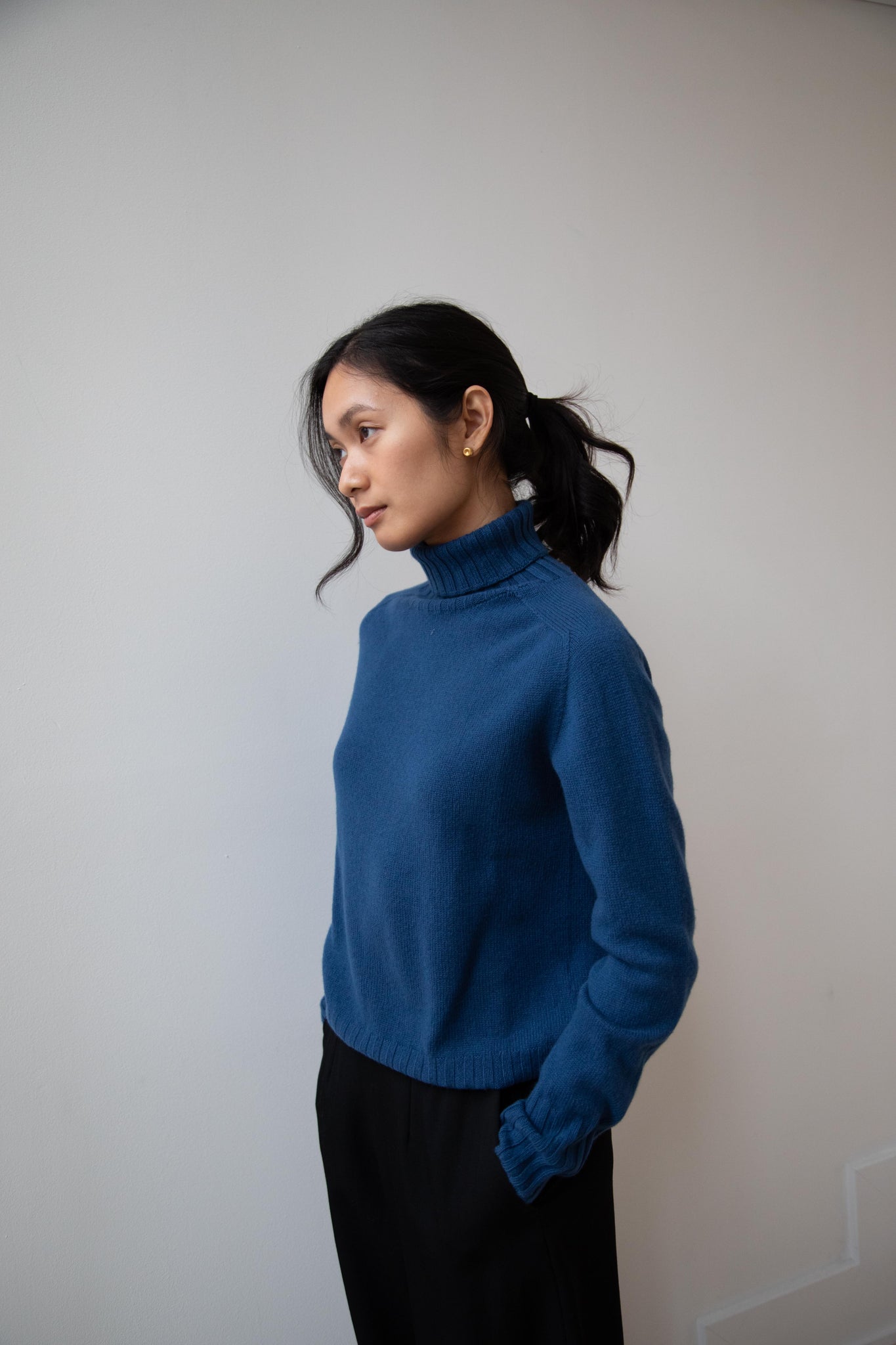 This blue - it's just perfect! Made from a soft cashmere yarn, this sweater is the ideal piece this time of year. It looks great on it's own; we can also image layering another sweater or coat on top and having the turtleneck there for a pop of blue.