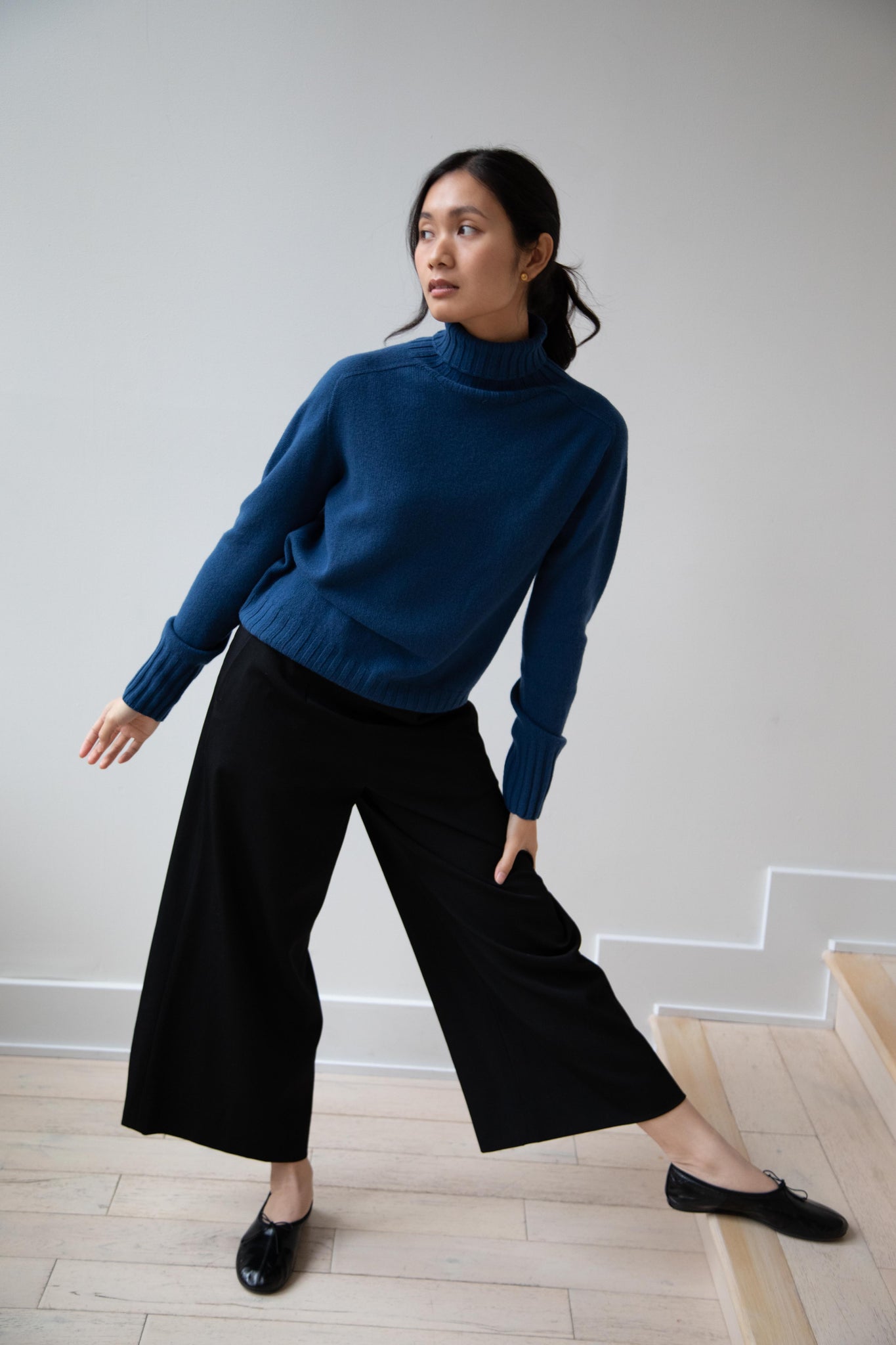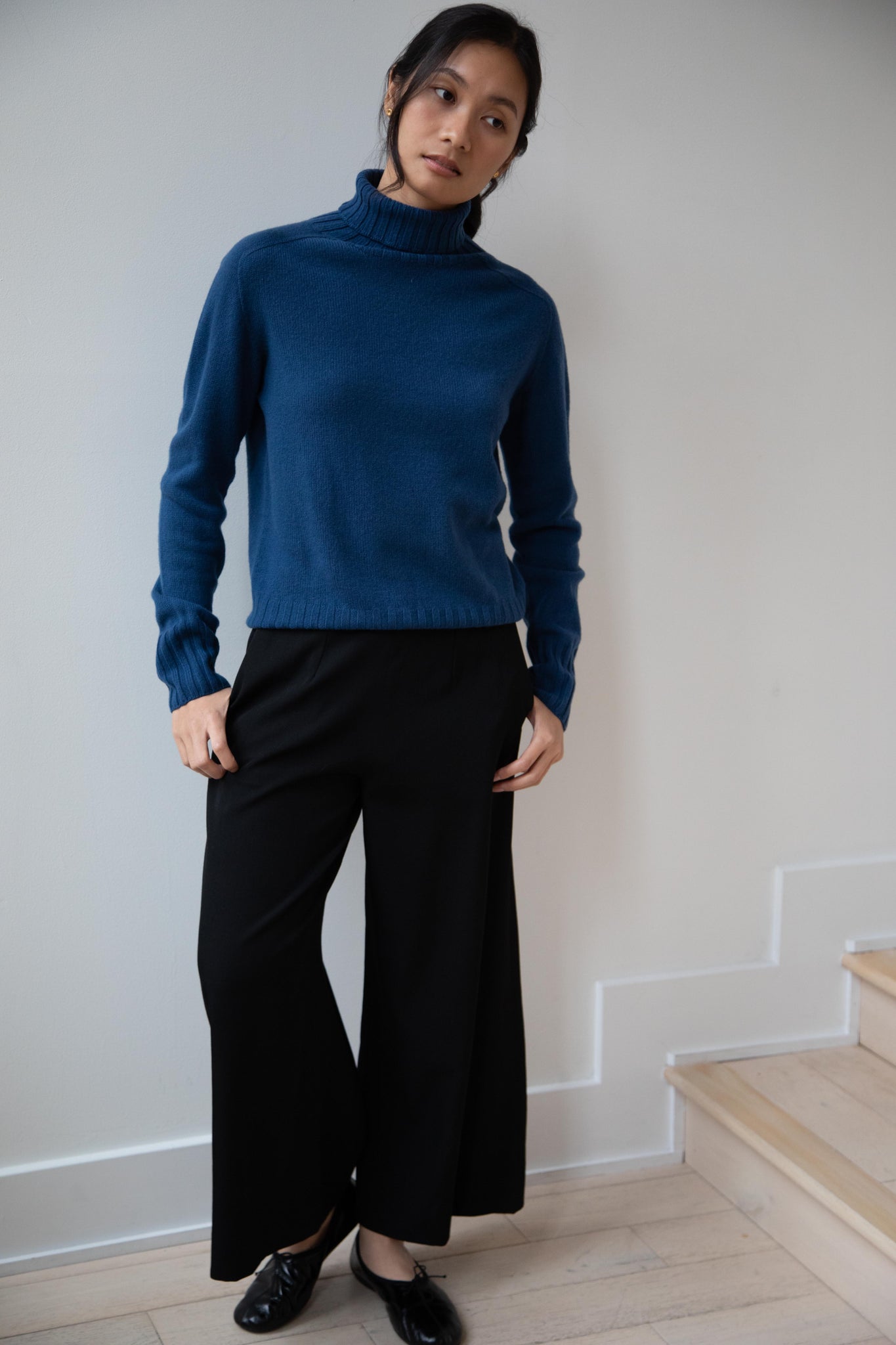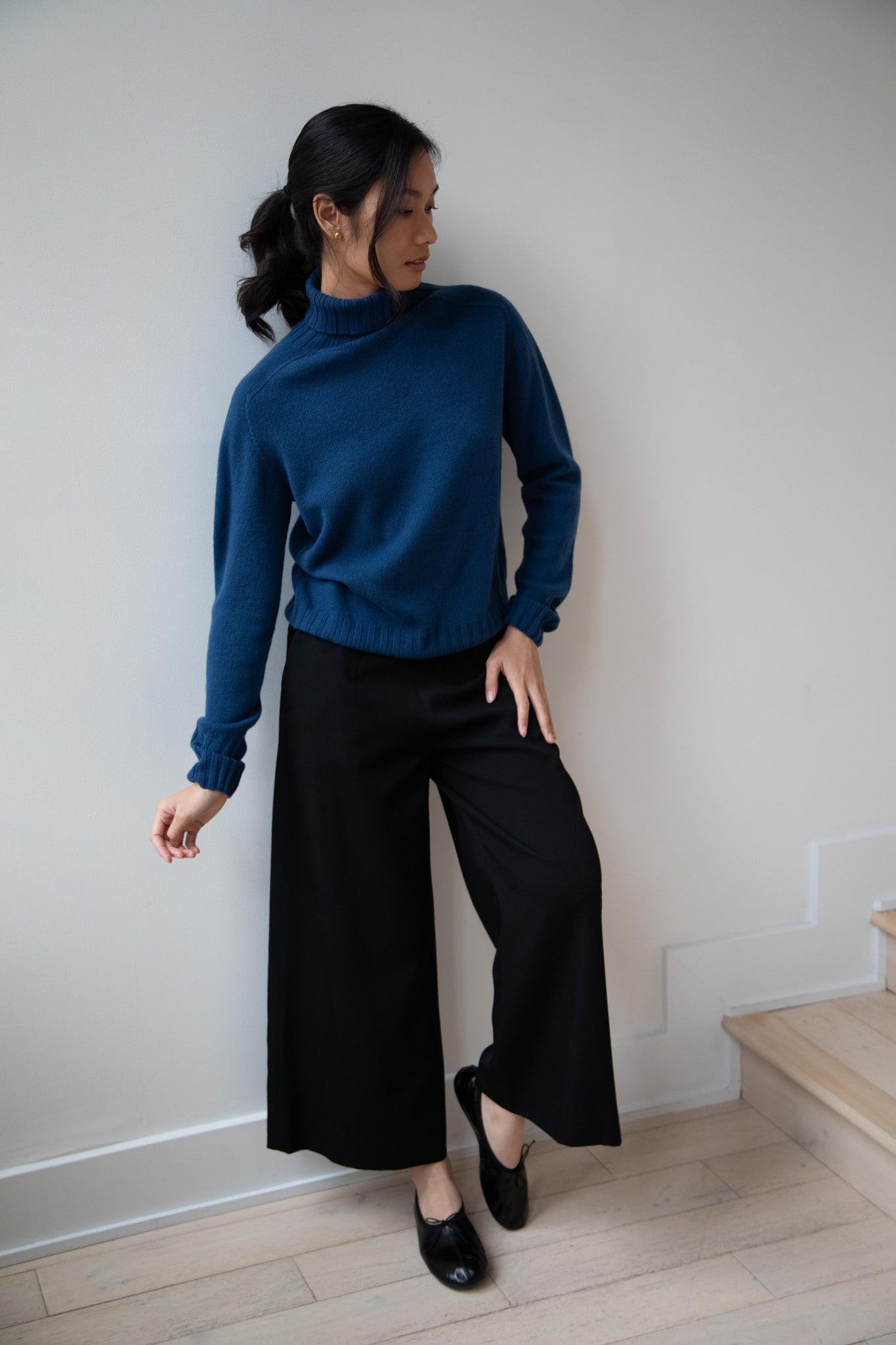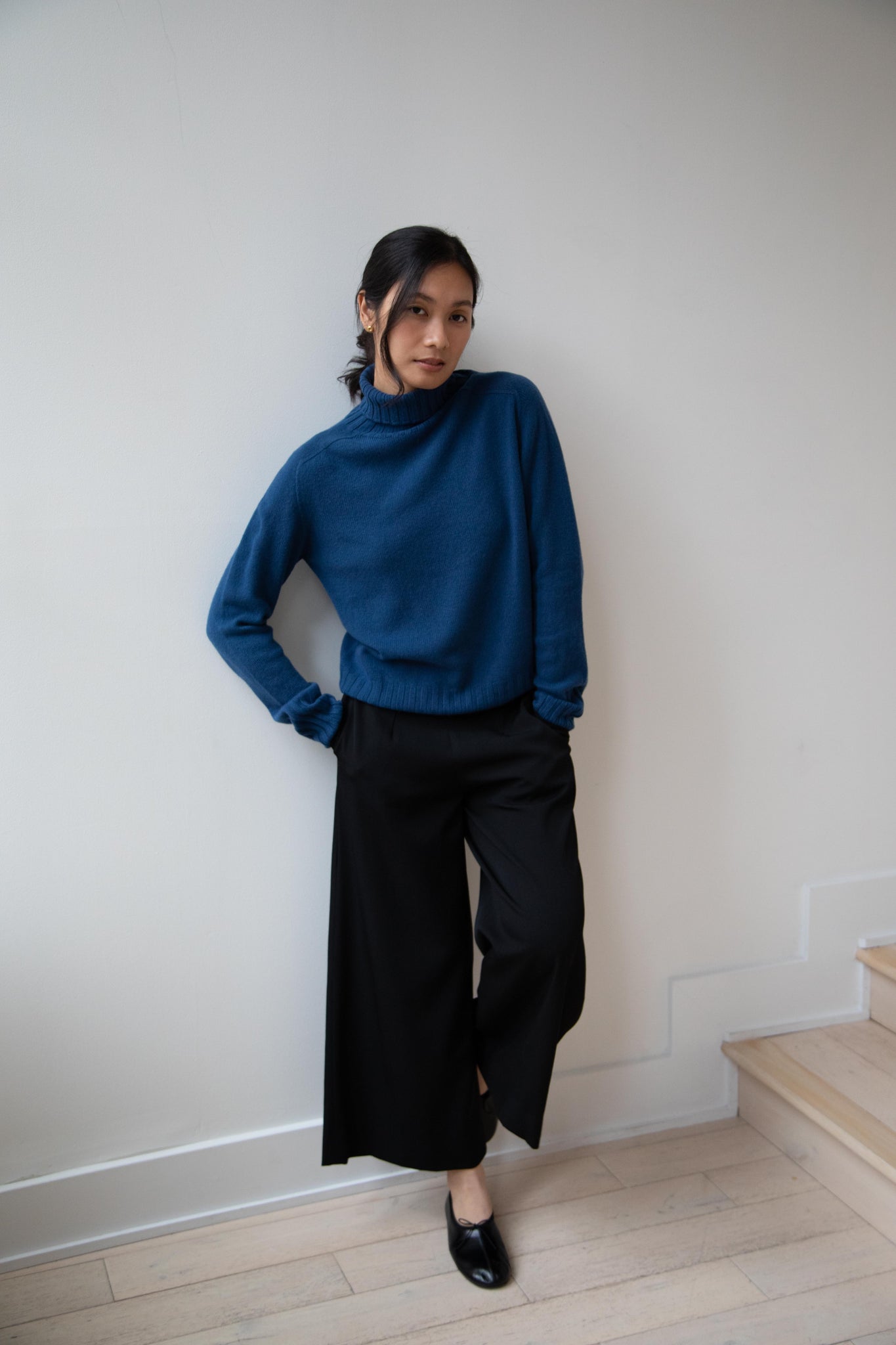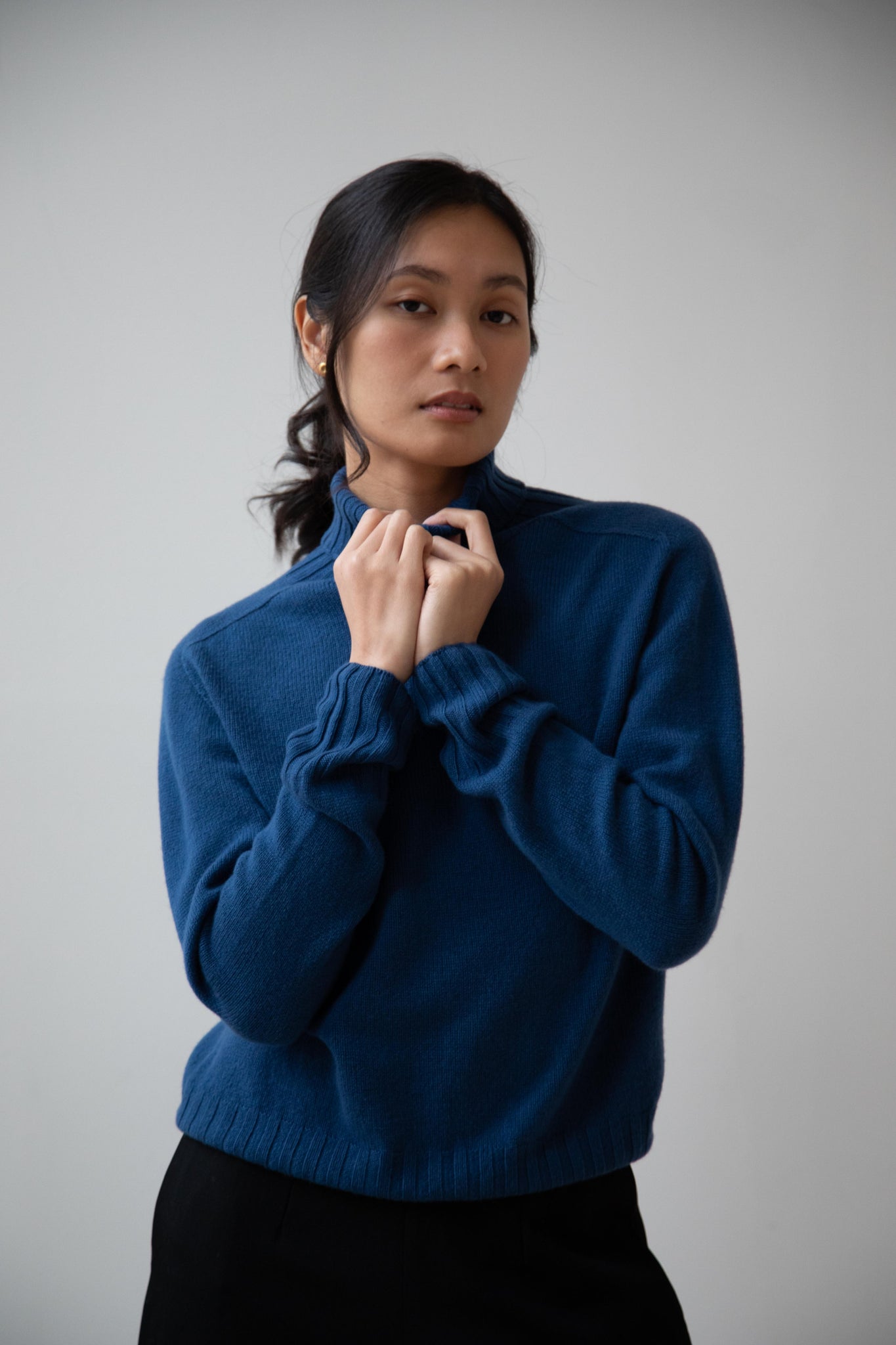 This blue - it's just perfect! Made from a soft cashmere yarn, this sweater is the ideal piece this time of year. It looks great on it's own; we can also image layering another sweater or coat on top and having the turtleneck there for a pop of blue.