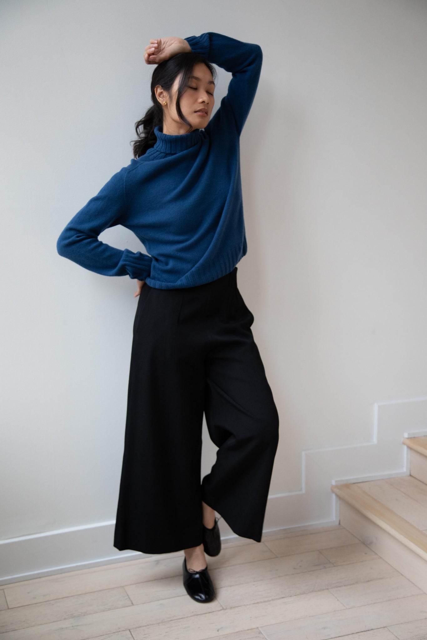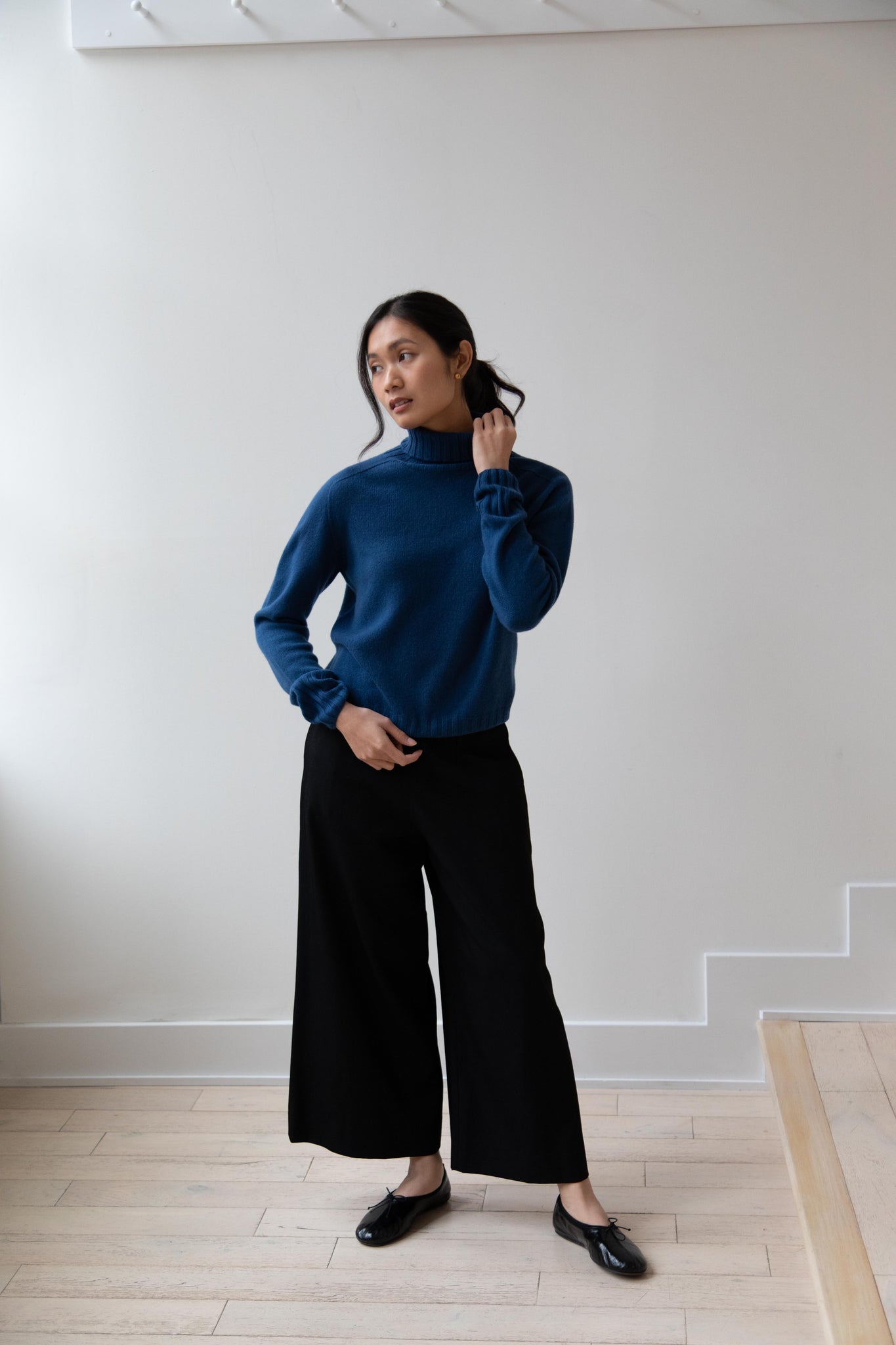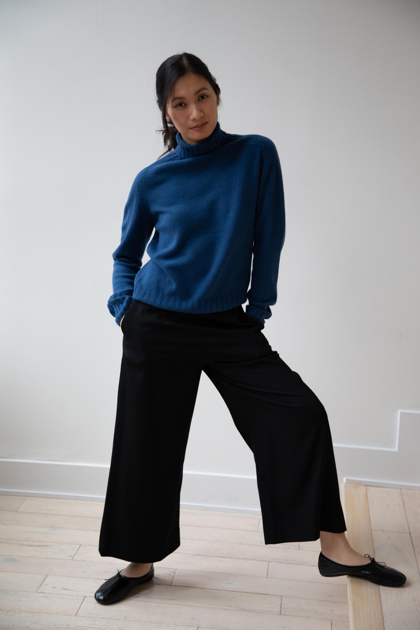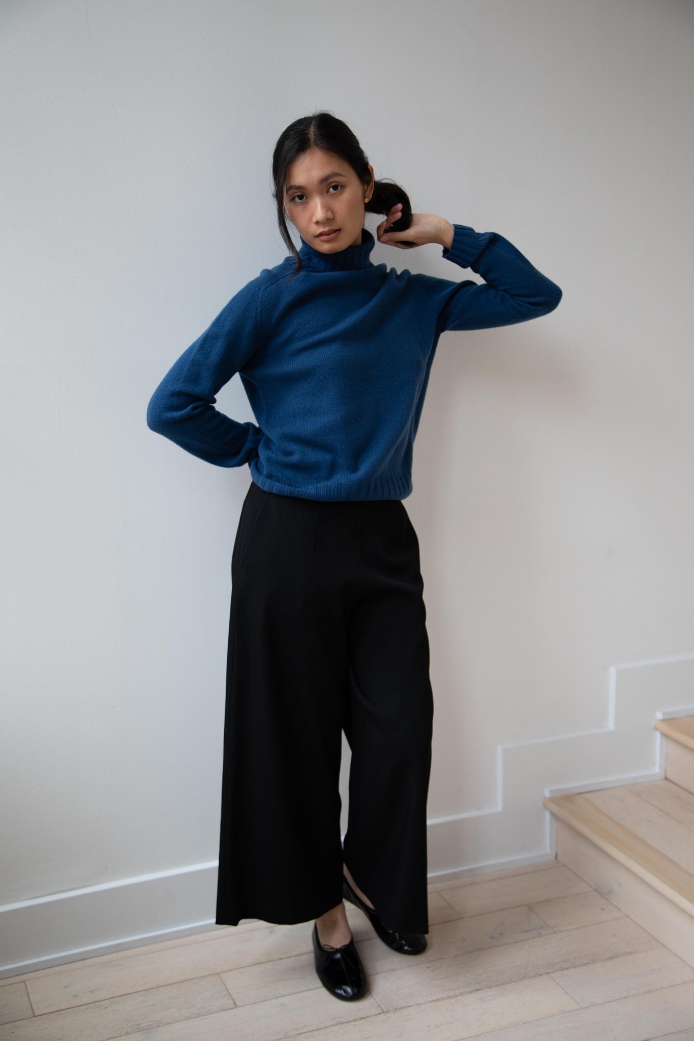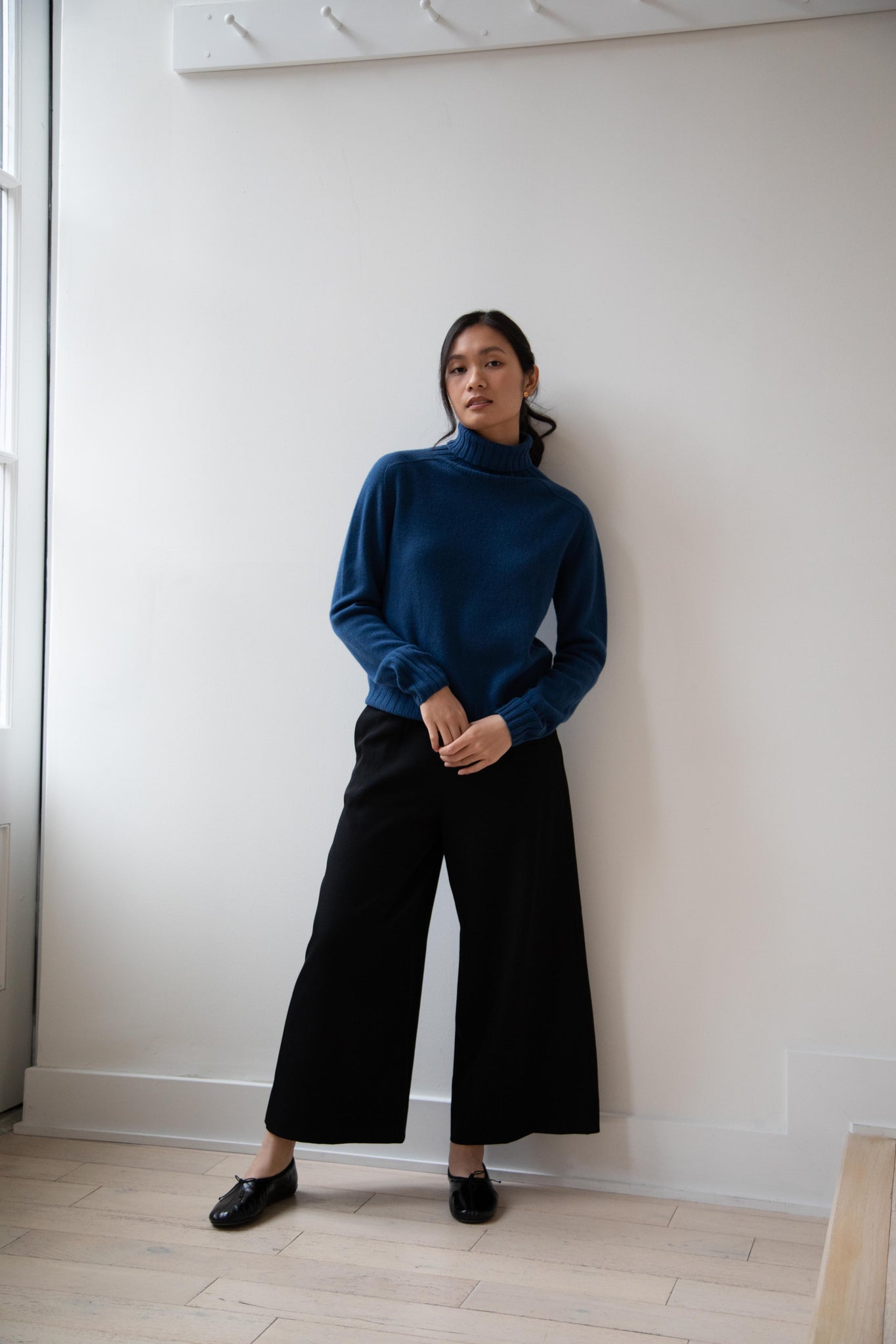 This blue - it's just perfect! Made from a soft cashmere yarn, this sweater is the ideal piece this time of year. It looks great on it's own; we can also image layering another sweater or coat on top and having the turtleneck there for a pop of blue.