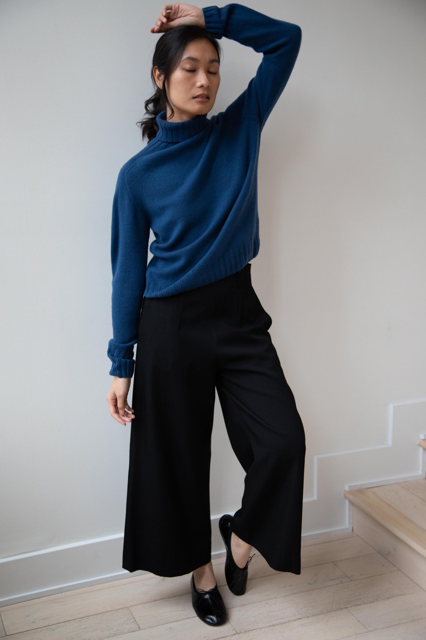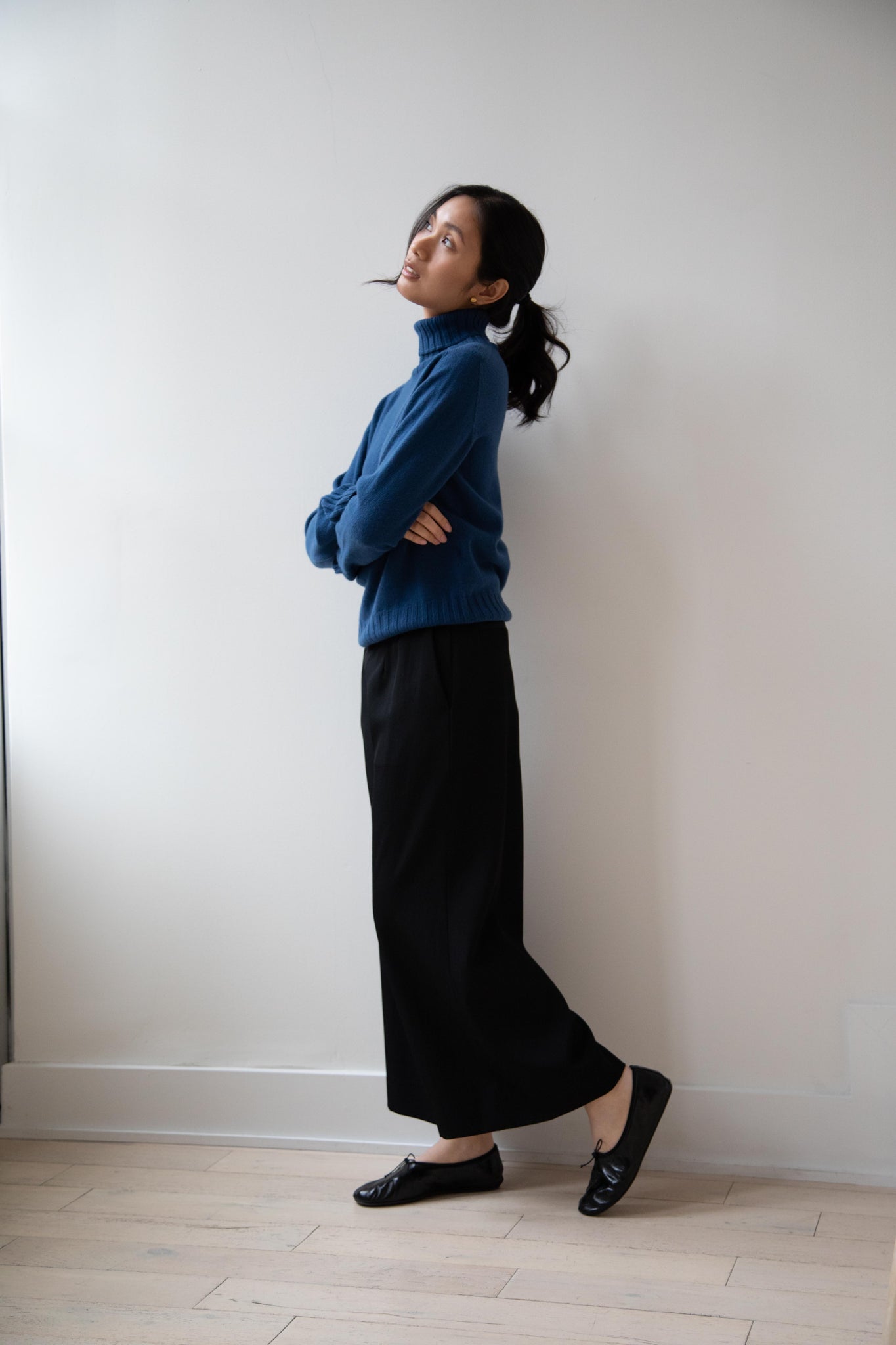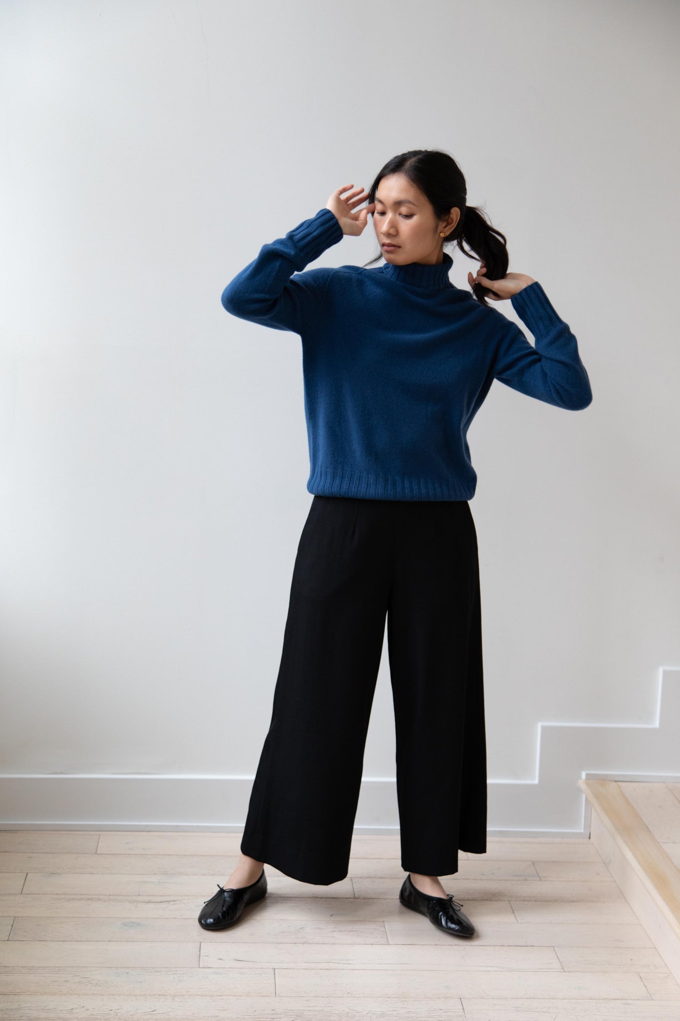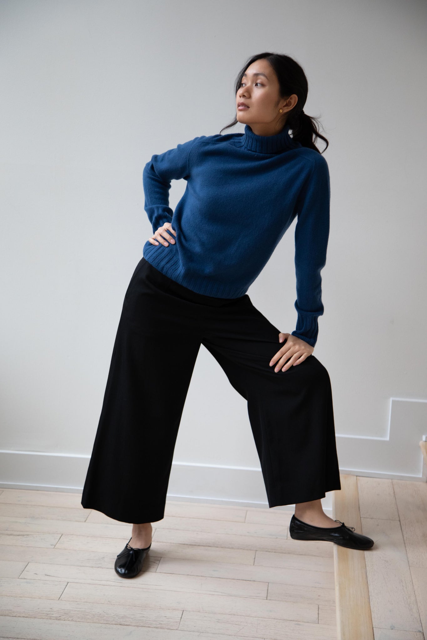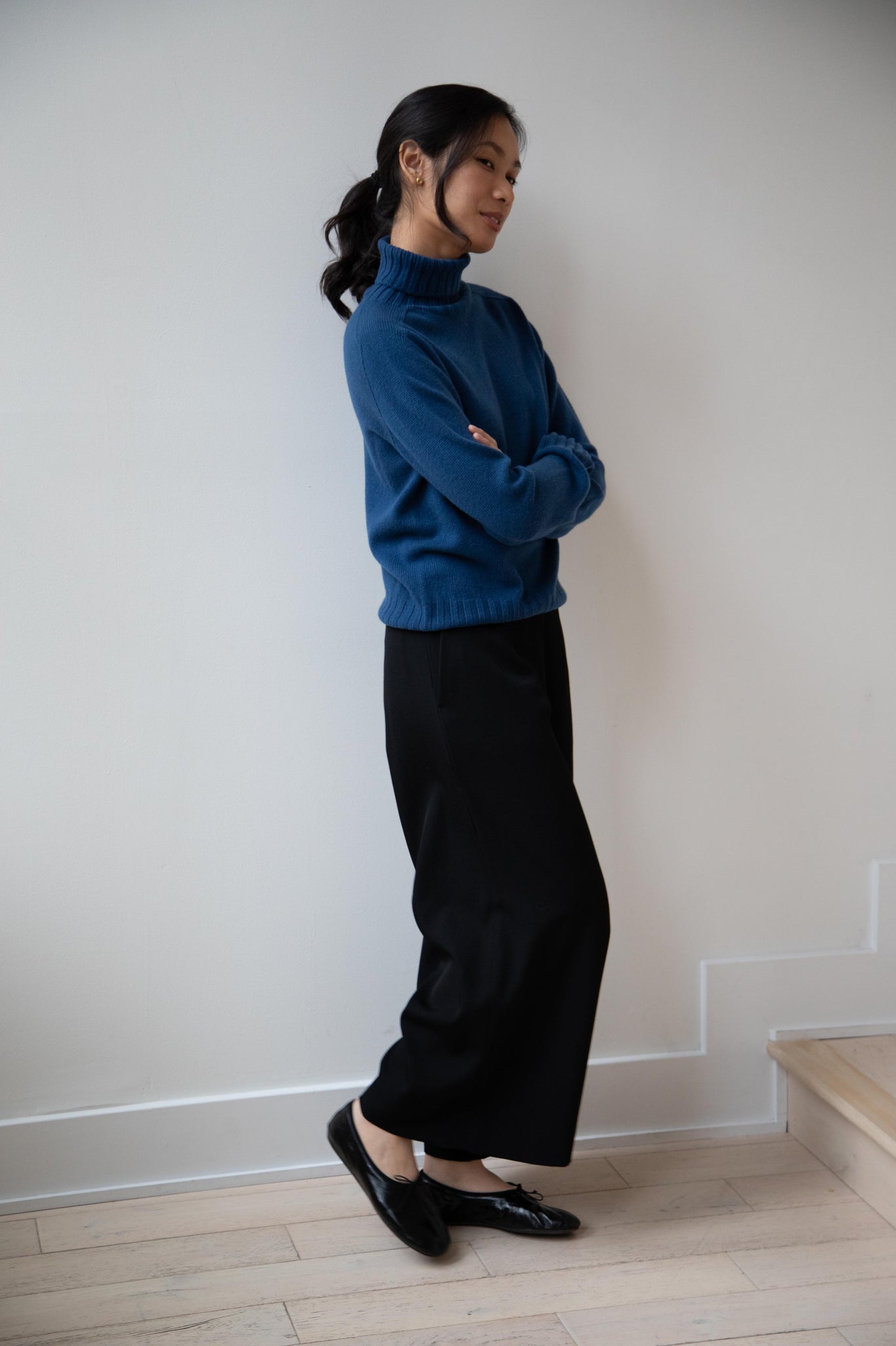 This blue - it's just perfect! Made from a soft cashmere yarn, this sweater is the ideal piece this time of year. It looks great on it's own; we can also image layering another sweater or coat on top and having the turtleneck there for a pop of blue.