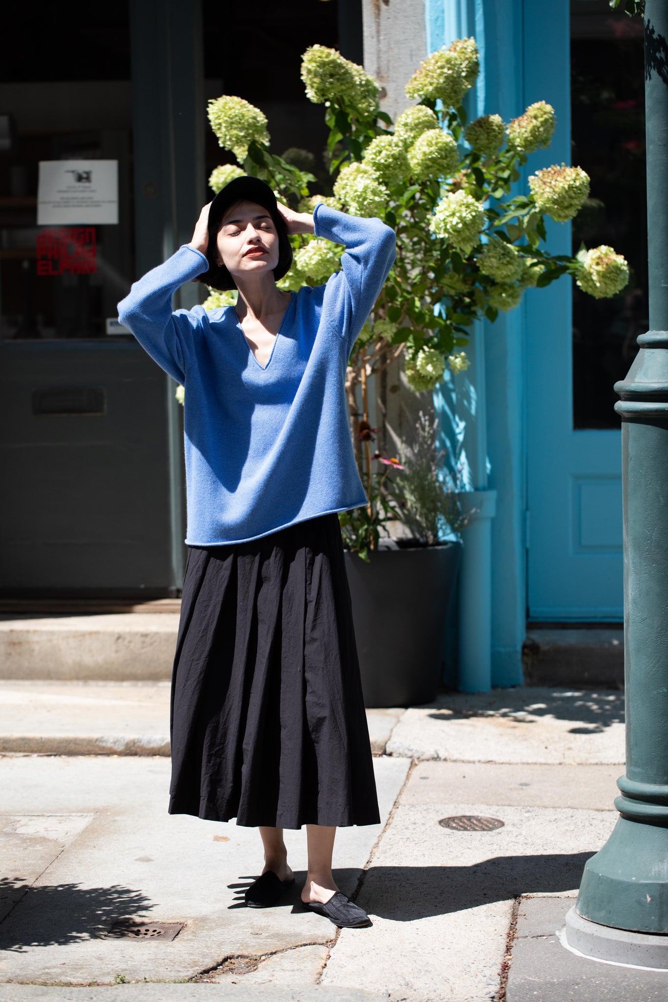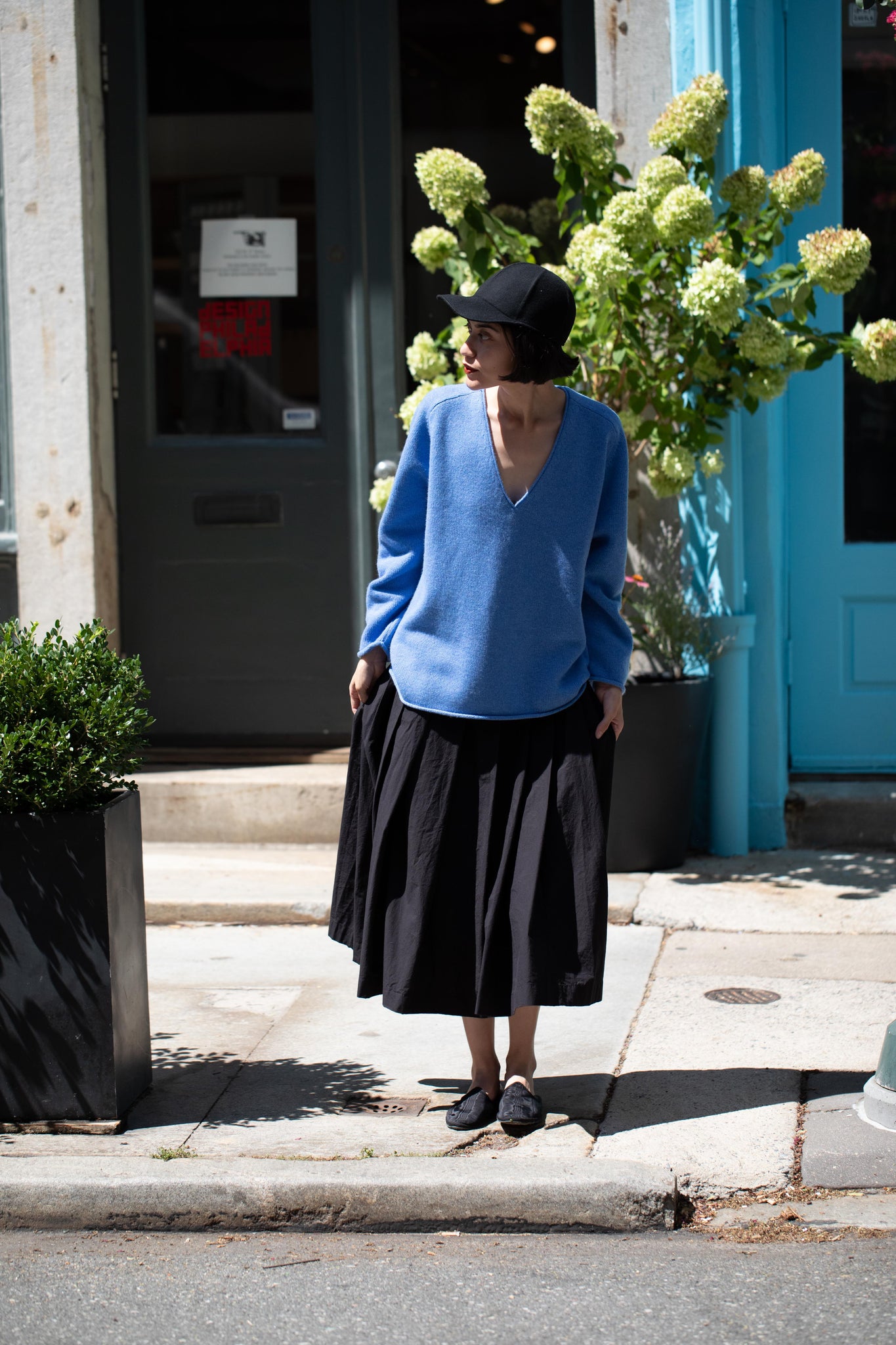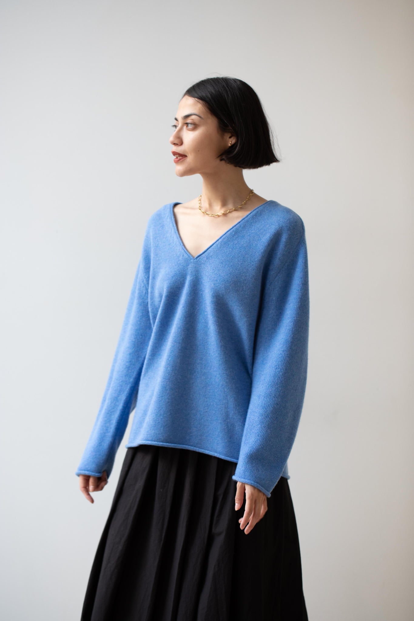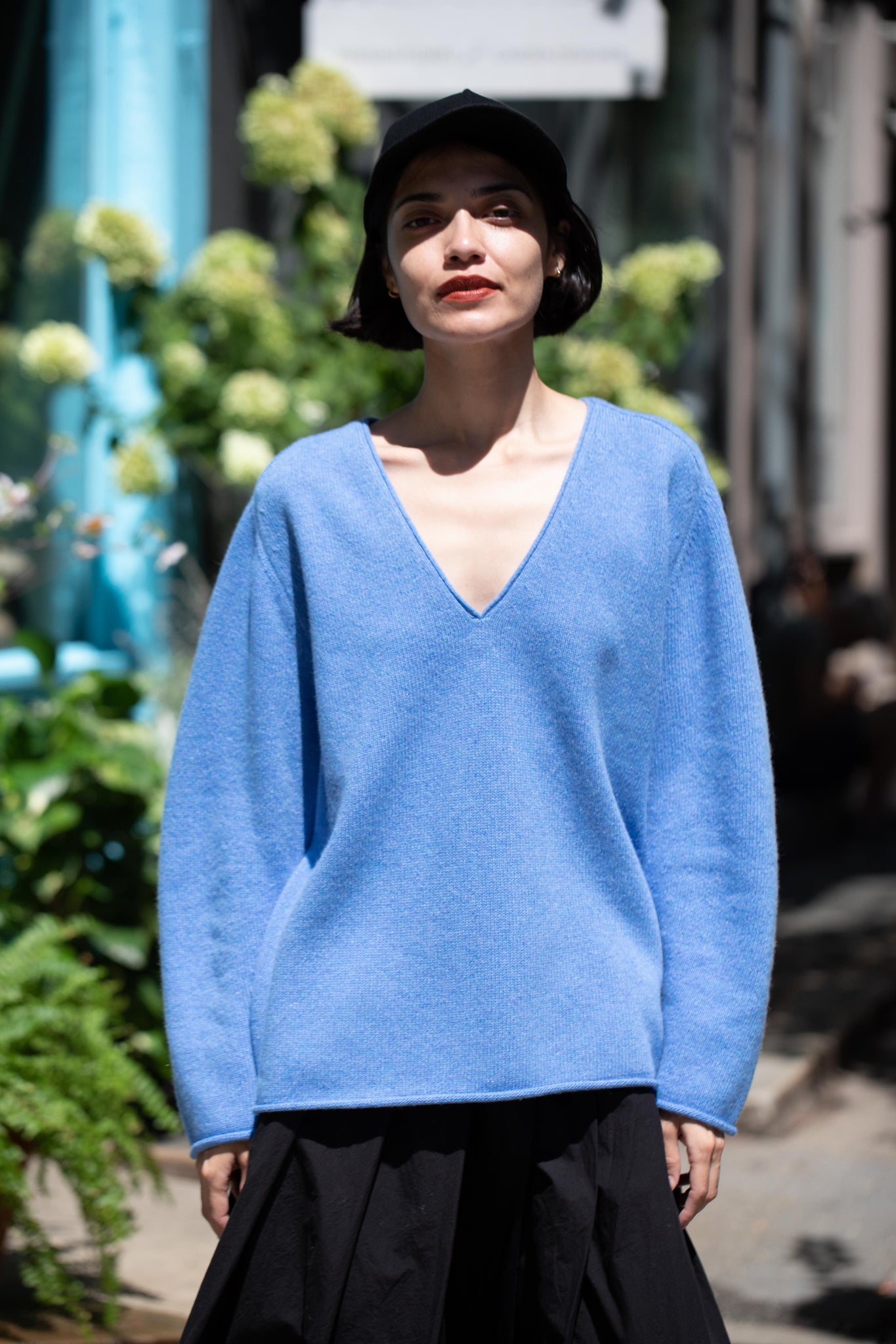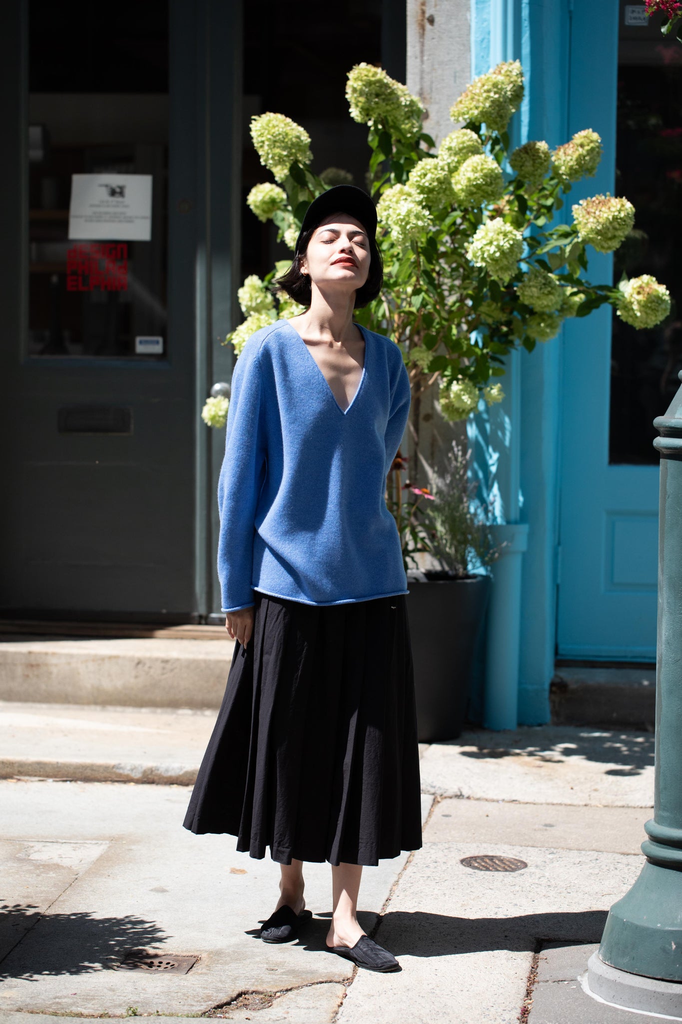 This deep v-neck pullover is a great layering piece ideal for styling this fall. We loved it so much we have it in three colors. The knit is an ideal weight, not too light and not too heavy. The neck line is fully backed with a knit yoke, making it feel a bit more substantial. The sleeves have an ever so slight curve to them, which gives a nice silhouette.