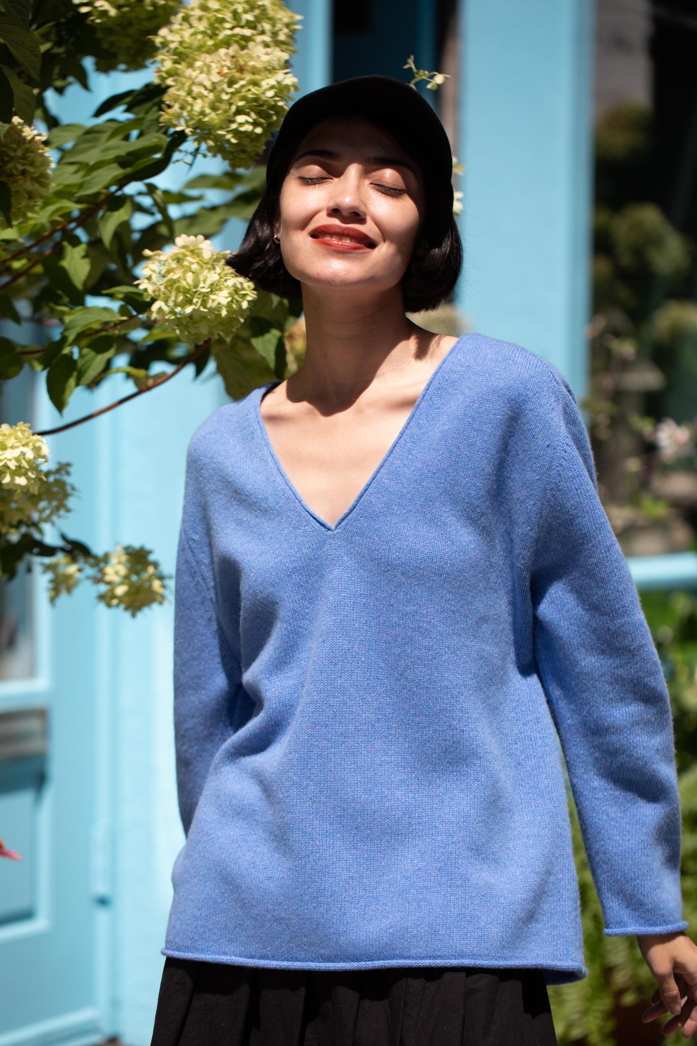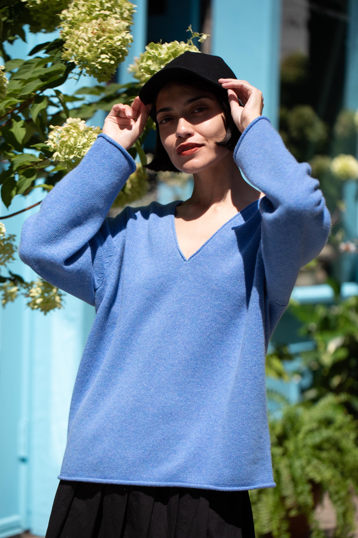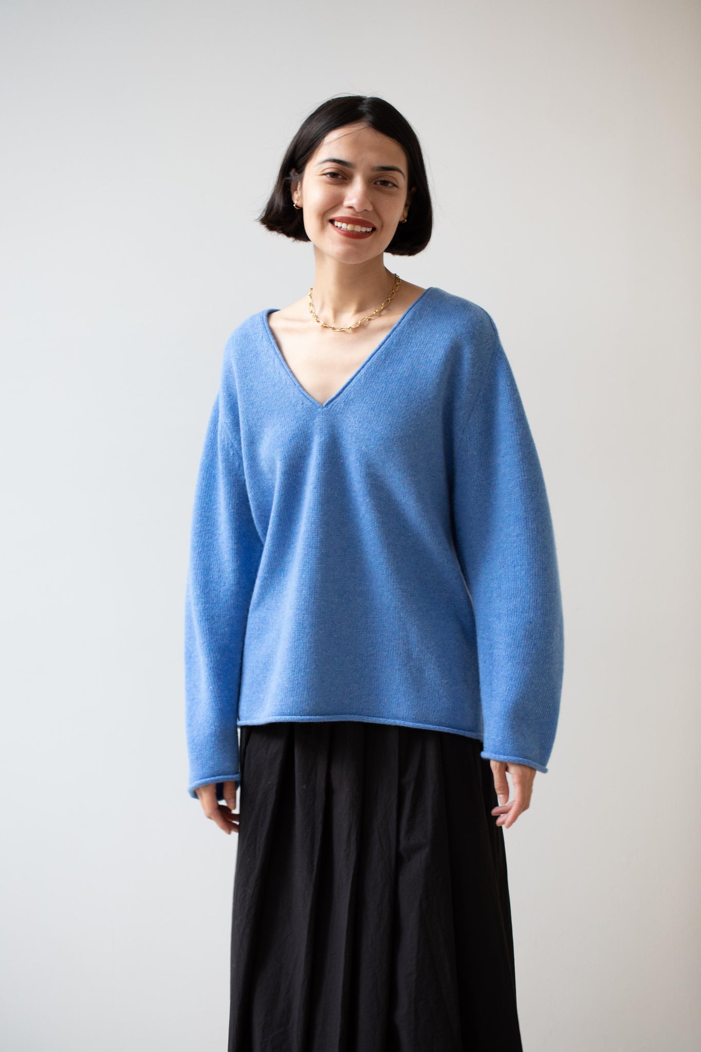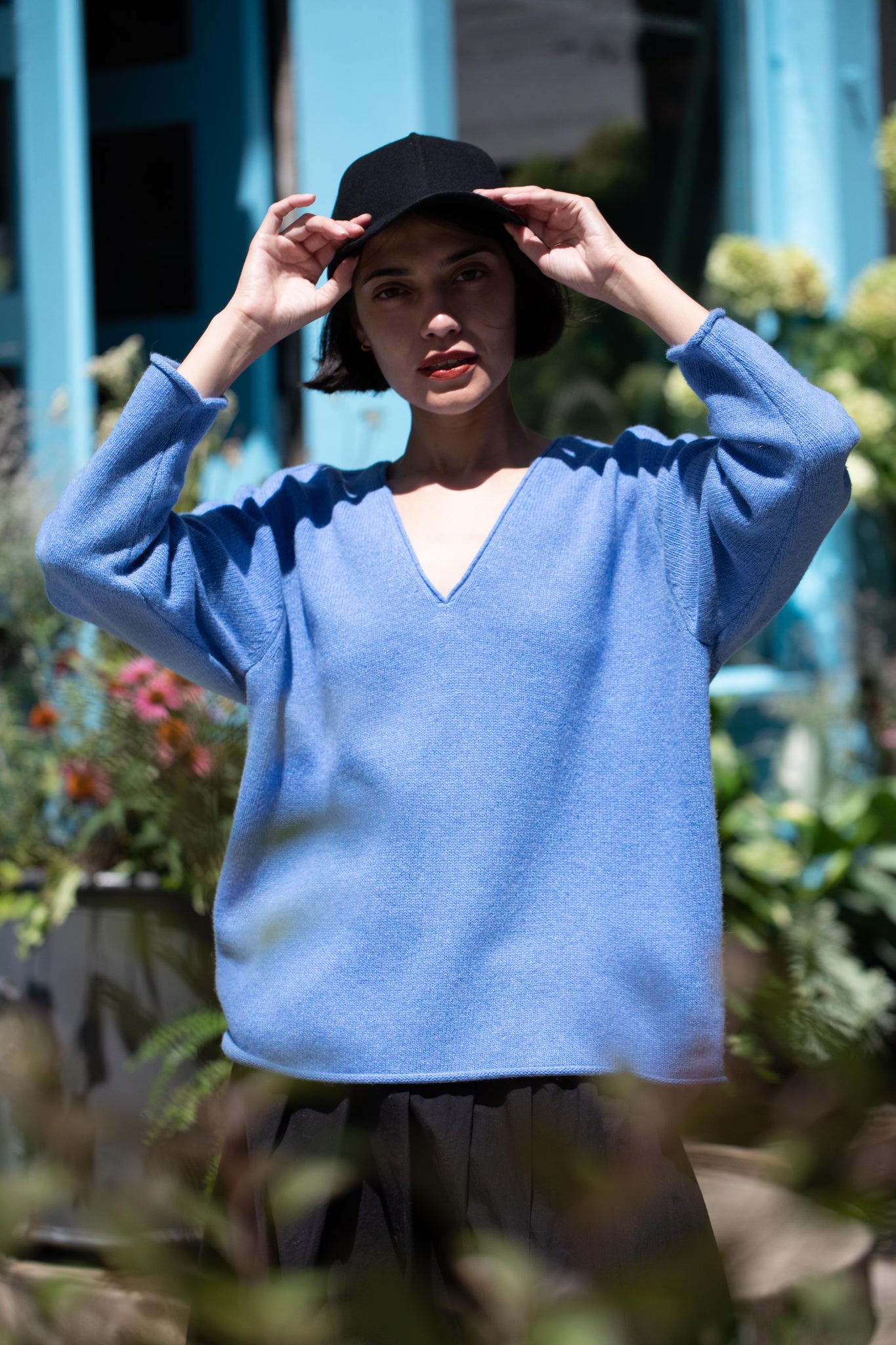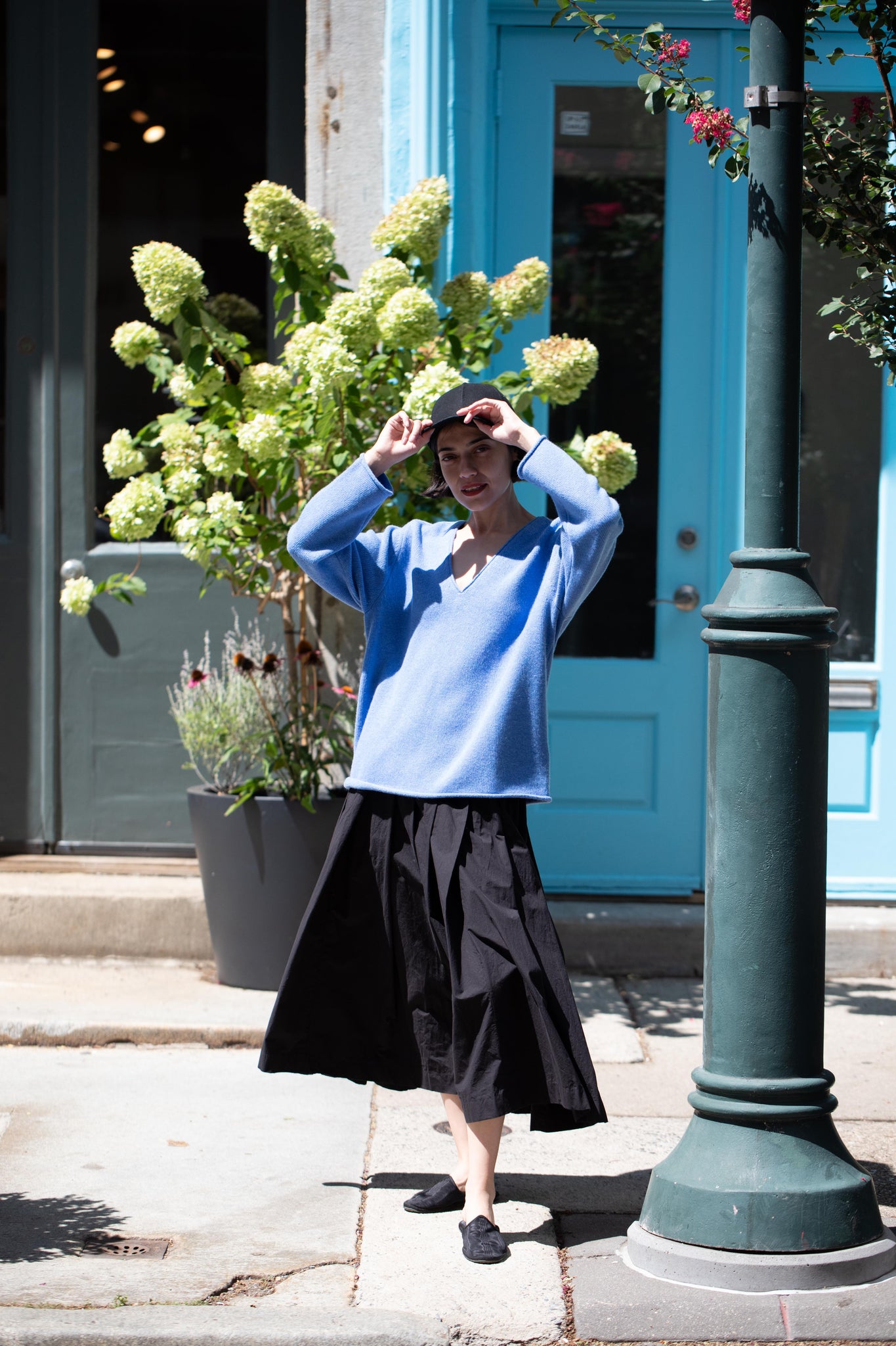This deep v-neck pullover is a great layering piece ideal for styling this fall. We loved it so much we have it in three colors. The knit is an ideal weight, not too light and not too heavy. The neck line is fully backed with a knit yoke, making it feel a bit more substantial. The sleeves have an ever so slight curve to them, which gives a nice silhouette.