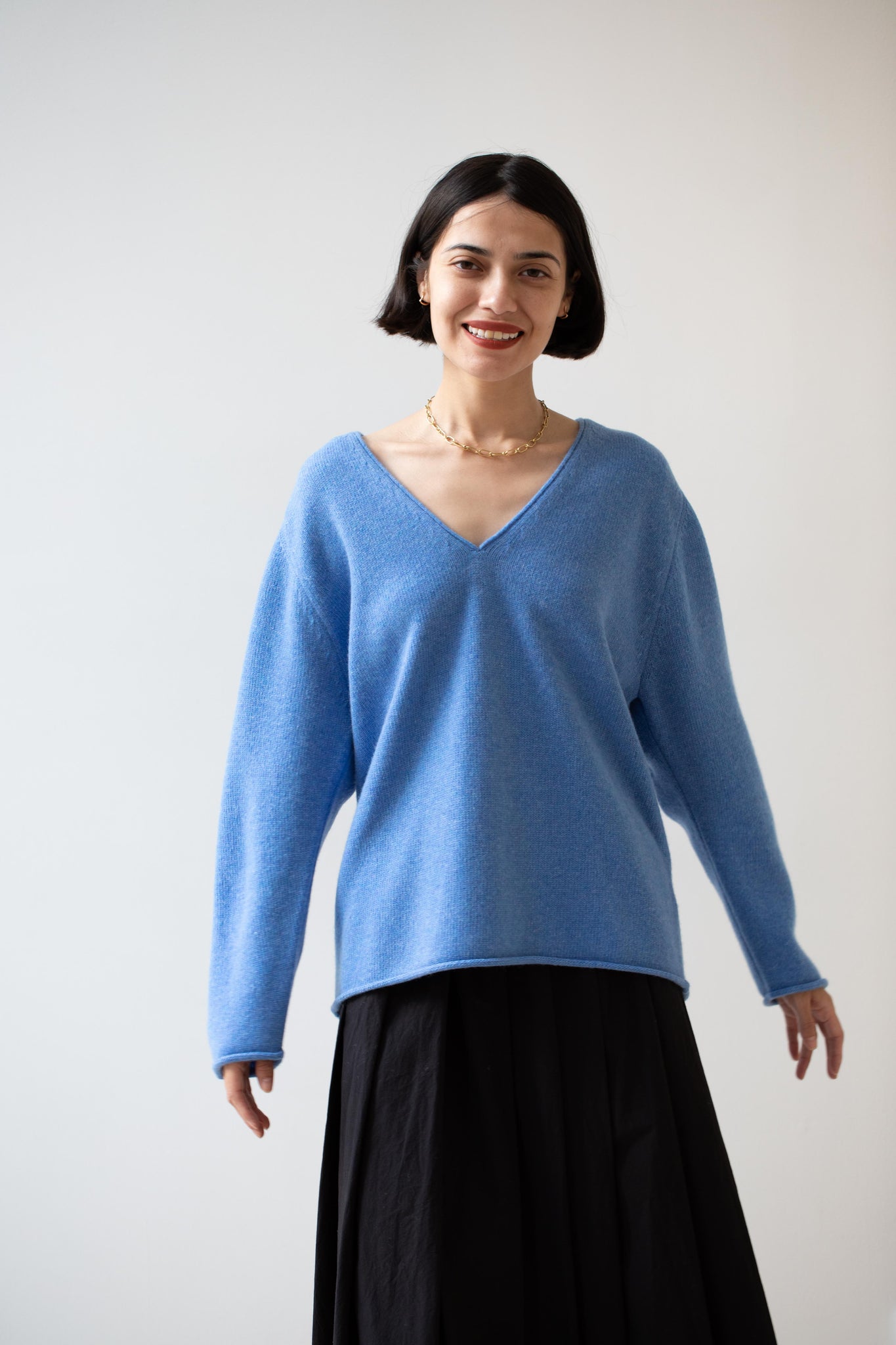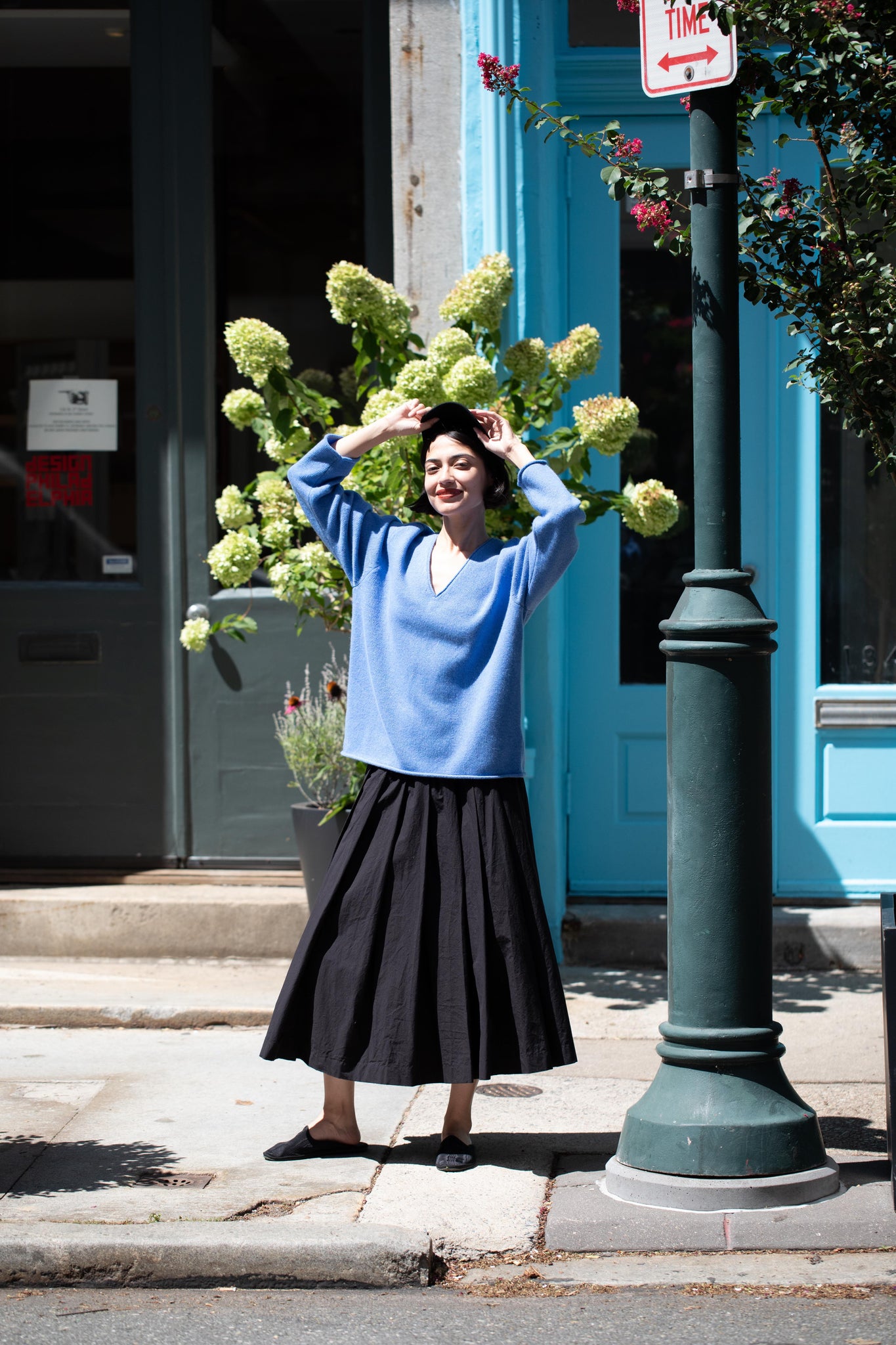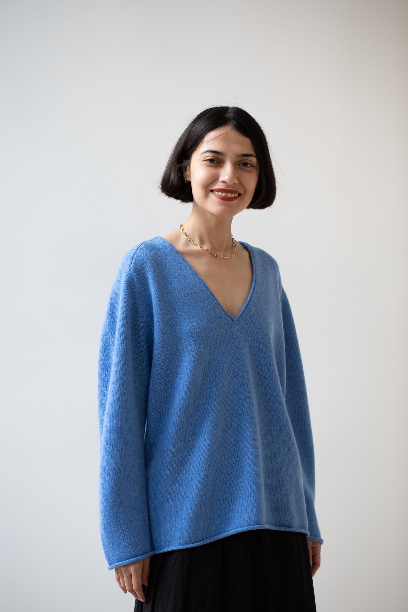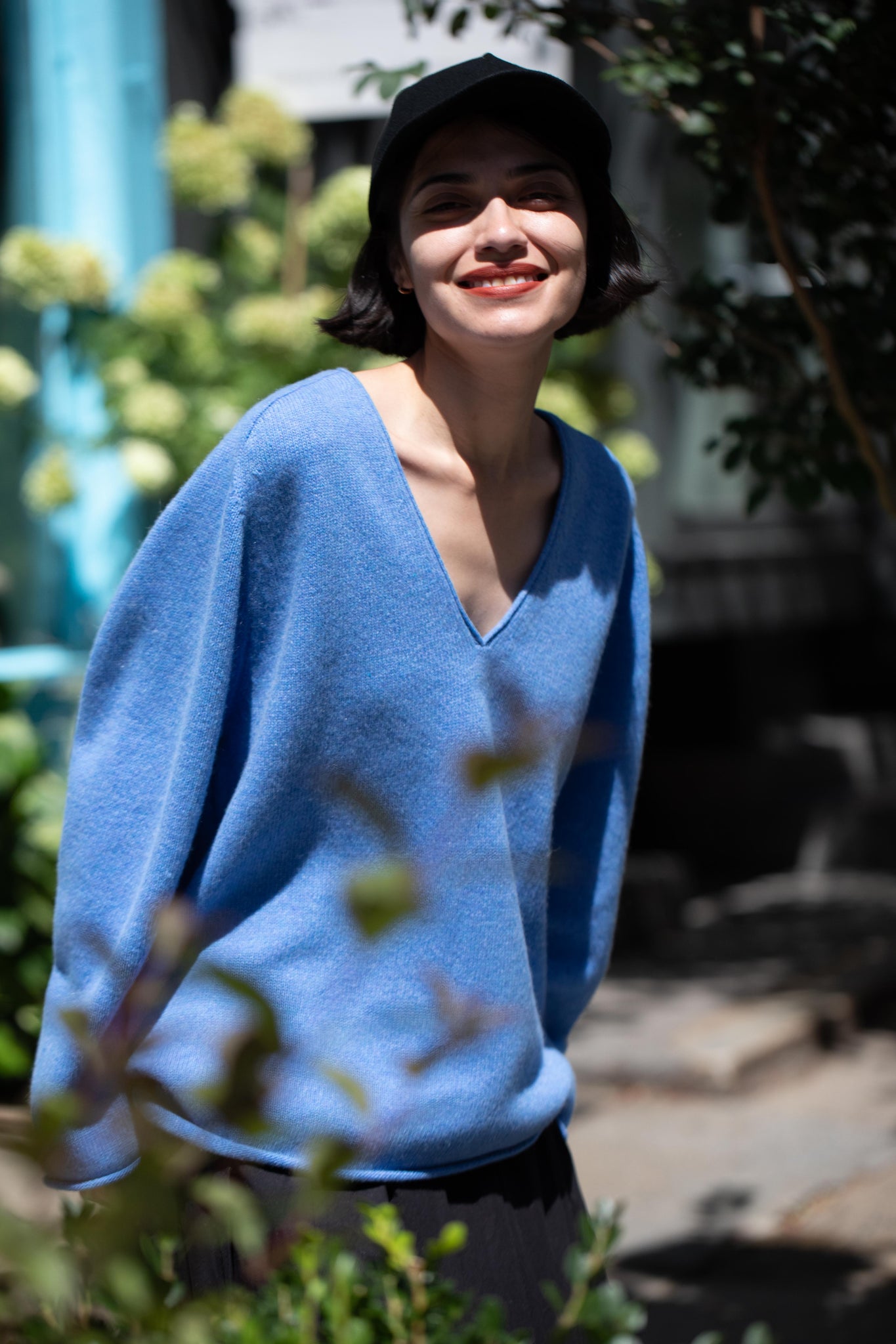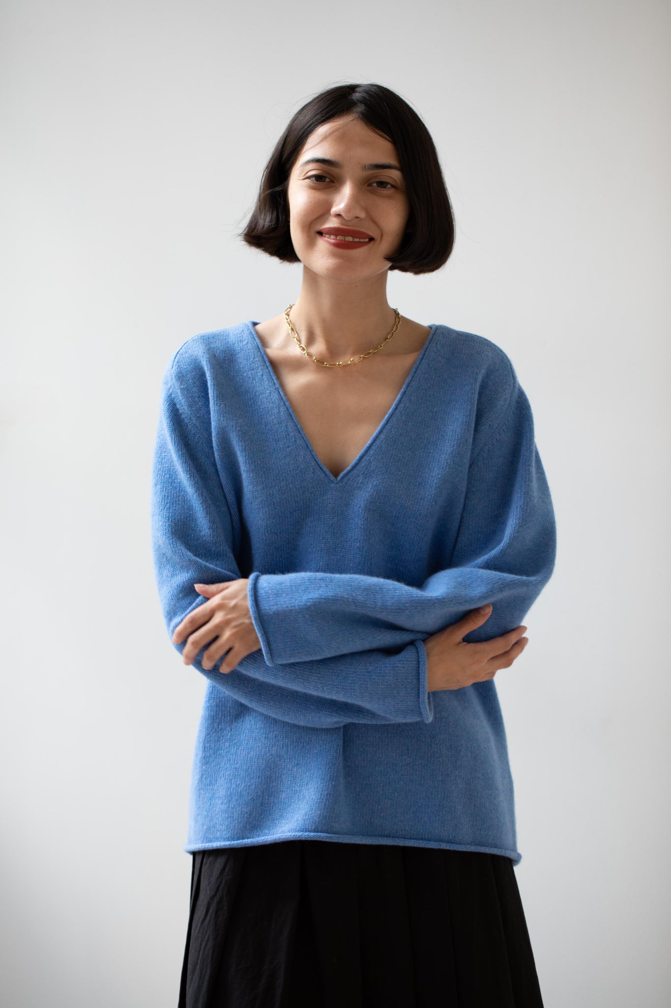This deep v-neck pullover is a great layering piece ideal for styling this fall. We loved it so much we have it in three colors. The knit is an ideal weight, not too light and not too heavy. The neck line is fully backed with a knit yoke, making it feel a bit more substantial. The sleeves have an ever so slight curve to them, which gives a nice silhouette.
