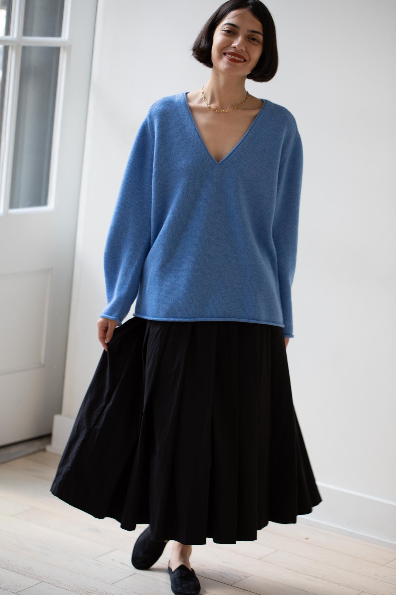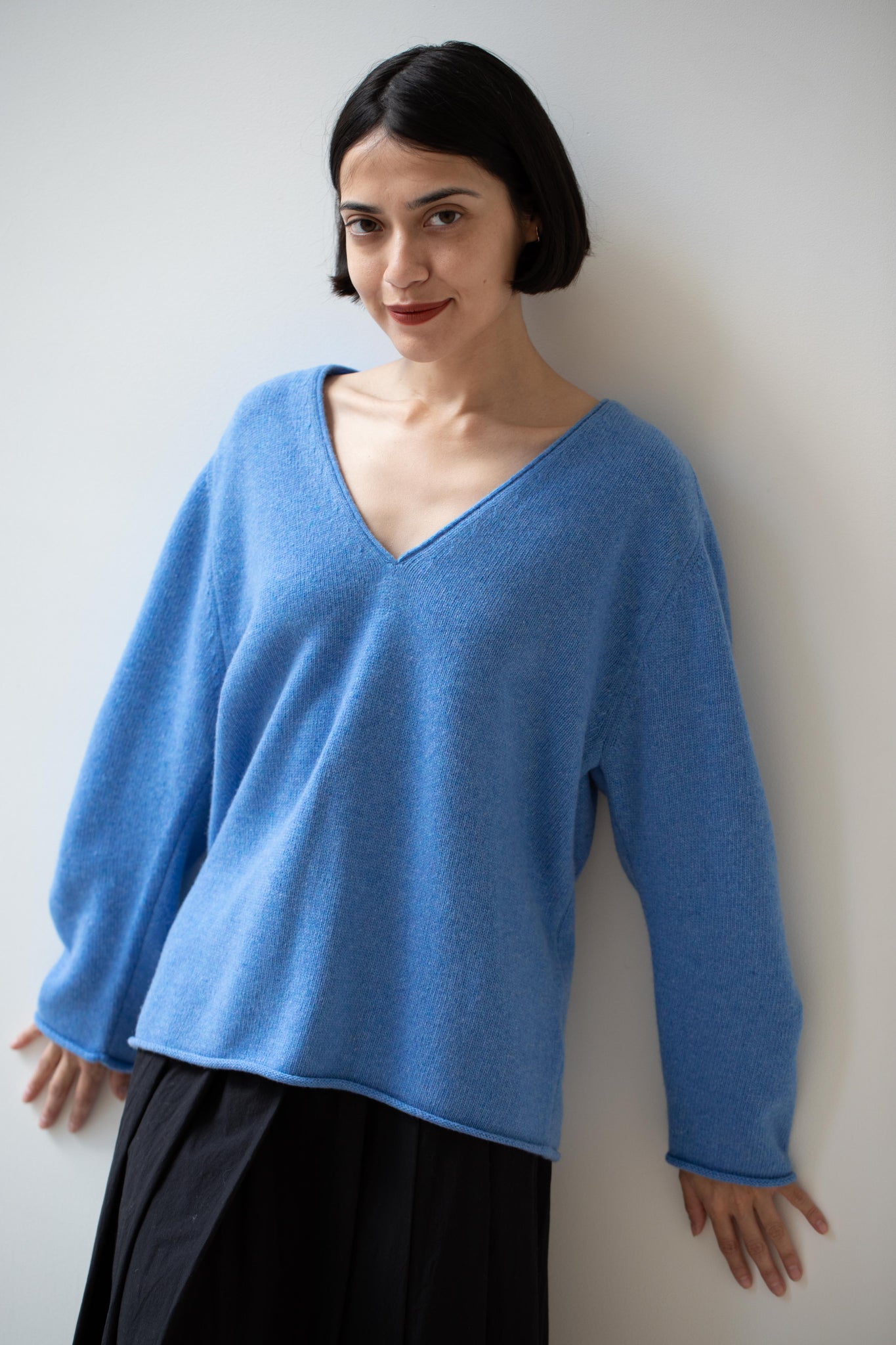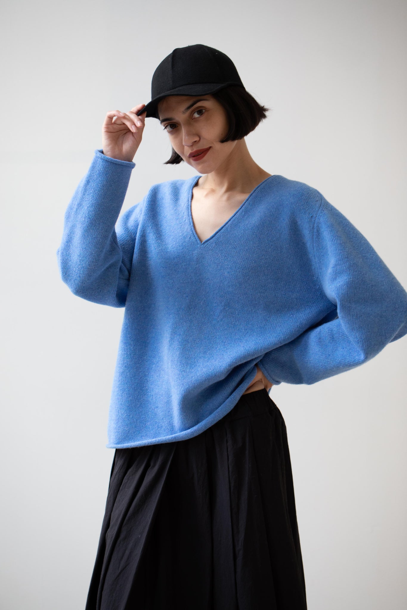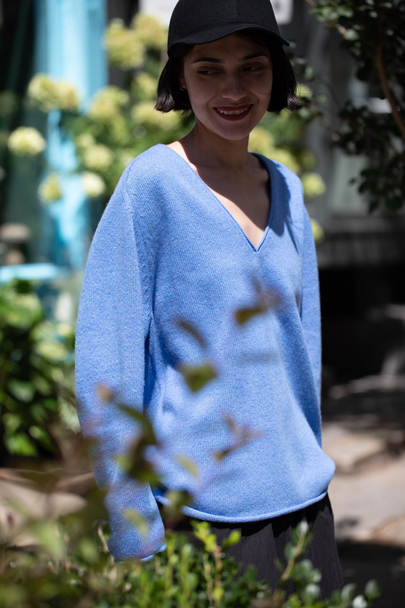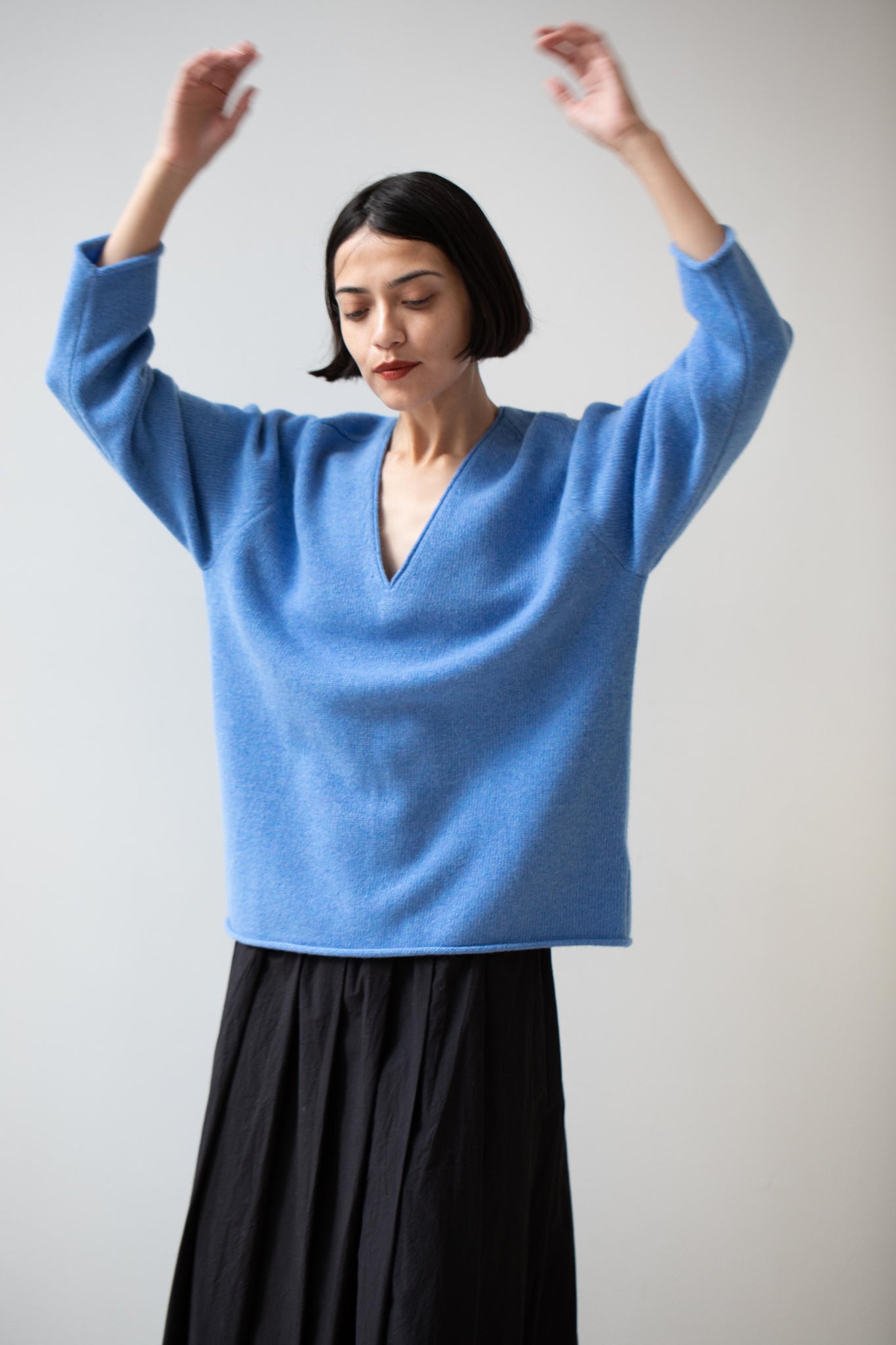 This deep v-neck pullover is a great layering piece ideal for styling this fall. We loved it so much we have it in three colors. The knit is an ideal weight, not too light and not too heavy. The neck line is fully backed with a knit yoke, making it feel a bit more substantial. The sleeves have an ever so slight curve to them, which gives a nice silhouette.