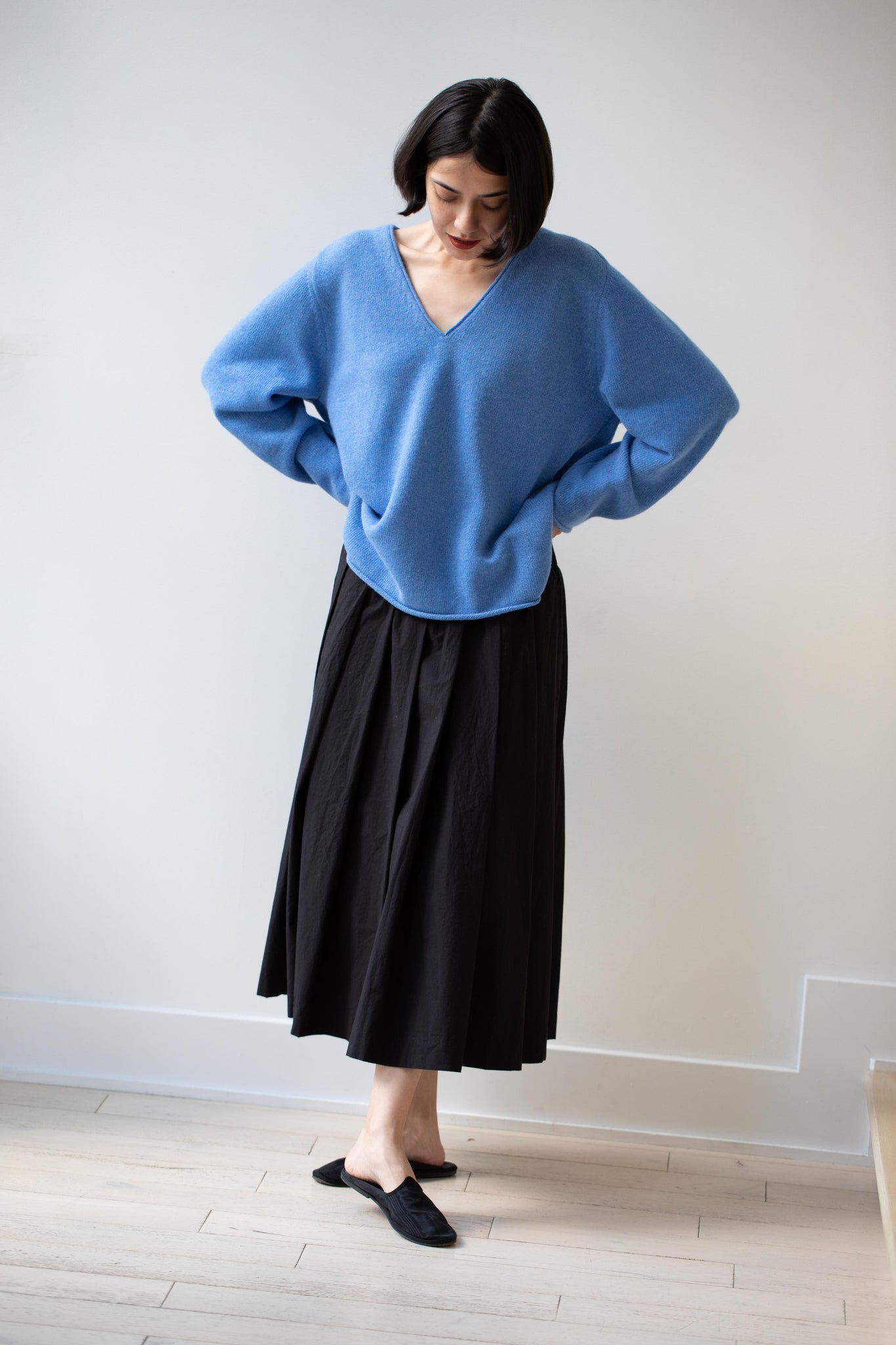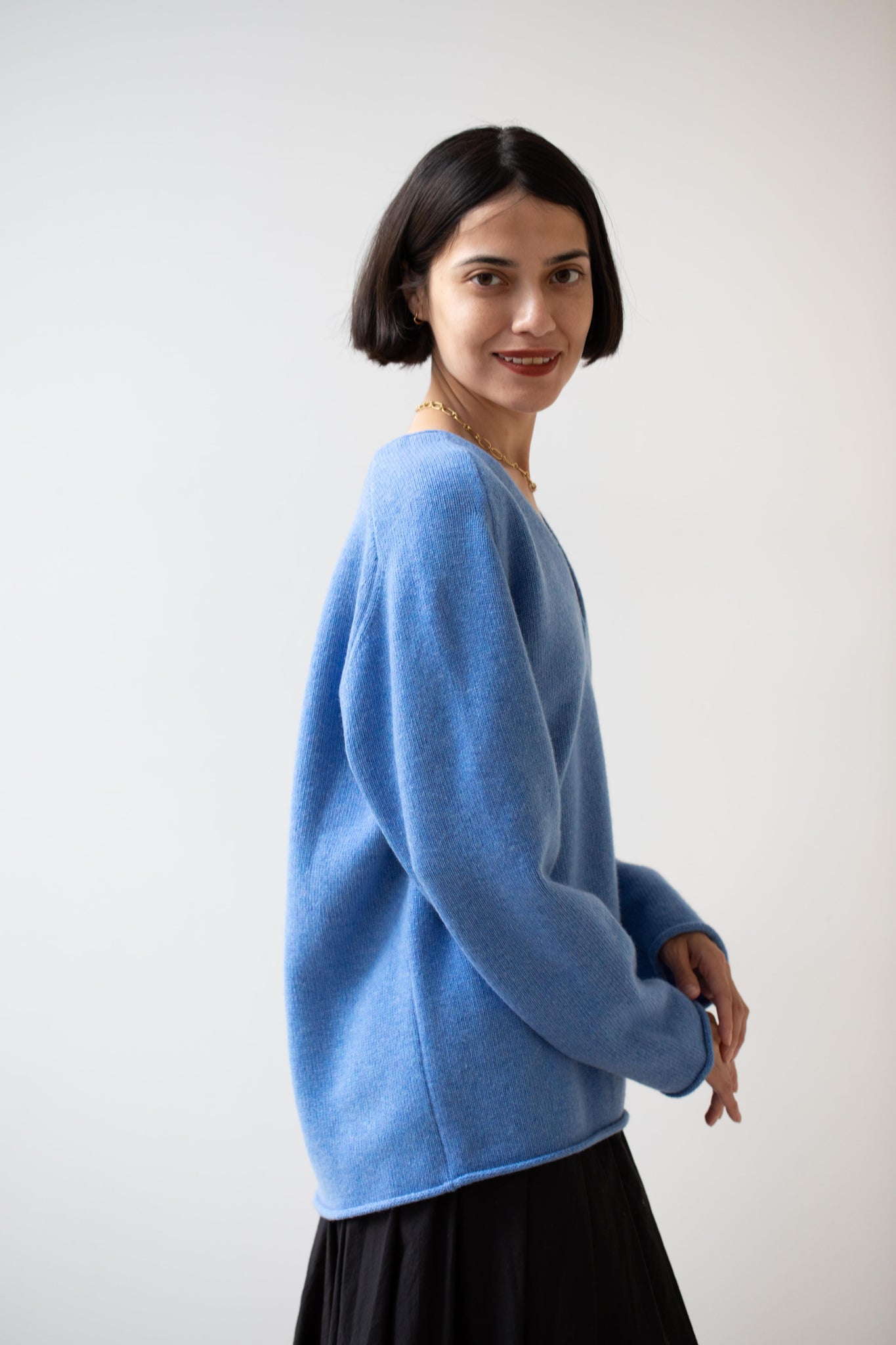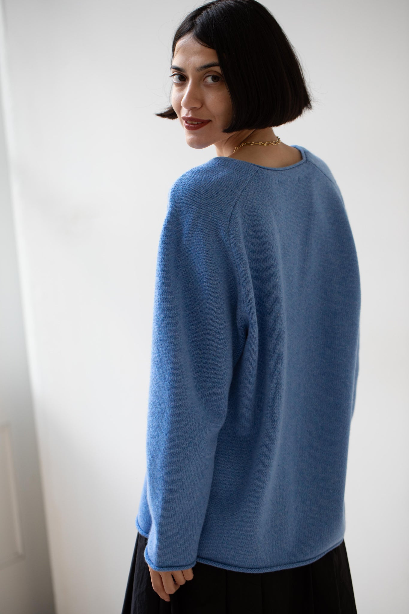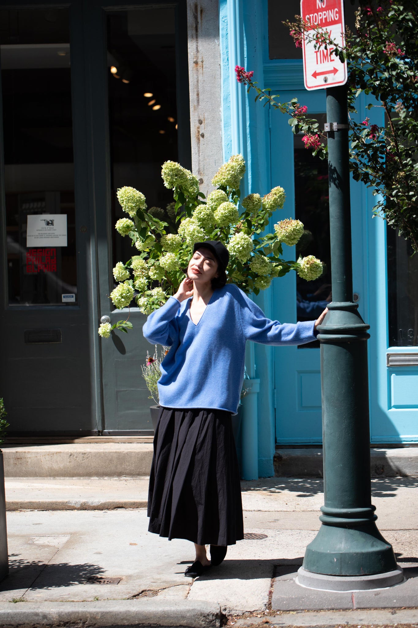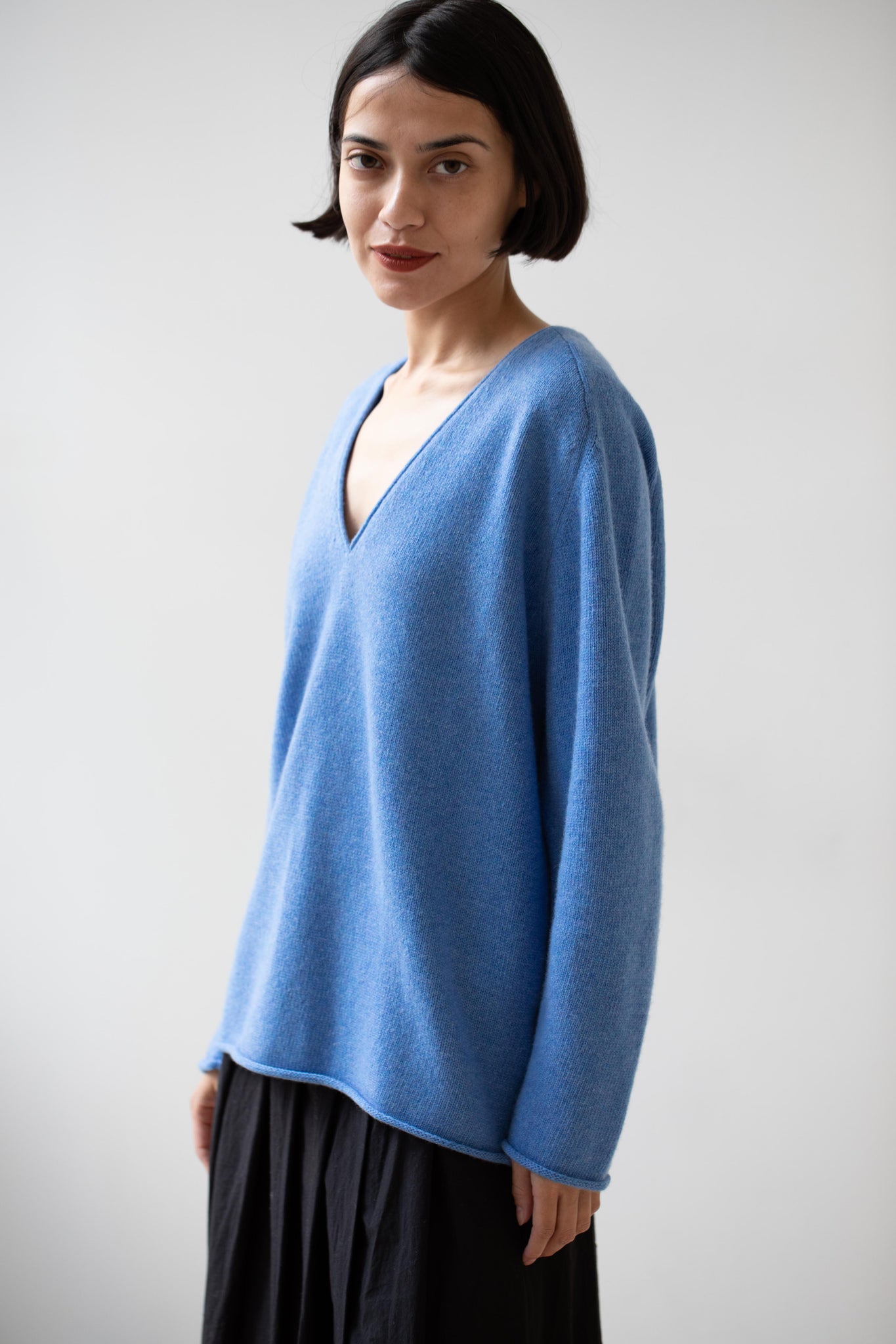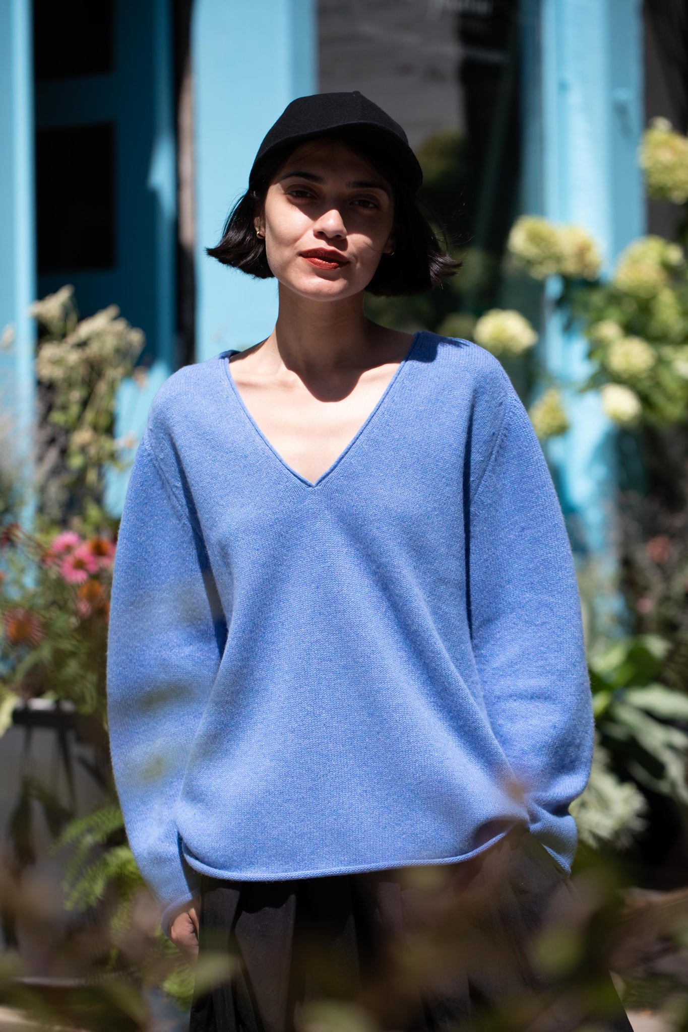 This deep v-neck pullover is a great layering piece ideal for styling this fall. We loved it so much we have it in three colors. The knit is an ideal weight, not too light and not too heavy. The neck line is fully backed with a knit yoke, making it feel a bit more substantial. The sleeves have an ever so slight curve to them, which gives a nice silhouette.