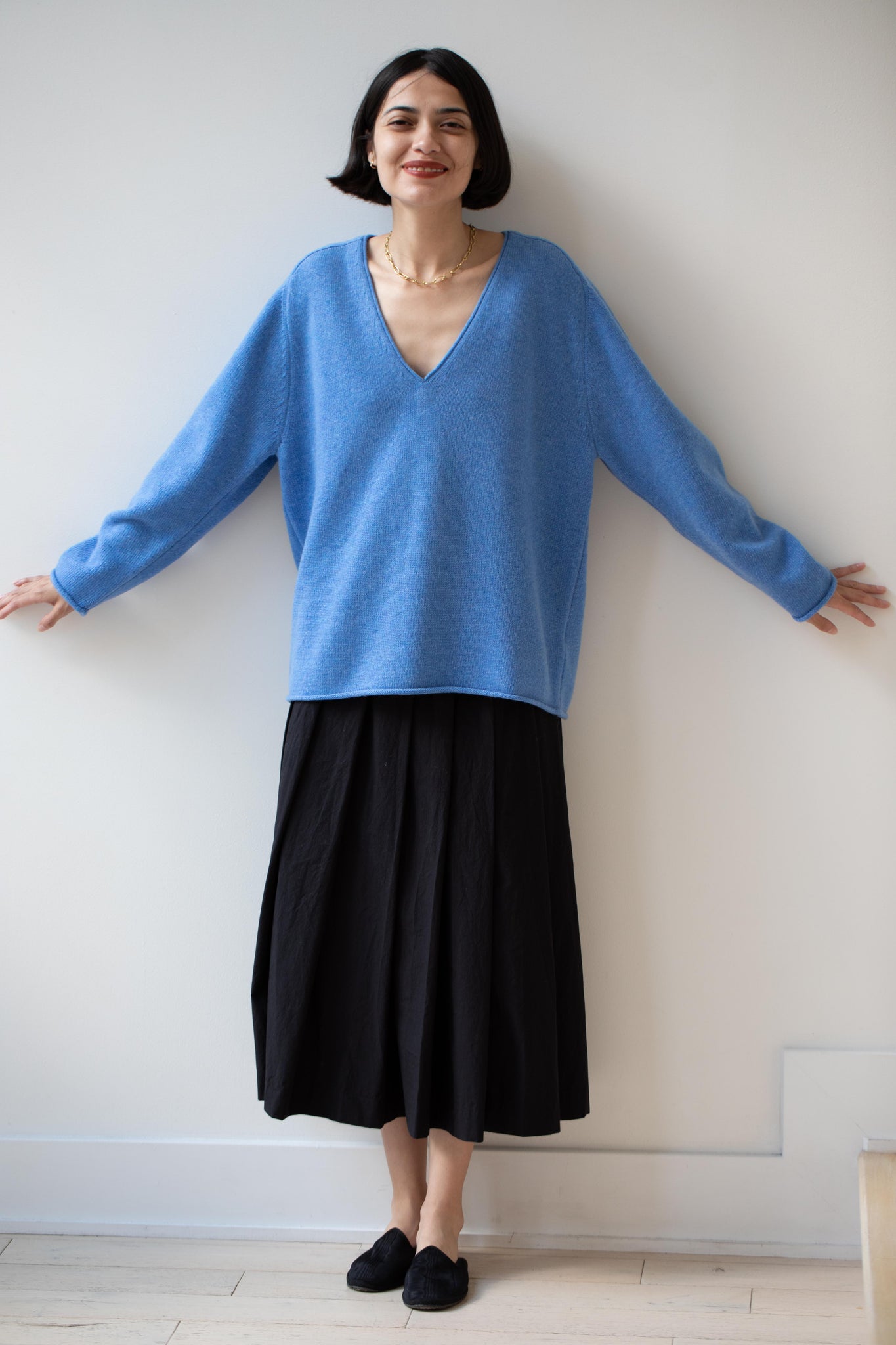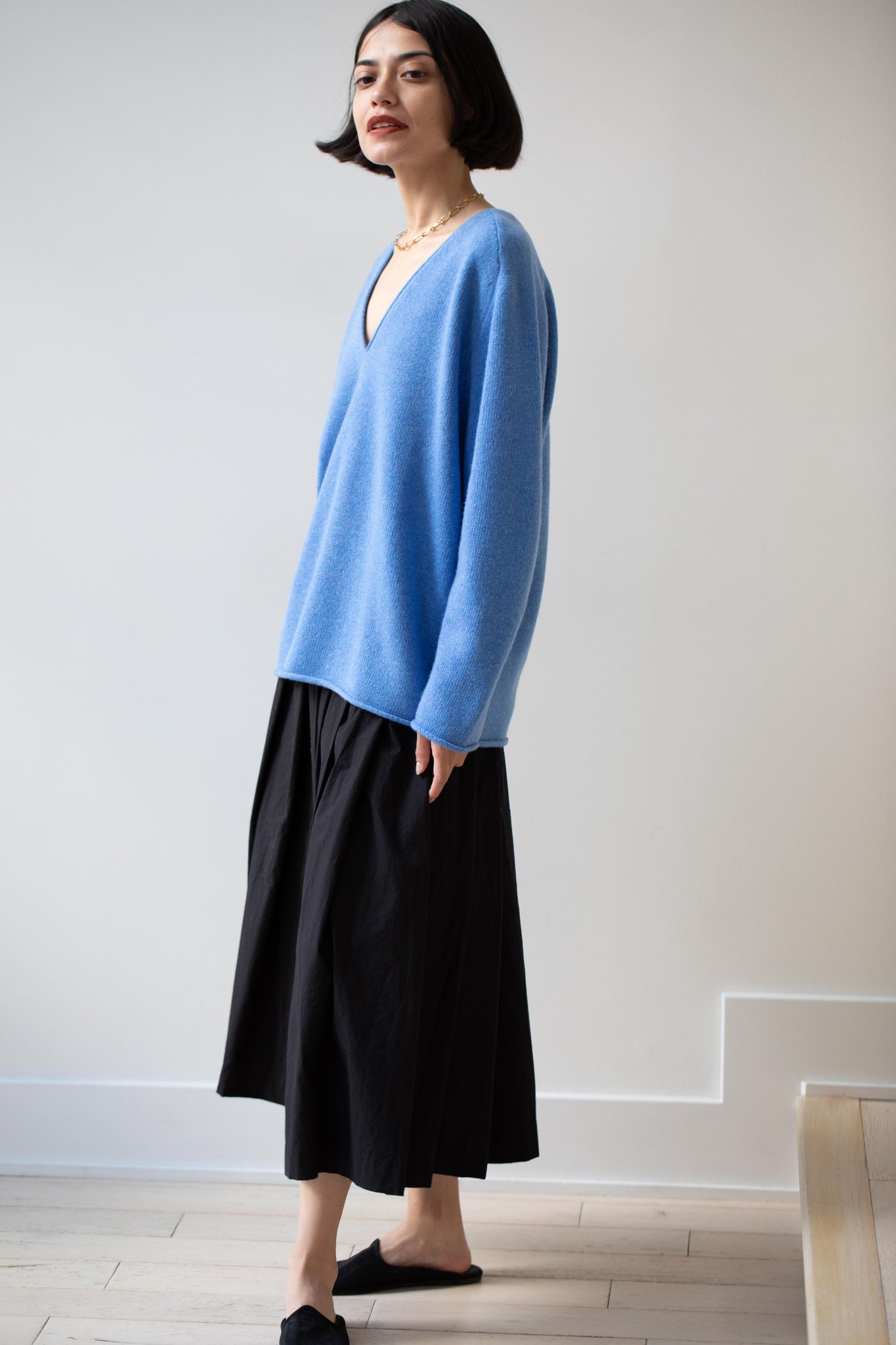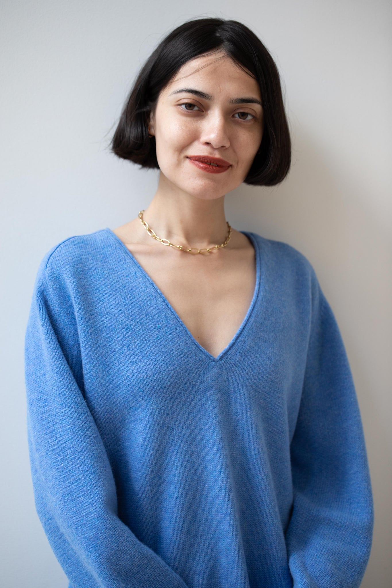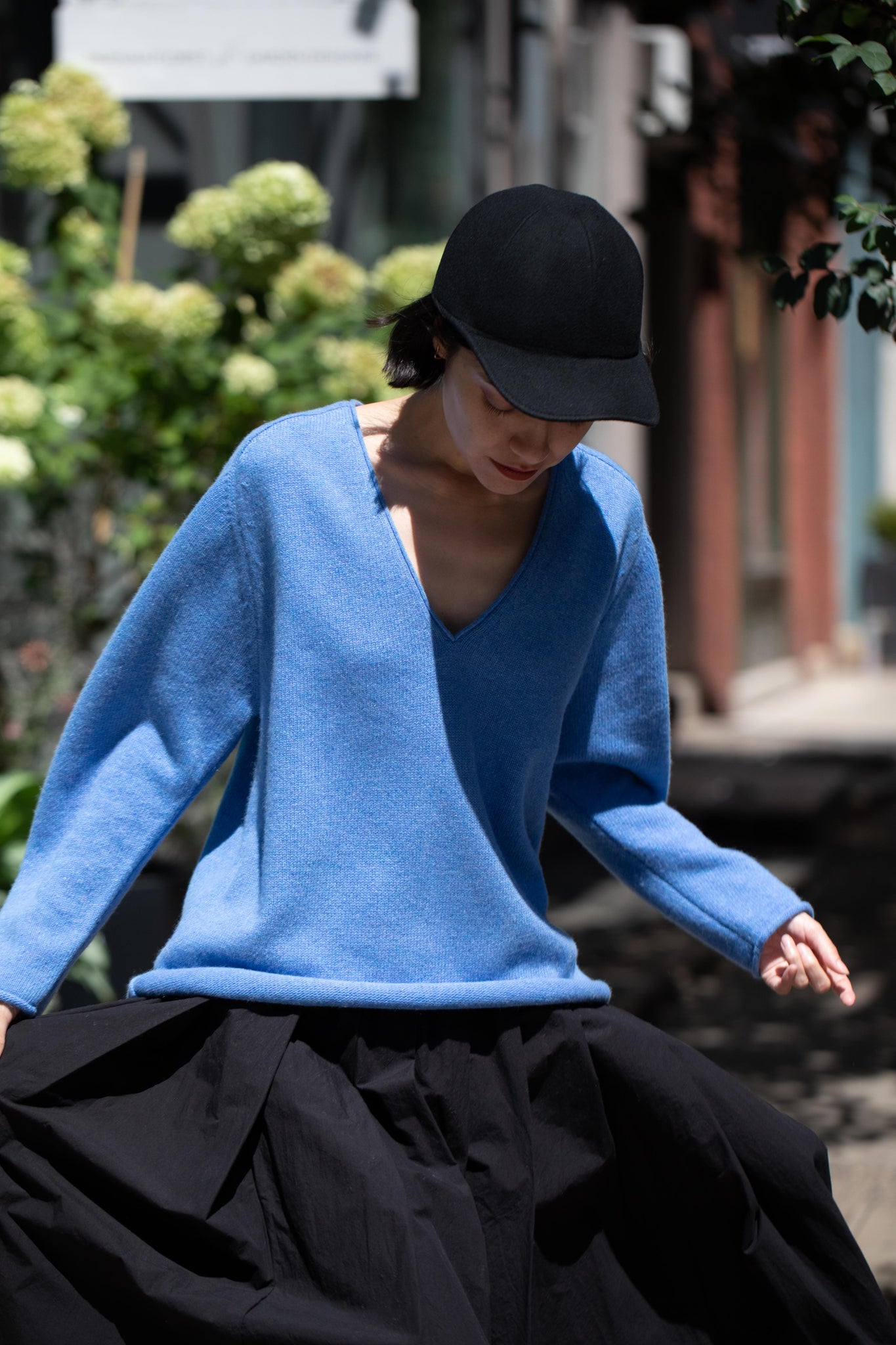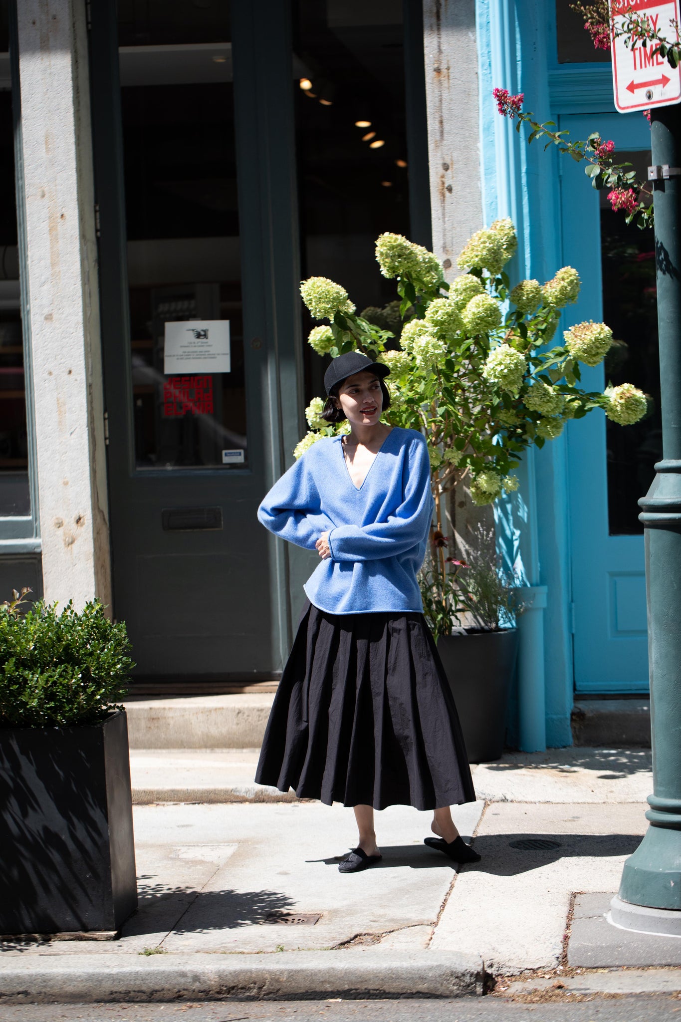 This deep v-neck pullover is a great layering piece ideal for styling this fall. We loved it so much we have it in three colors. The knit is an ideal weight, not too light and not too heavy. The neck line is fully backed with a knit yoke, making it feel a bit more substantial. The sleeves have an ever so slight curve to them, which gives a nice silhouette.