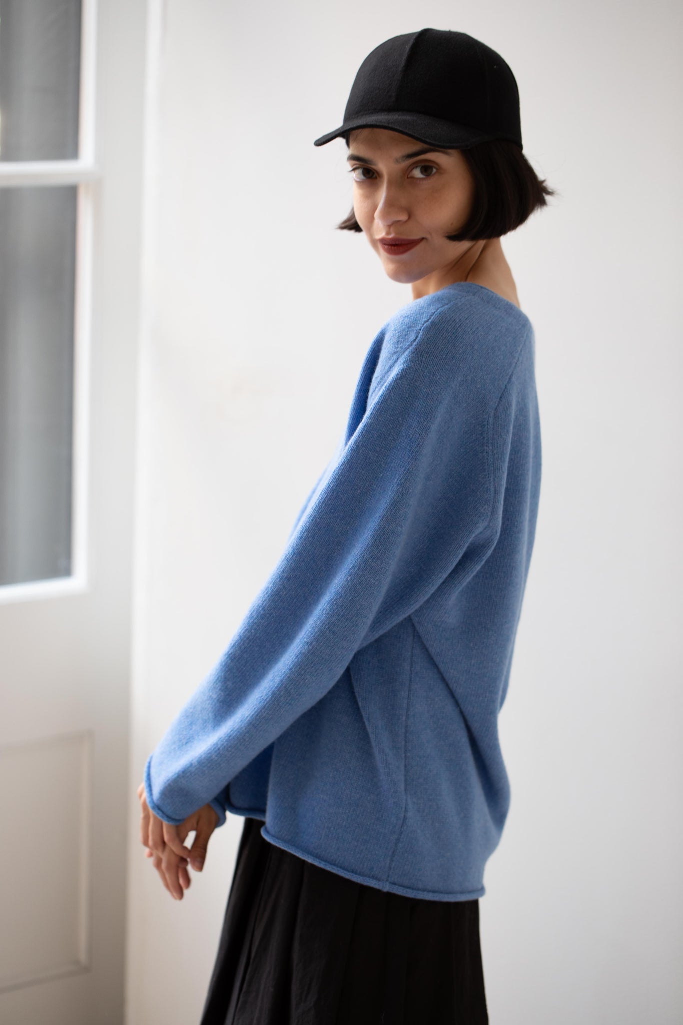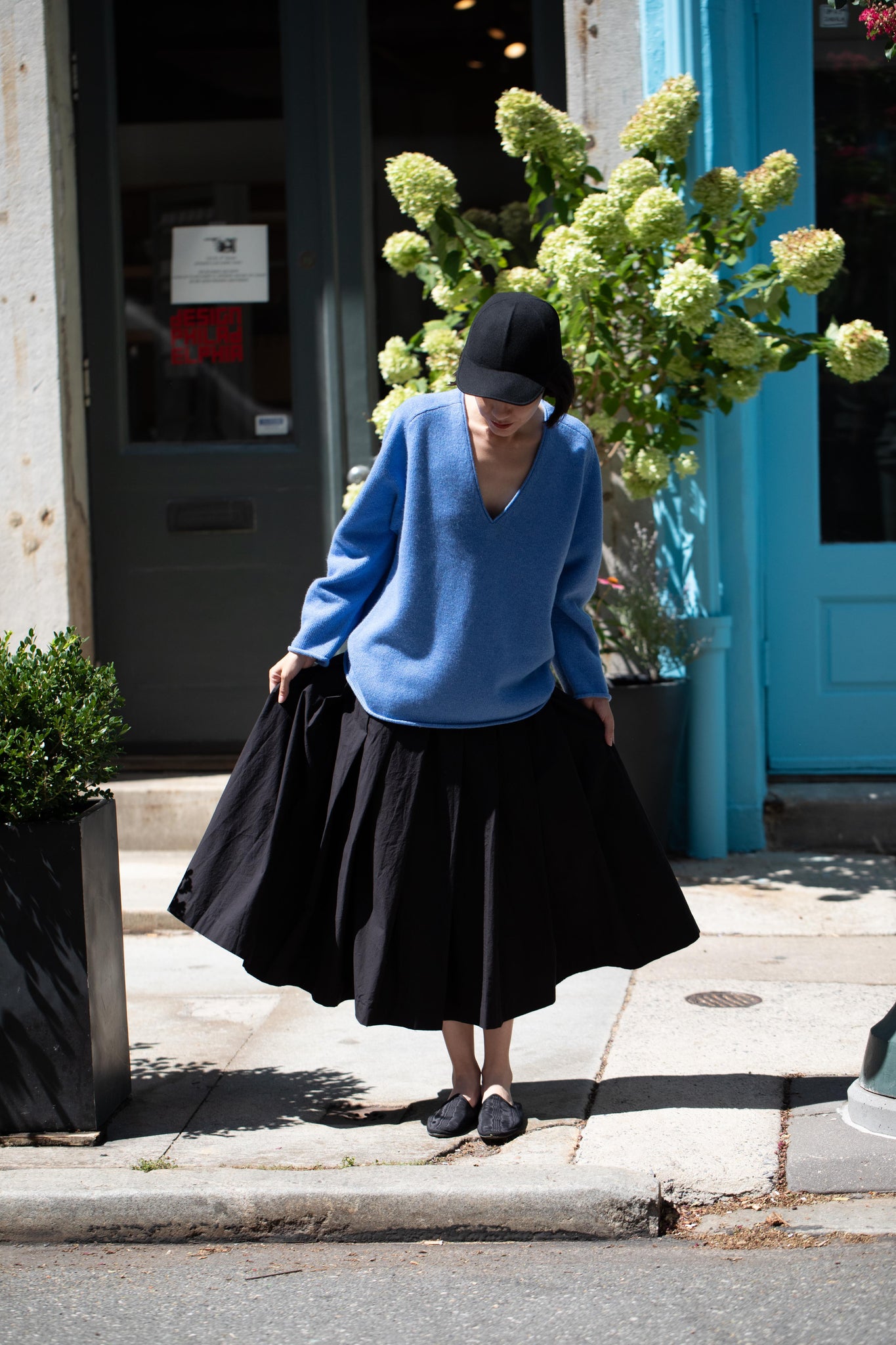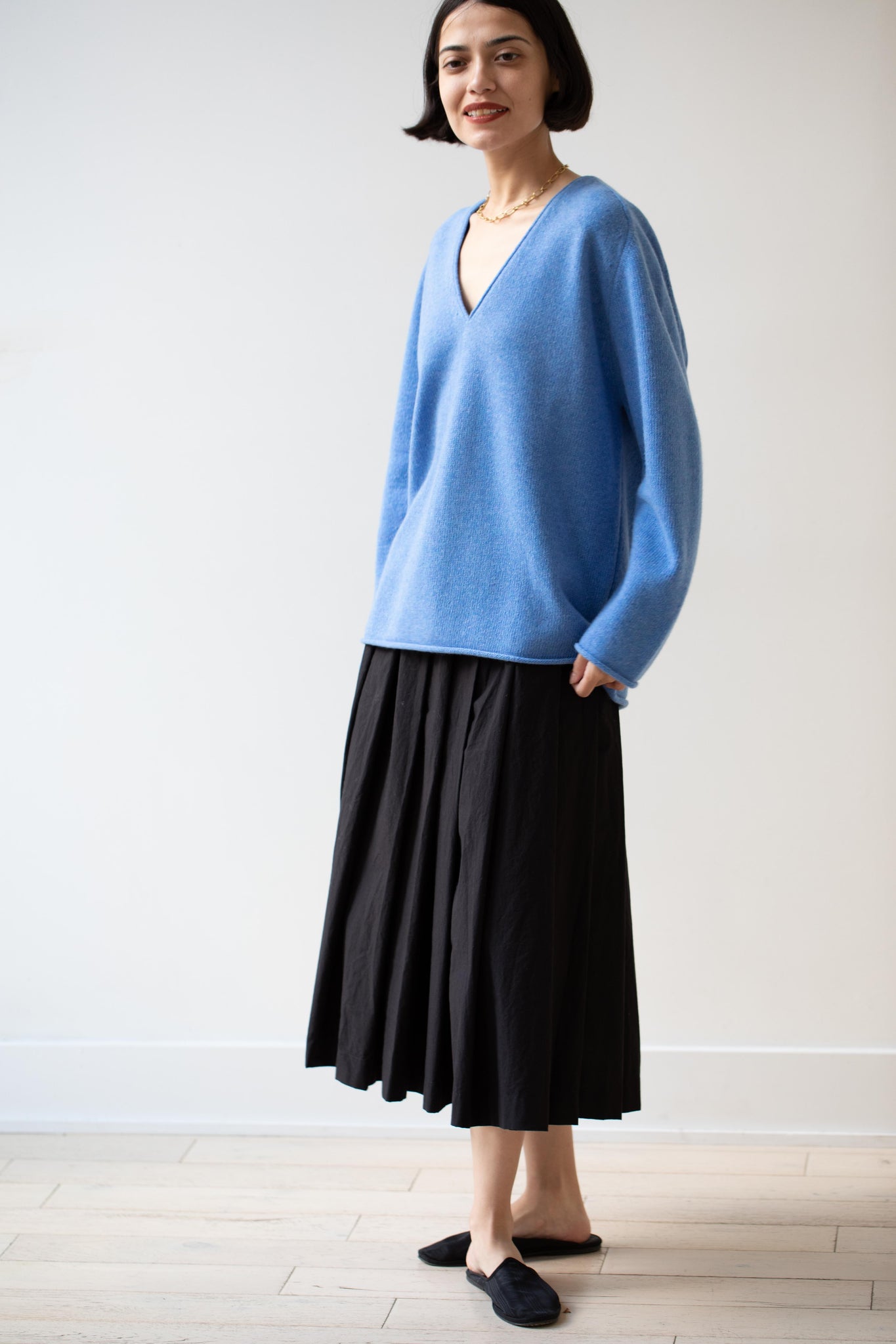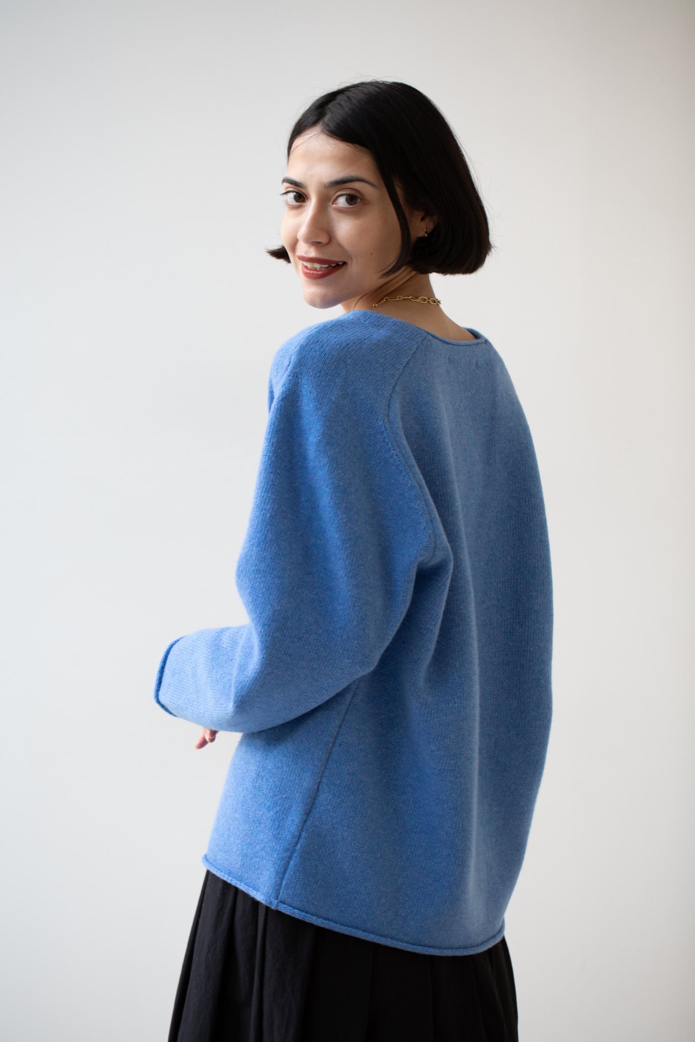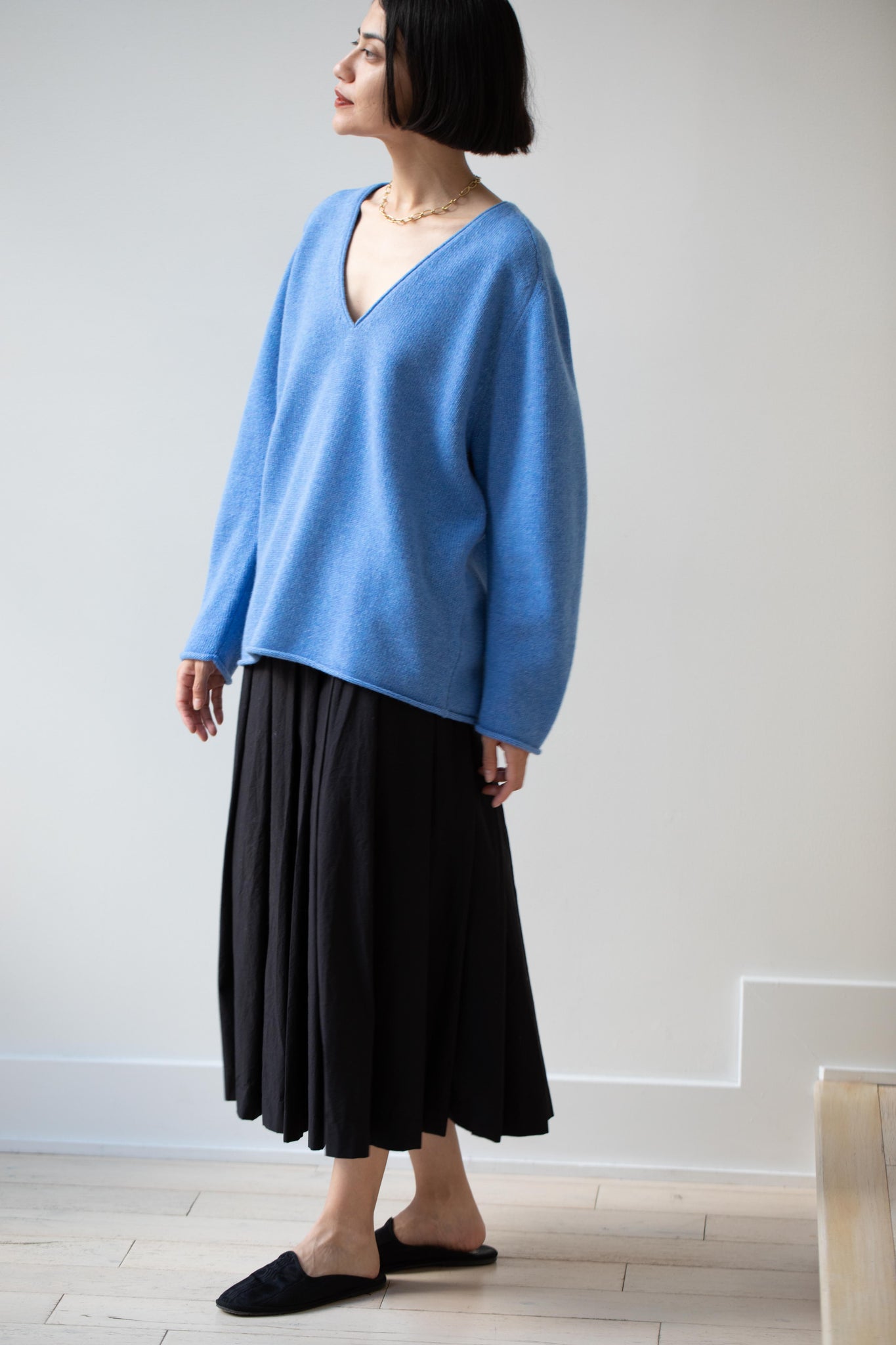 This deep v-neck pullover is a great layering piece ideal for styling this fall. We loved it so much we have it in three colors. The knit is an ideal weight, not too light and not too heavy. The neck line is fully backed with a knit yoke, making it feel a bit more substantial. The sleeves have an ever so slight curve to them, which gives a nice silhouette.
