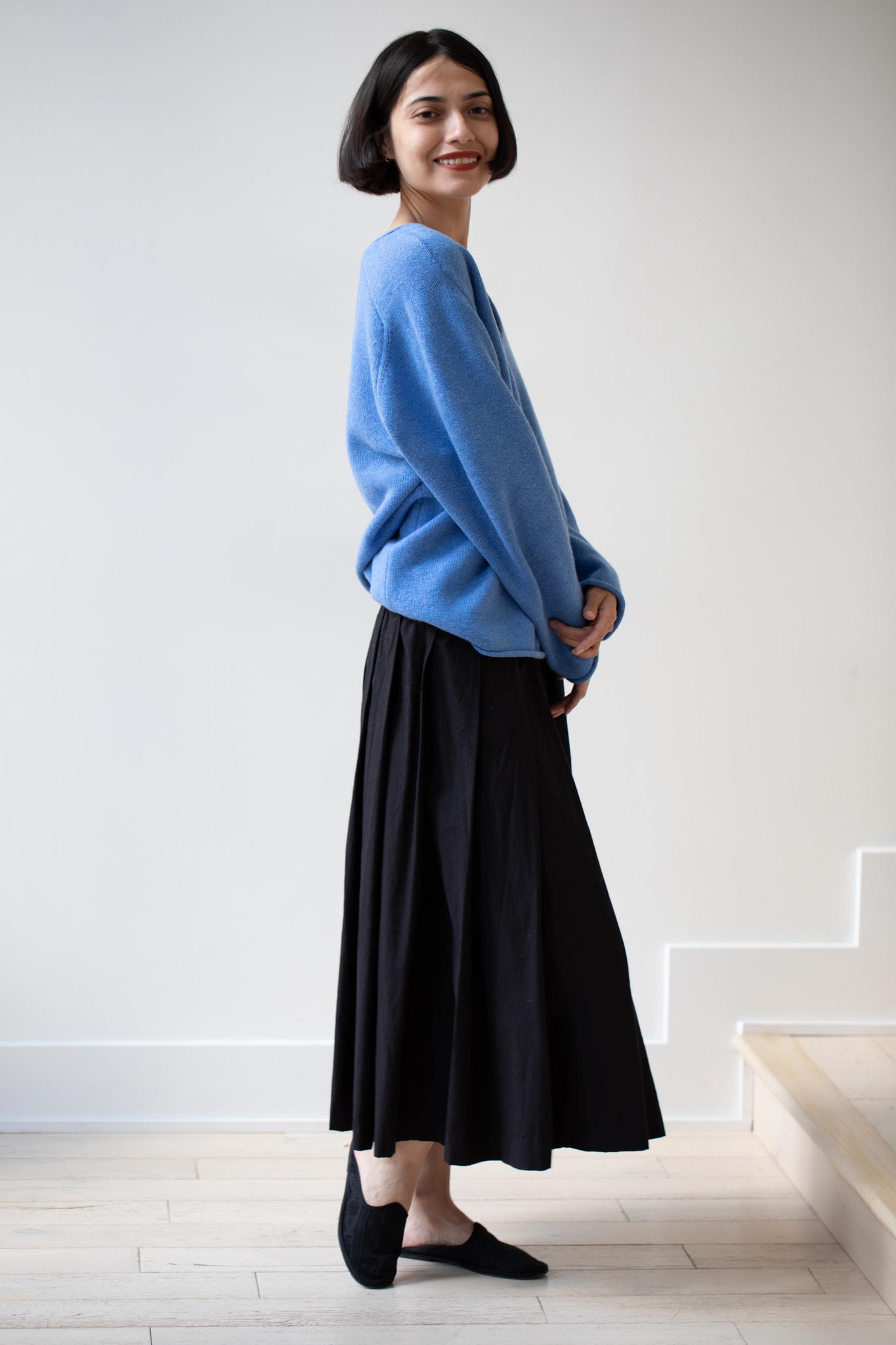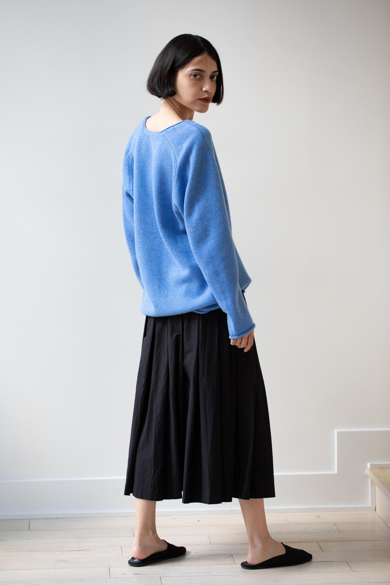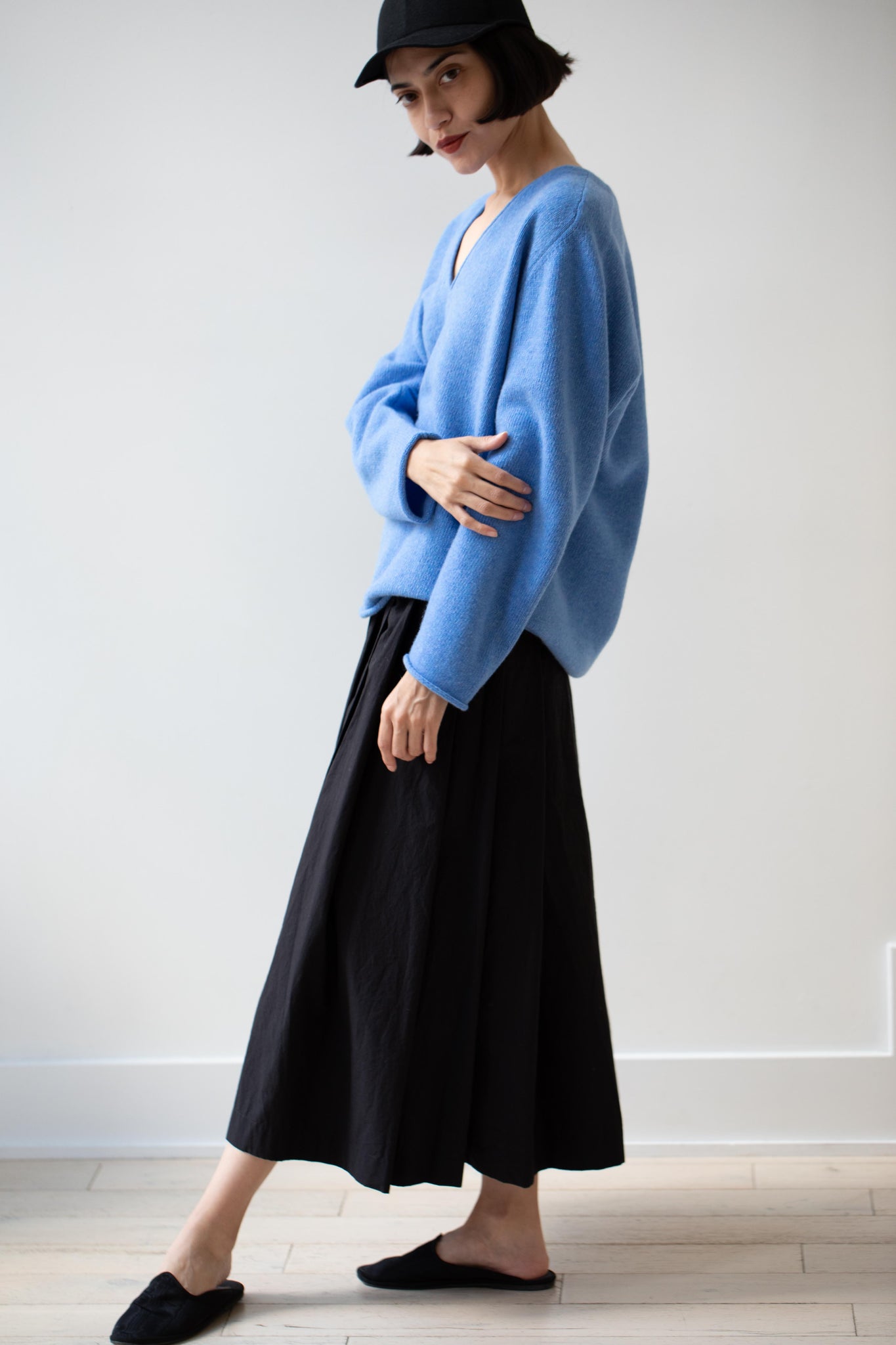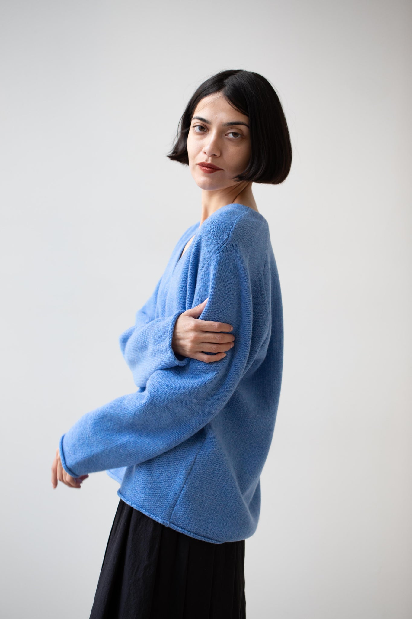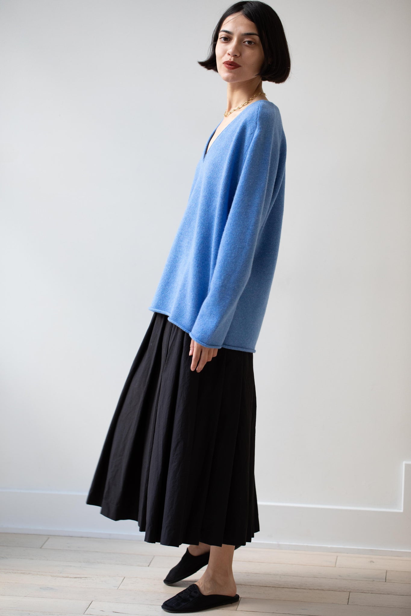 This deep v-neck pullover is a great layering piece ideal for styling this fall. We loved it so much we have it in three colors. The knit is an ideal weight, not too light and not too heavy. The neck line is fully backed with a knit yoke, making it feel a bit more substantial. The sleeves have an ever so slight curve to them, which gives a nice silhouette.