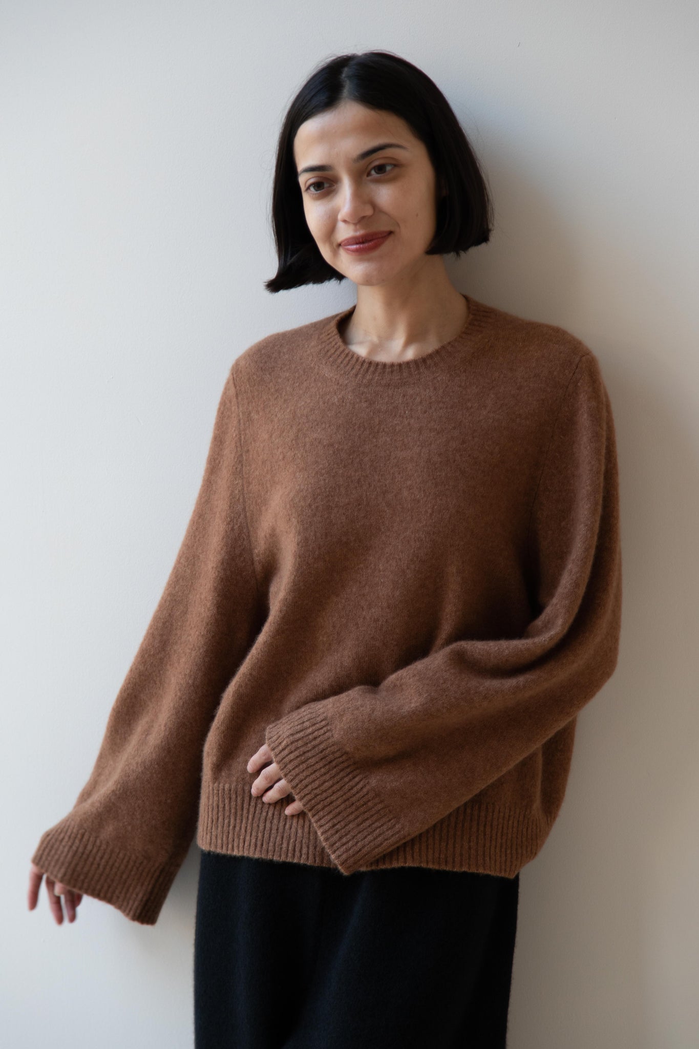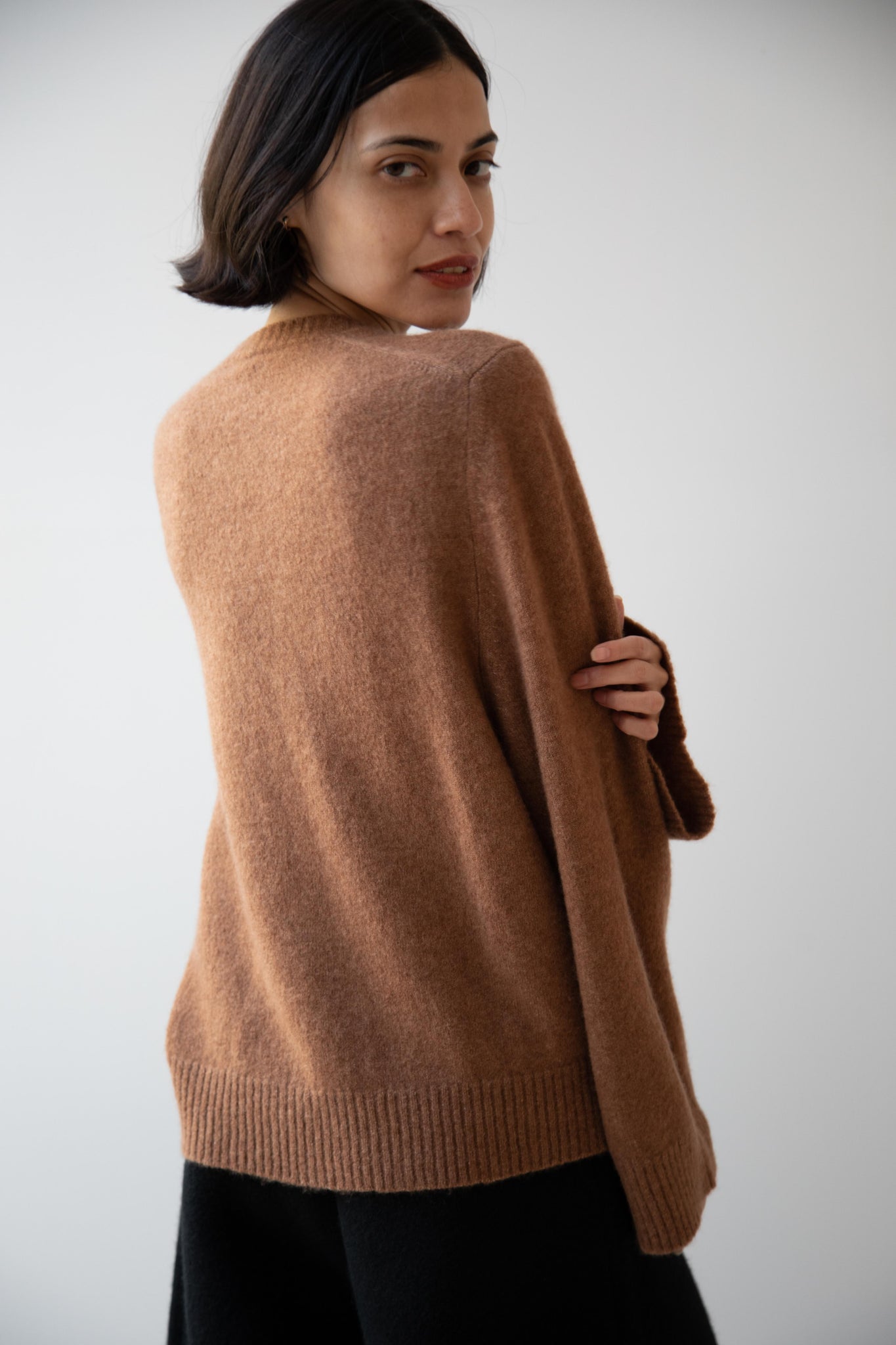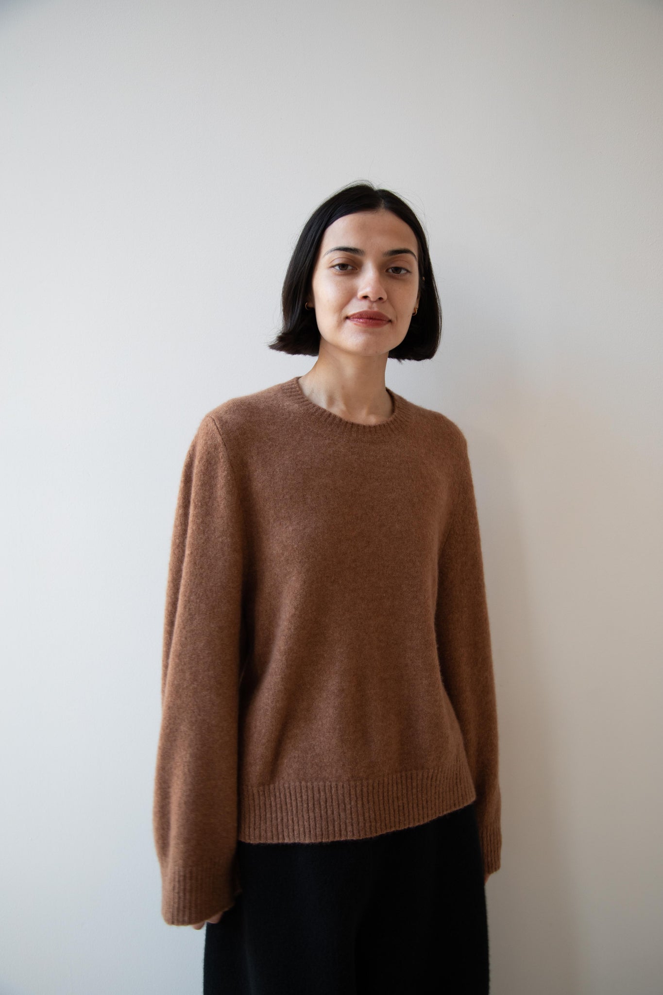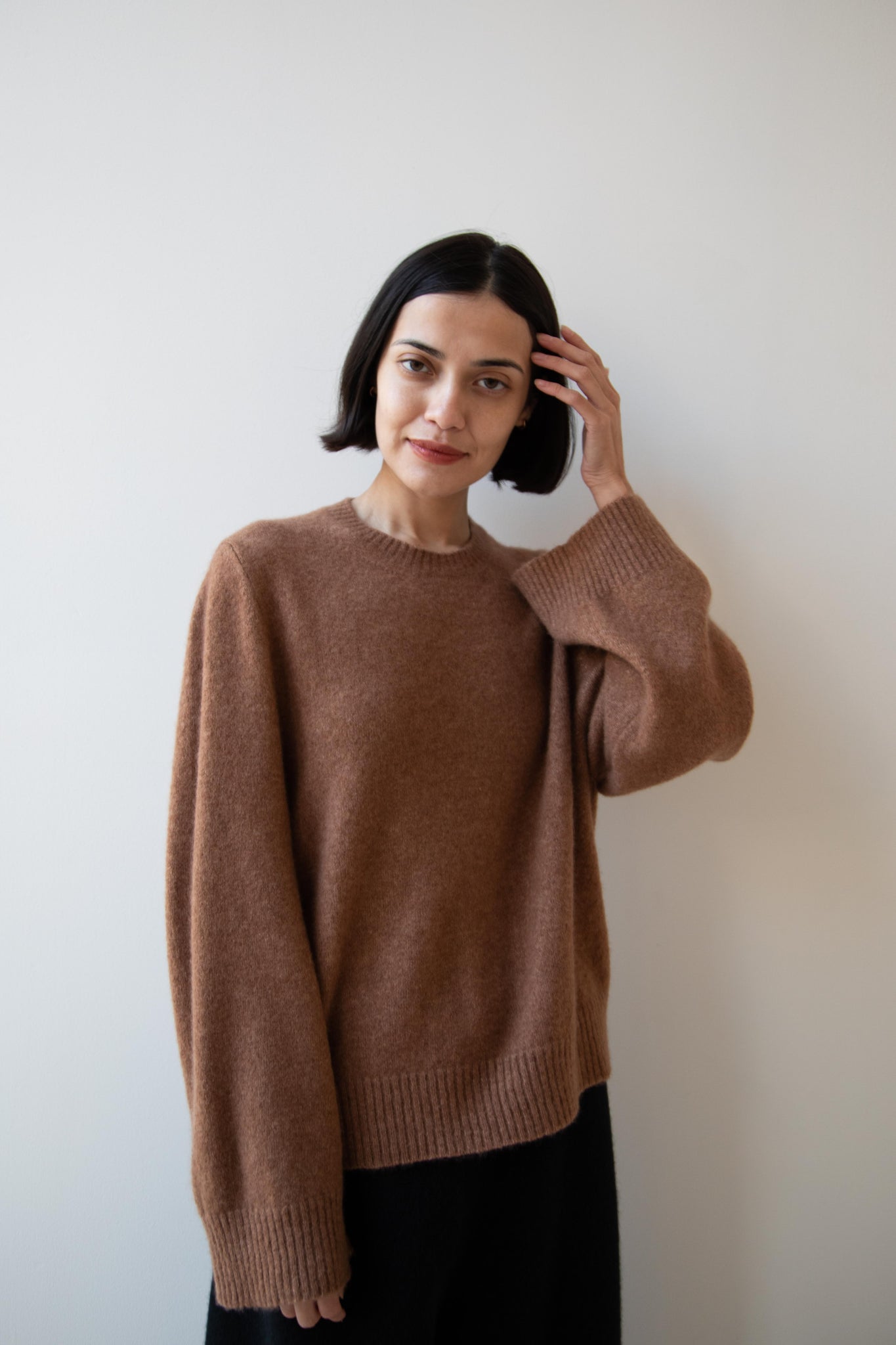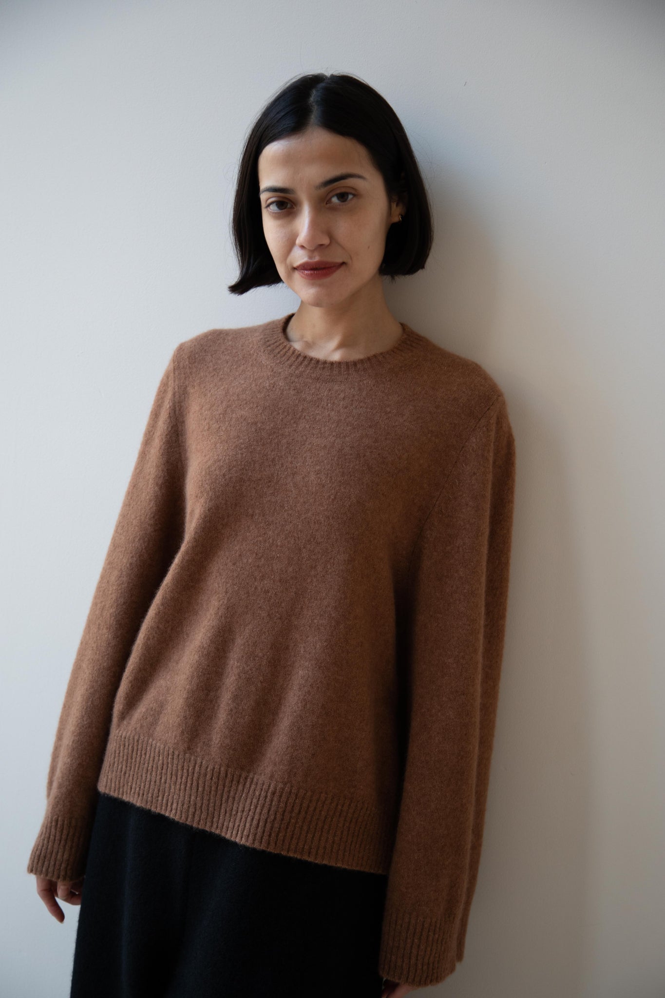 The ideal crewneck sweater - you need to try this on to believe how soft it is.  The cut is slightly oversized with elongated sleeves with a drop shoulder.  The yarn is a beautiful deep caramel shade with a lighter silk yarn running through it.