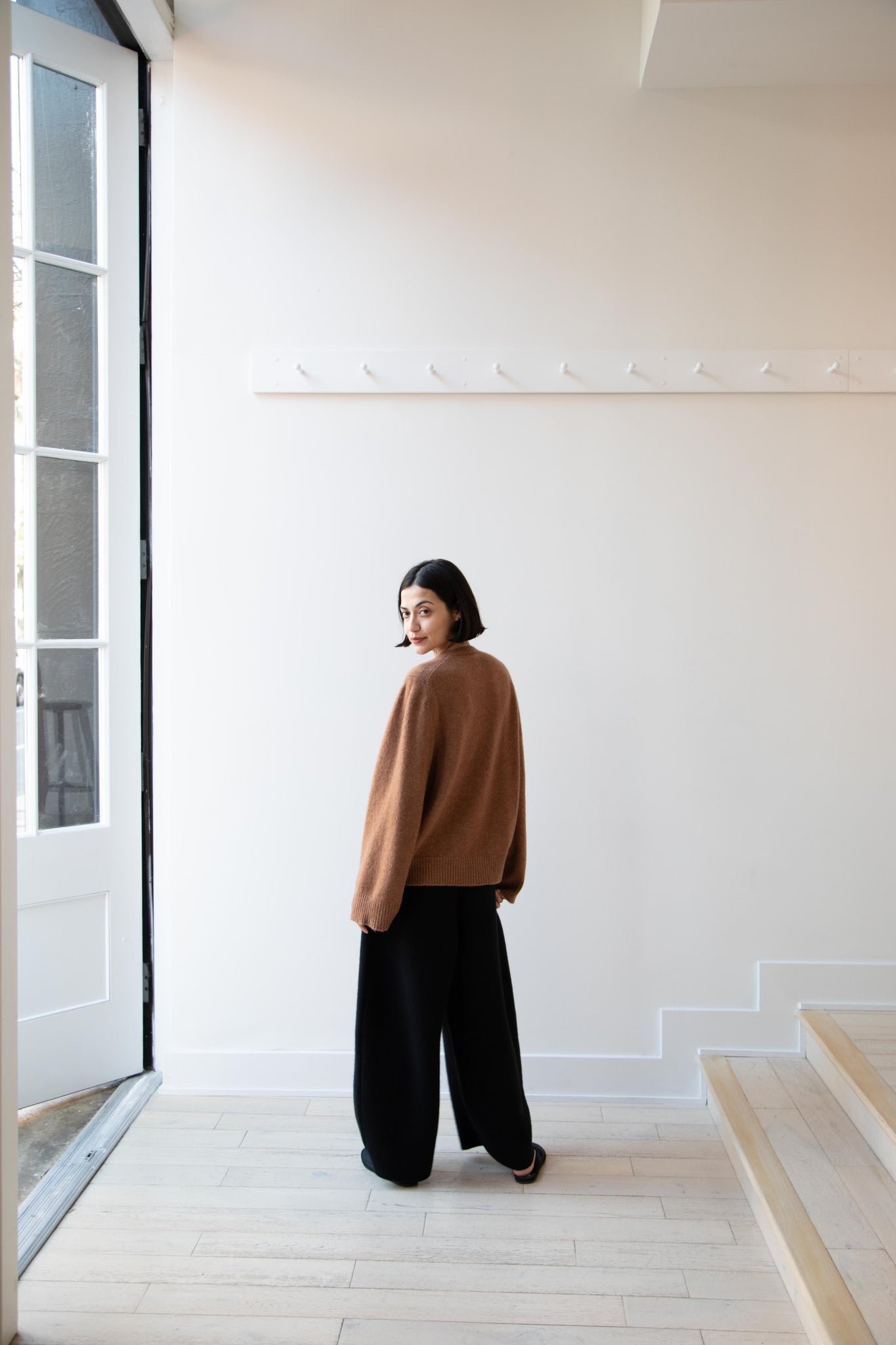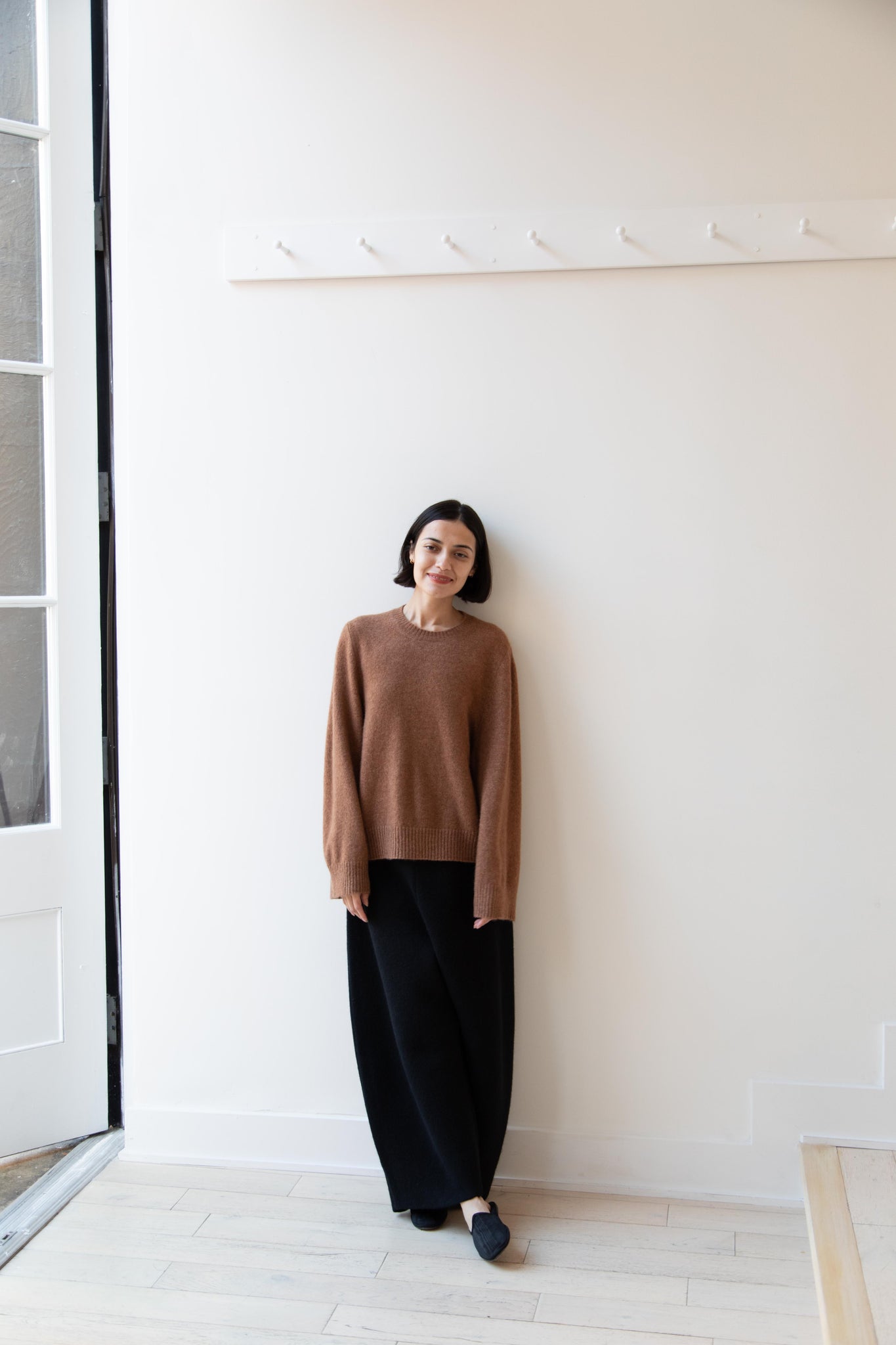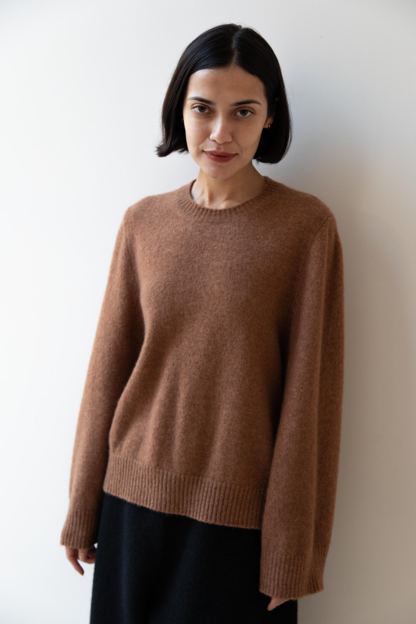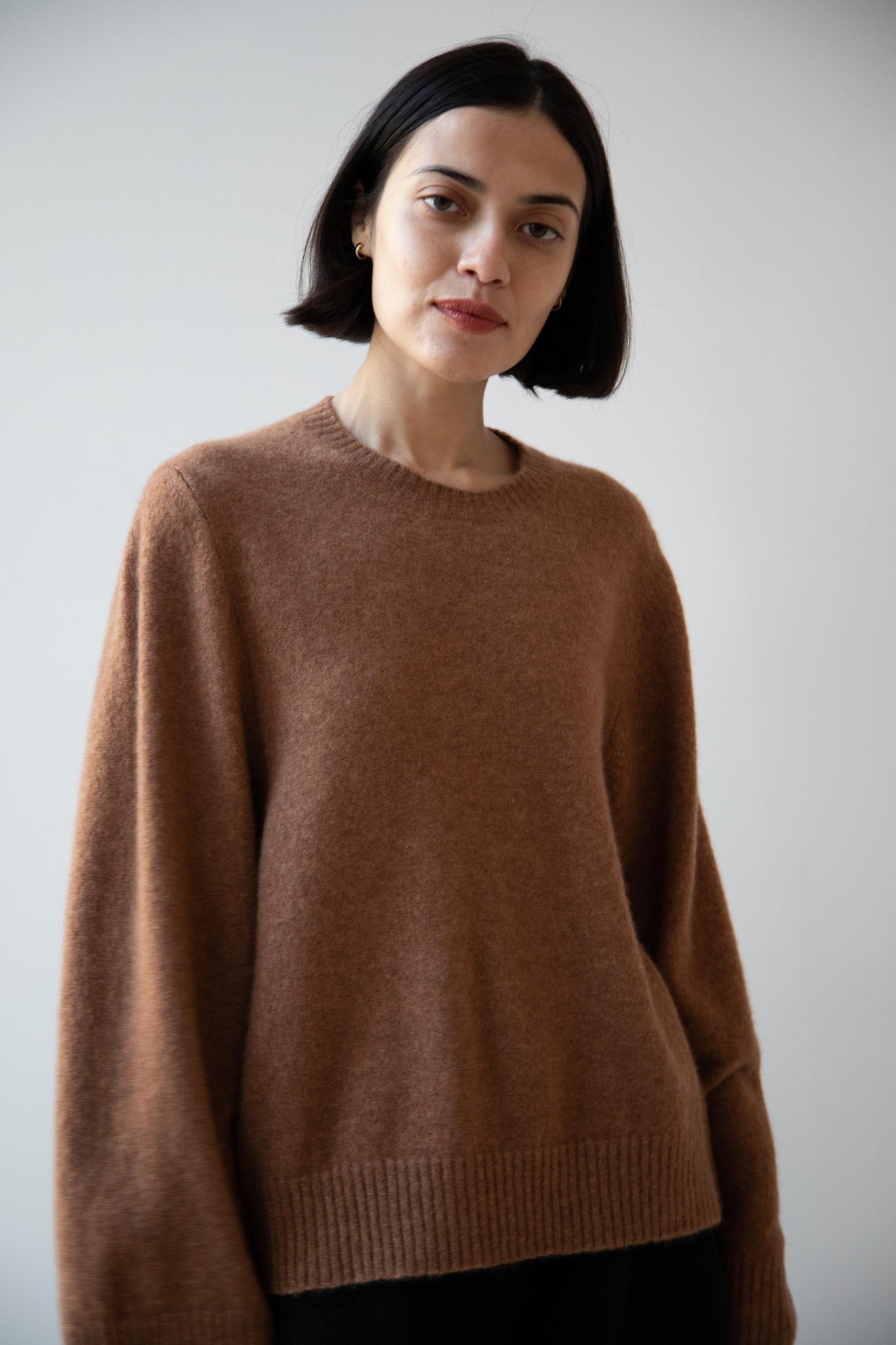 The ideal crewneck sweater - you need to try this on to believe how soft it is.  The cut is slightly oversized with elongated sleeves with a drop shoulder.  The yarn is a beautiful deep caramel shade with a lighter silk yarn running through it.