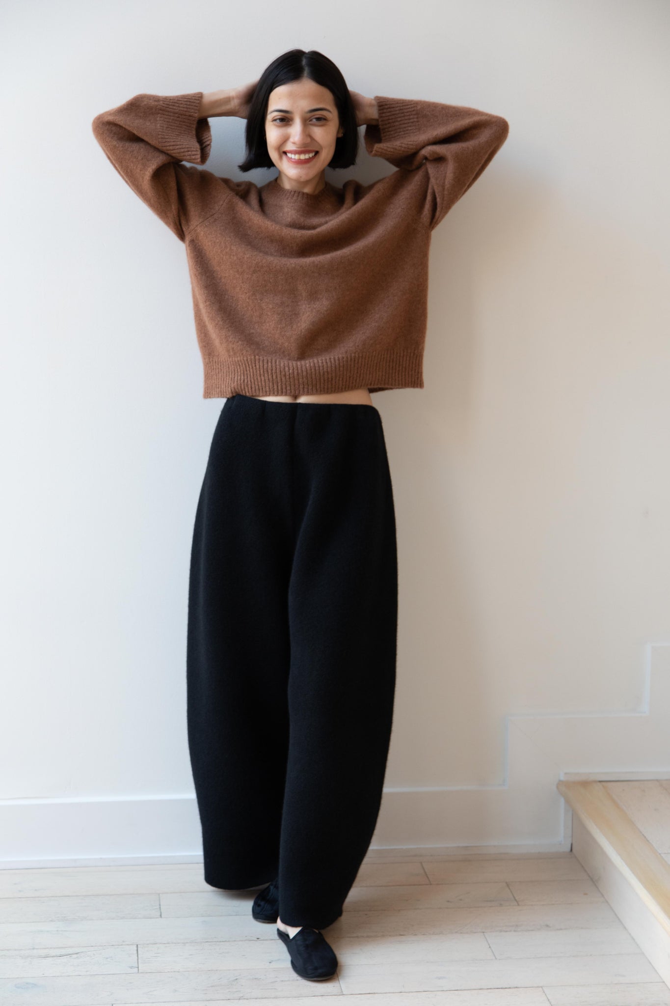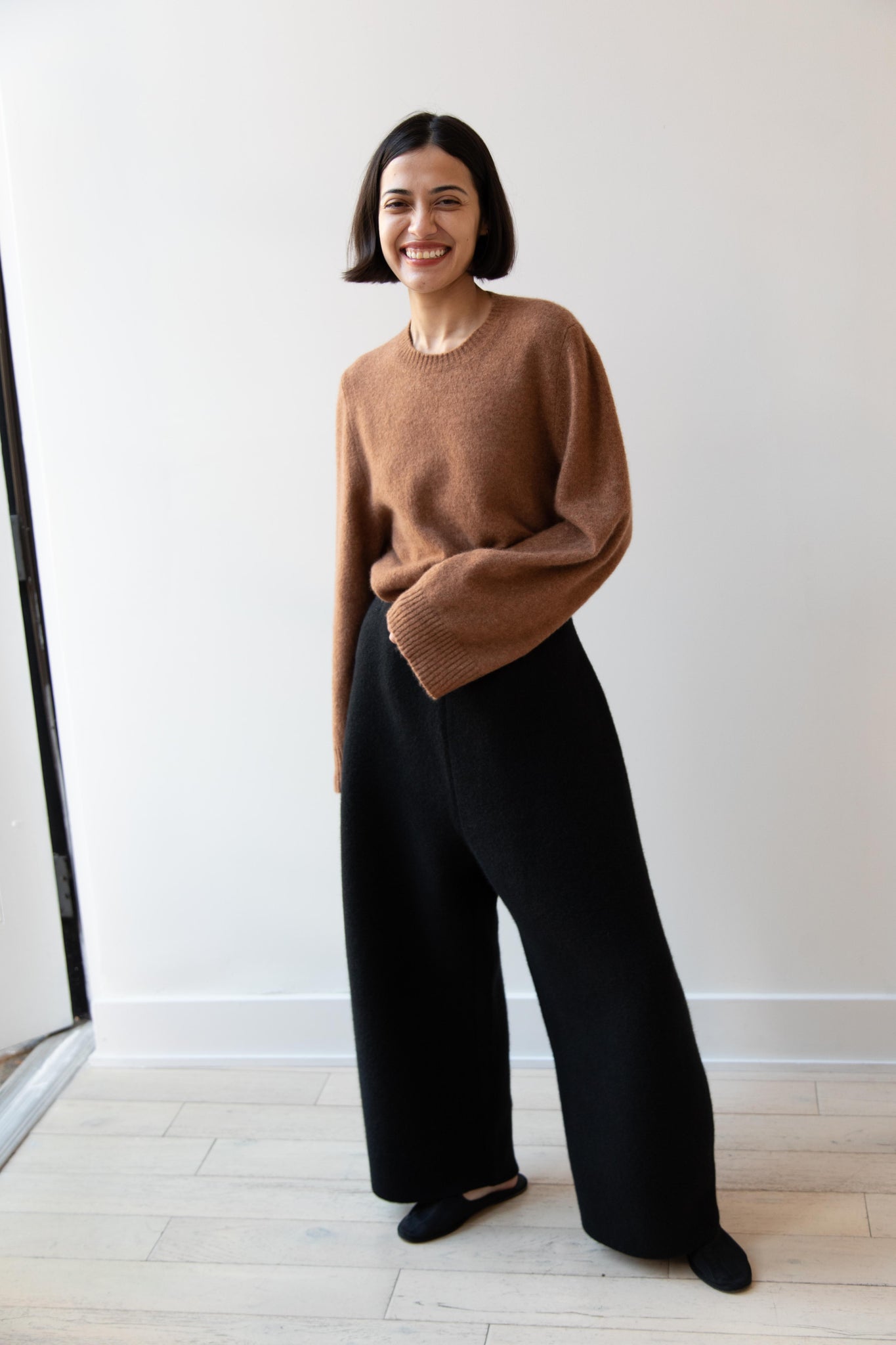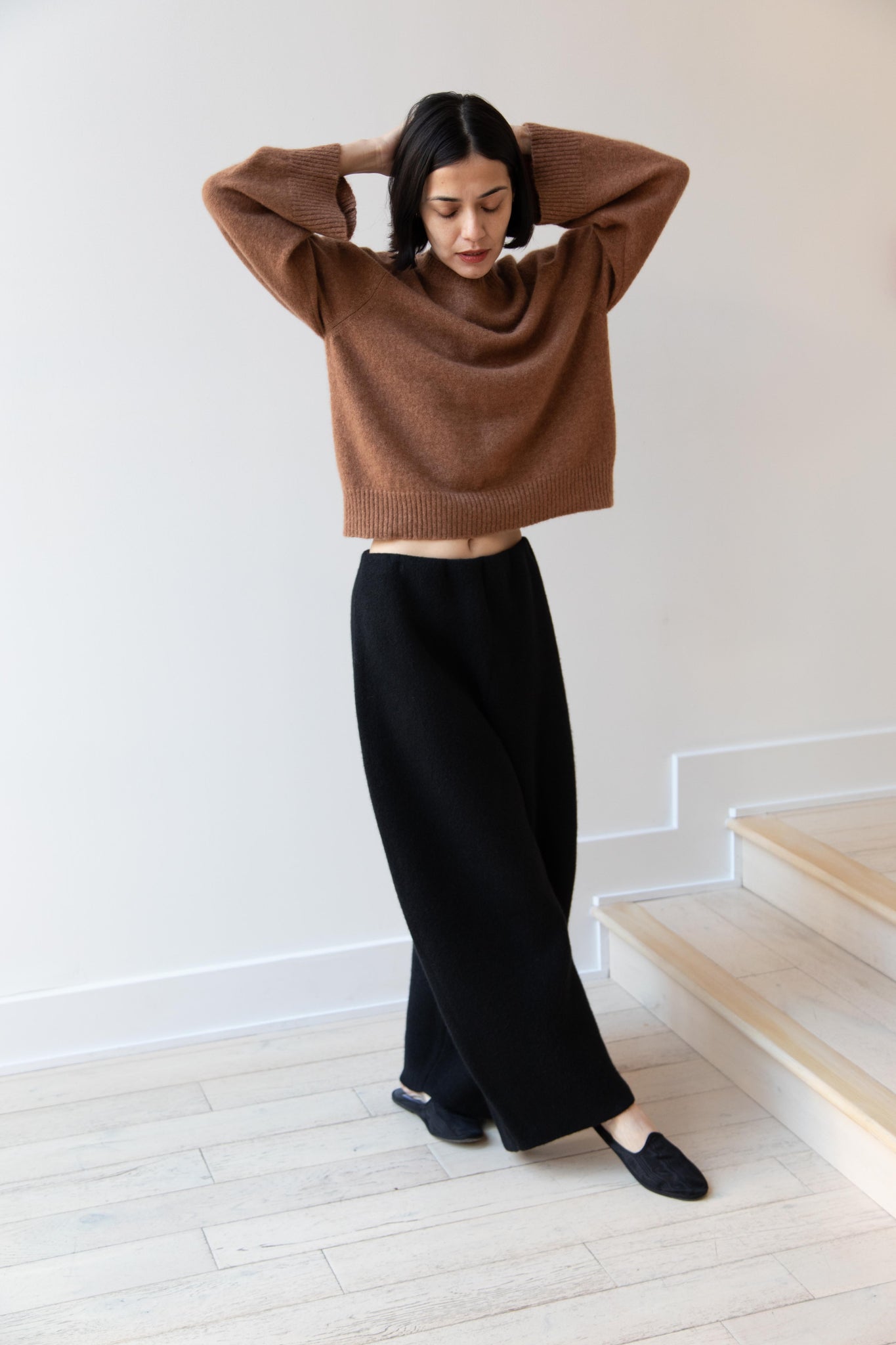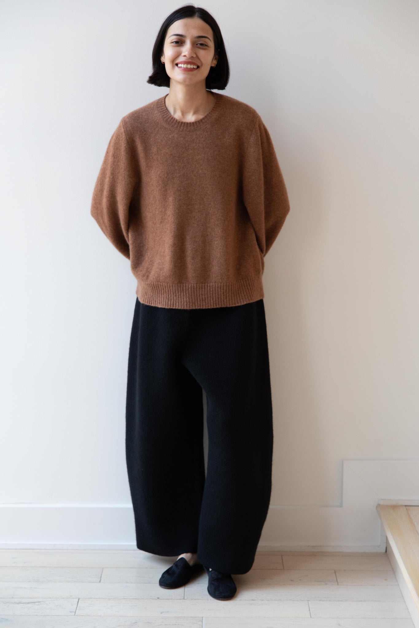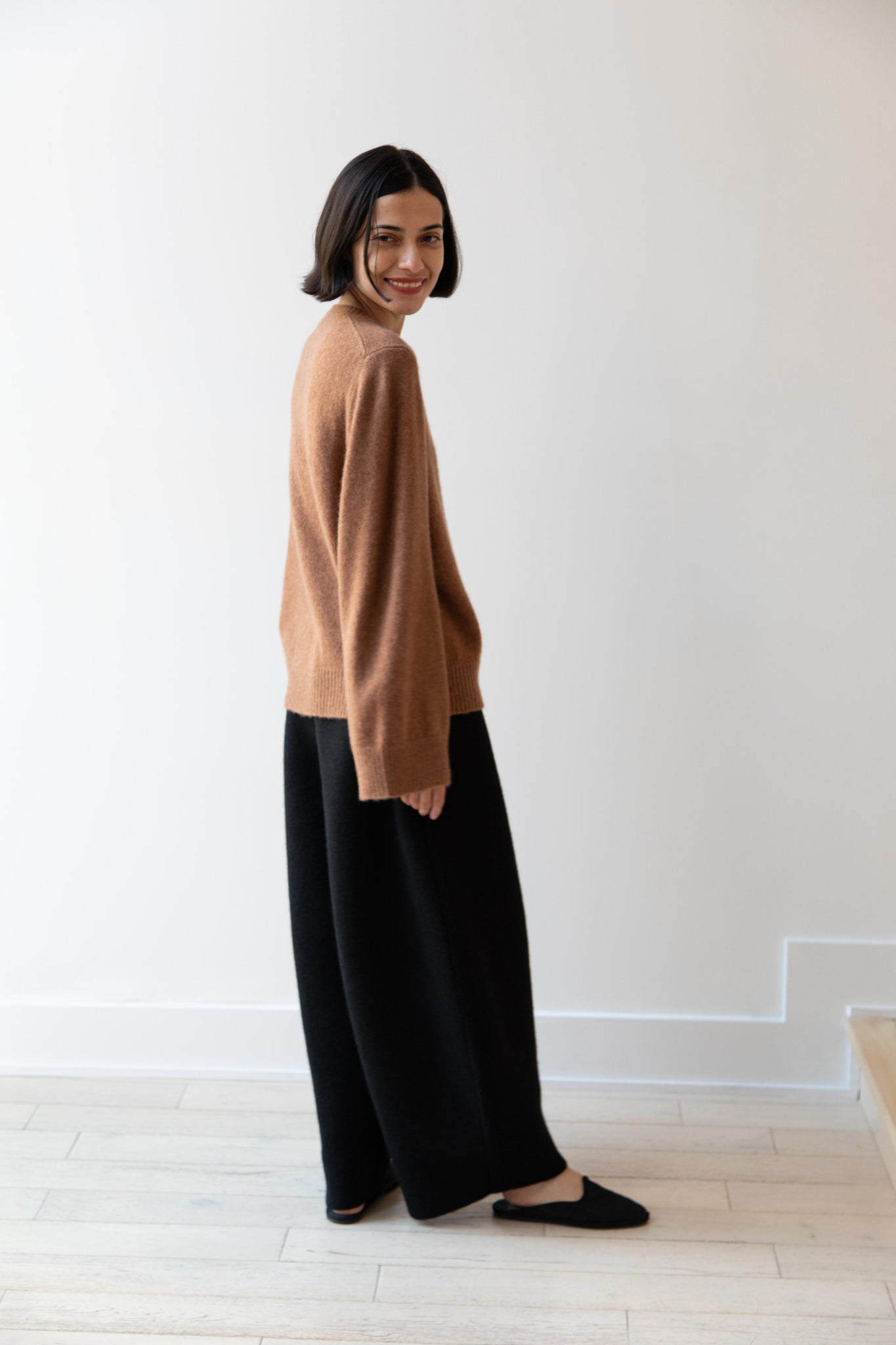 The ideal crewneck sweater - you need to try this on to believe how soft it is.  The cut is slightly oversized with elongated sleeves with a drop shoulder.  The yarn is a beautiful deep caramel shade with a lighter silk yarn running through it.