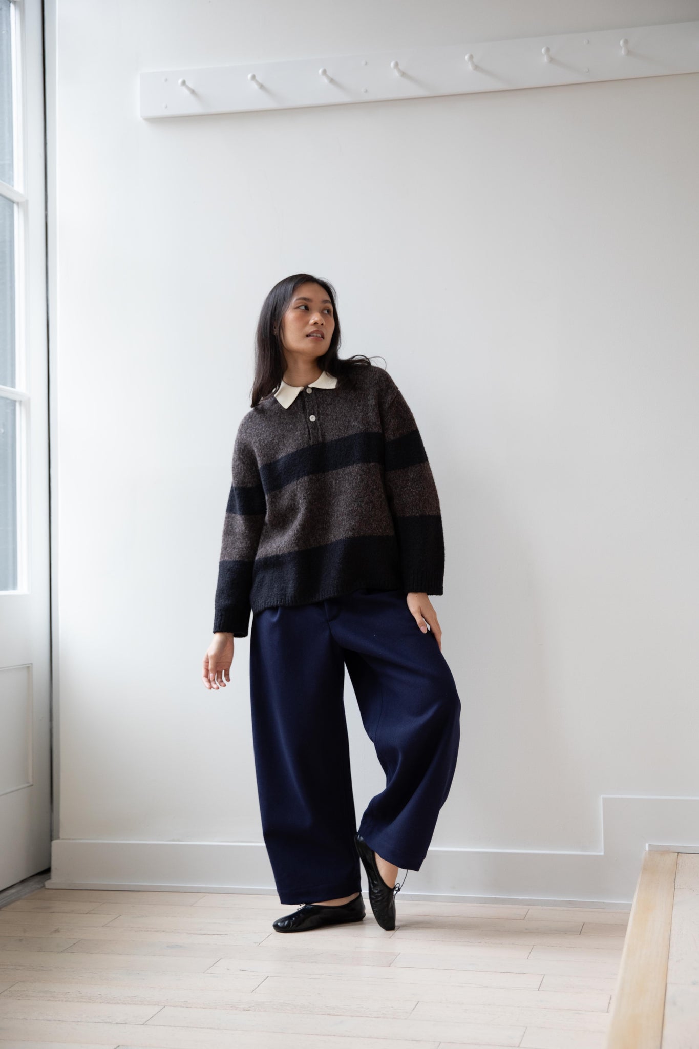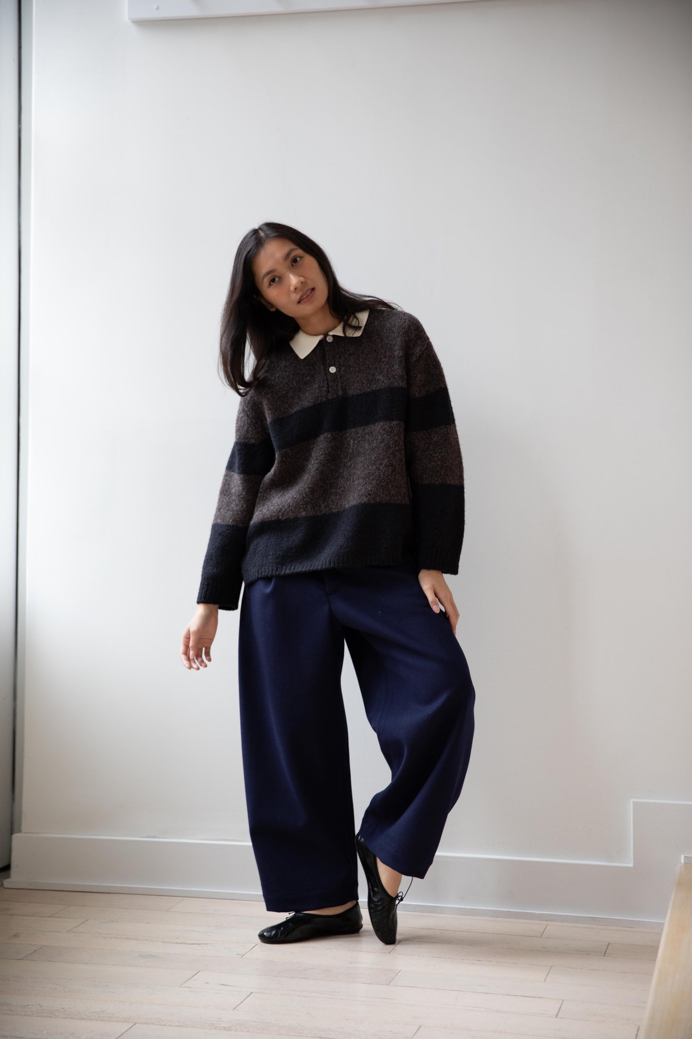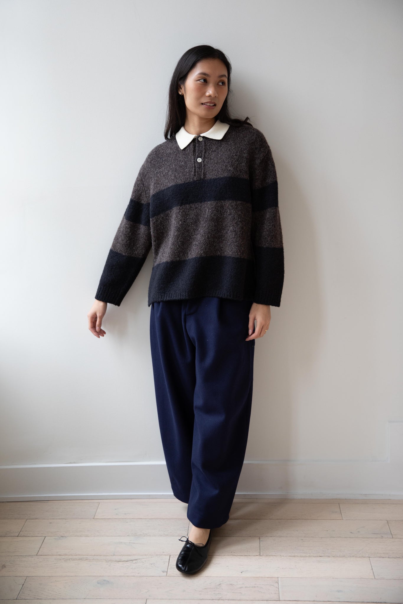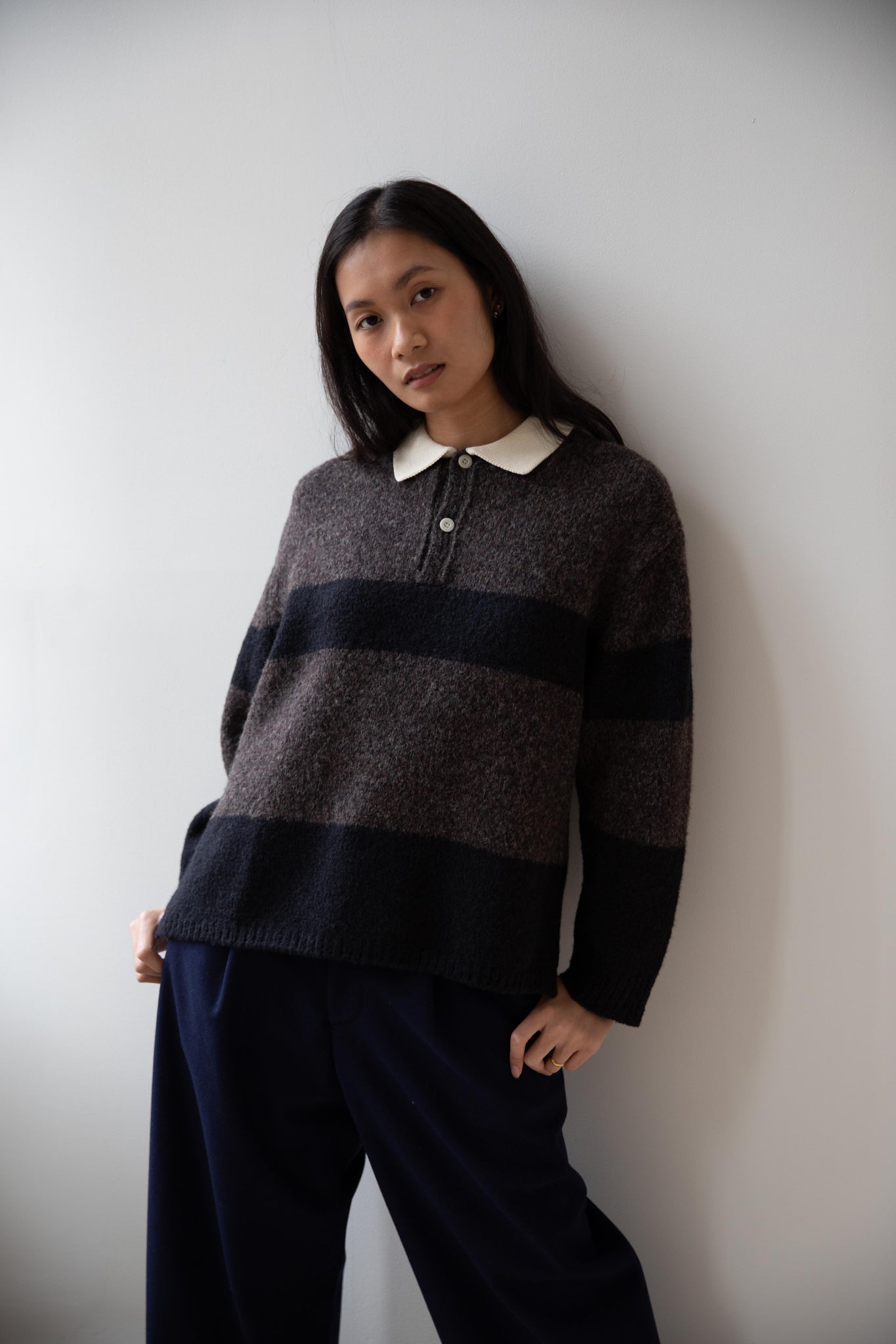 This striped polo knit is made from the softest alpaca blend yarn. It features a taupe-grey and dark navy stripe with a back hem that is just a little bit longer. There is a contrast cream knit neck and two cream buttons.