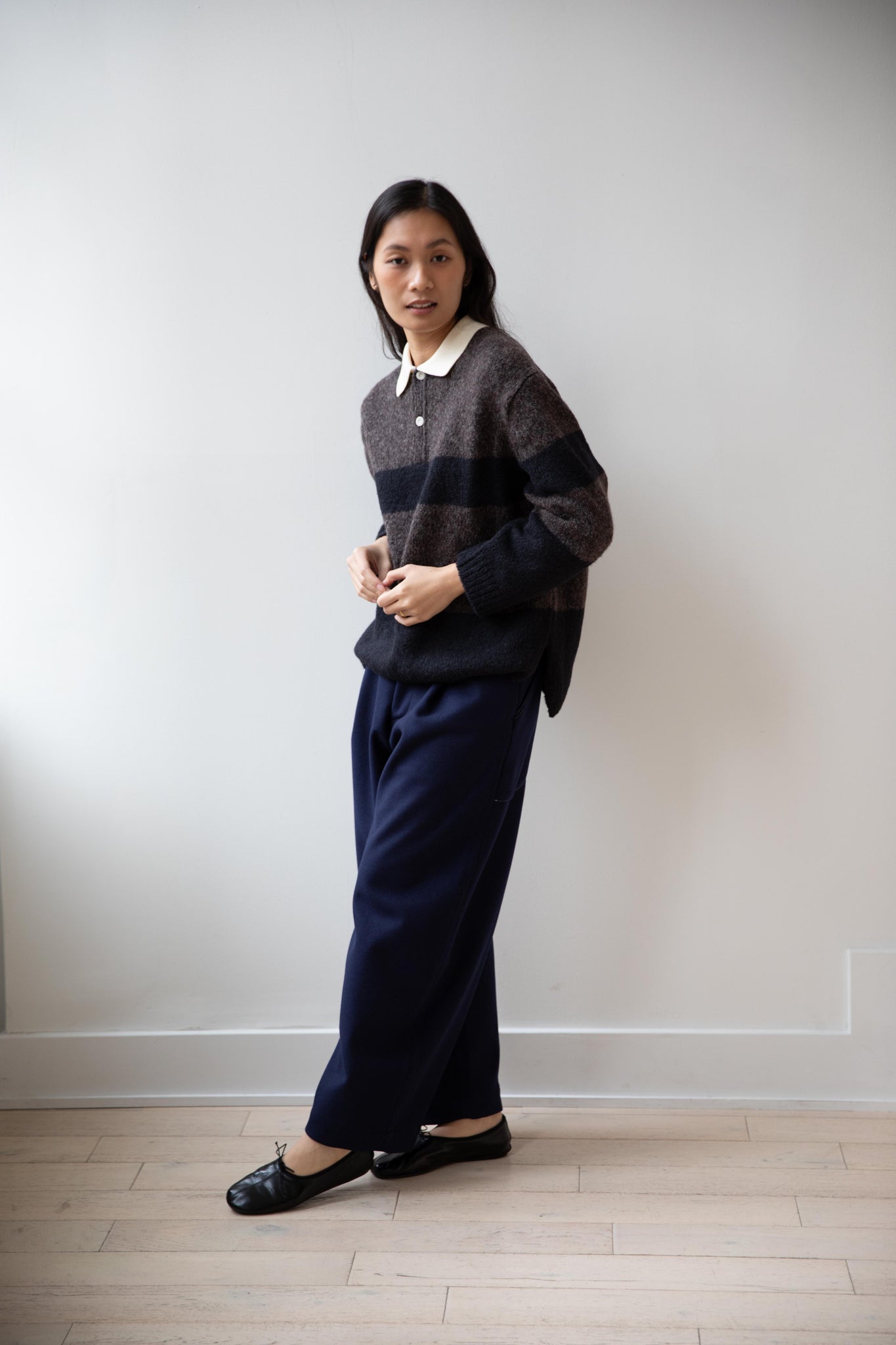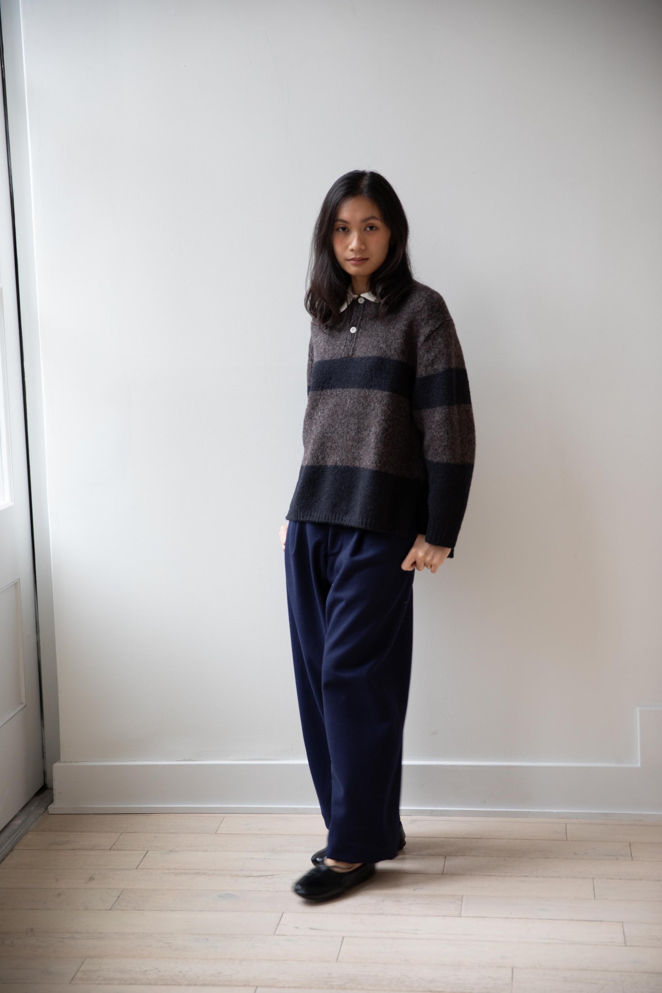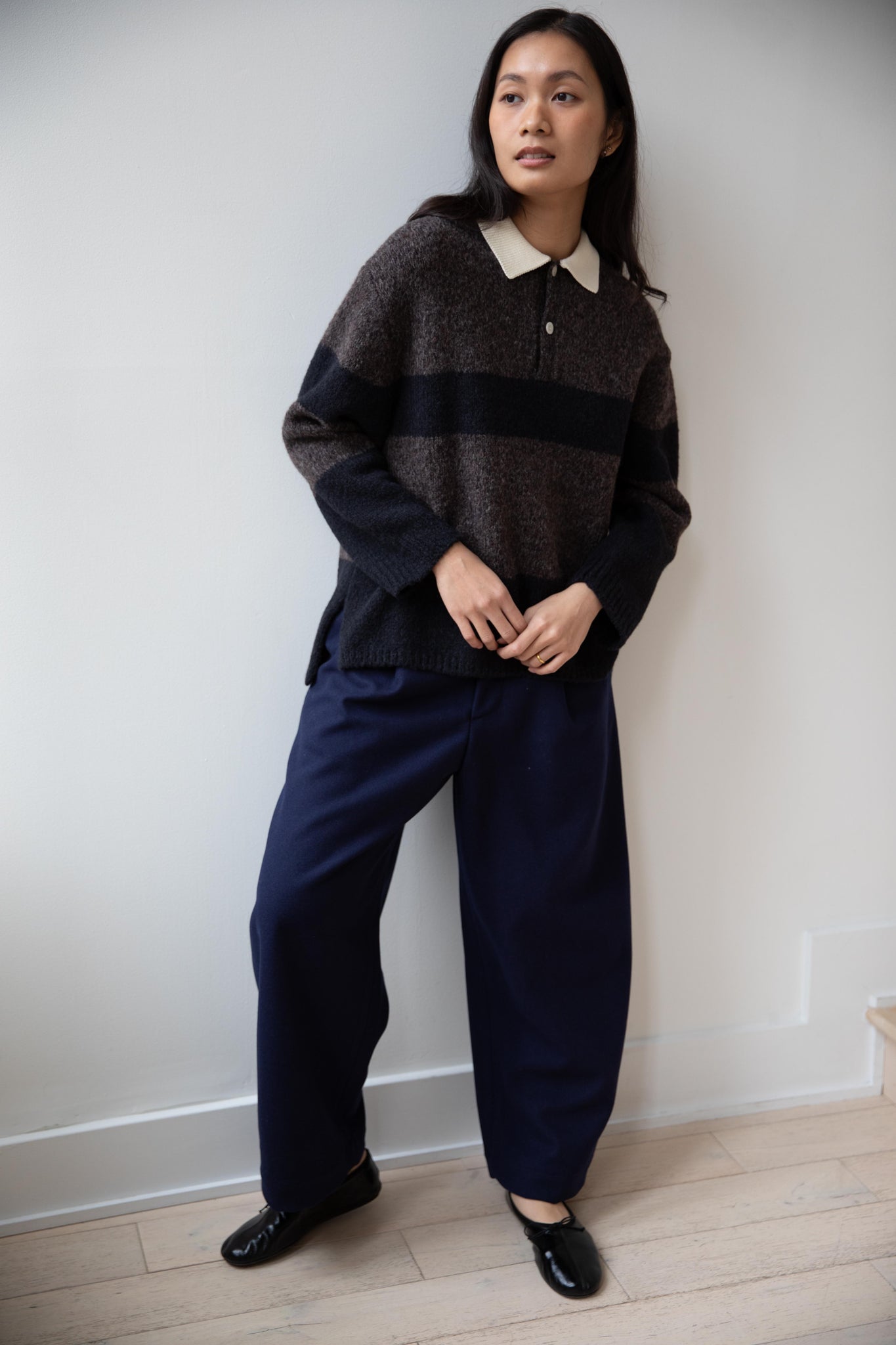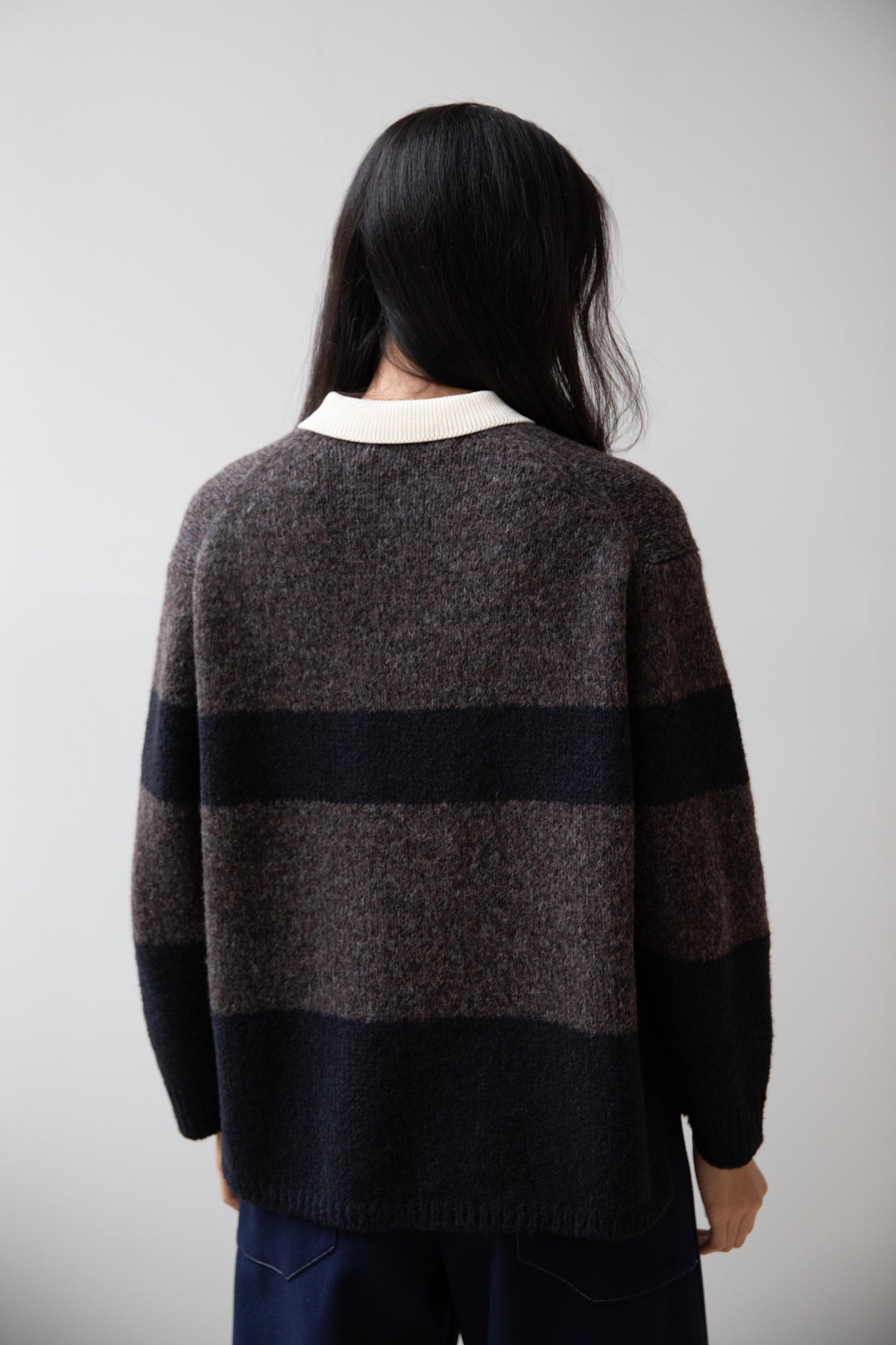 This striped polo knit is made from the softest alpaca blend yarn. It features a taupe-grey and dark navy stripe with a back hem that is just a little bit longer. There is a contrast cream knit neck and two cream buttons.