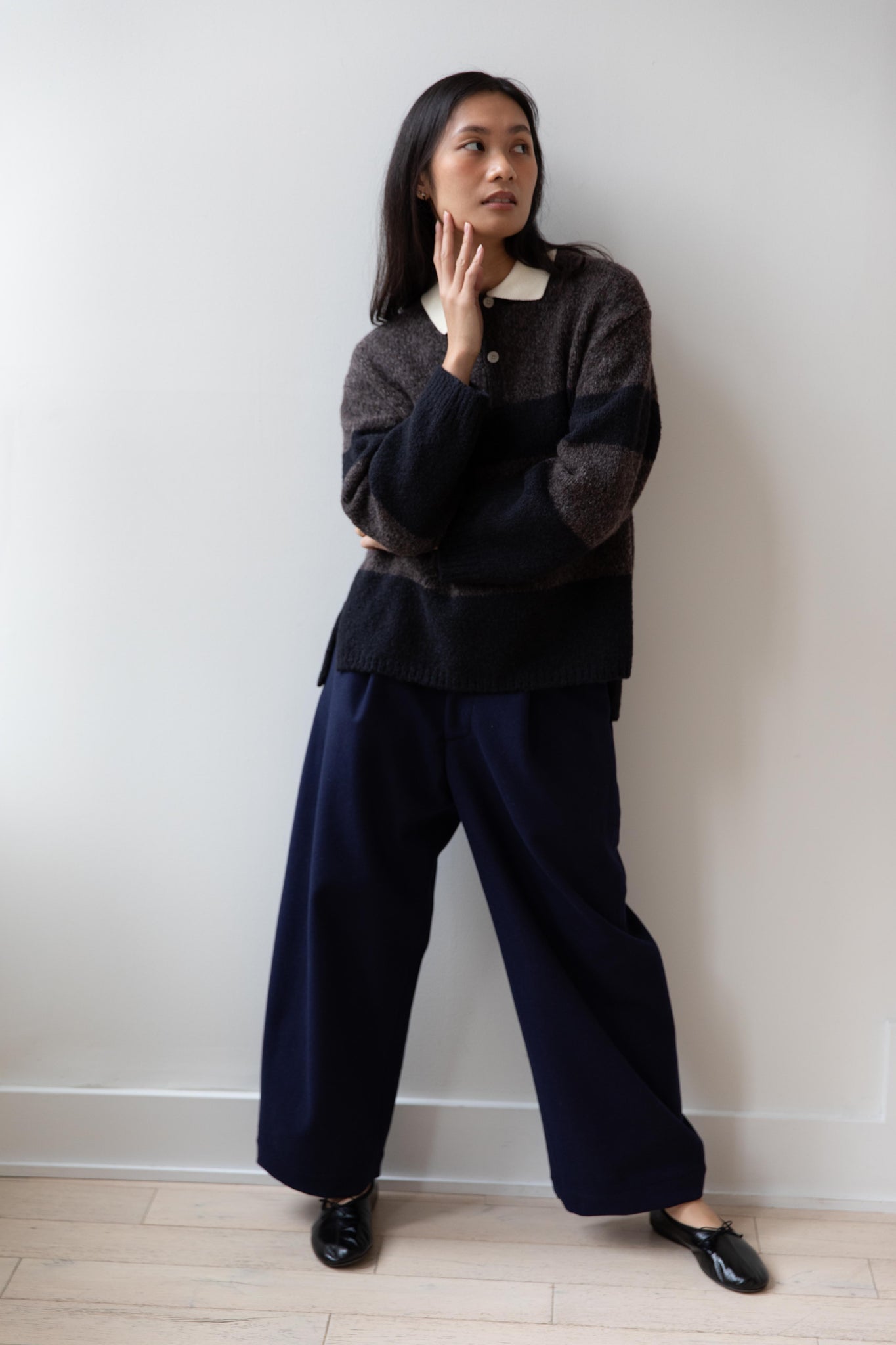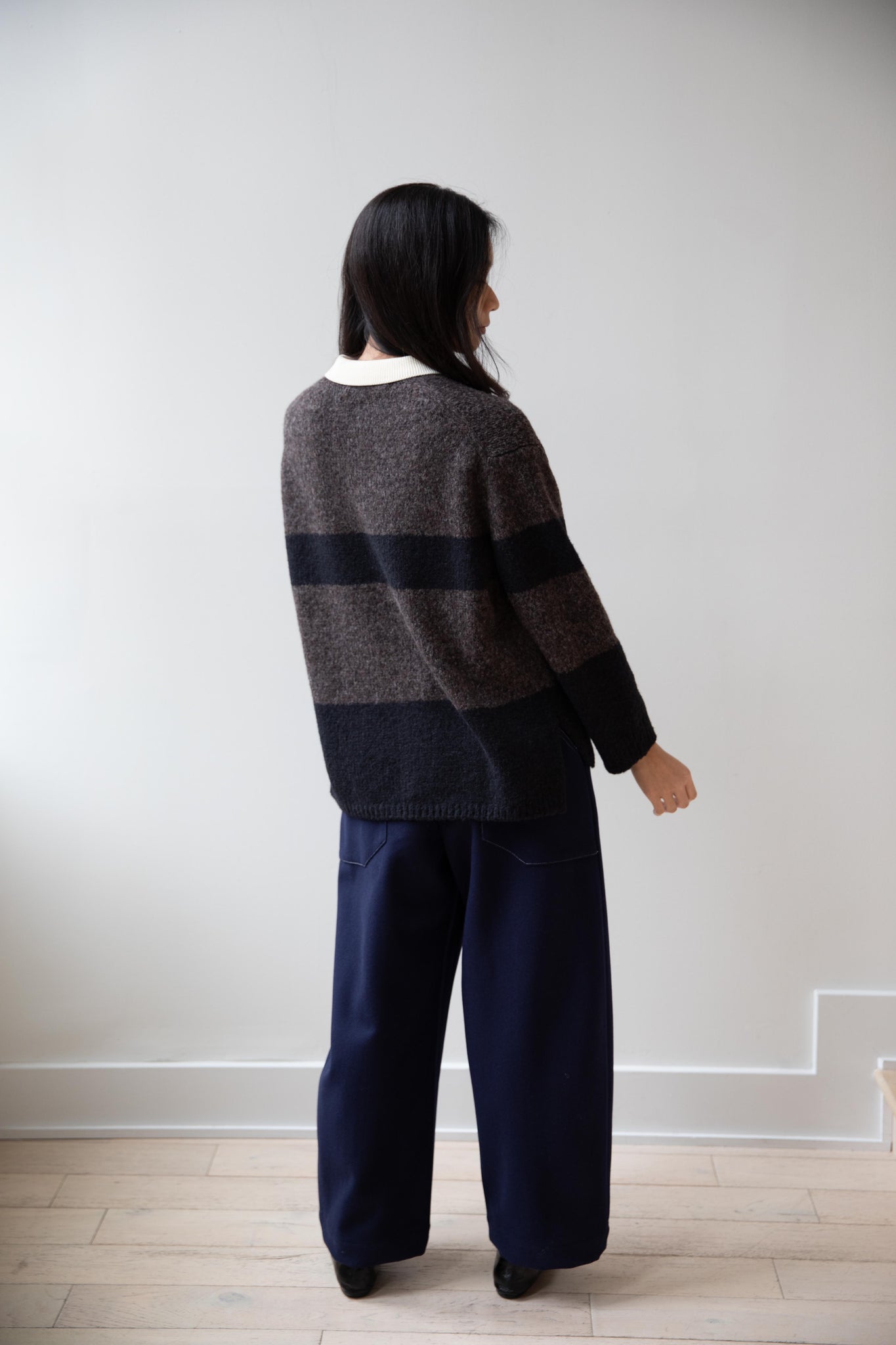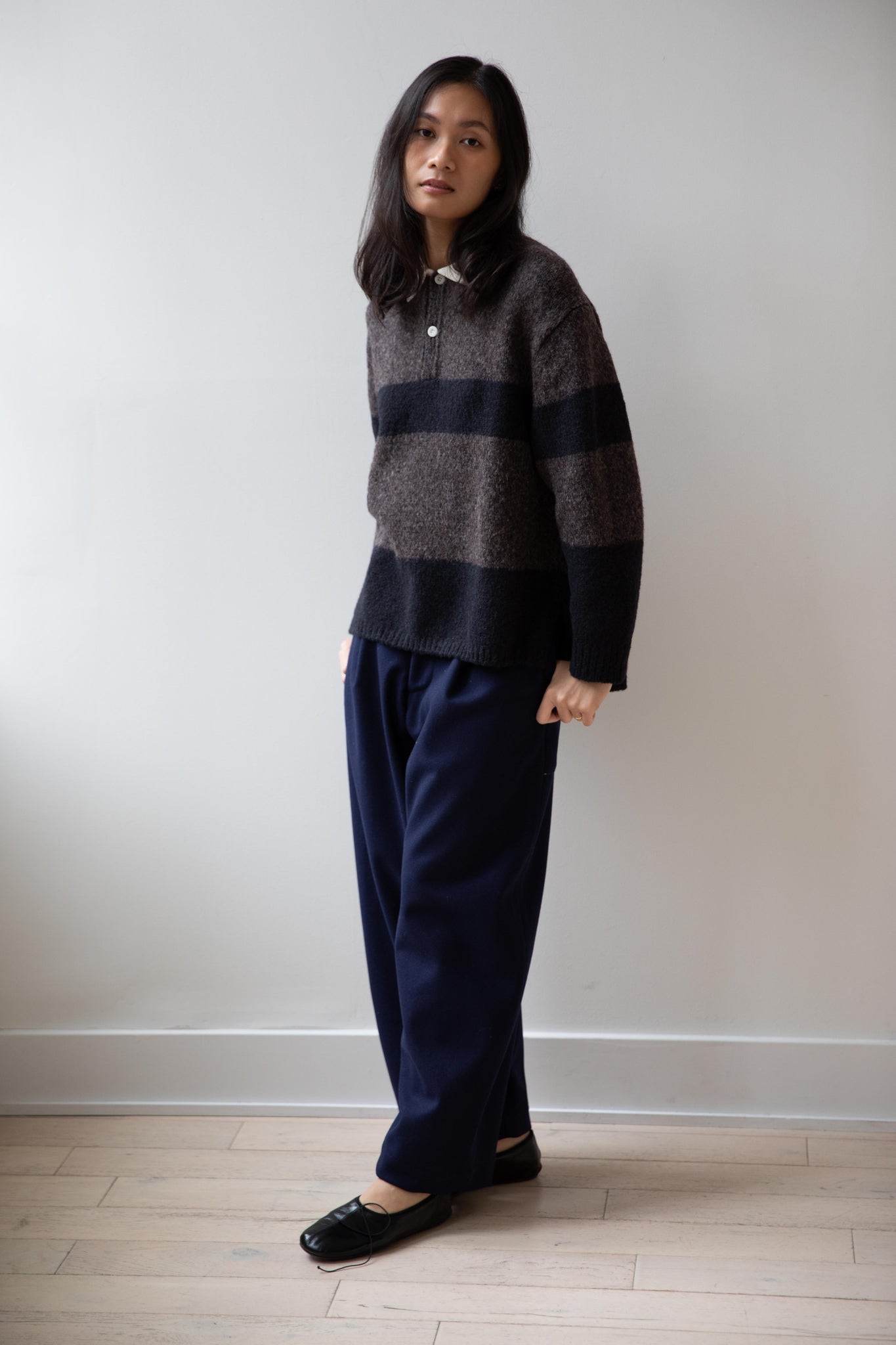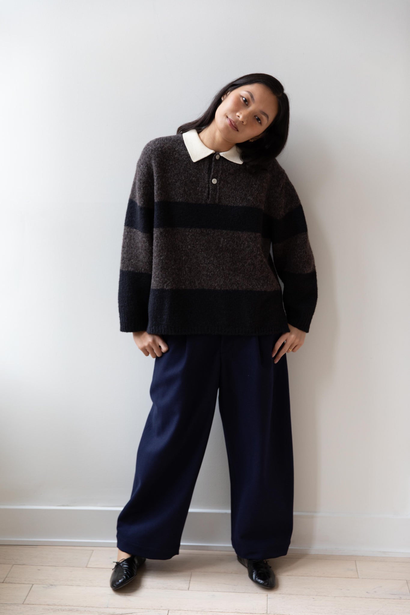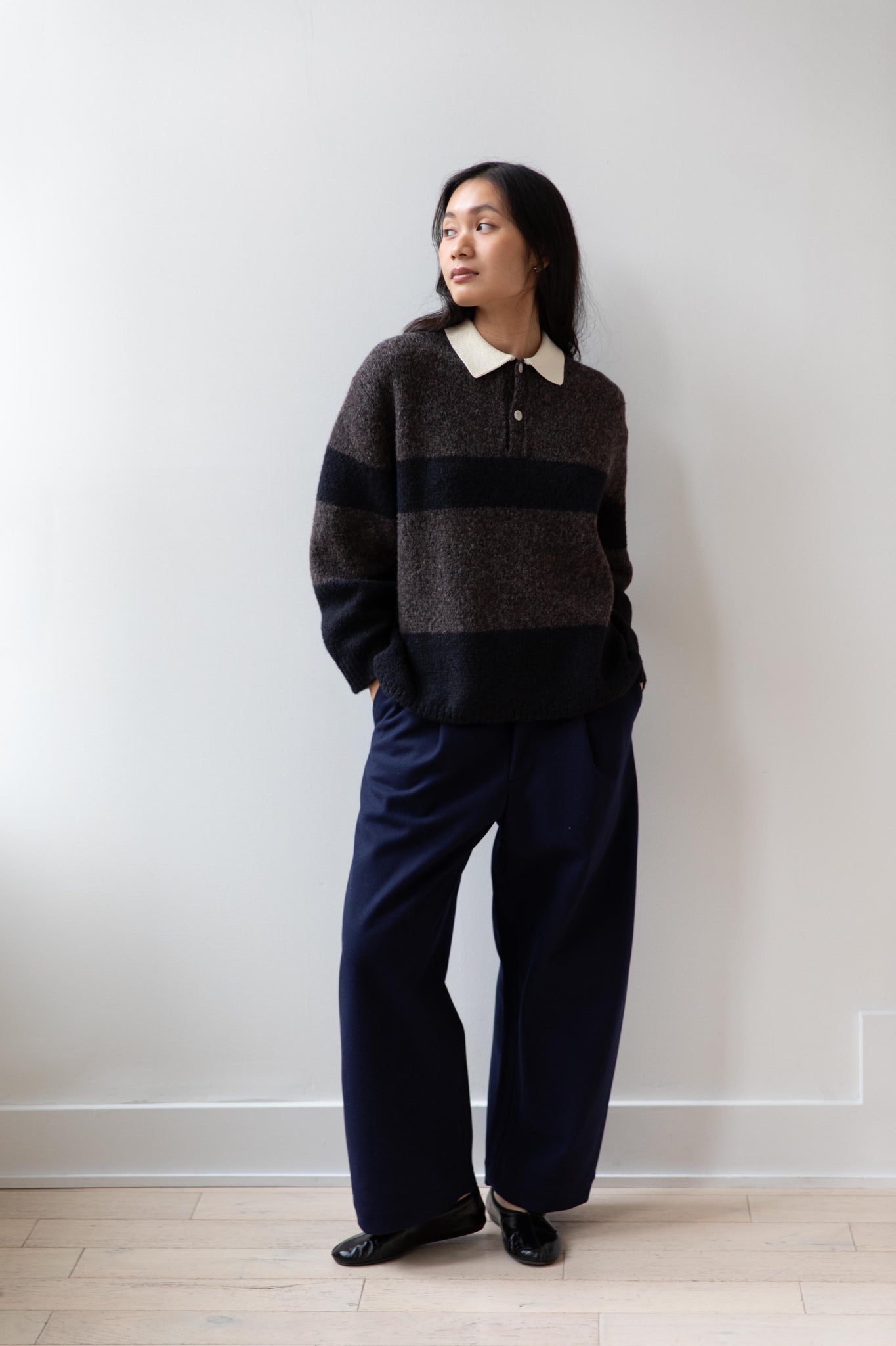 This striped polo knit is made from the softest alpaca blend yarn. It features a taupe-grey and dark navy stripe with a back hem that is just a little bit longer. There is a contrast cream knit neck and two cream buttons.