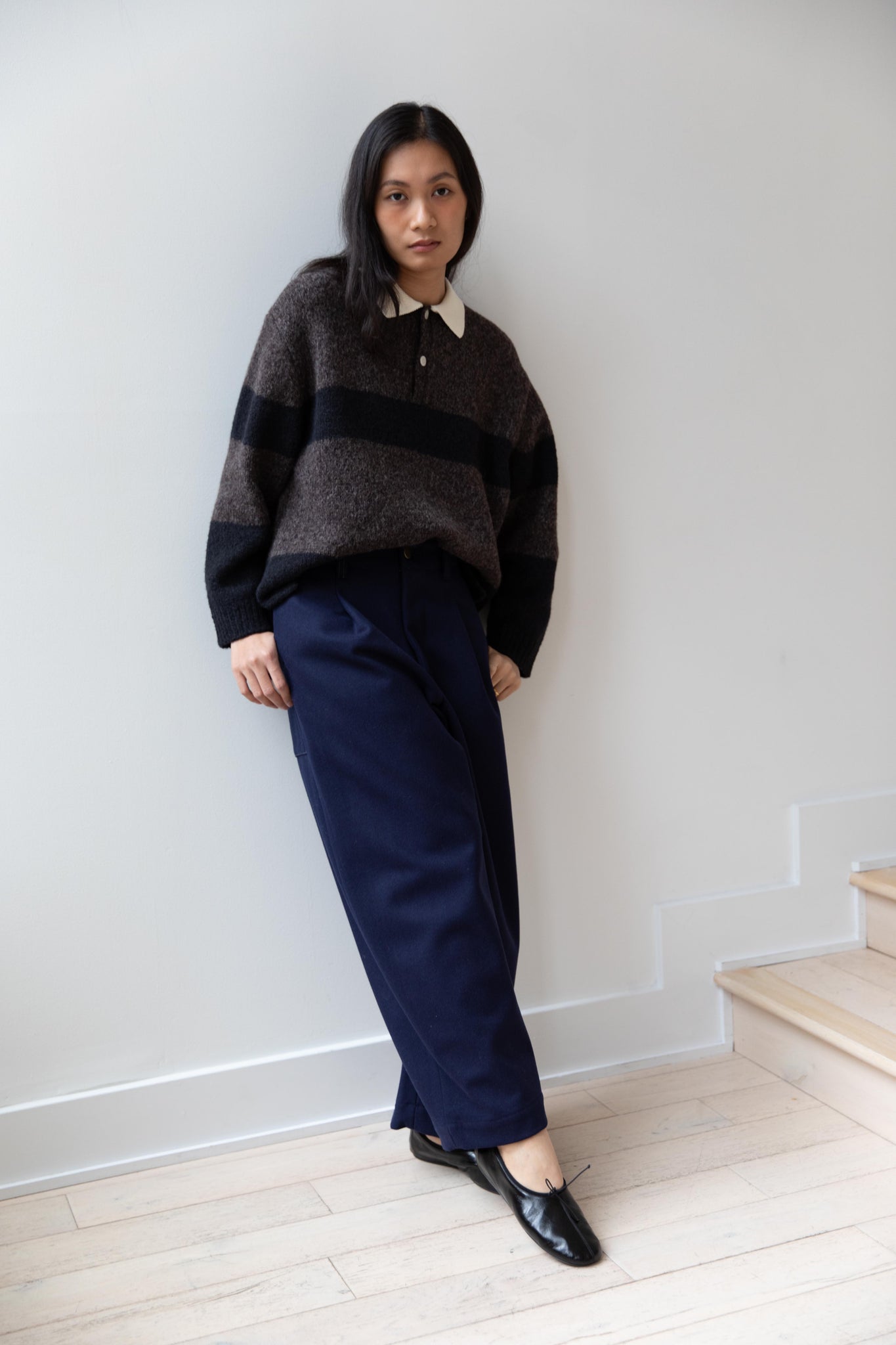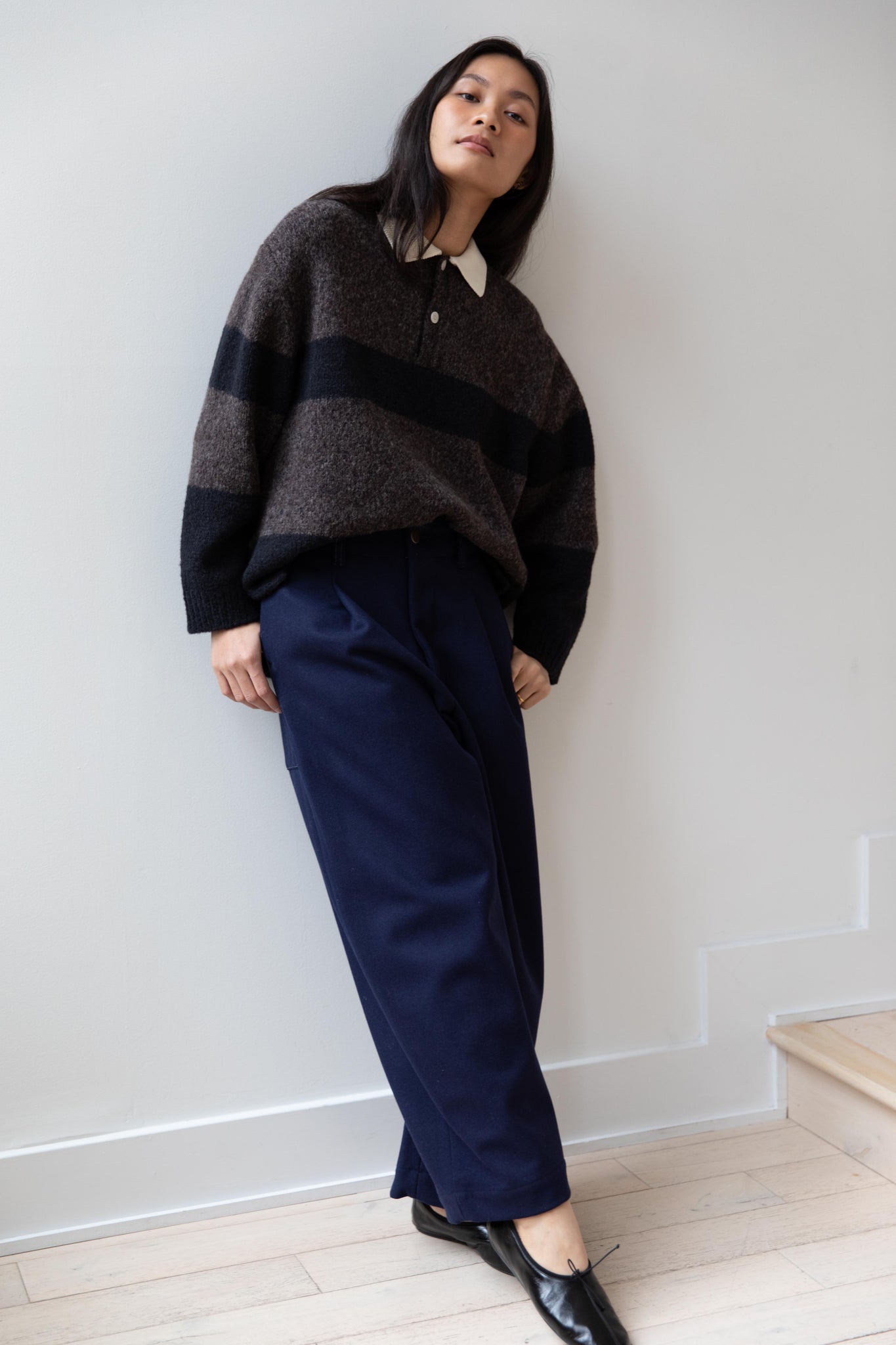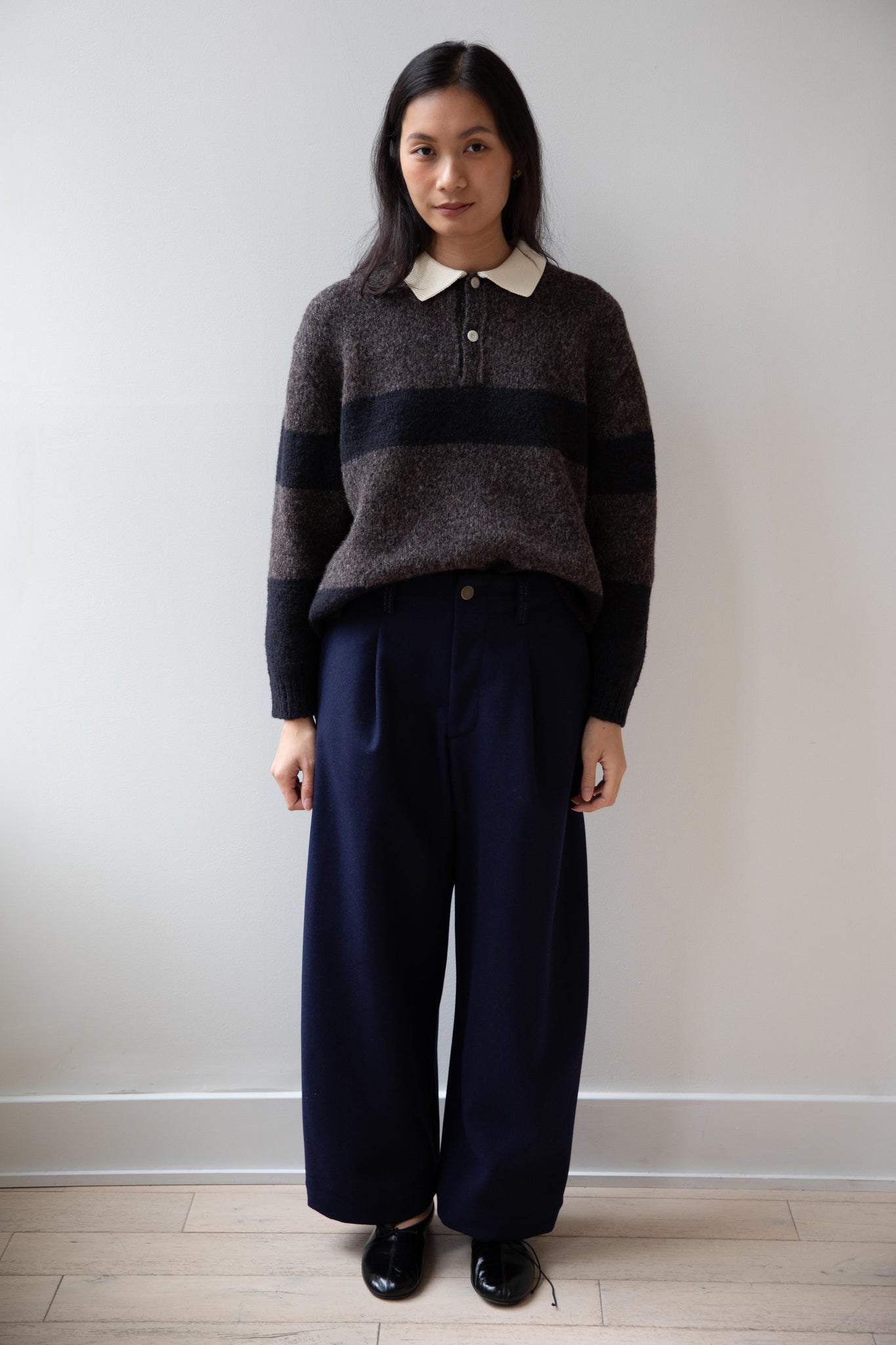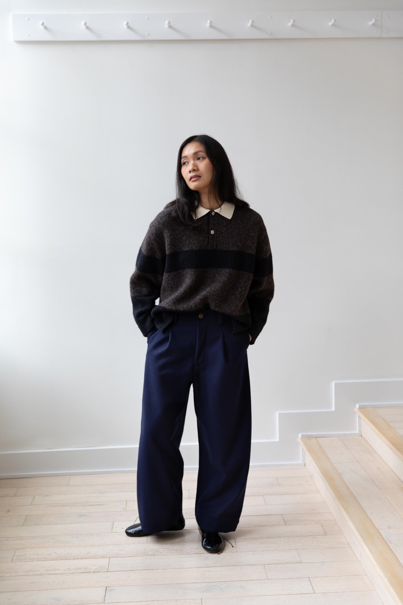 This striped polo knit is made from the softest alpaca blend yarn. It features a taupe-grey and dark navy stripe with a back hem that is just a little bit longer. There is a contrast cream knit neck and two cream buttons.