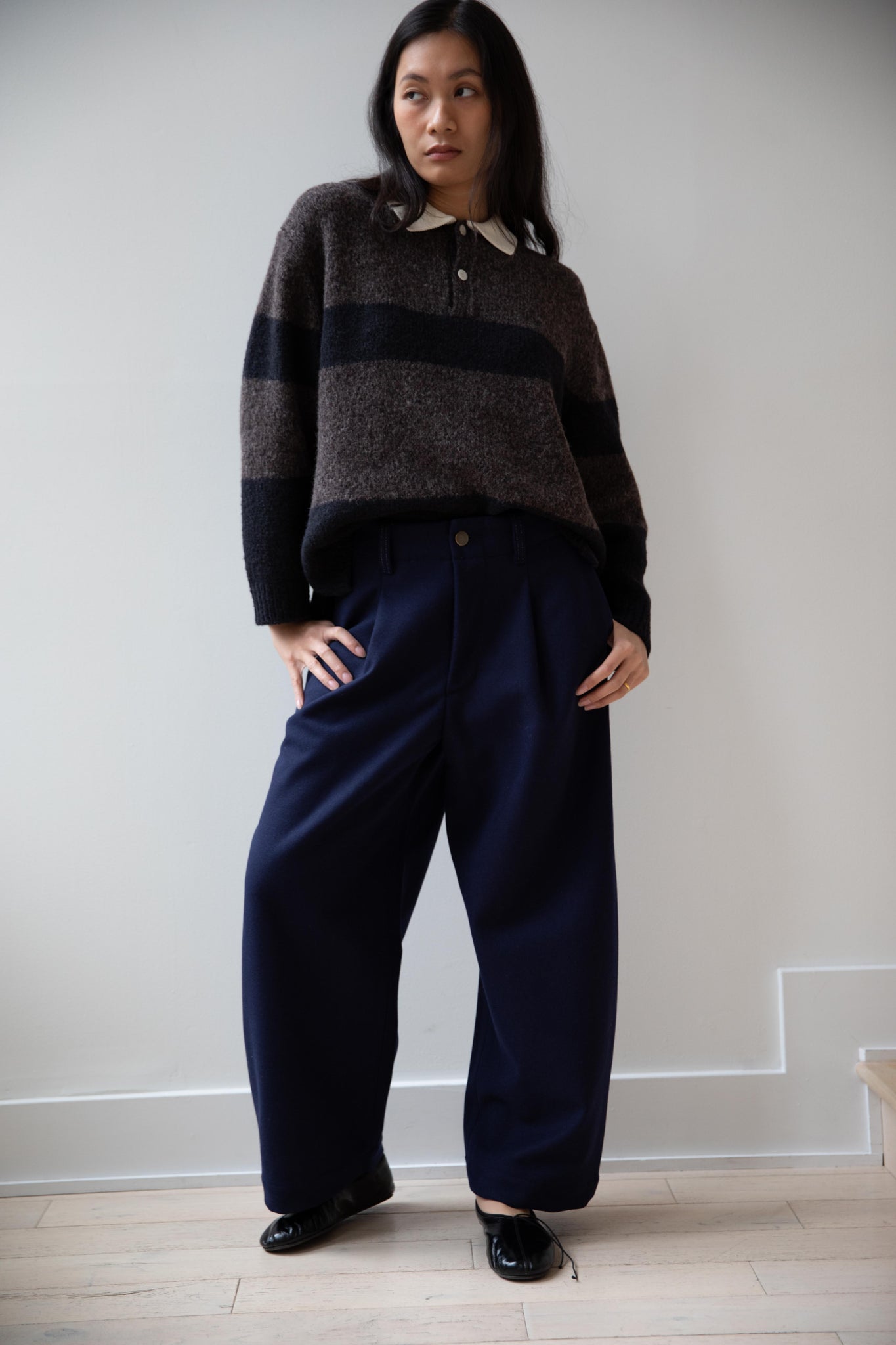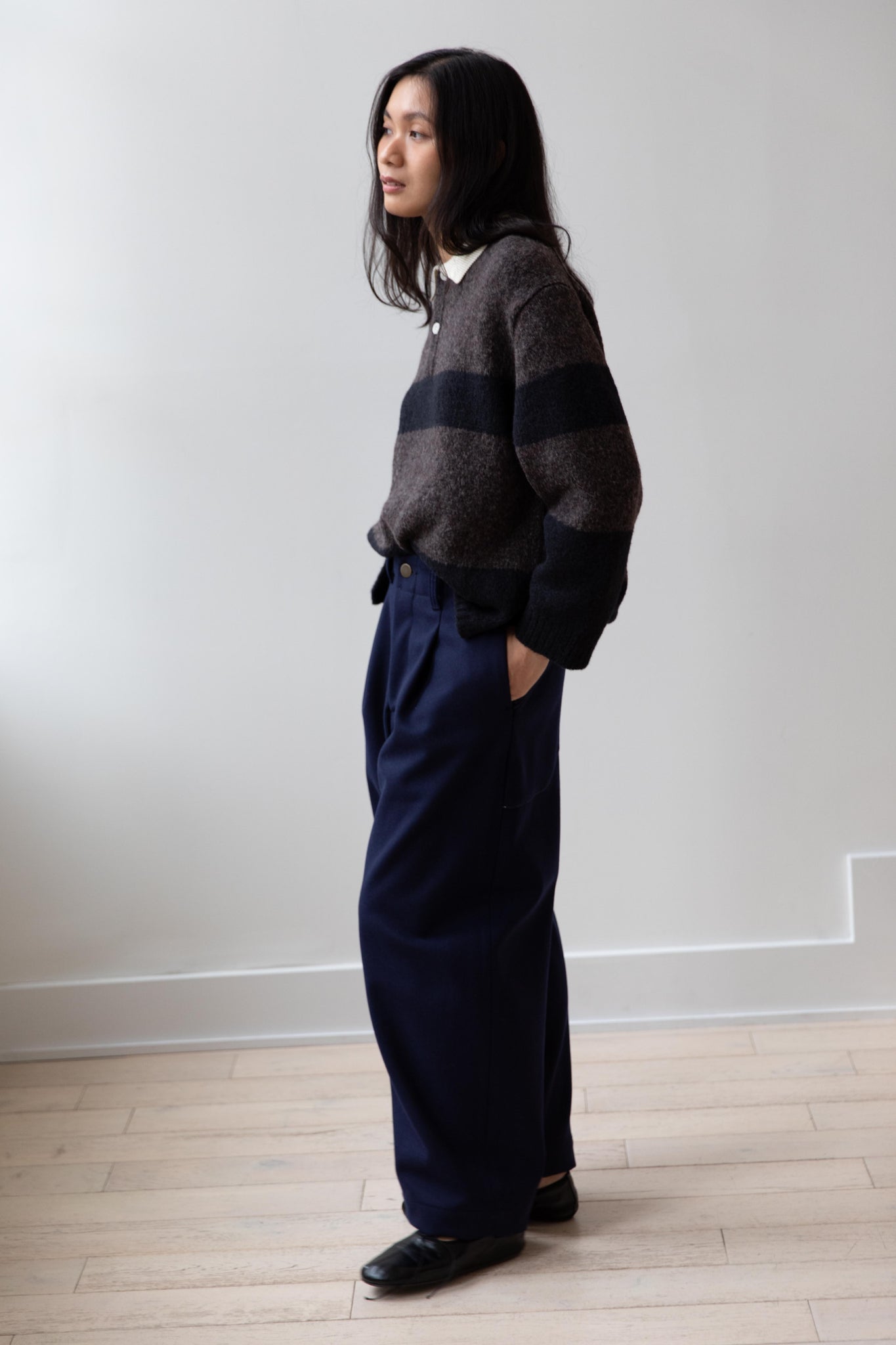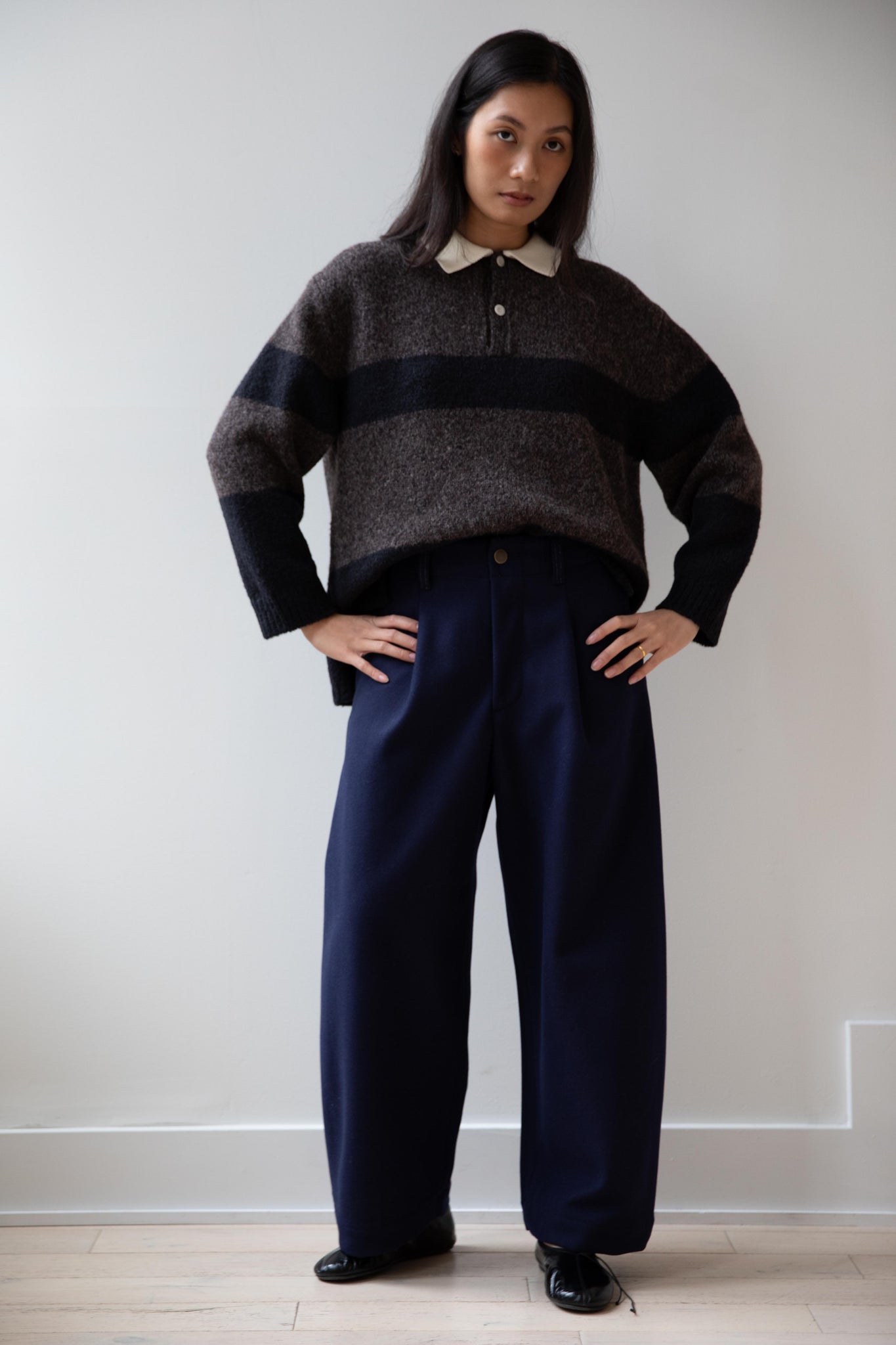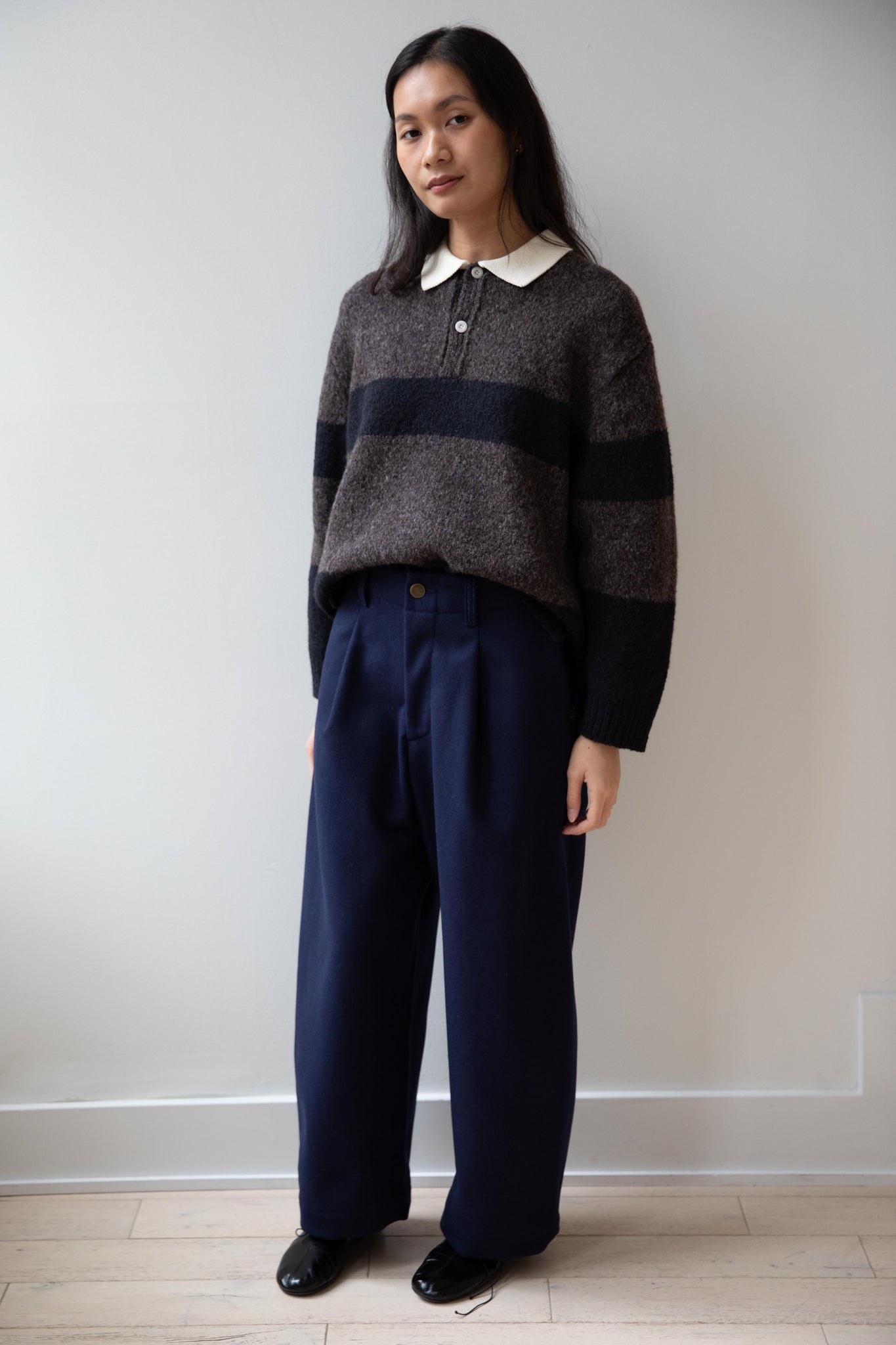 This striped polo knit is made from the softest alpaca blend yarn. It features a taupe-grey and dark navy stripe with a back hem that is just a little bit longer. There is a contrast cream knit neck and two cream buttons.