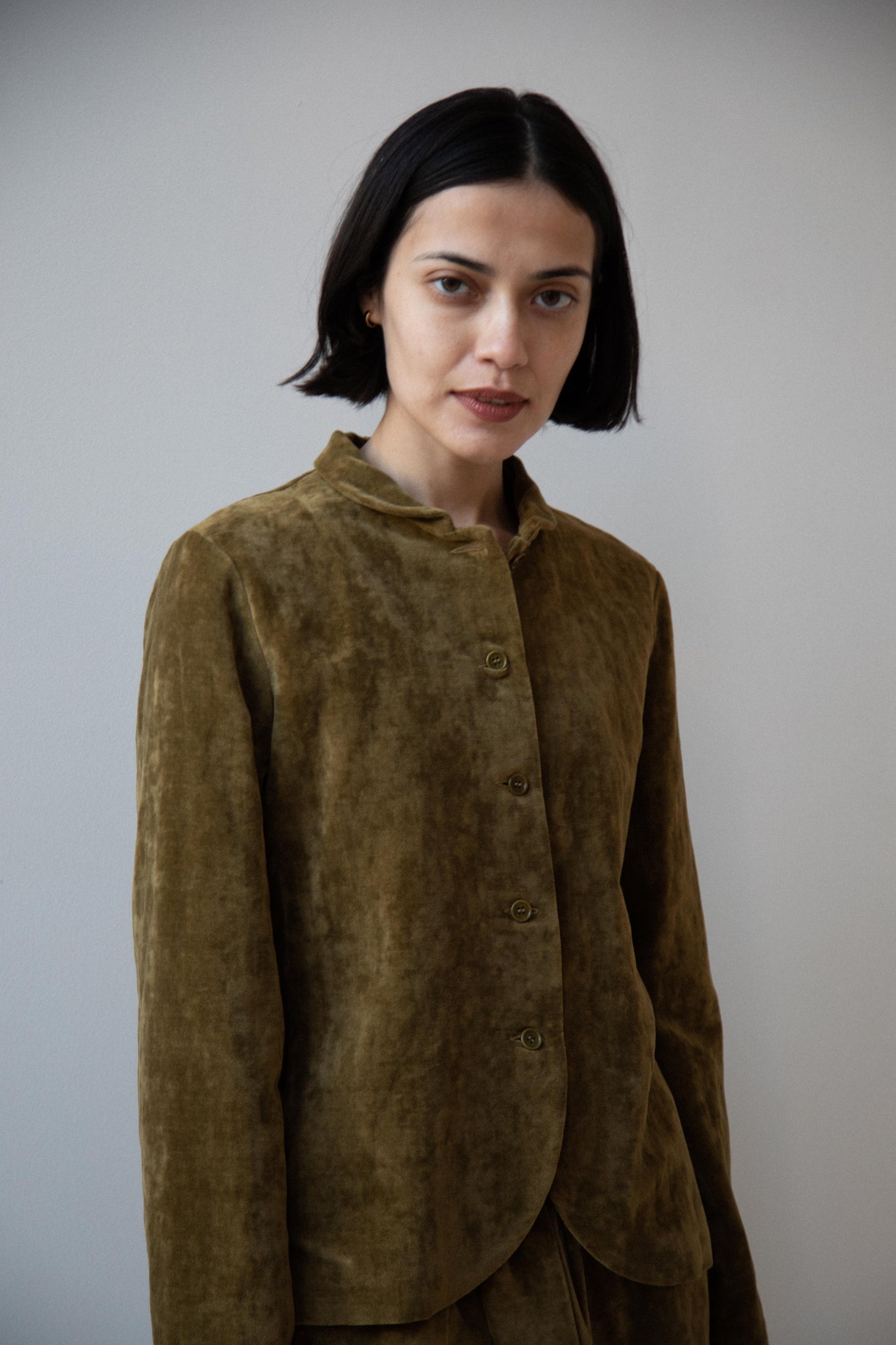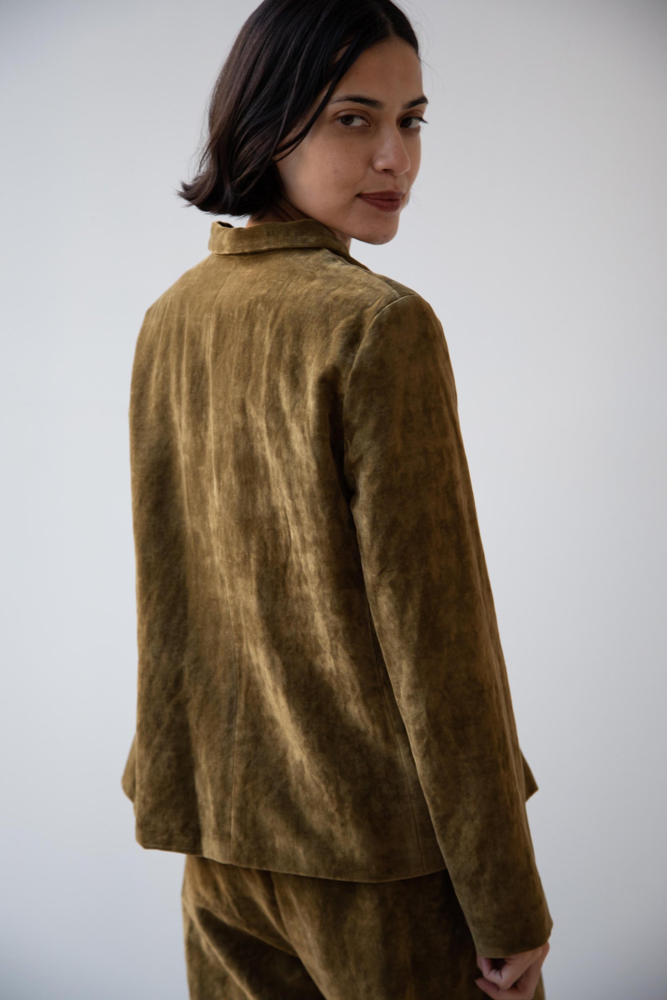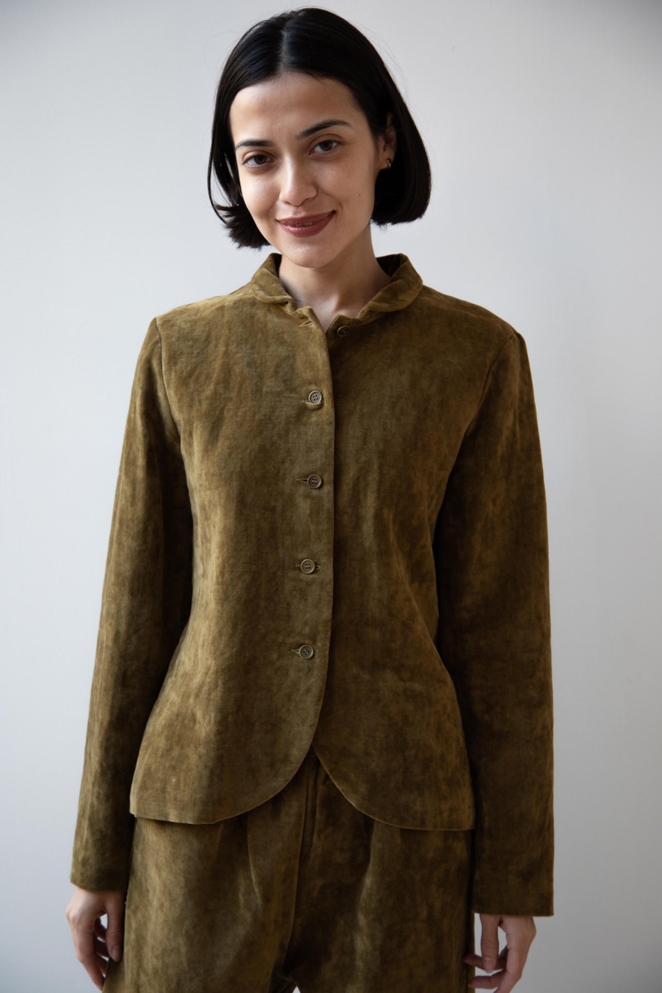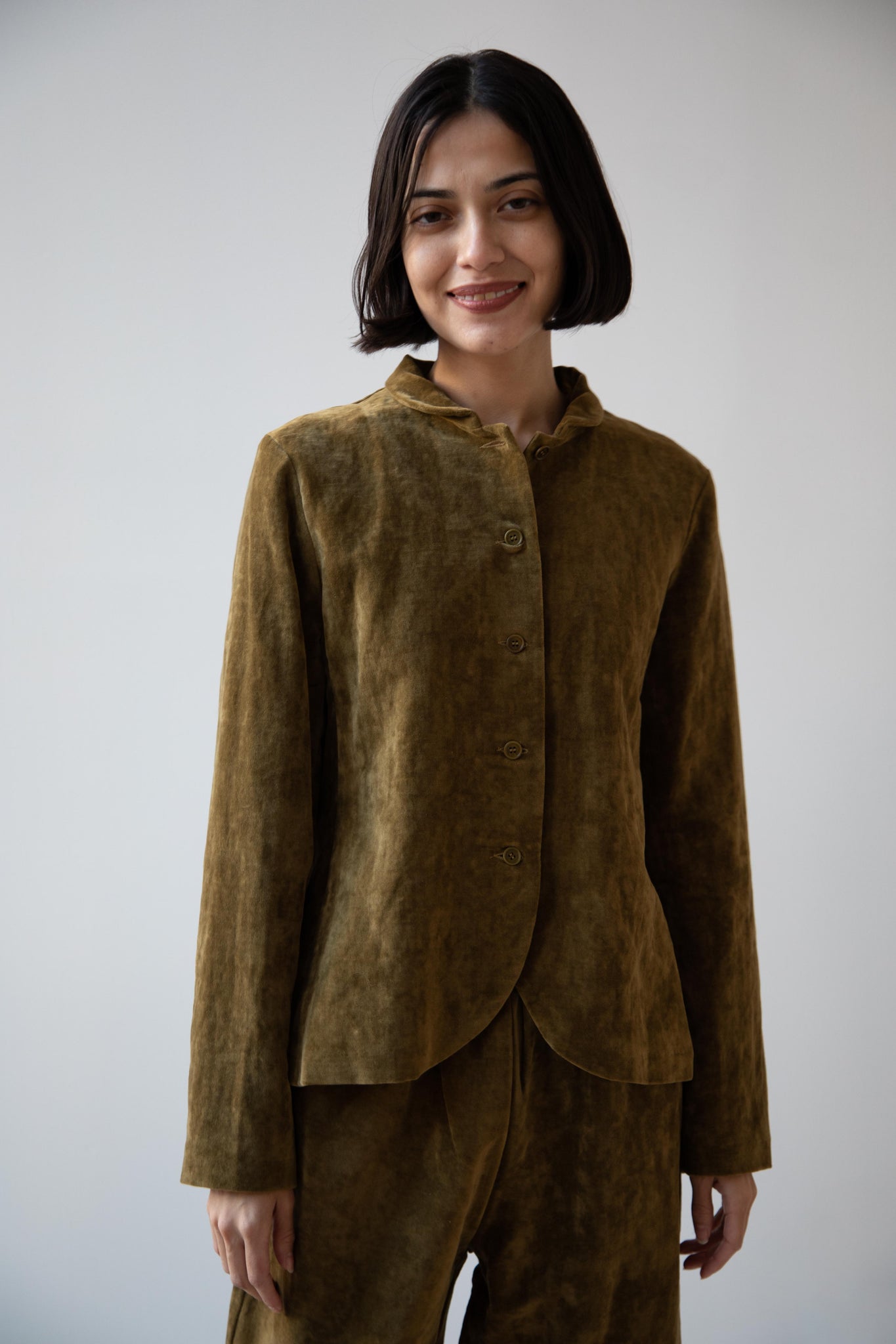 This jacket is made from an elegant crush linen cotton velvet and is fully lined in a cream cotton. There is a small collar and buttons up the front. The color is a golden olive and can look different in different lights and is hard to capture precisely in photos; the designer's color is called forest.