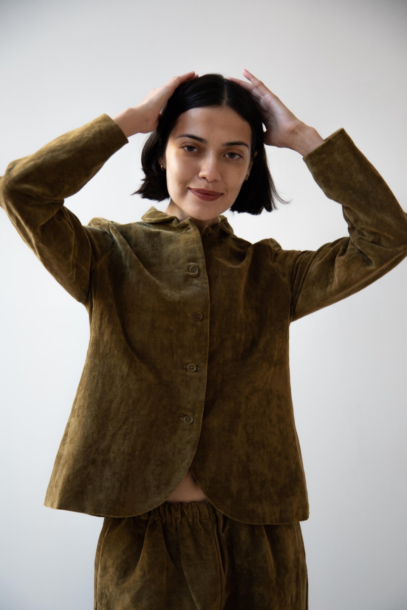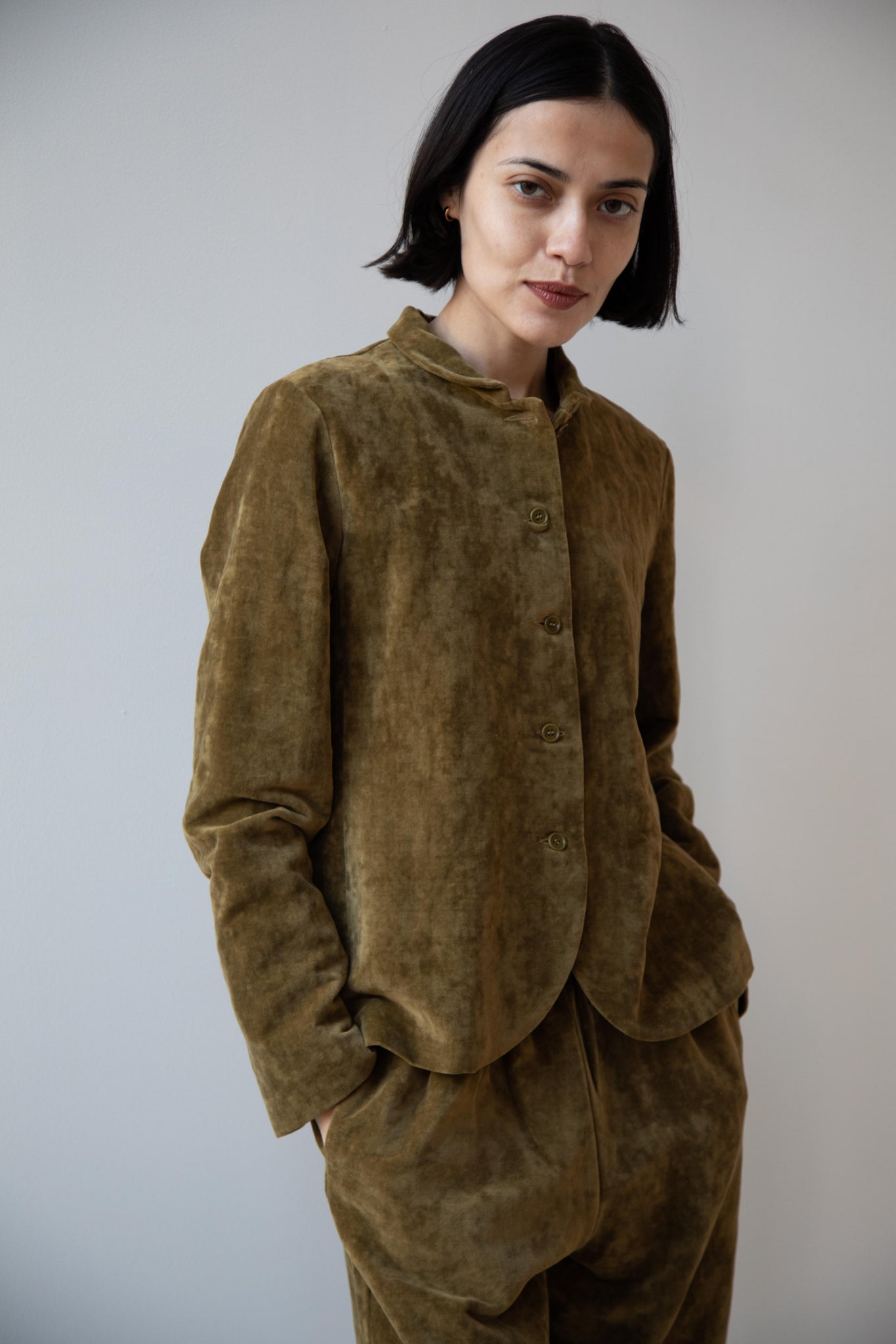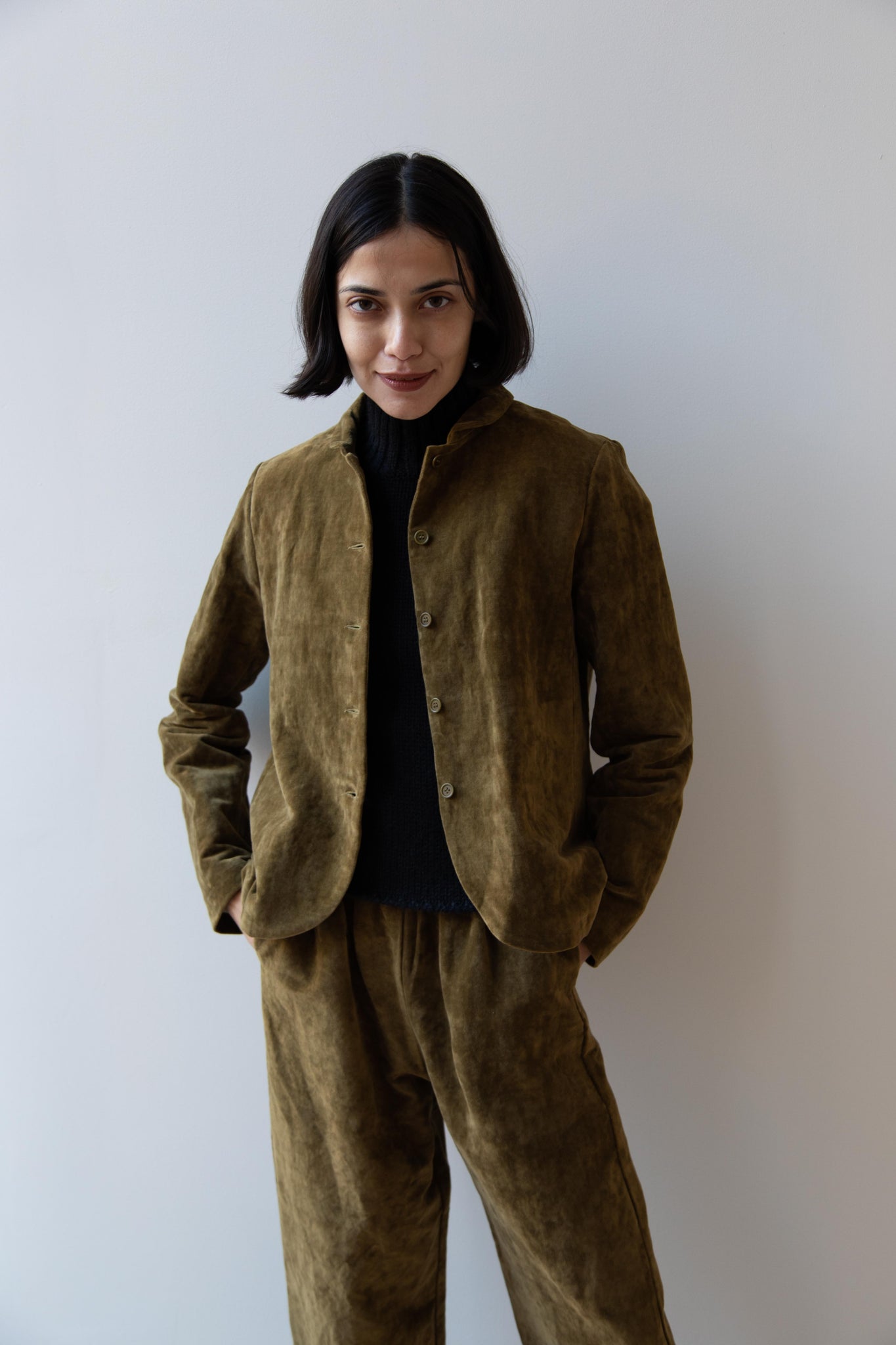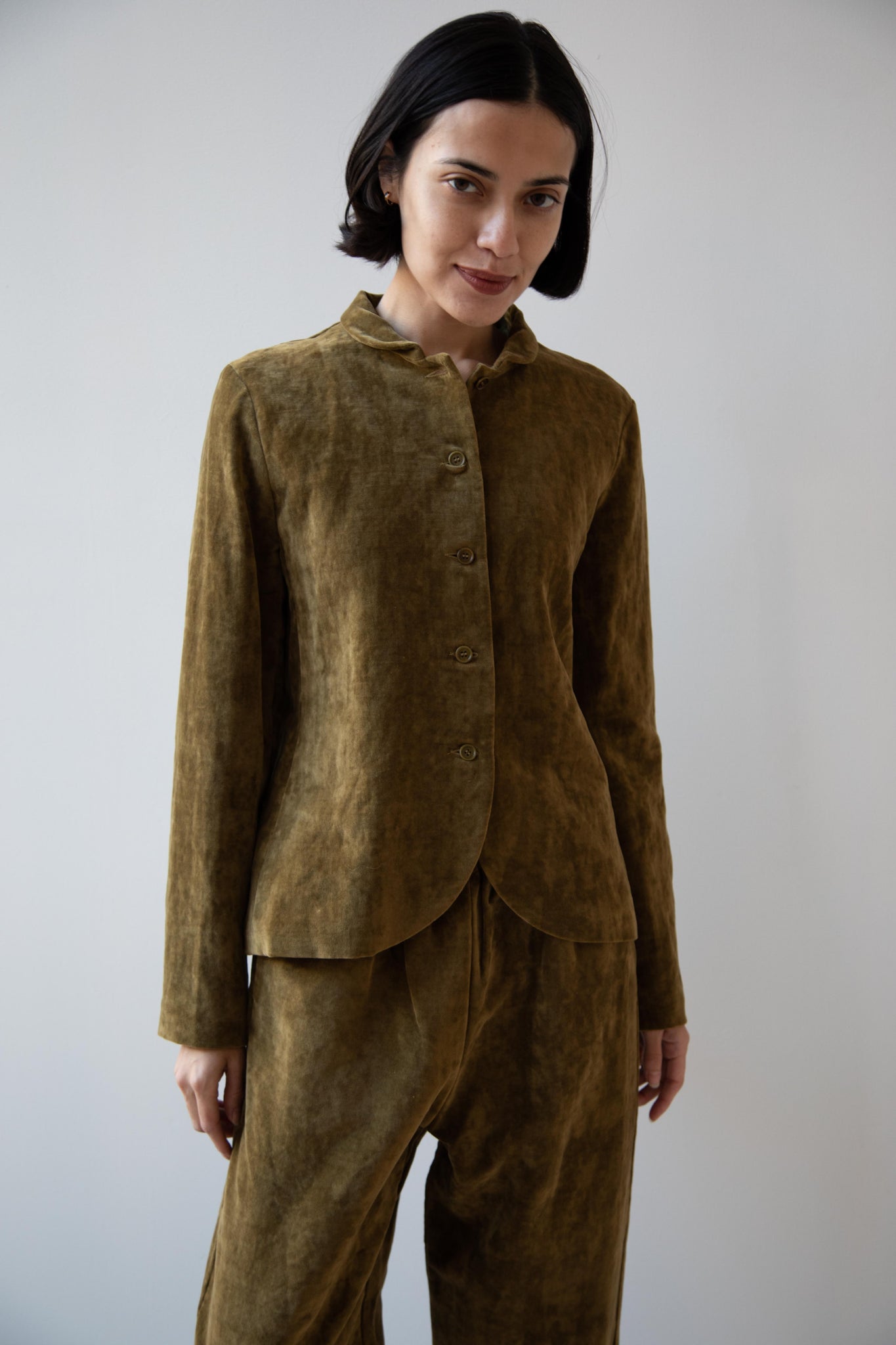 This jacket is made from an elegant crush linen cotton velvet and is fully lined in a cream cotton. There is a small collar and buttons up the front. The color is a golden olive and can look different in different lights and is hard to capture precisely in photos; the designer's color is called forest.