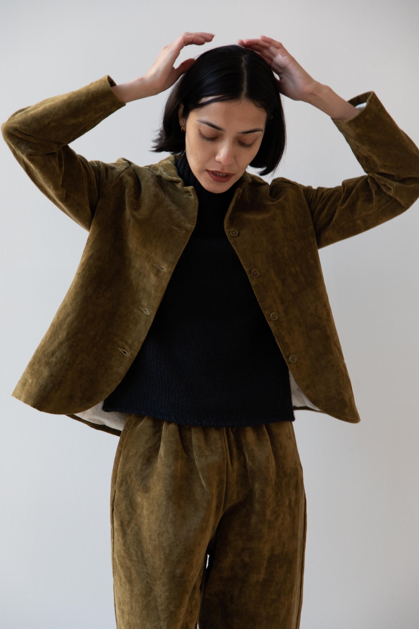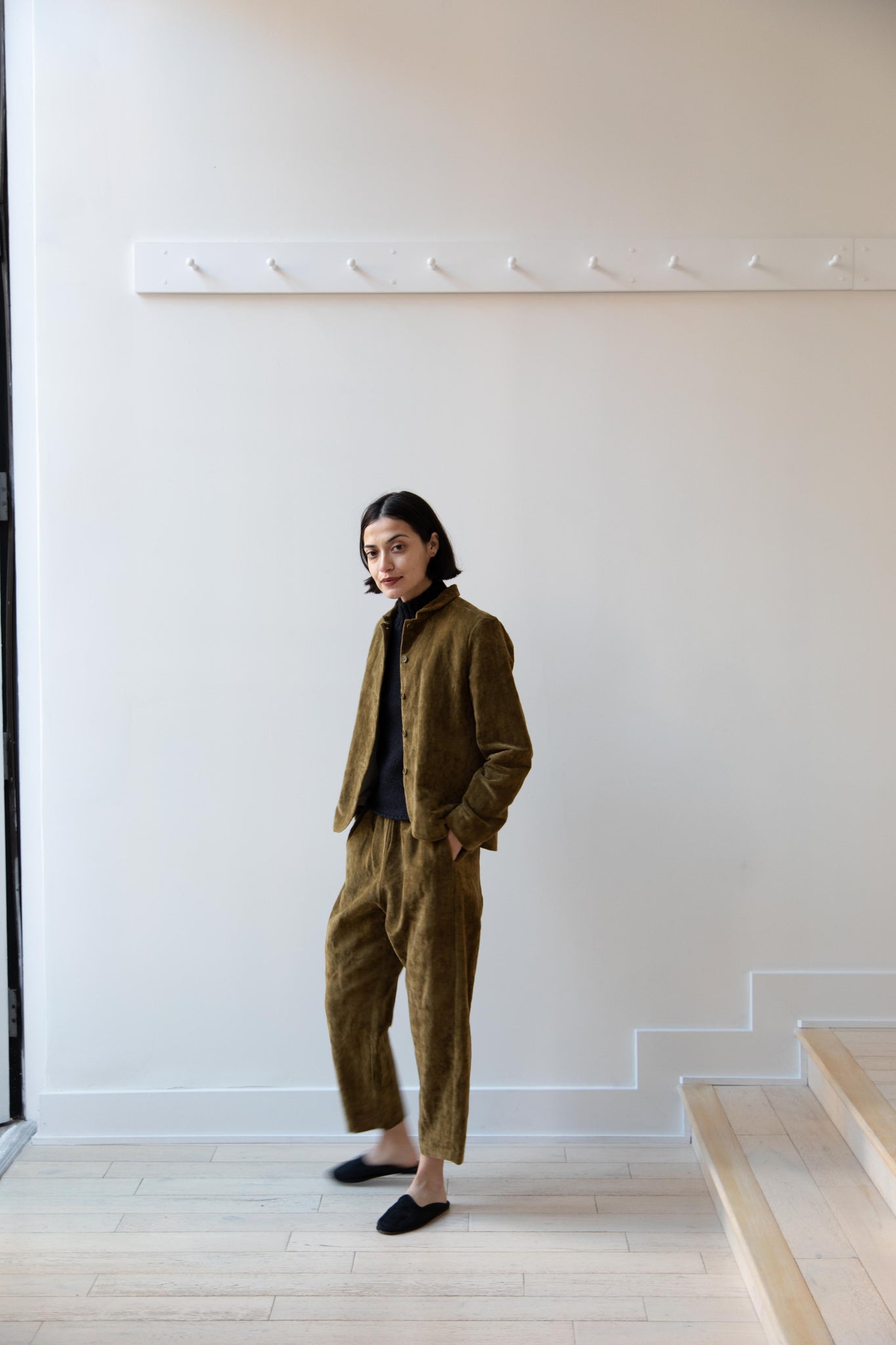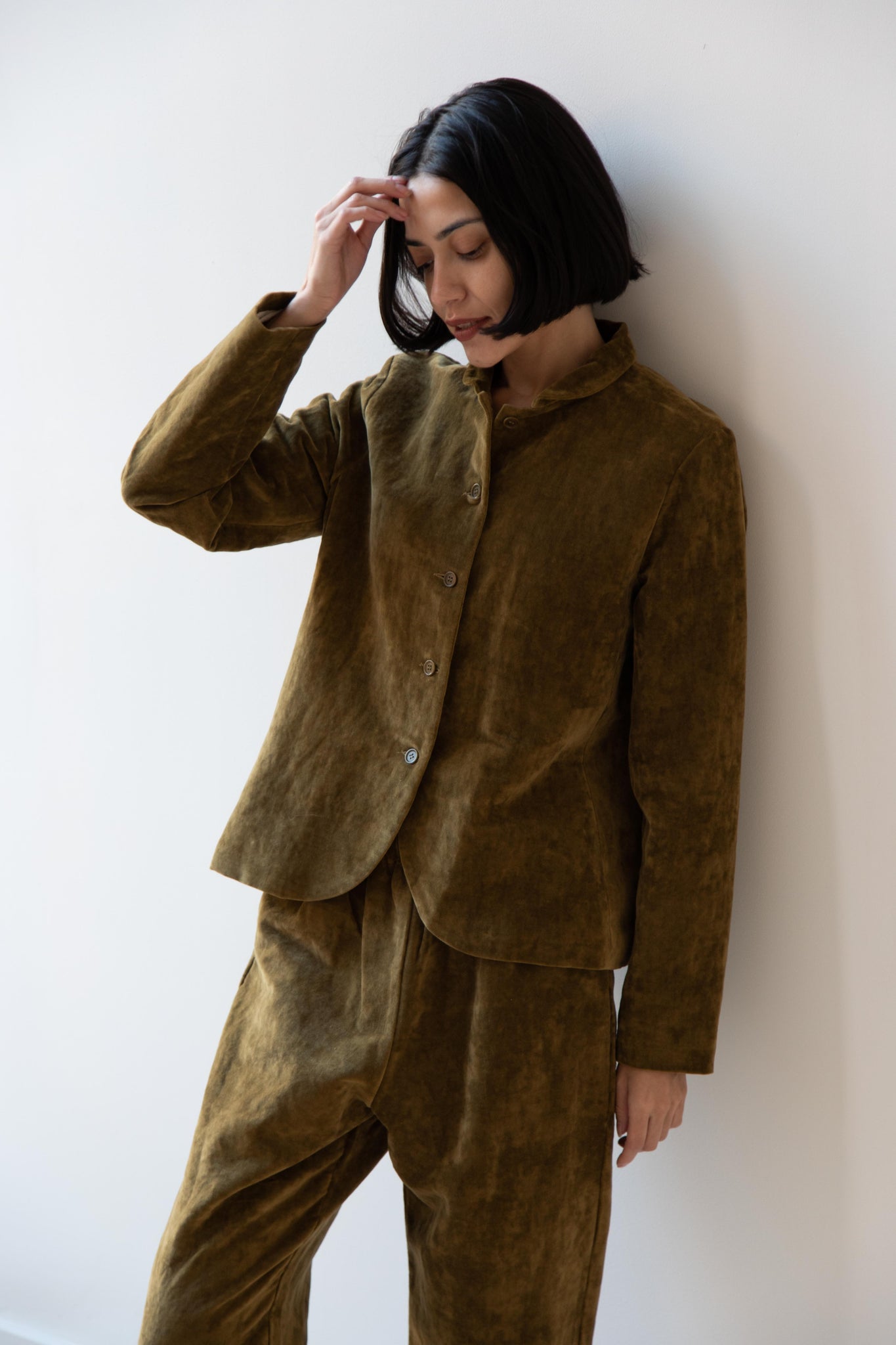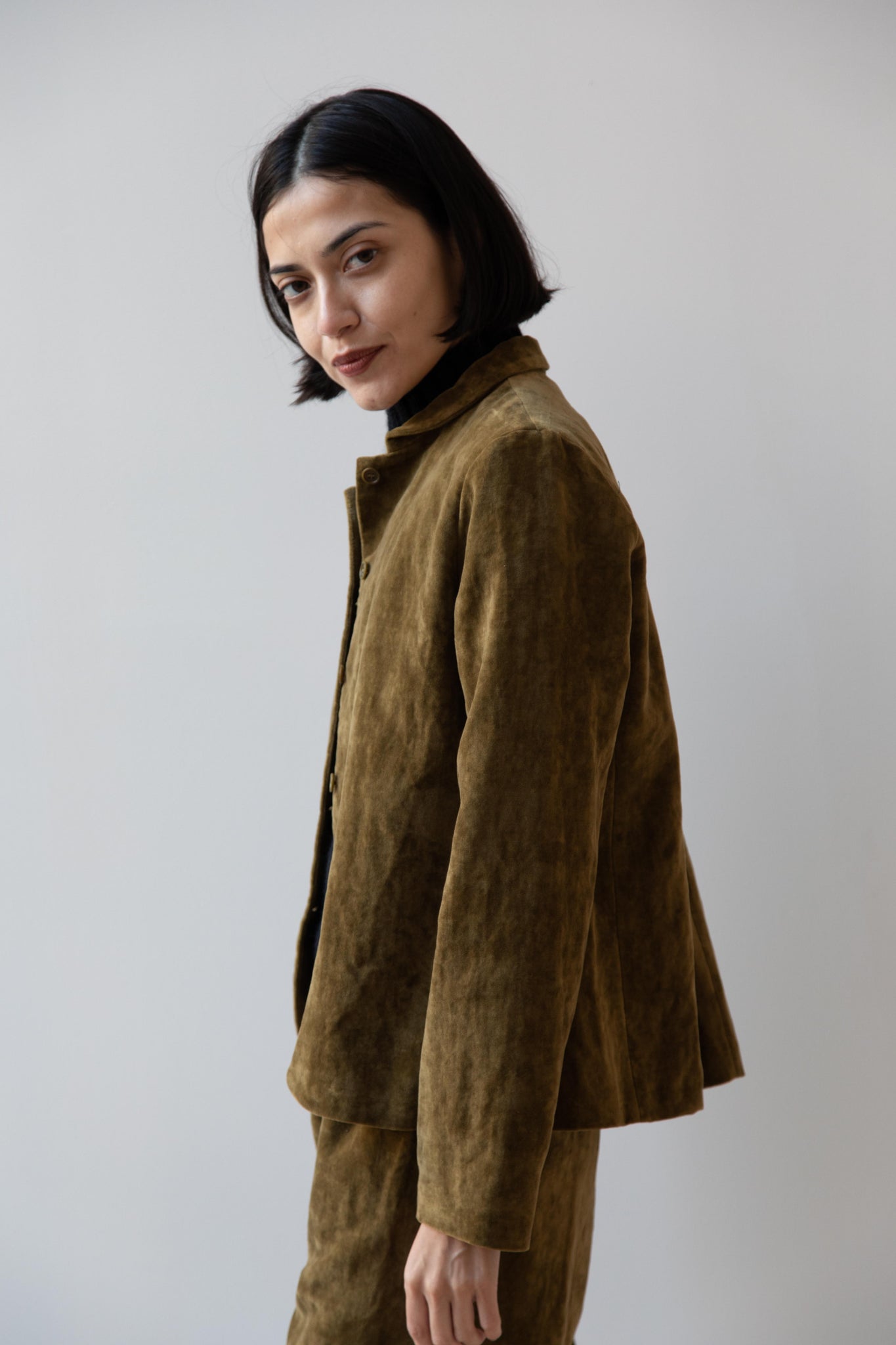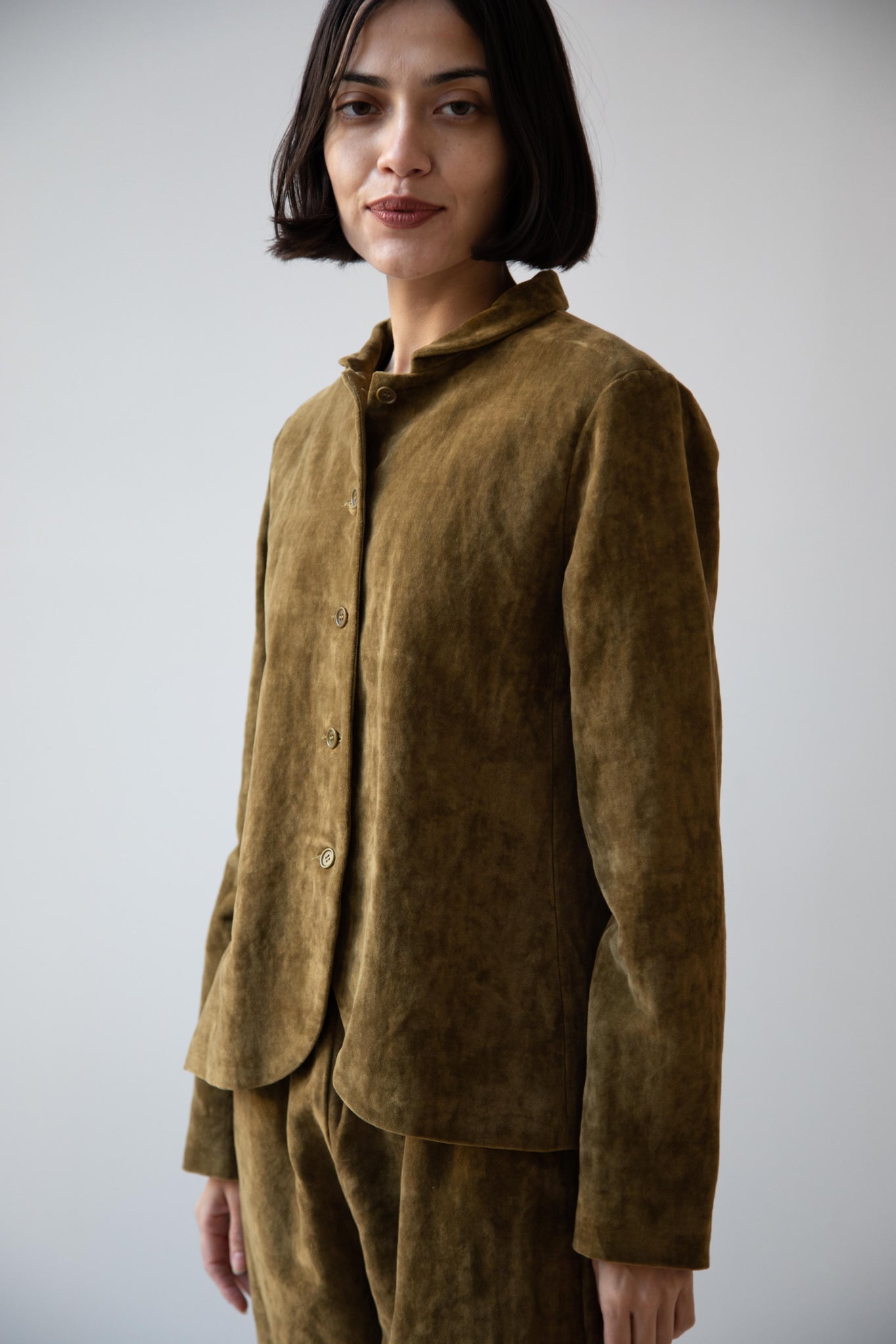 This jacket is made from an elegant crush linen cotton velvet and is fully lined in a cream cotton. There is a small collar and buttons up the front. The color is a golden olive and can look different in different lights and is hard to capture precisely in photos; the designer's color is called forest.