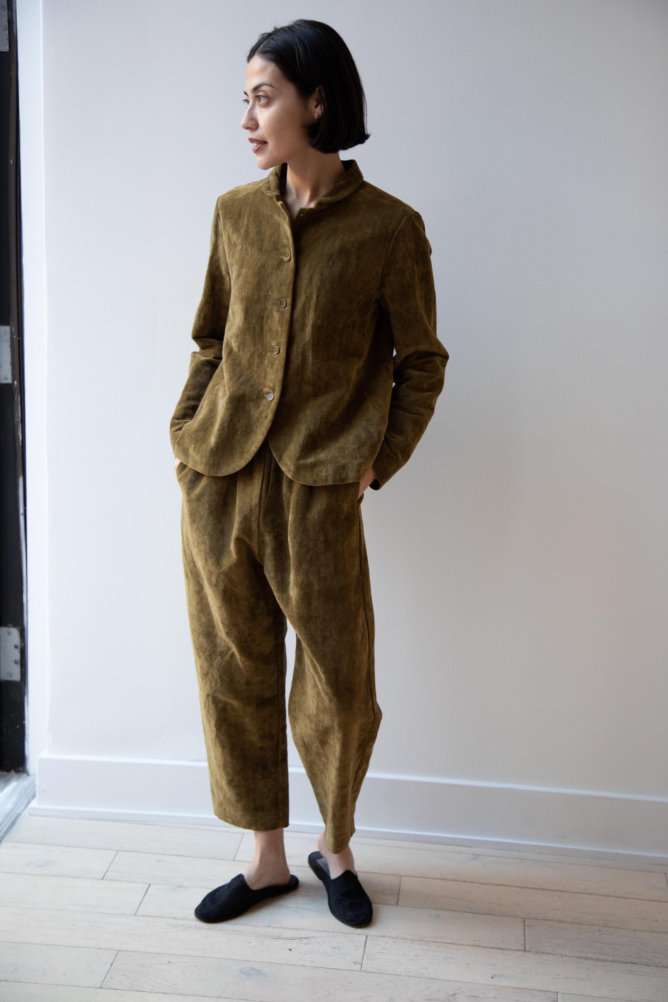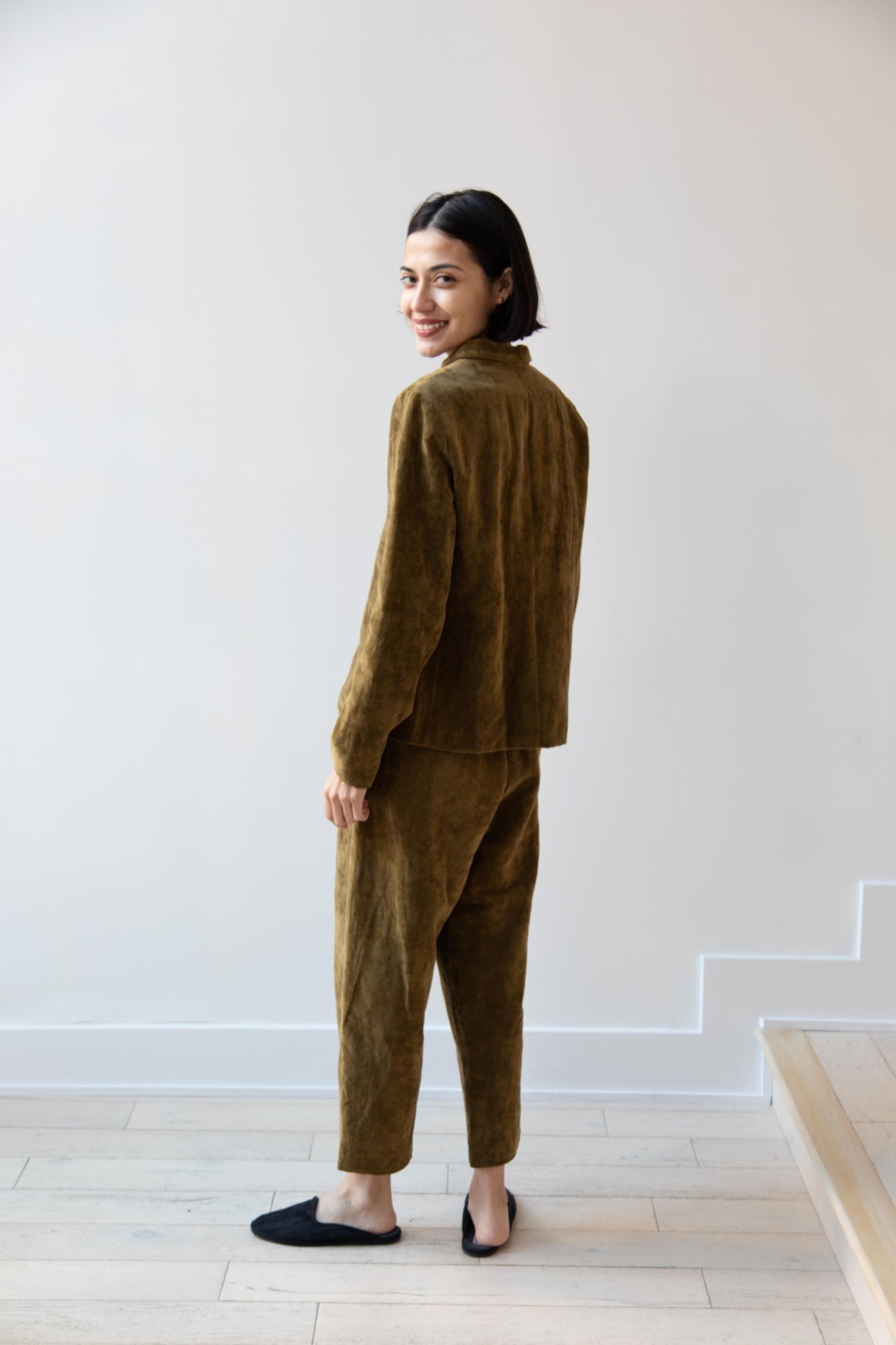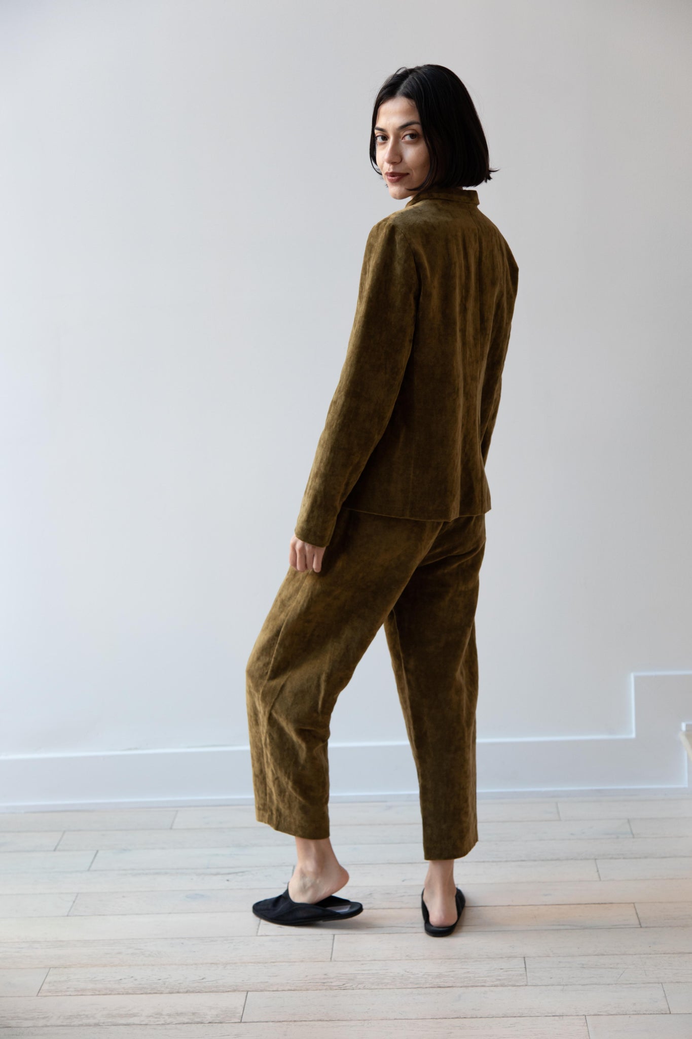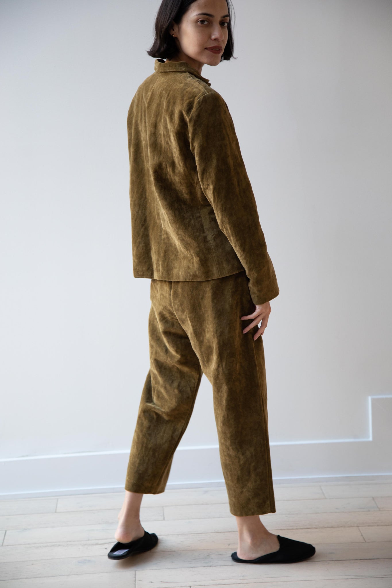 This jacket is made from an elegant crush linen cotton velvet and is fully lined in a cream cotton. There is a small collar and buttons up the front. The color is a golden olive and can look different in different lights and is hard to capture precisely in photos; the designer's color is called forest.