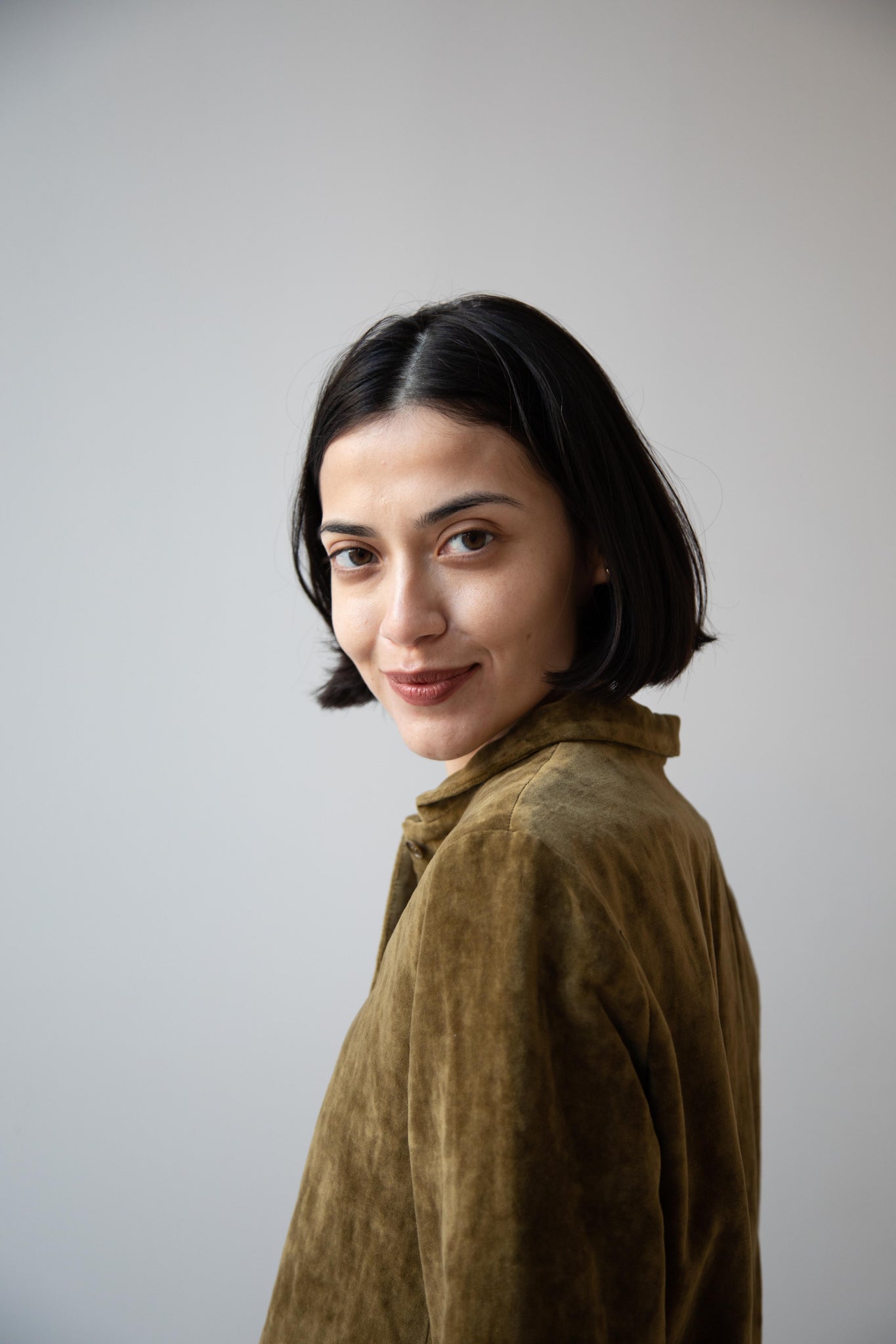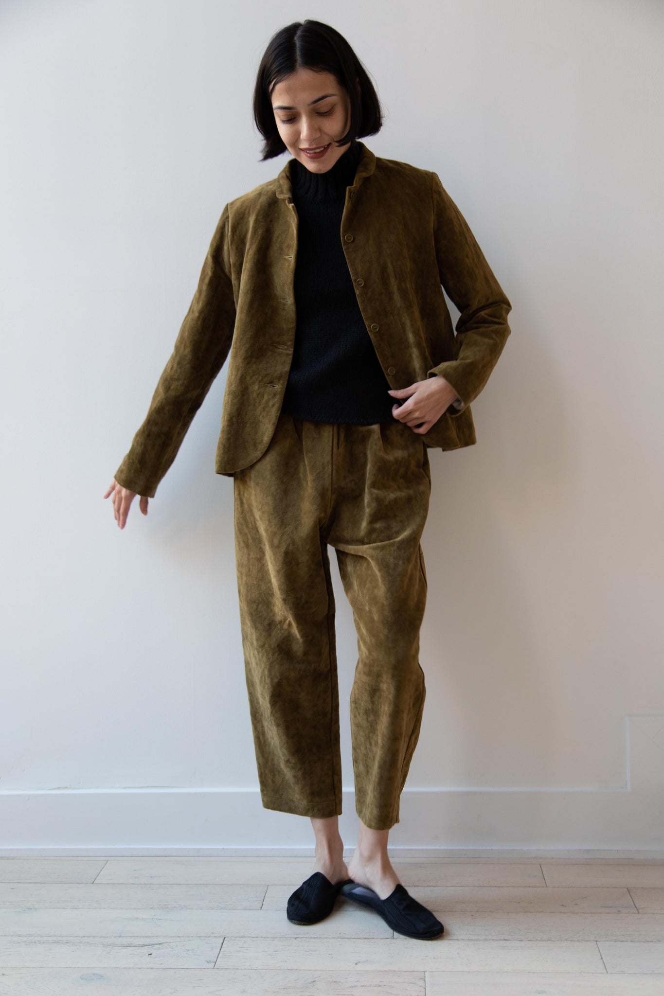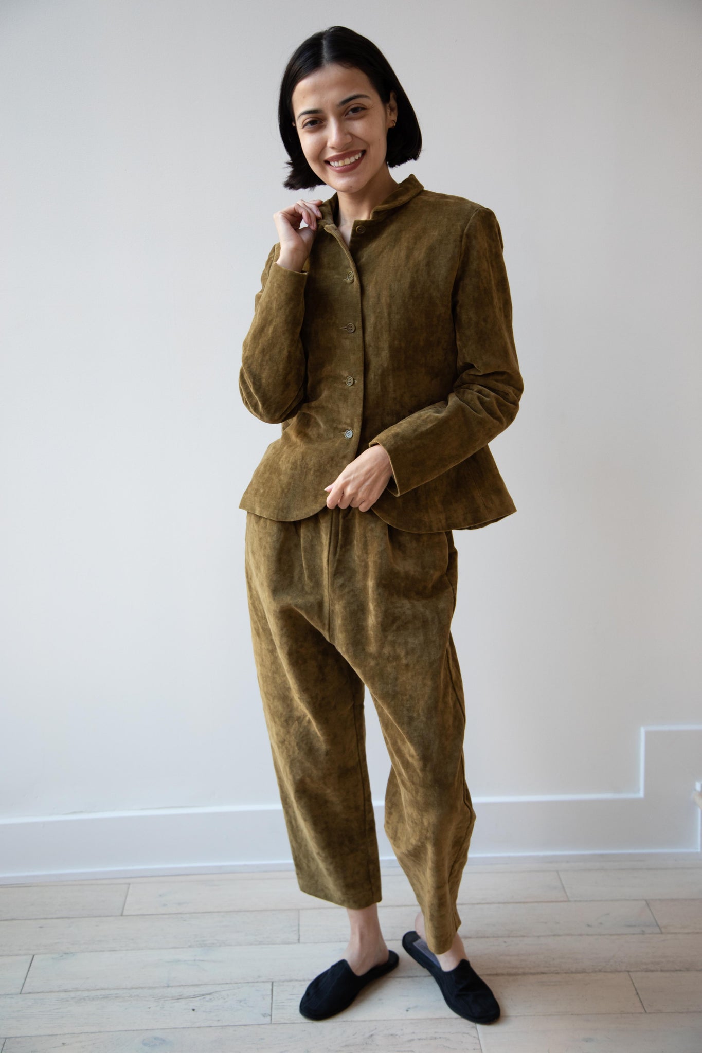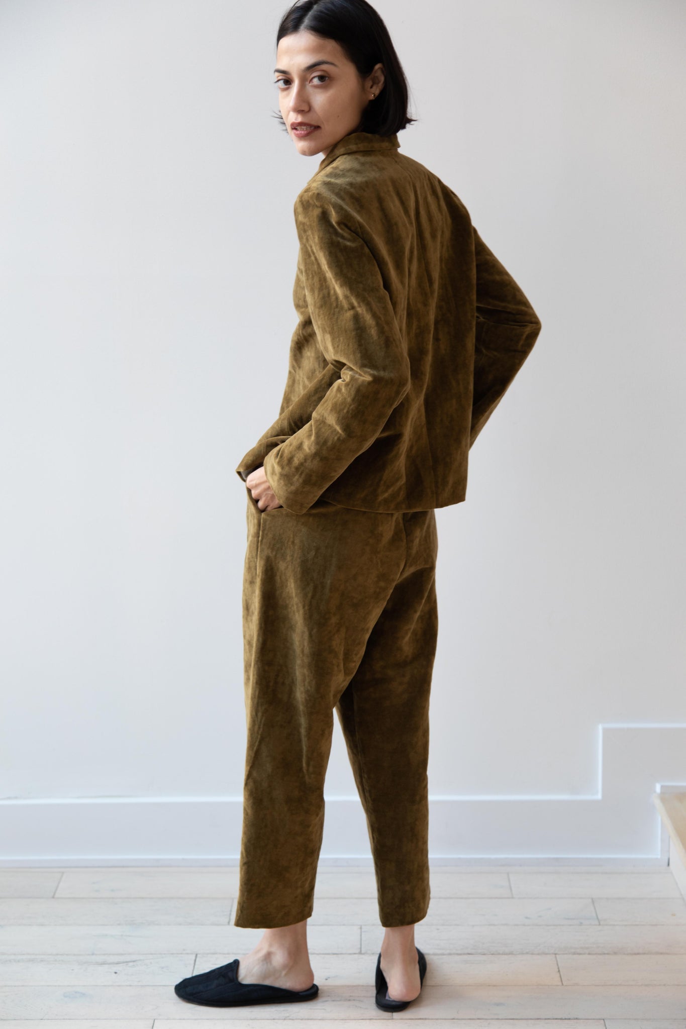 This jacket is made from an elegant crush linen cotton velvet and is fully lined in a cream cotton. There is a small collar and buttons up the front. The color is a golden olive and can look different in different lights and is hard to capture precisely in photos; the designer's color is called forest.