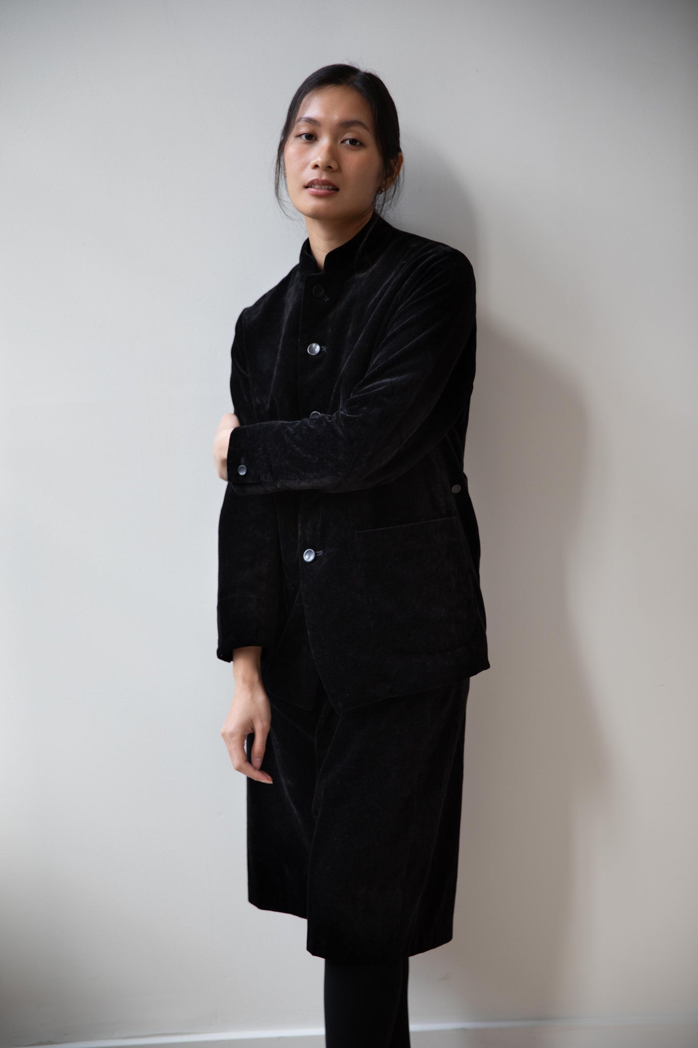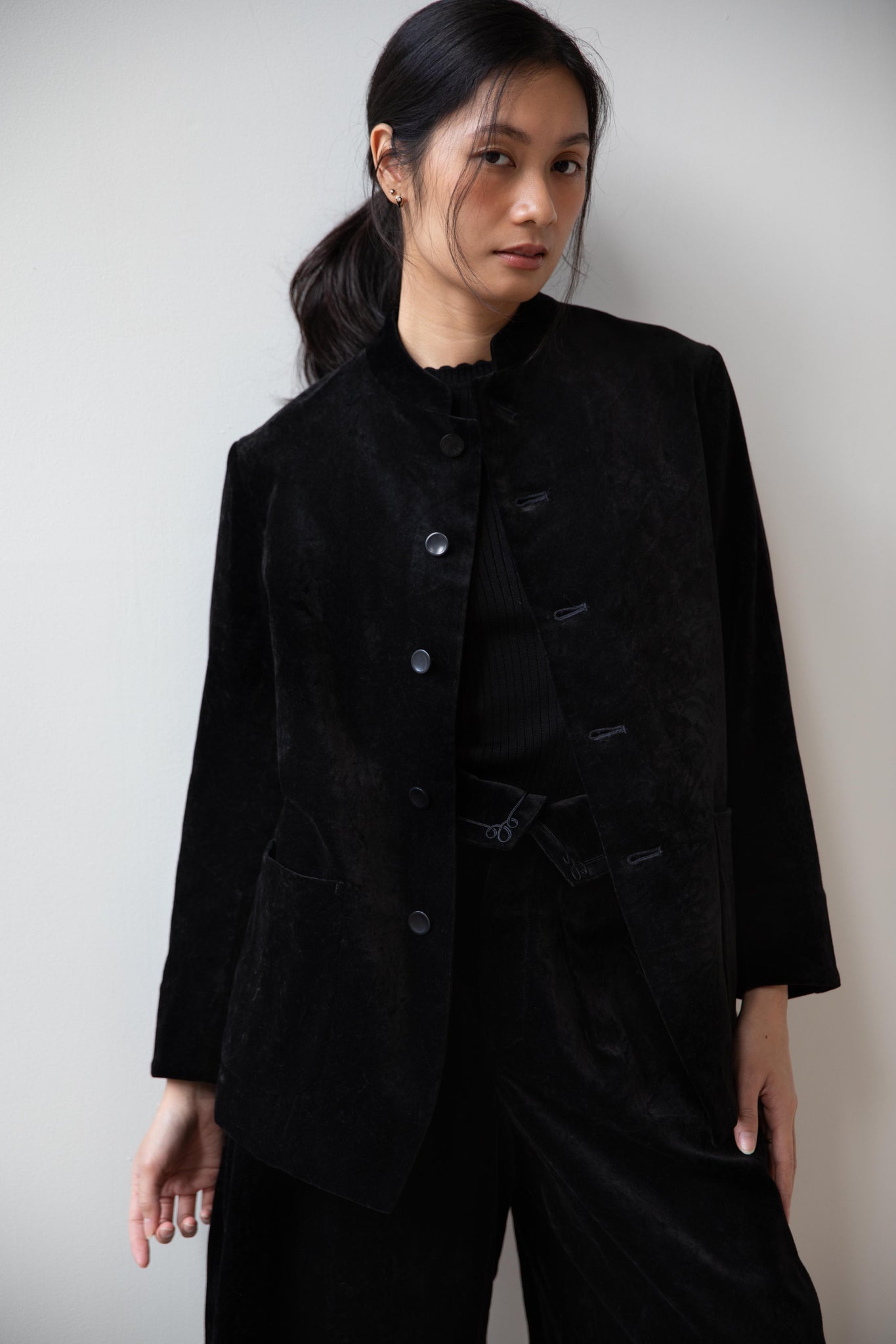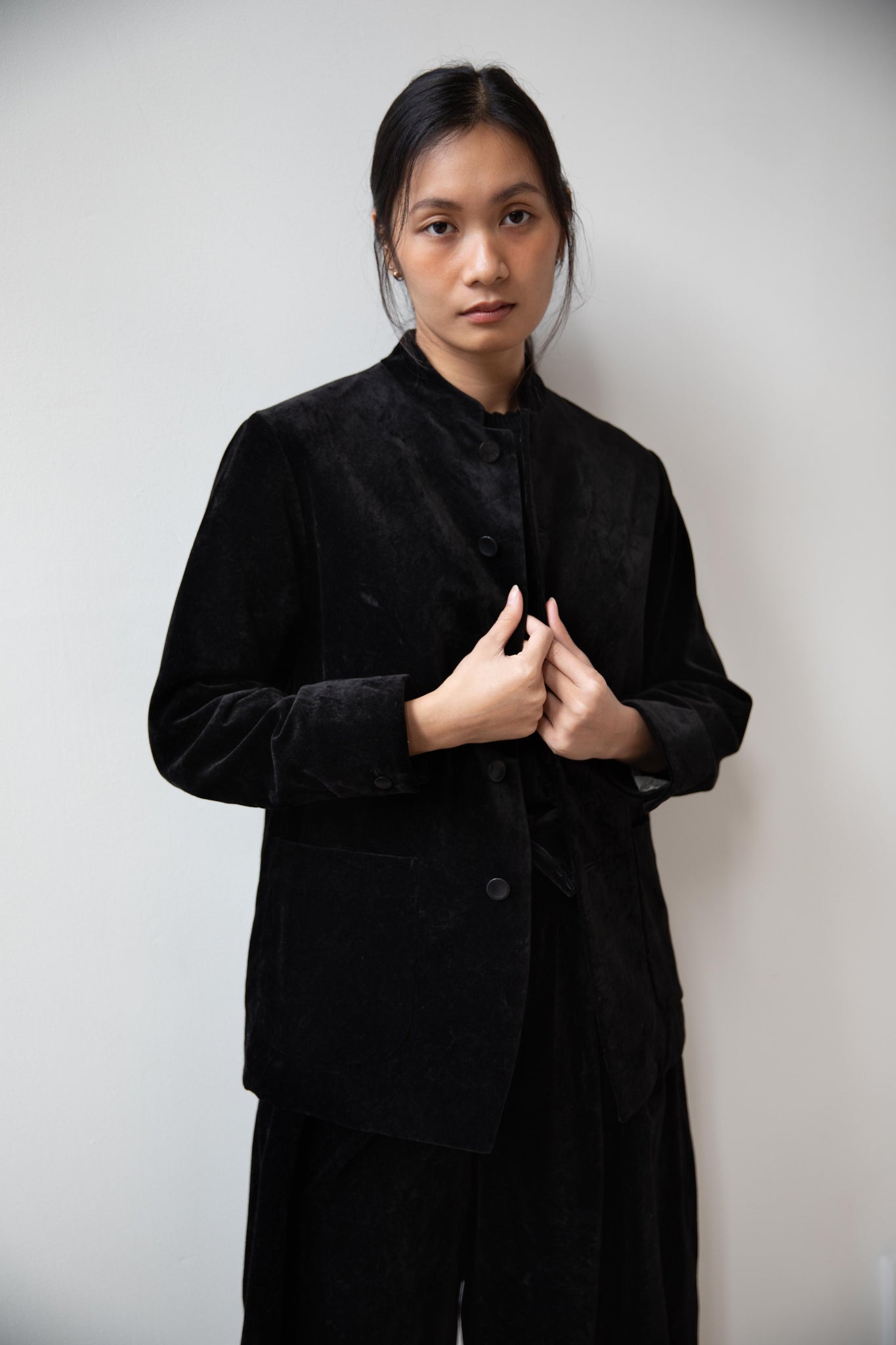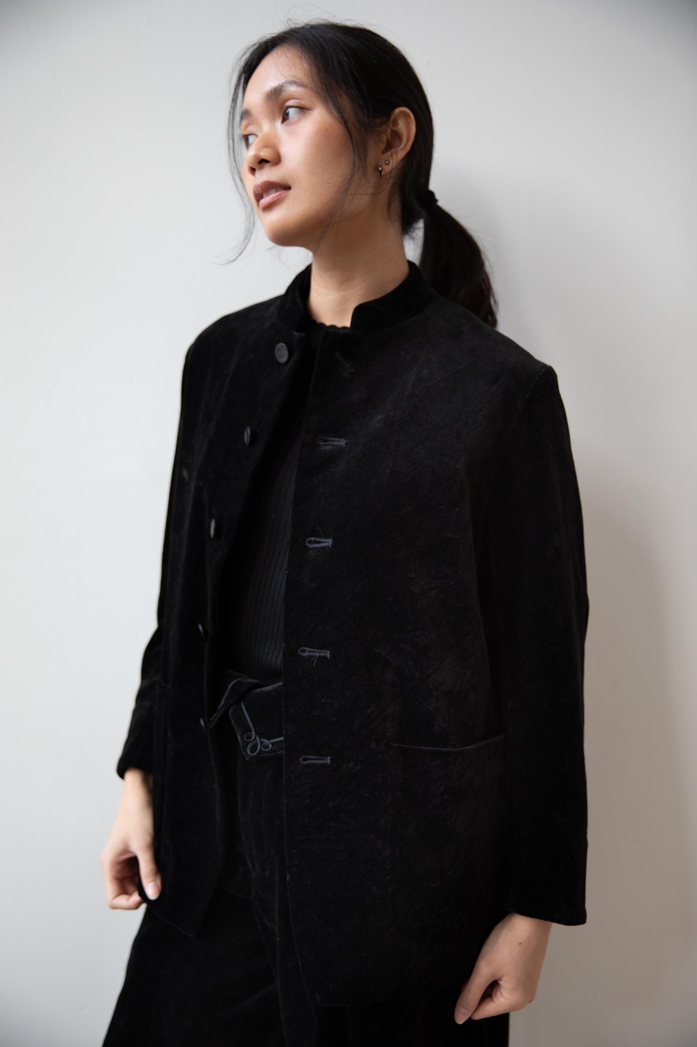 The perfect velvet jacket for this winter! Featuring a mandarin collar, this subtle, but intentional detail elevates the simplest outfit. This jacket is fully lined, giving it structure and features two big front pockets to keep you hands warm. There are also buttons on the side to bring in the waist to give a slight hourglass effect.