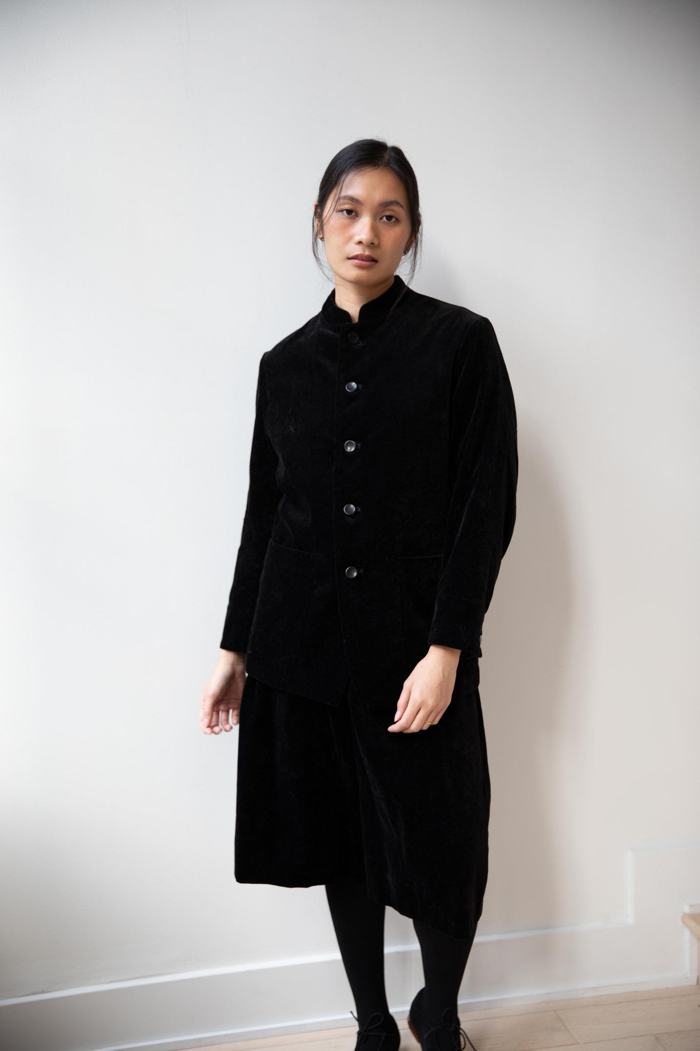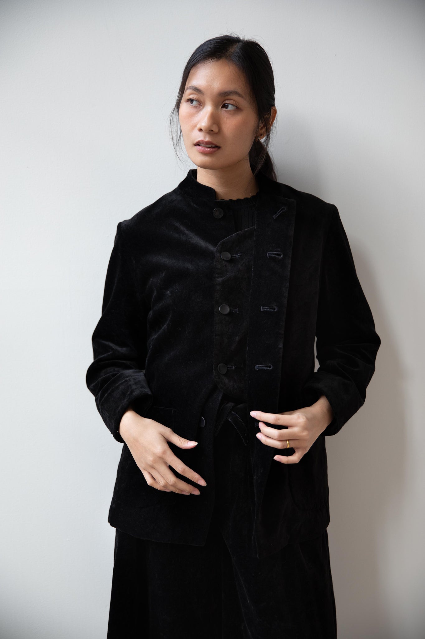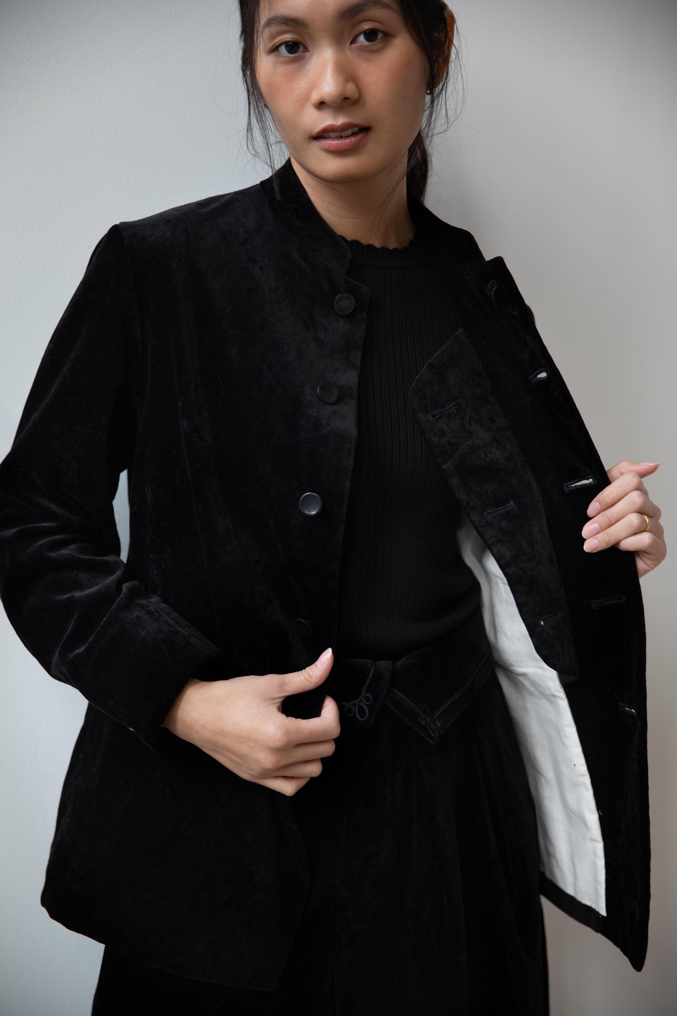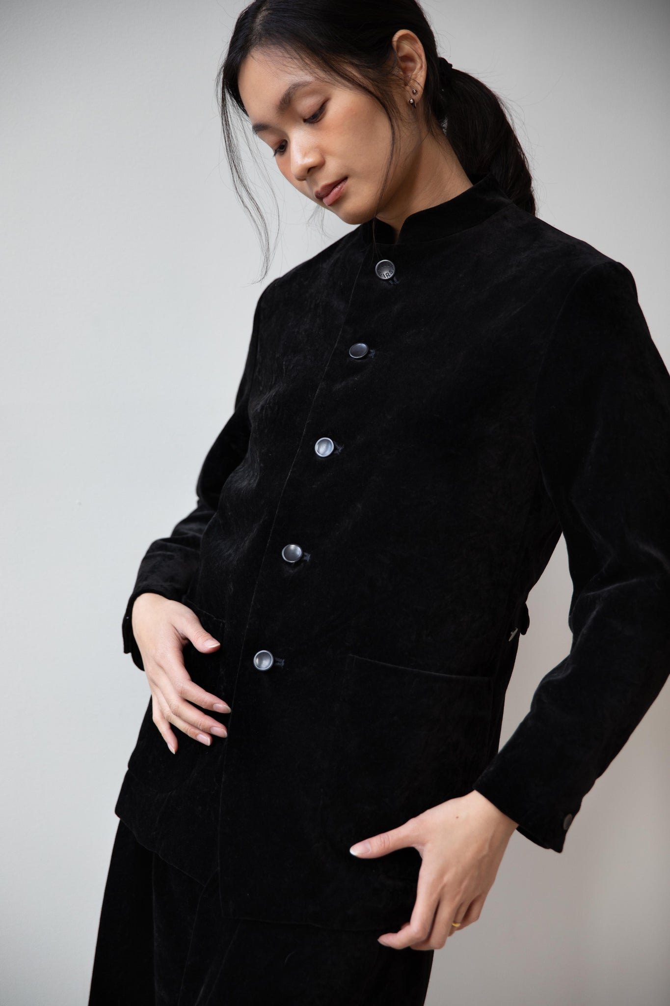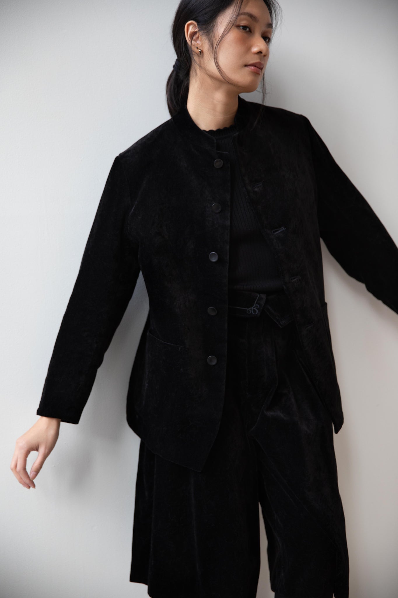 The perfect velvet jacket for this winter! Featuring a mandarin collar, this subtle, but intentional detail elevates the simplest outfit. This jacket is fully lined, giving it structure and features two big front pockets to keep you hands warm. There are also buttons on the side to bring in the waist to give a slight hourglass effect.