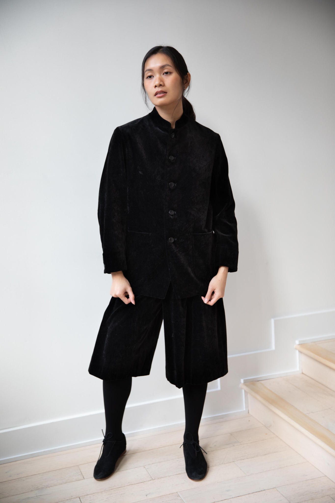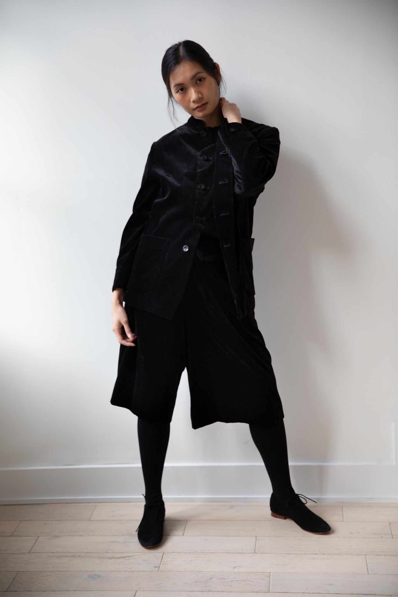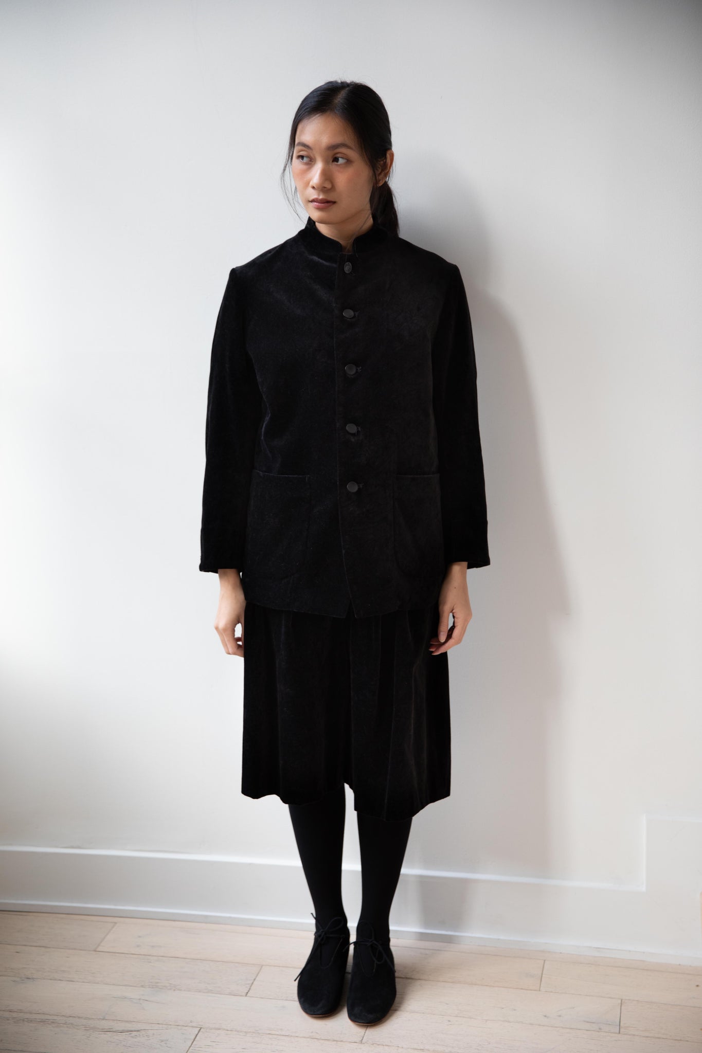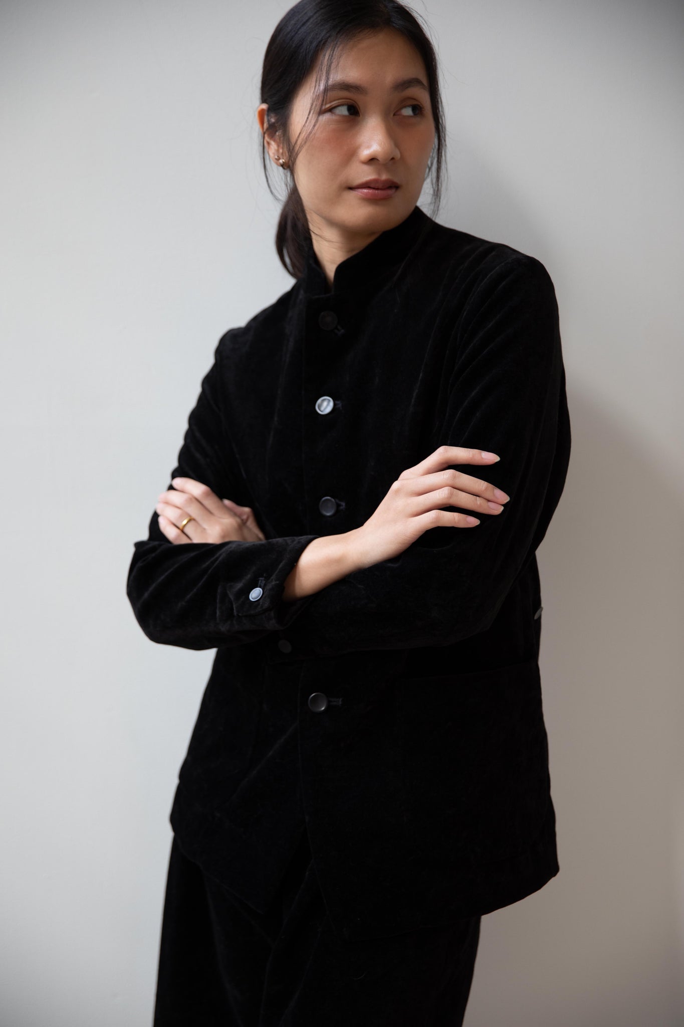 The perfect velvet jacket for this winter! Featuring a mandarin collar, this subtle, but intentional detail elevates the simplest outfit. This jacket is fully lined, giving it structure and features two big front pockets to keep you hands warm. There are also buttons on the side to bring in the waist to give a slight hourglass effect.