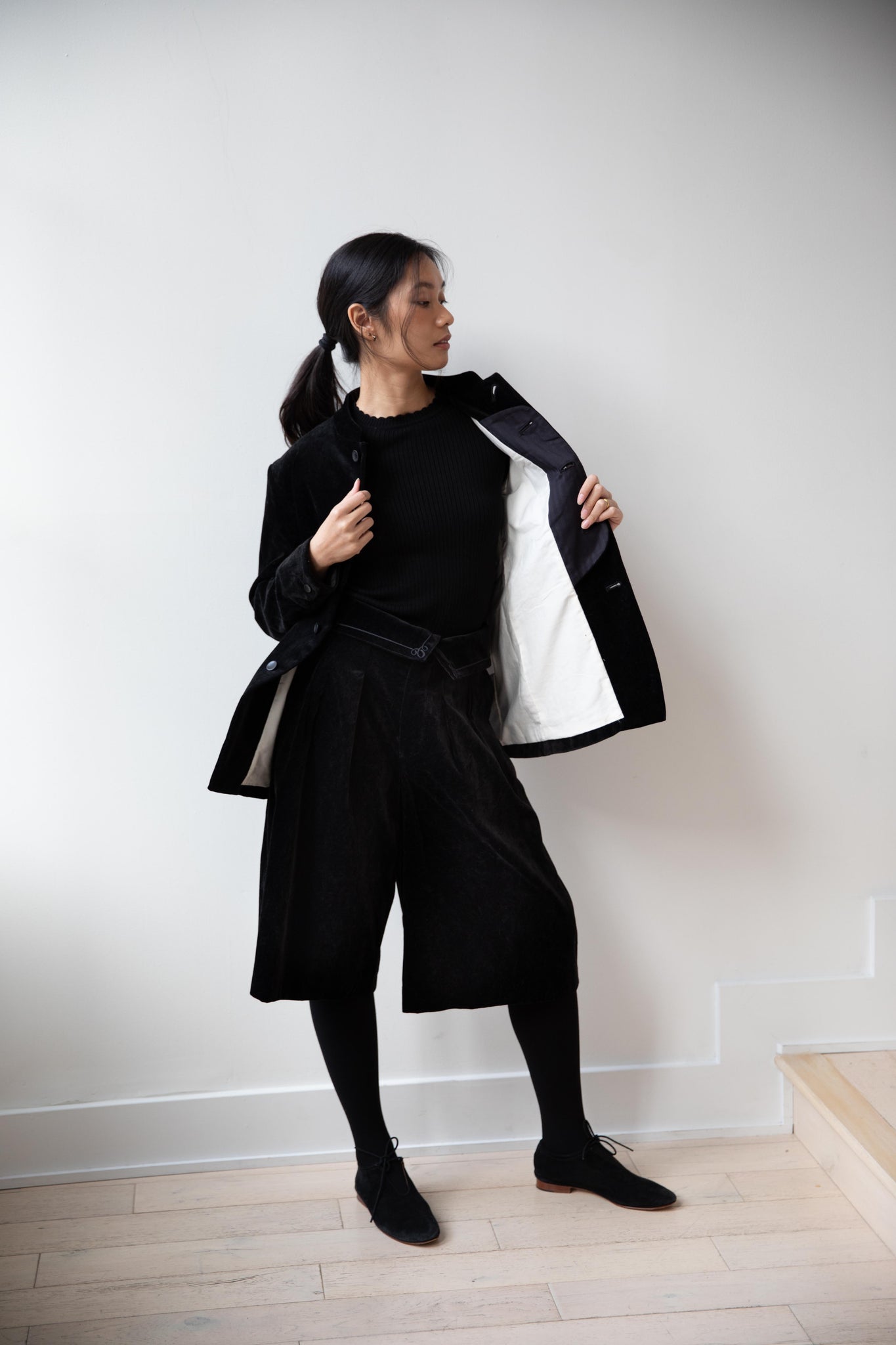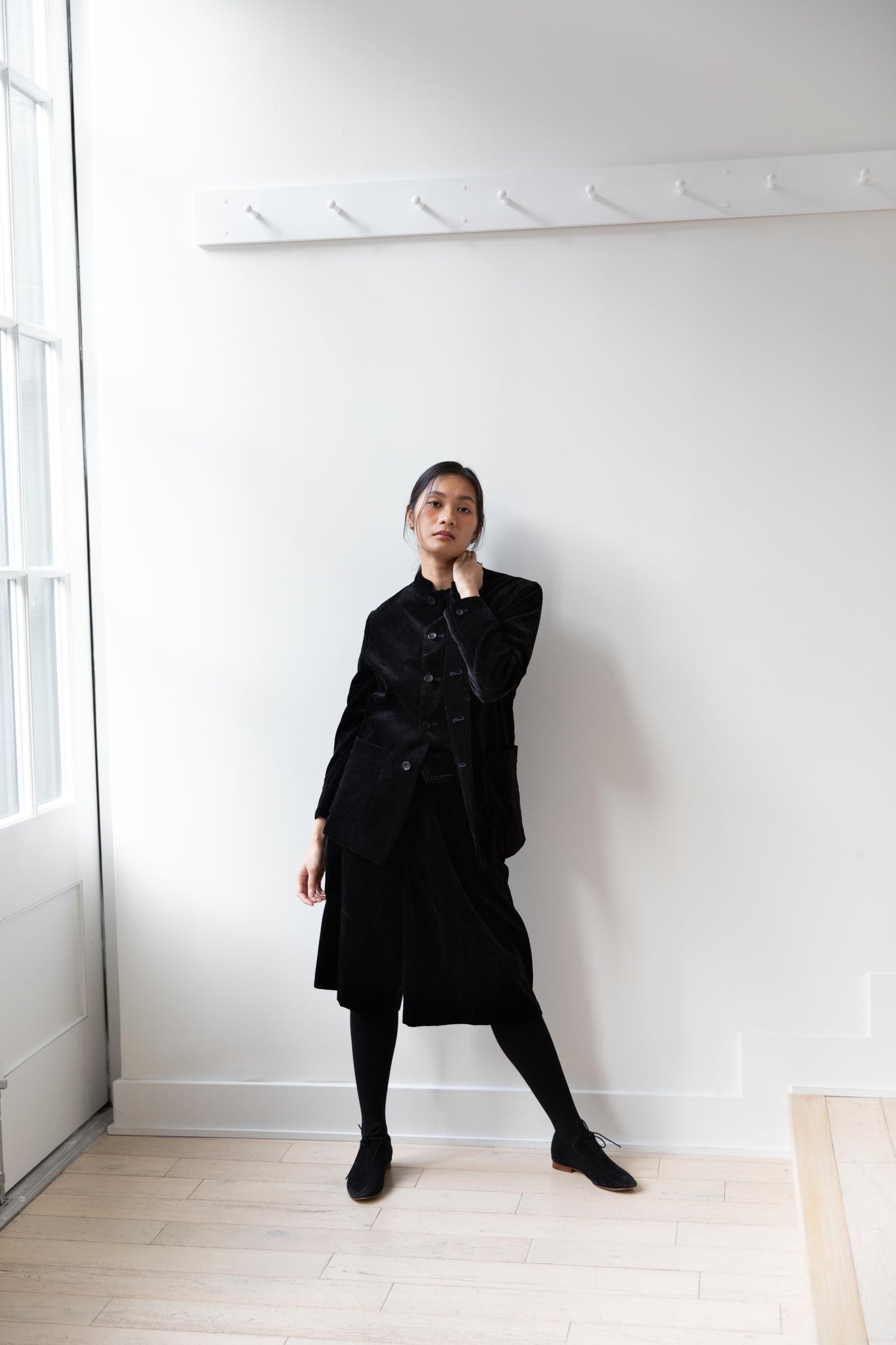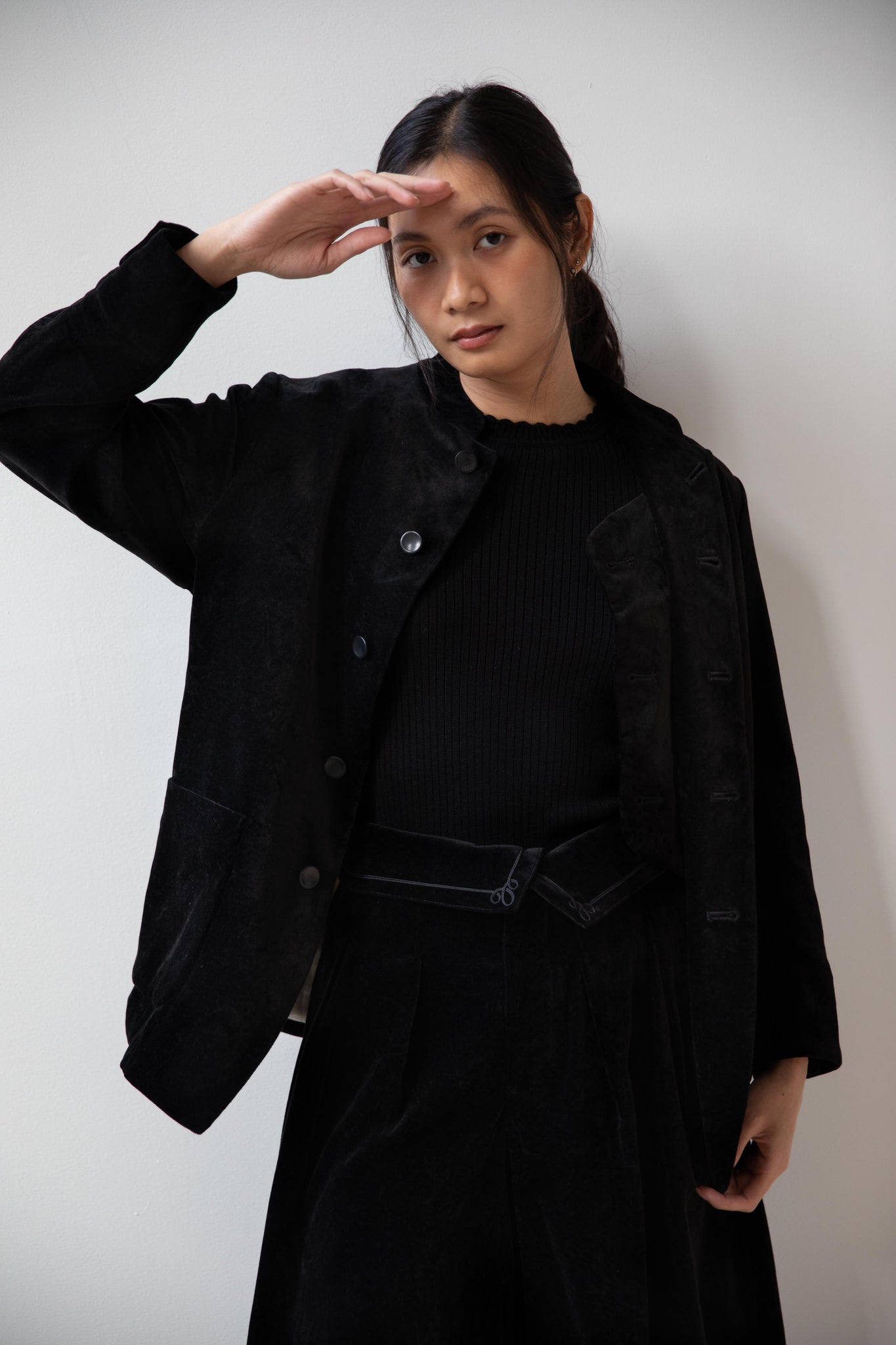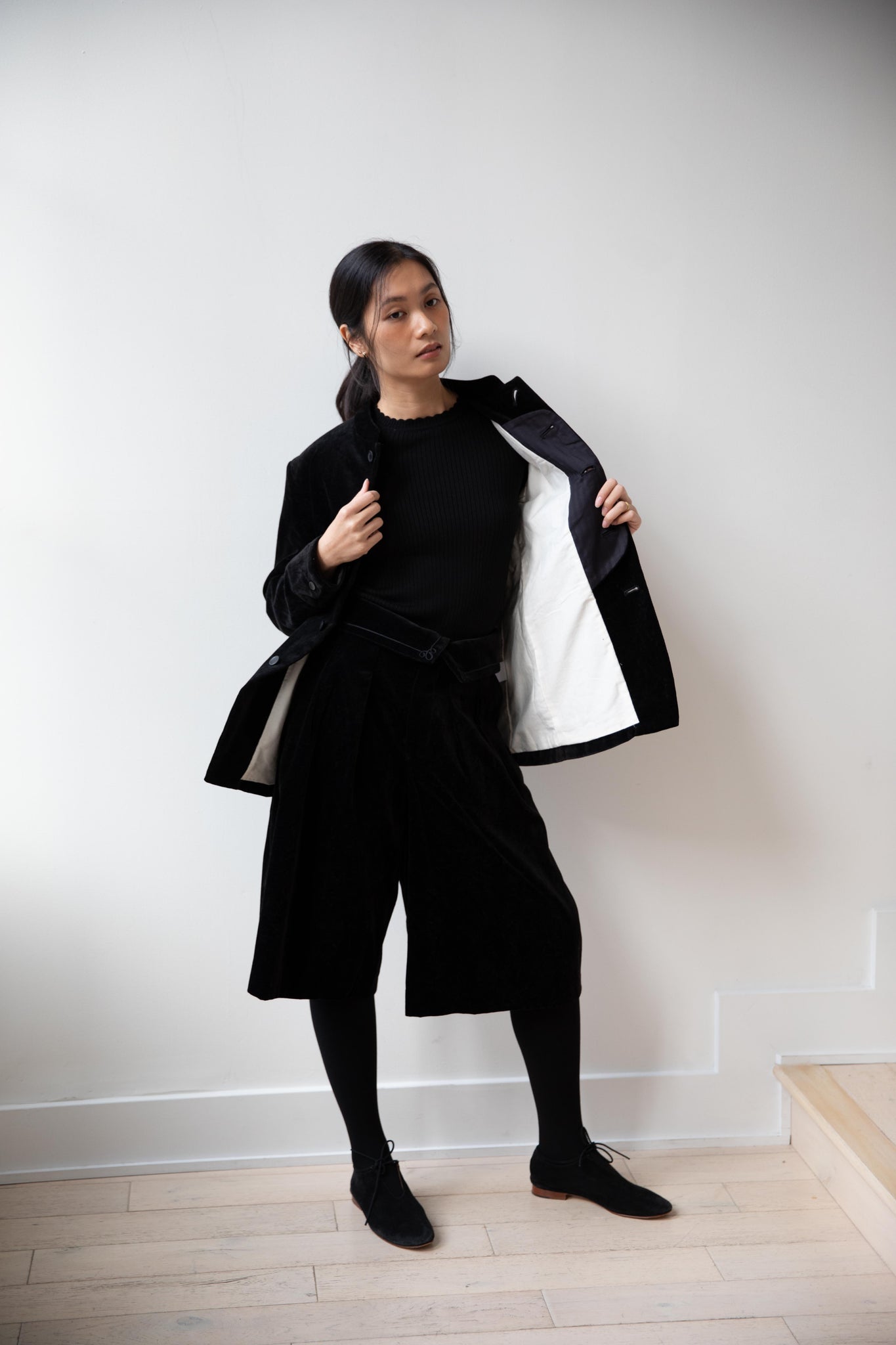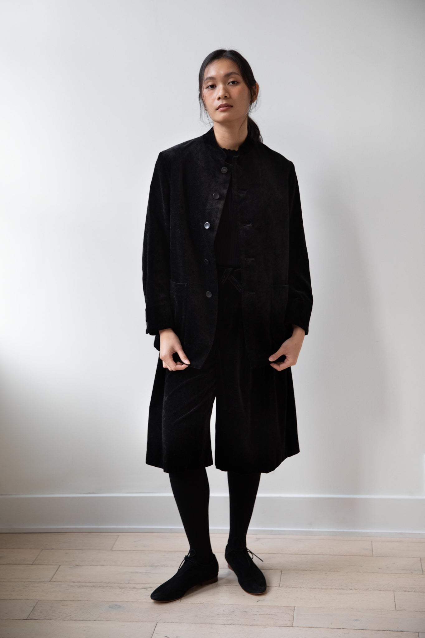 The perfect velvet jacket for this winter! Featuring a mandarin collar, this subtle, but intentional detail elevates the simplest outfit. This jacket is fully lined, giving it structure and features two big front pockets to keep you hands warm. There are also buttons on the side to bring in the waist to give a slight hourglass effect.