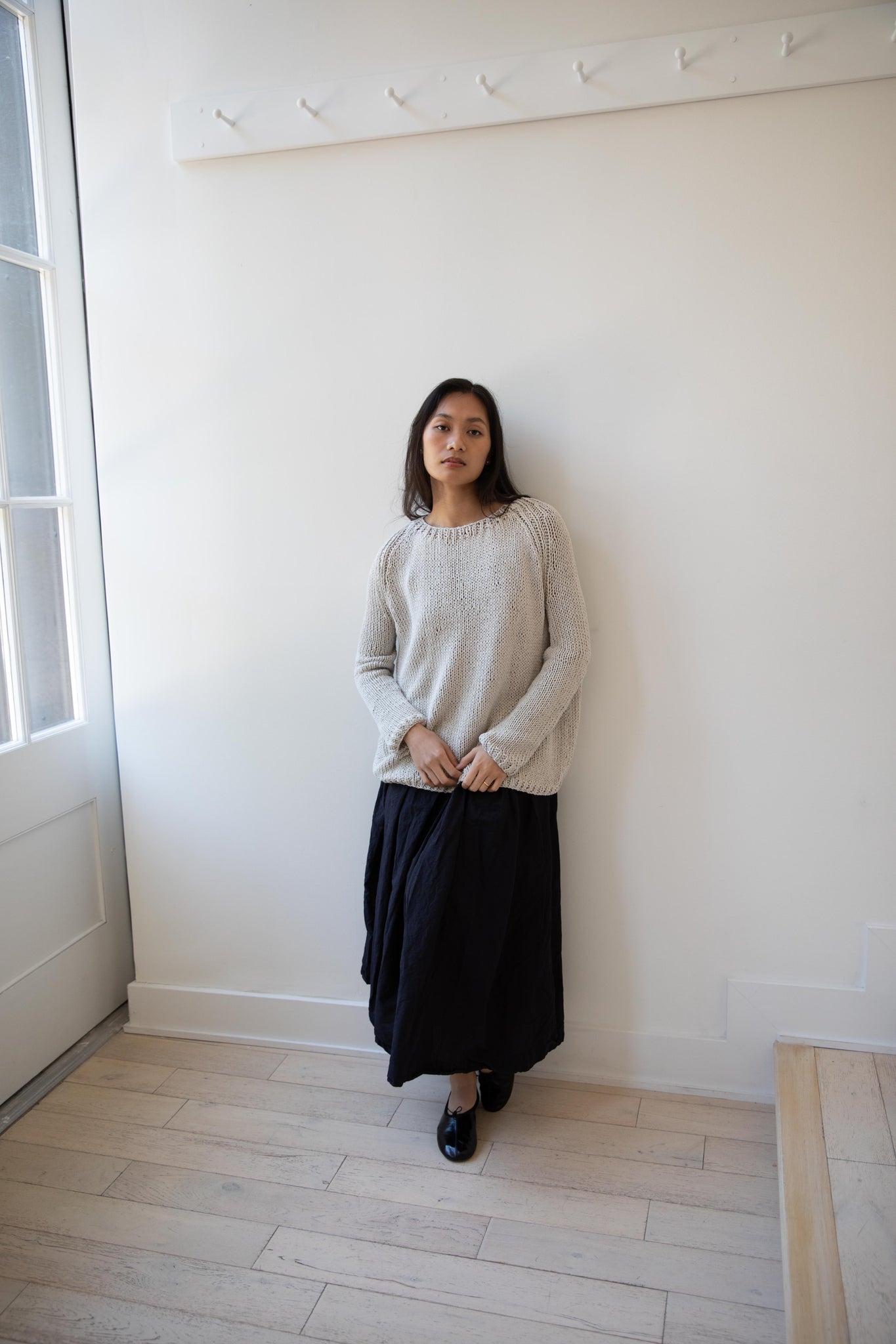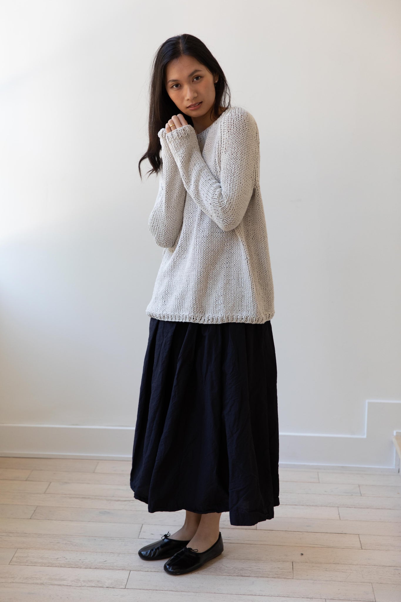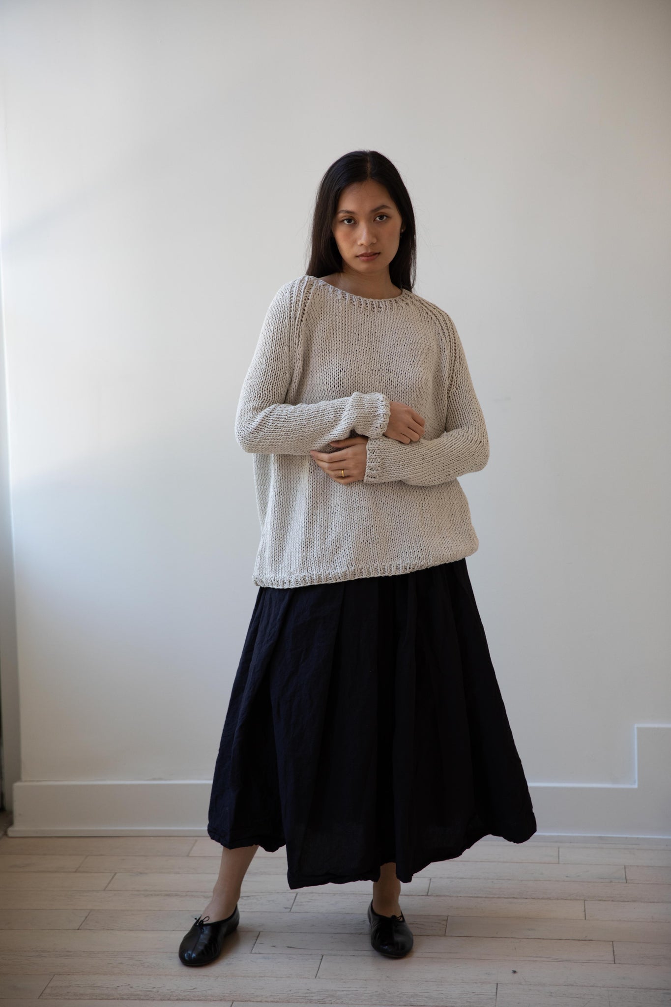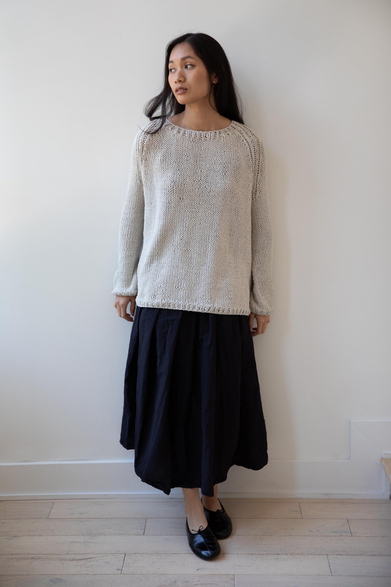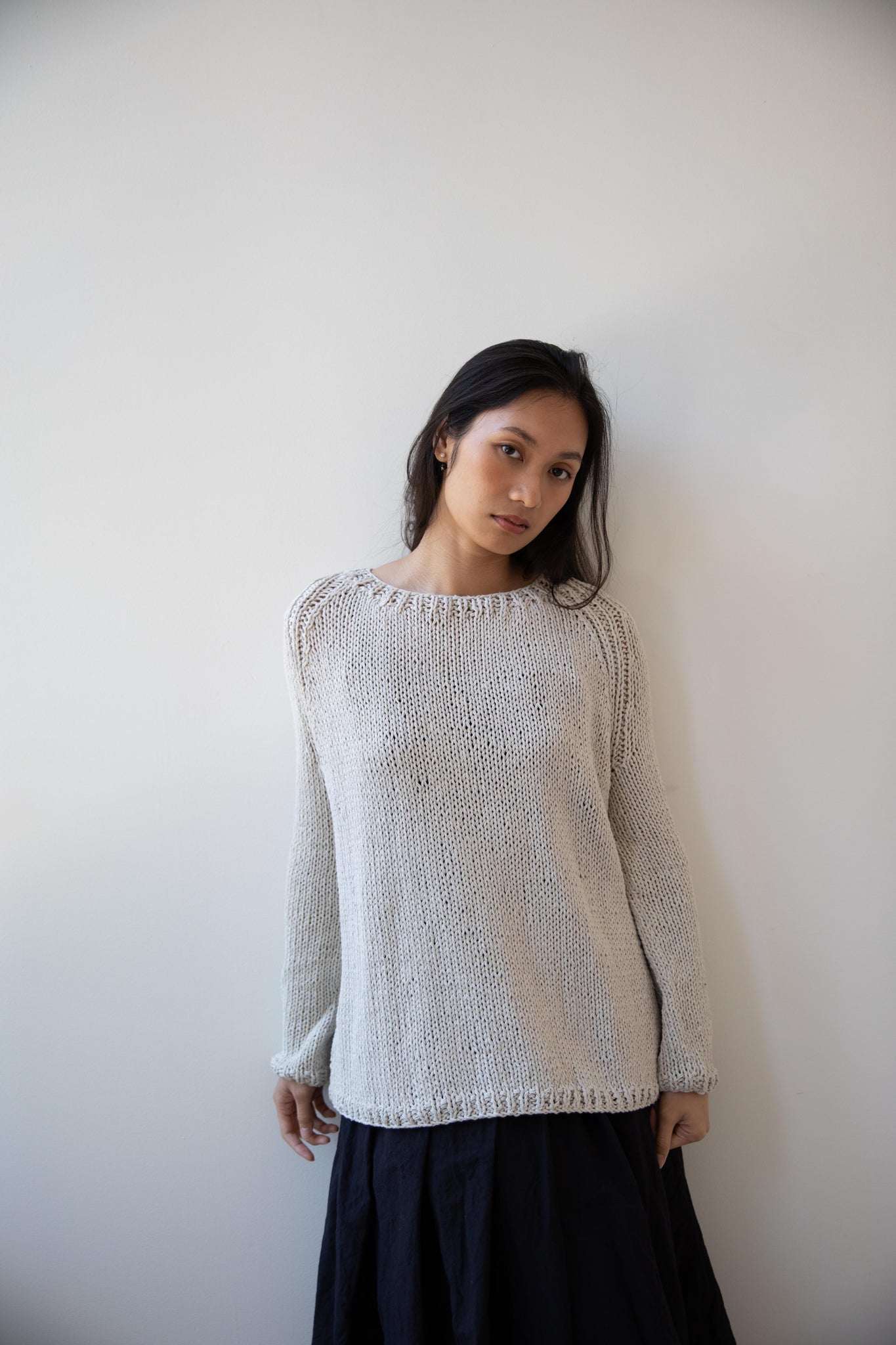 This loose knit raw silk pullover is an ideal piece to layer throughout the year. Made from a nubby and textured yarn, the oversized fit combined with the drapey quality of the textile makes for a great sweater to combine with a skirt in the warmer season. The off white color has a grey misty hue.