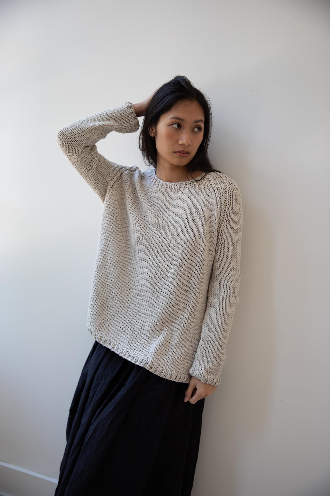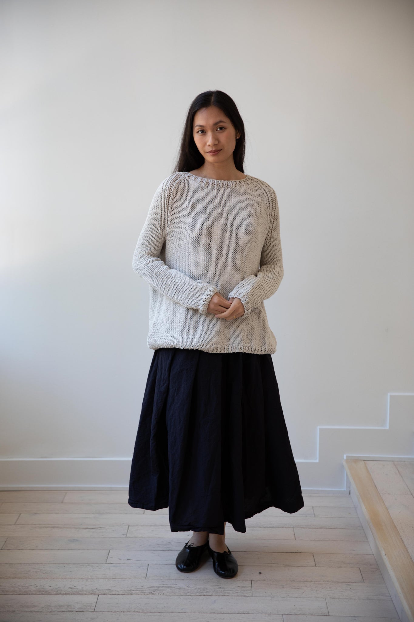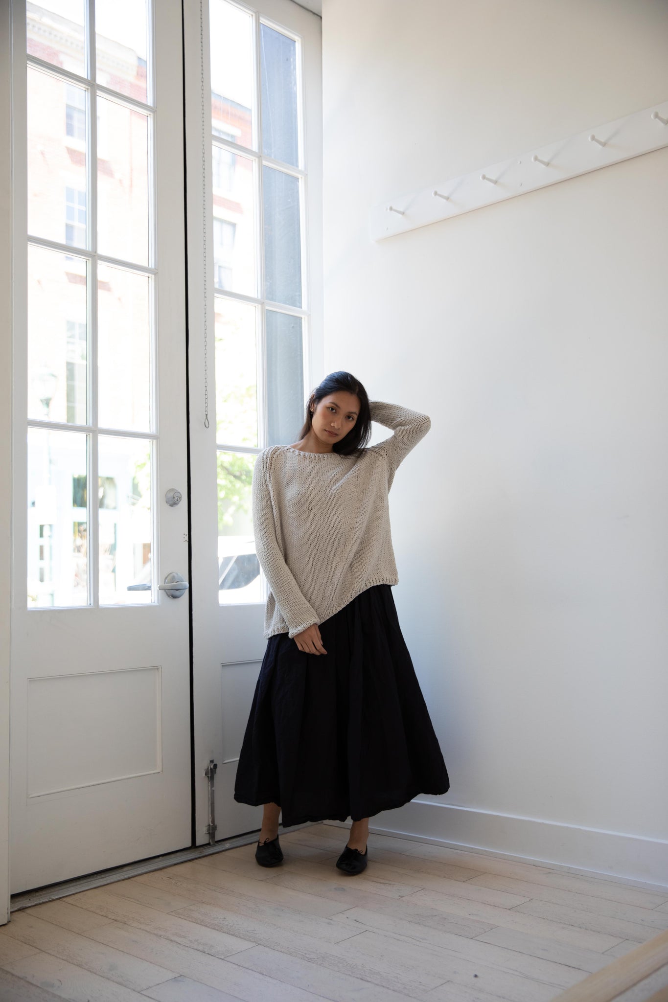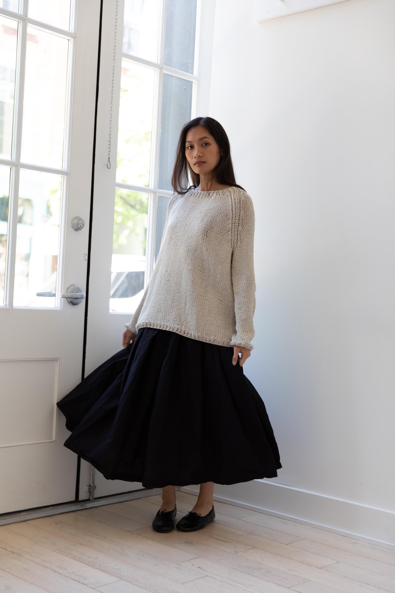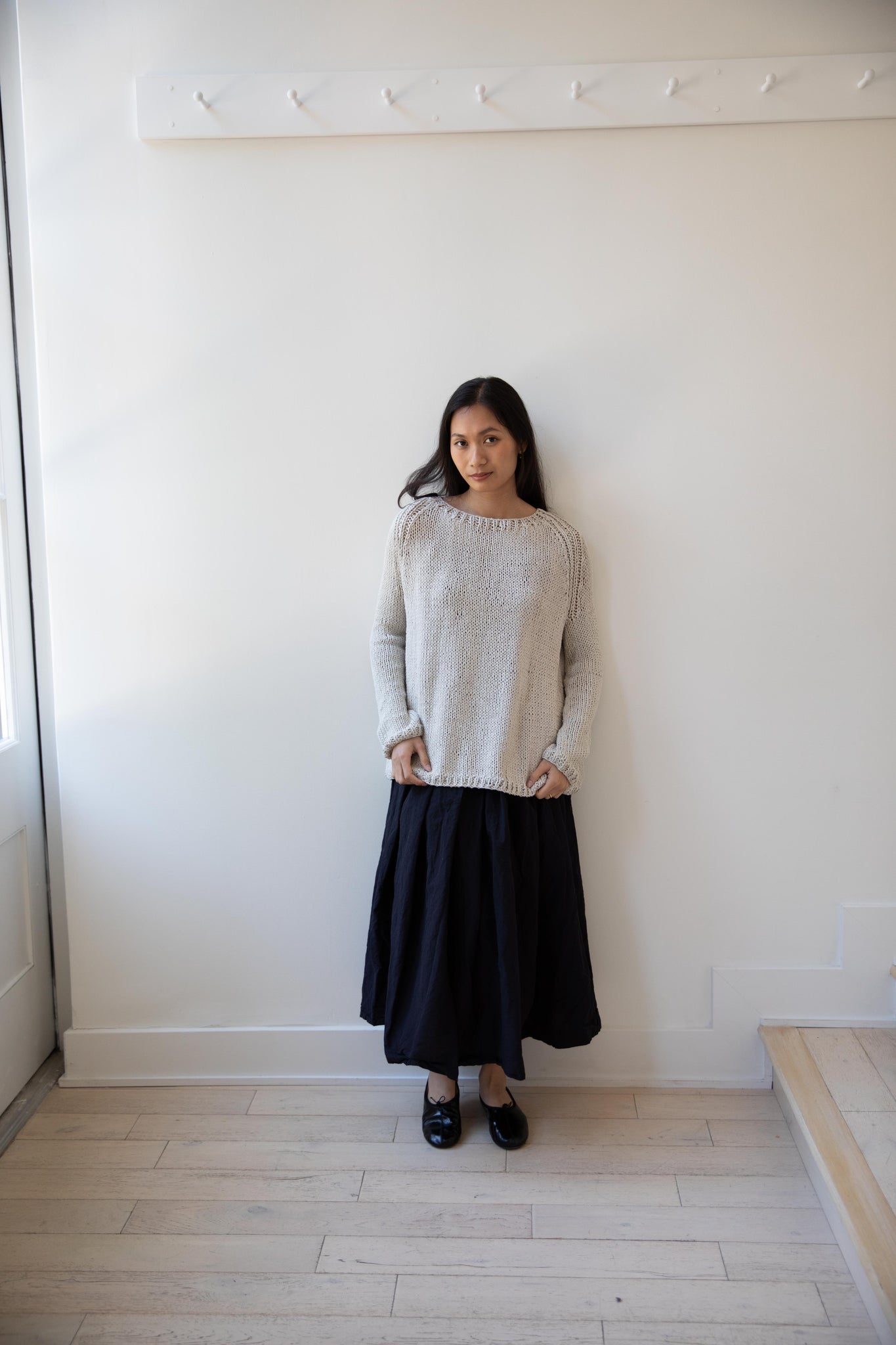 This loose knit raw silk pullover is an ideal piece to layer throughout the year. Made from a nubby and textured yarn, the oversized fit combined with the drapey quality of the textile makes for a great sweater to combine with a skirt in the warmer season. The off white color has a grey misty hue.