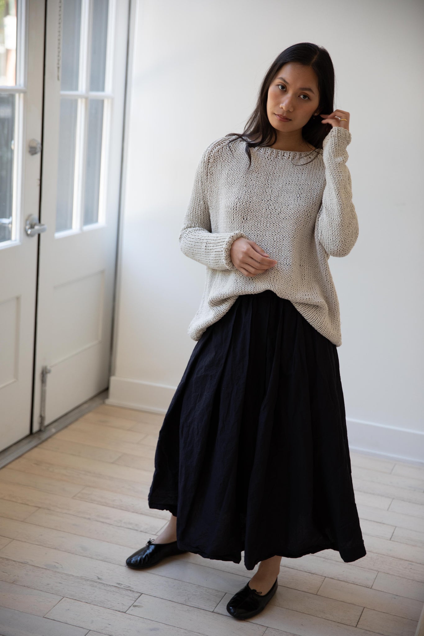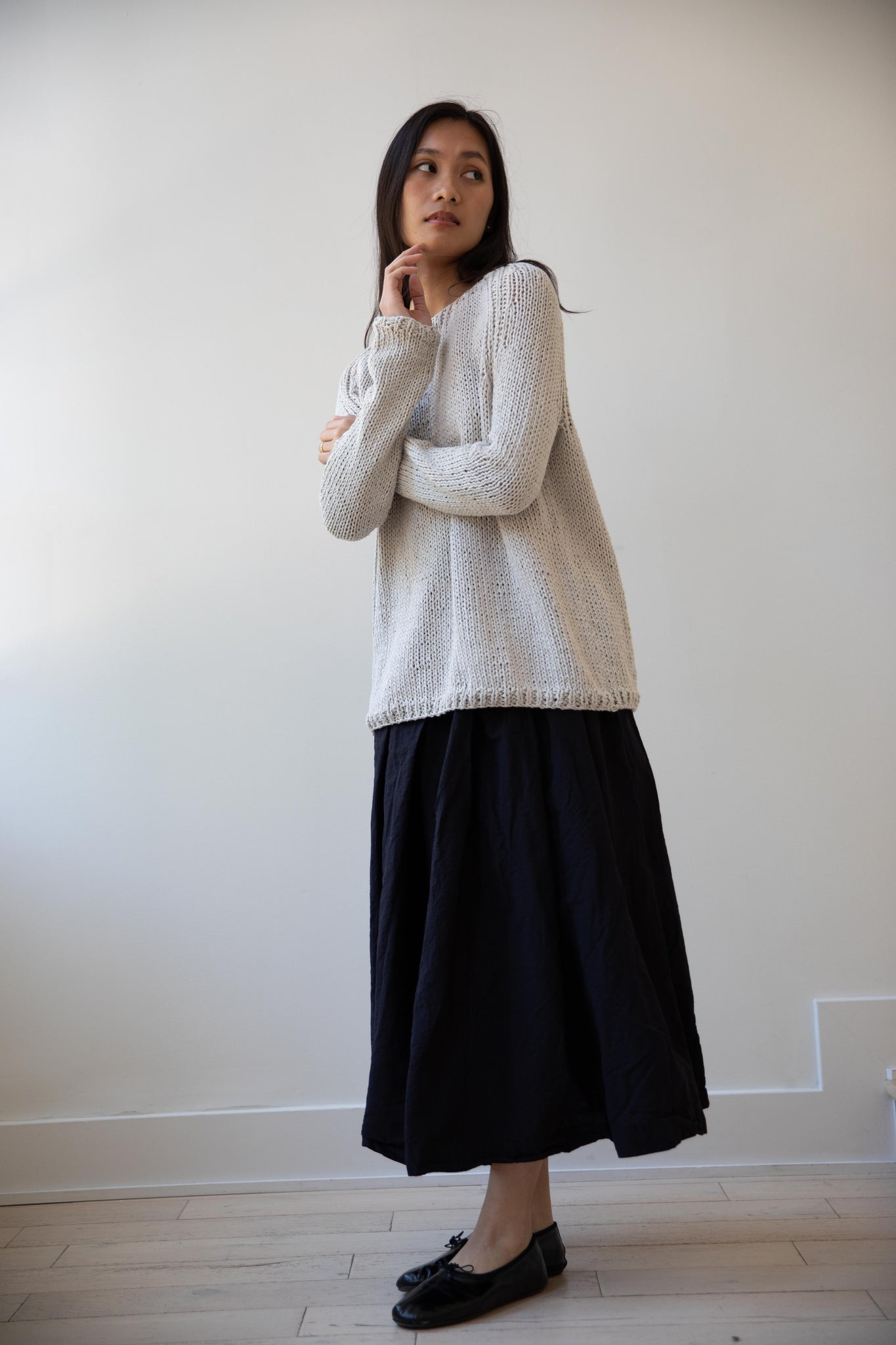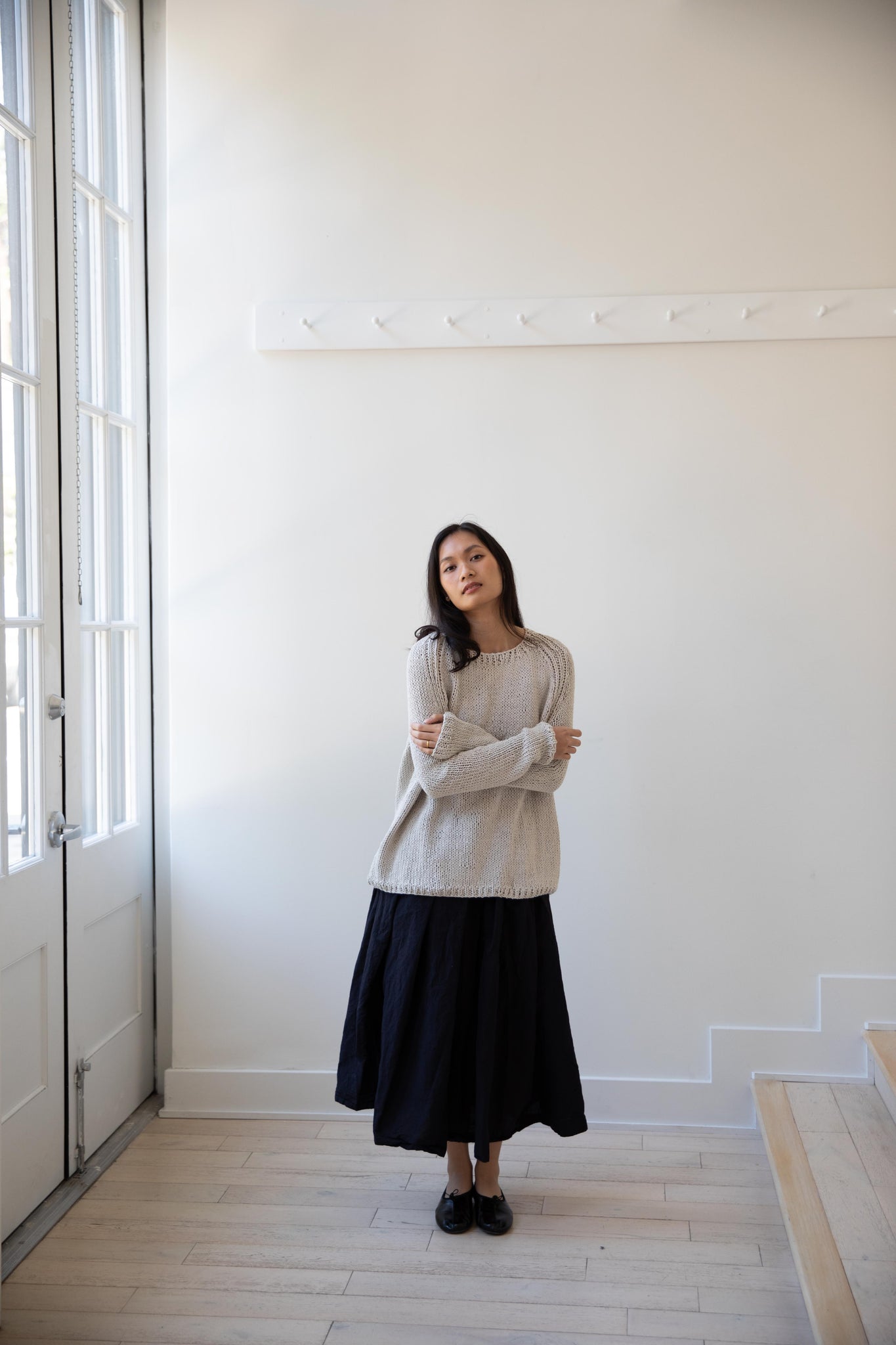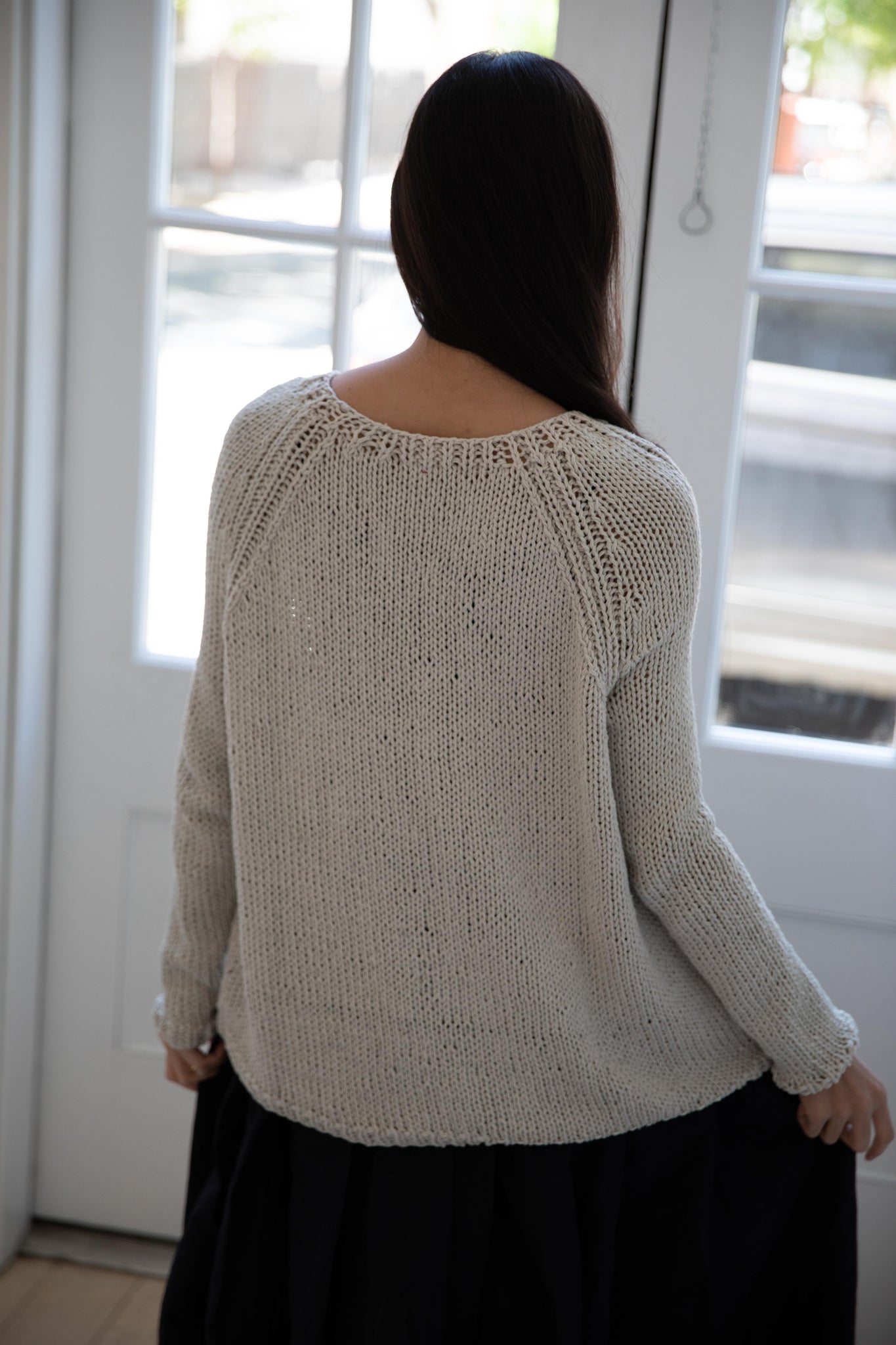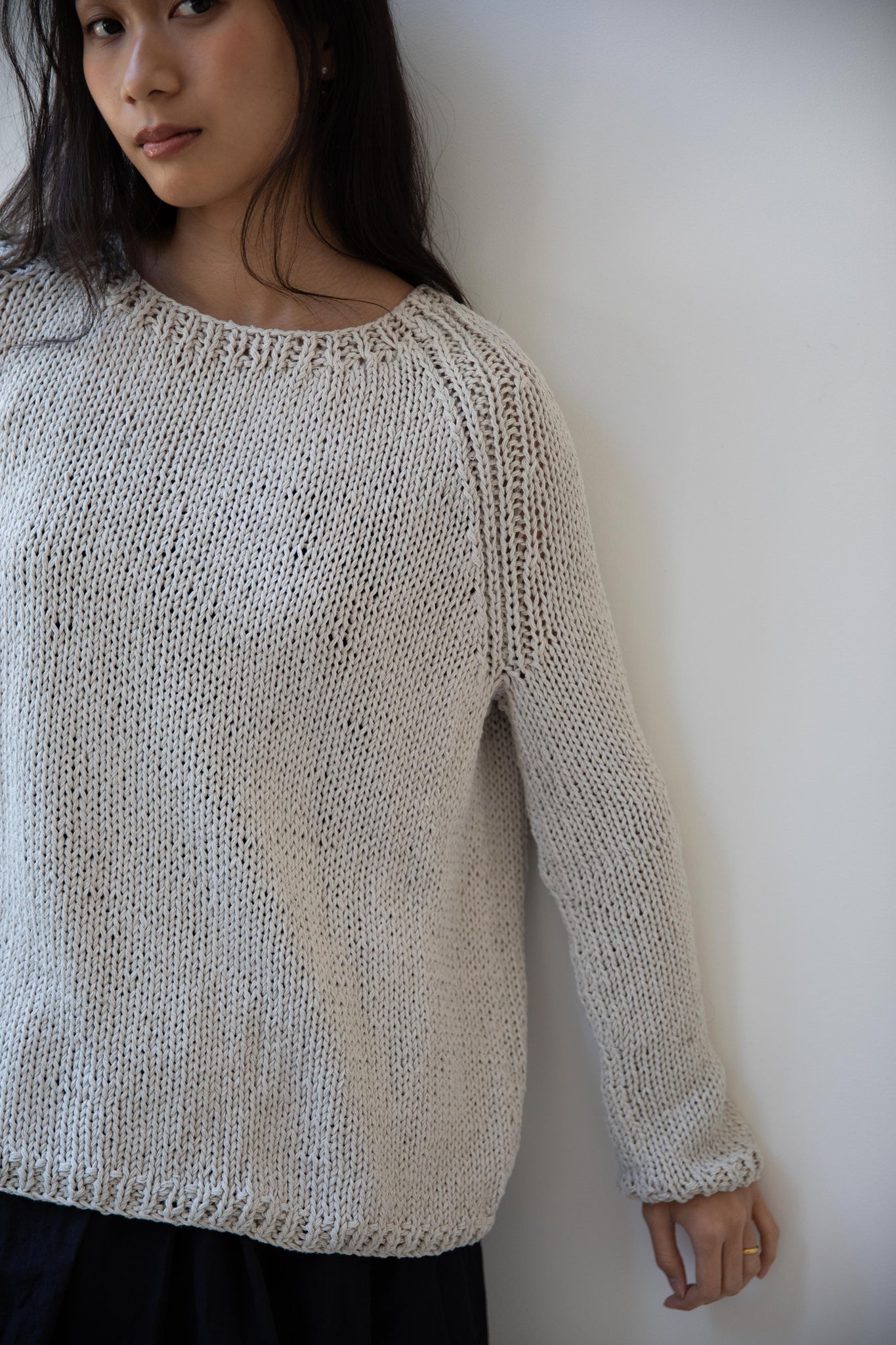 This loose knit raw silk pullover is an ideal piece to layer throughout the year. Made from a nubby and textured yarn, the oversized fit combined with the drapey quality of the textile makes for a great sweater to combine with a skirt in the warmer season. The off white color has a grey misty hue.