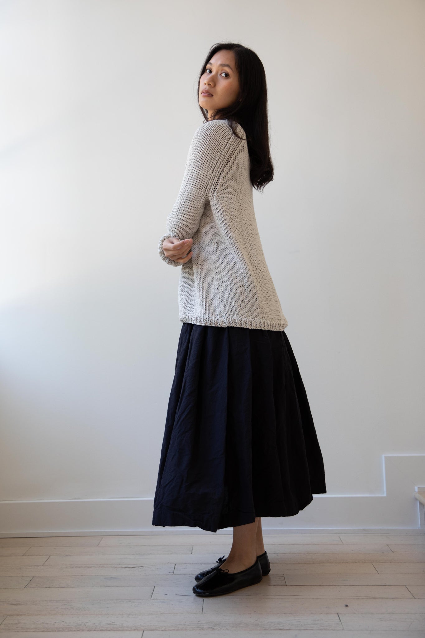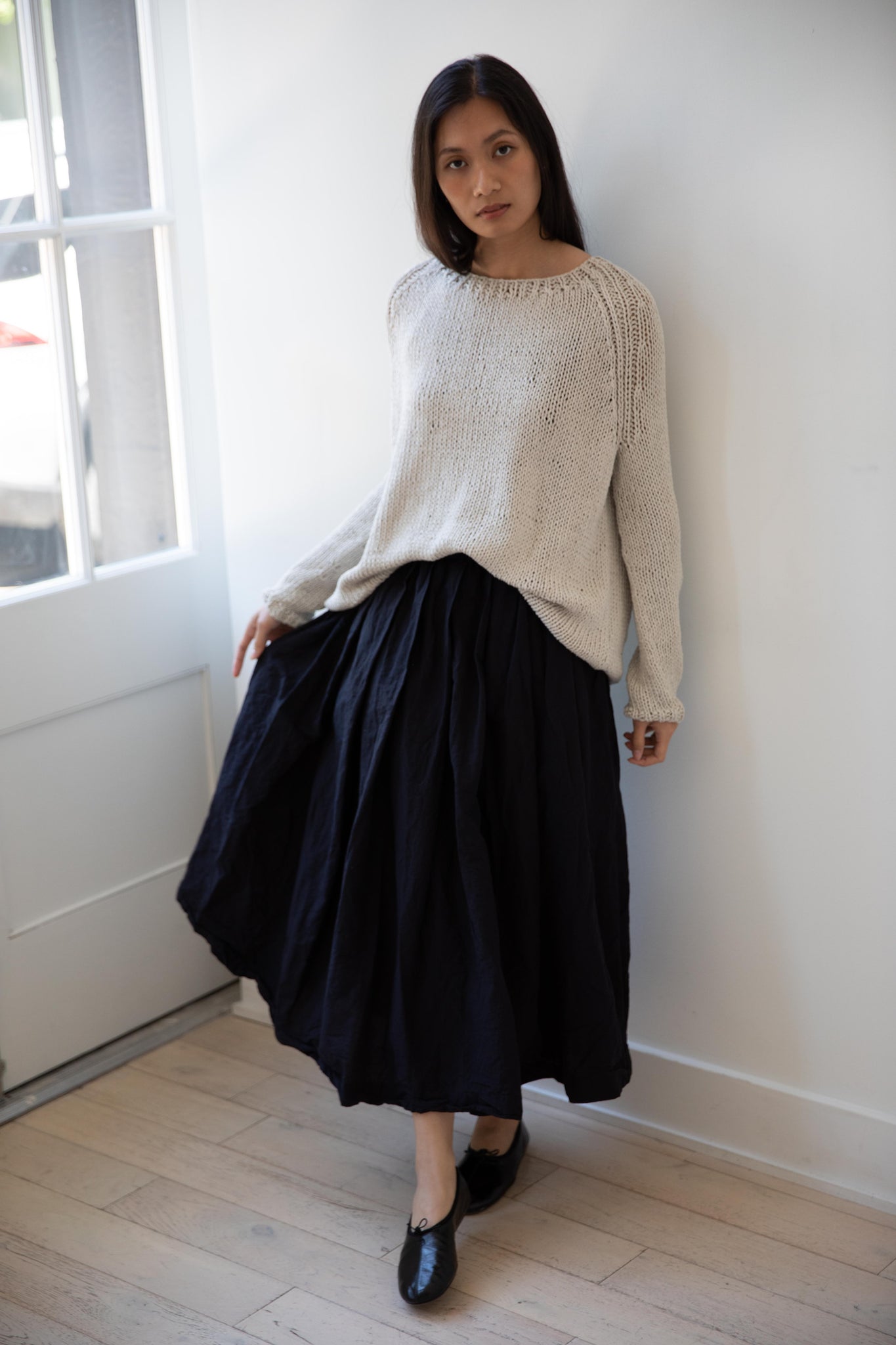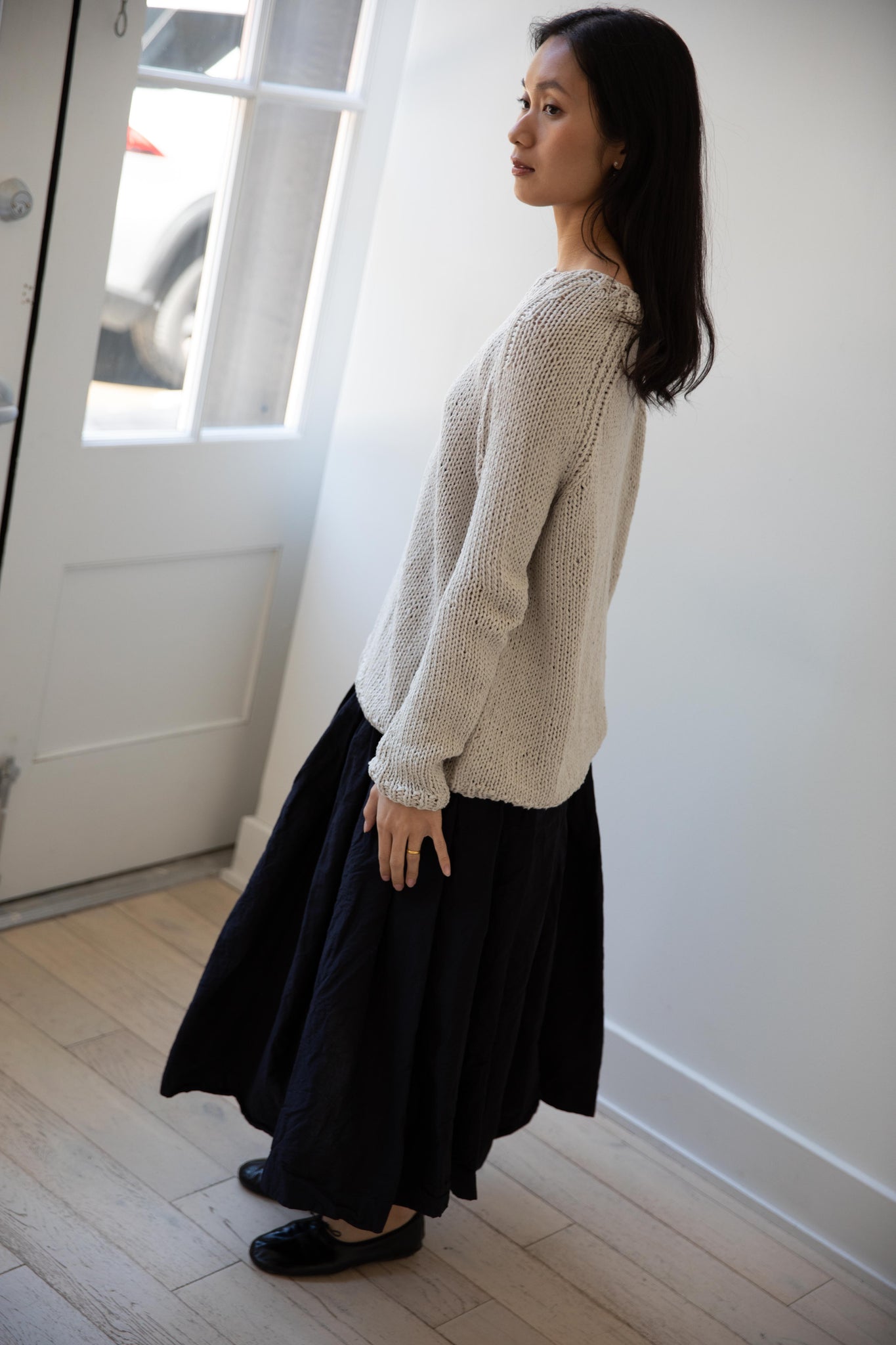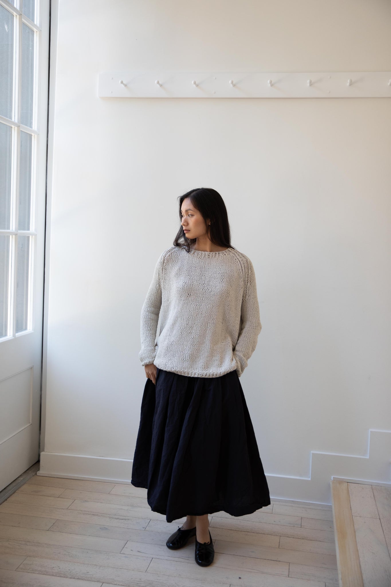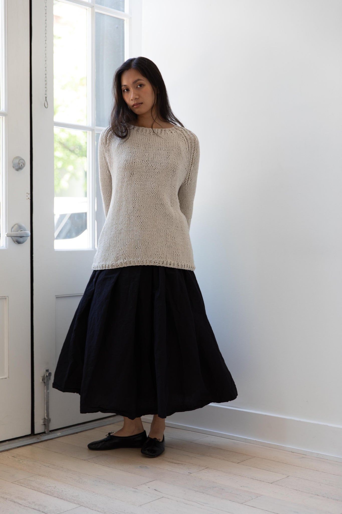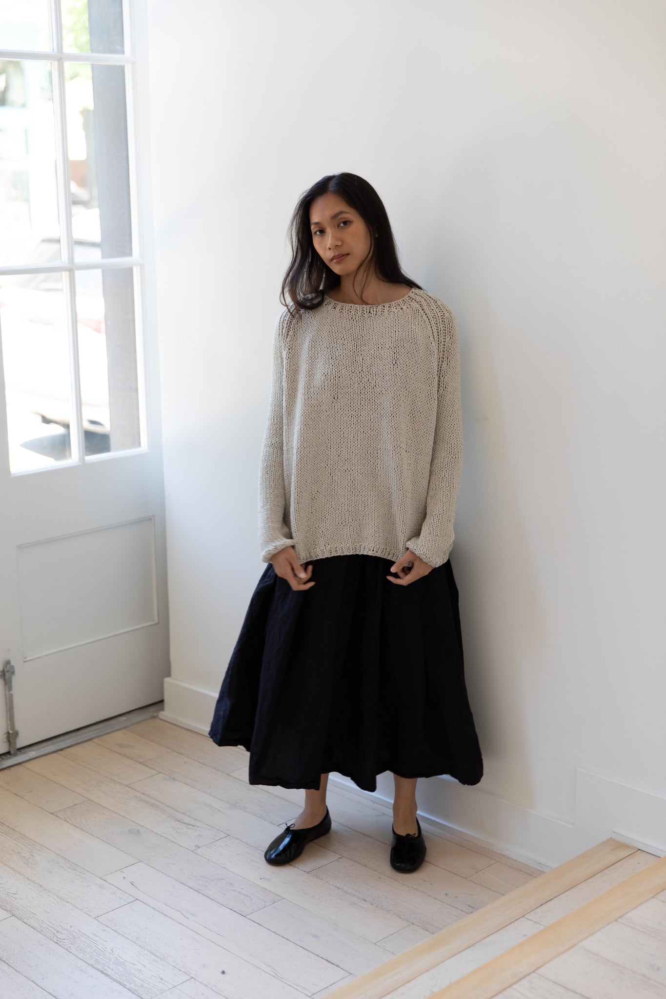 This loose knit raw silk pullover is an ideal piece to layer throughout the year. Made from a nubby and textured yarn, the oversized fit combined with the drapey quality of the textile makes for a great sweater to combine with a skirt in the warmer season. The off white color has a grey misty hue.