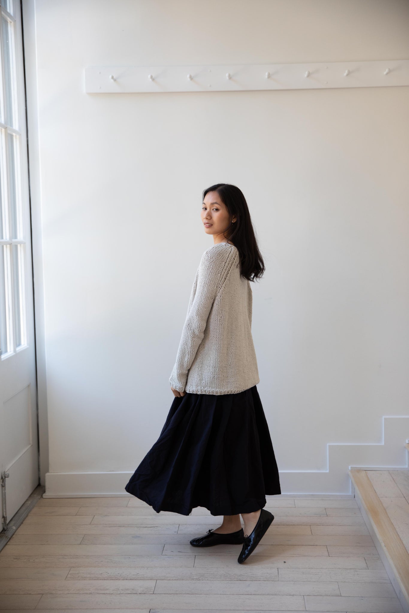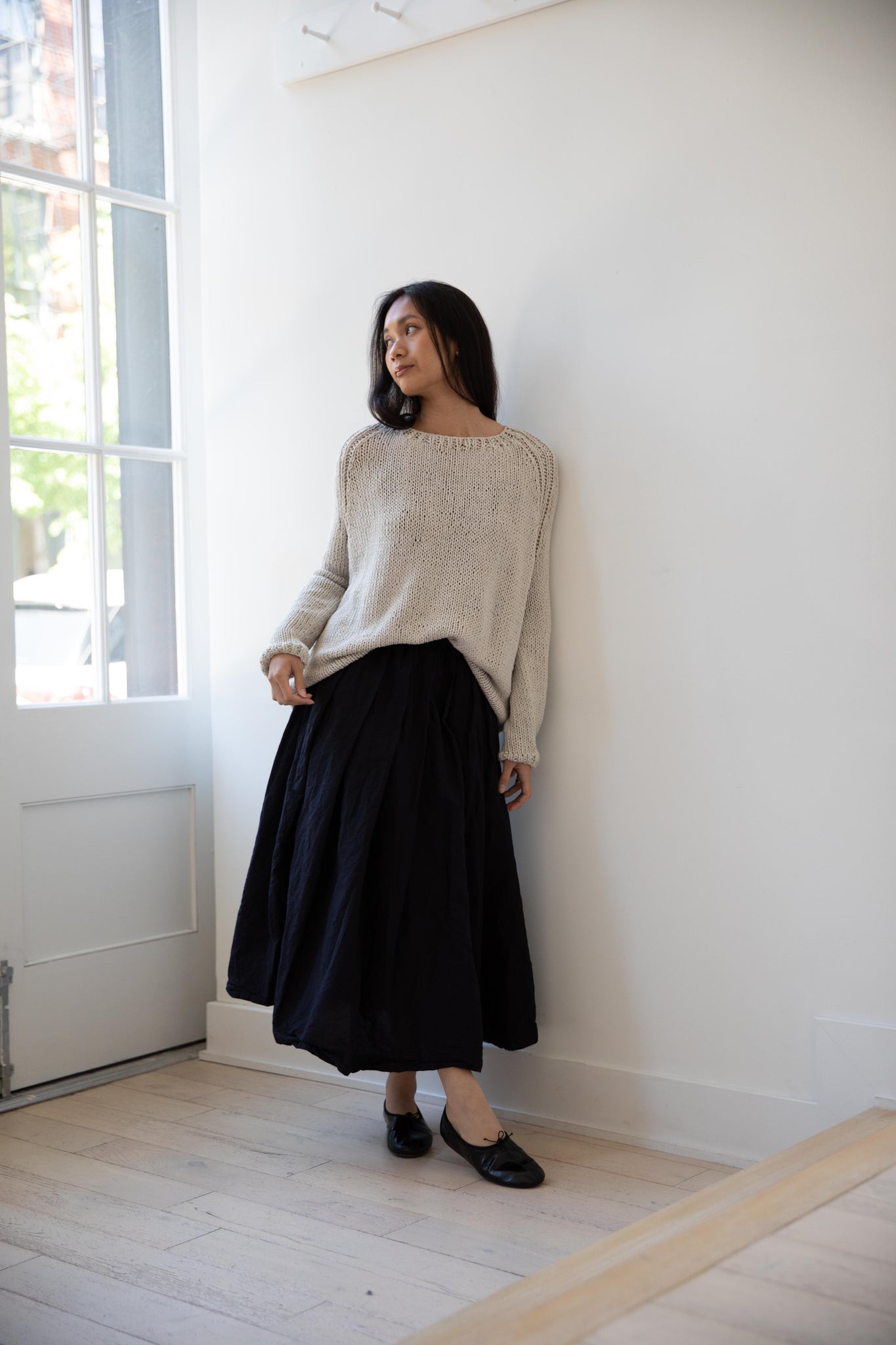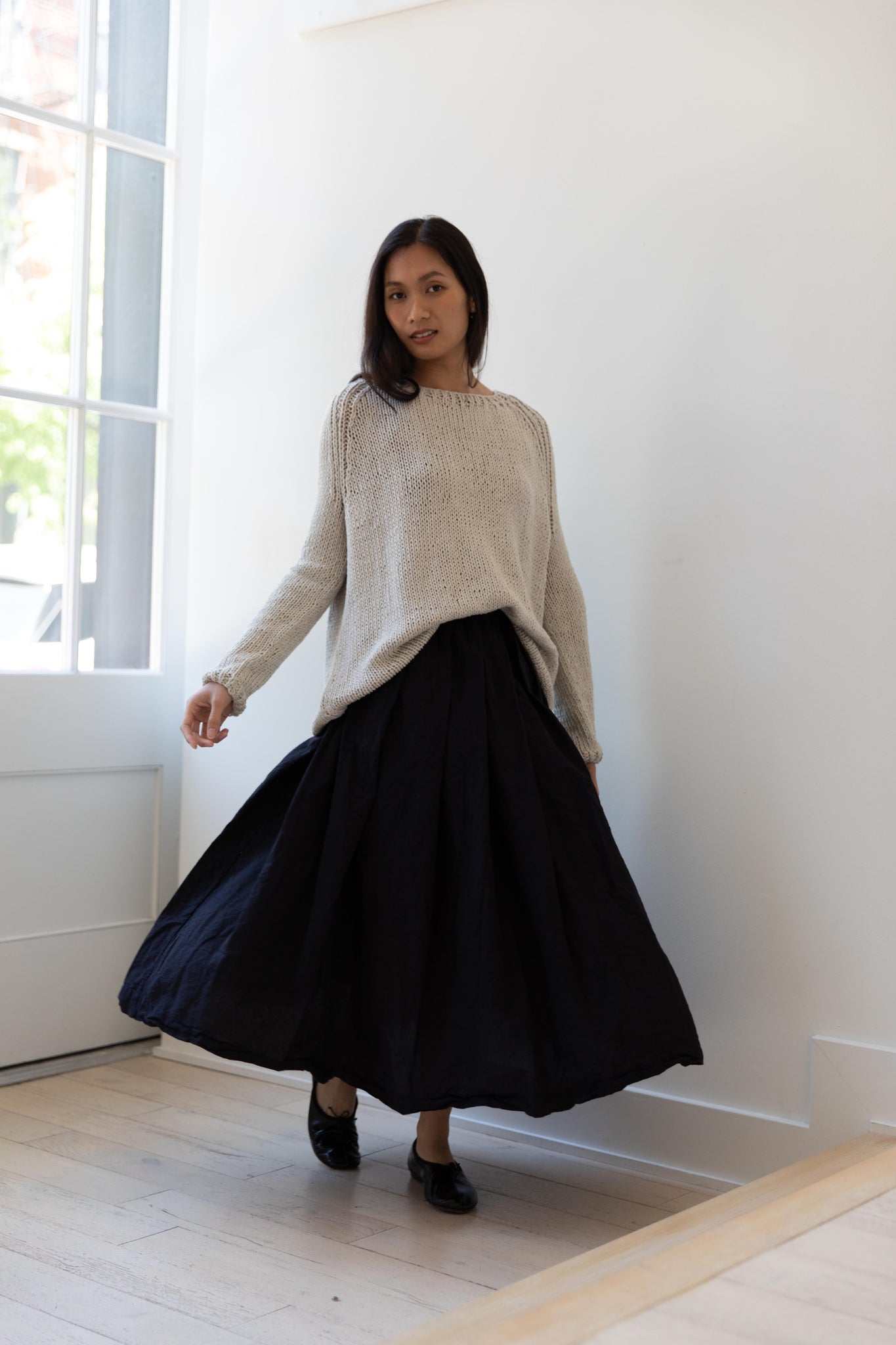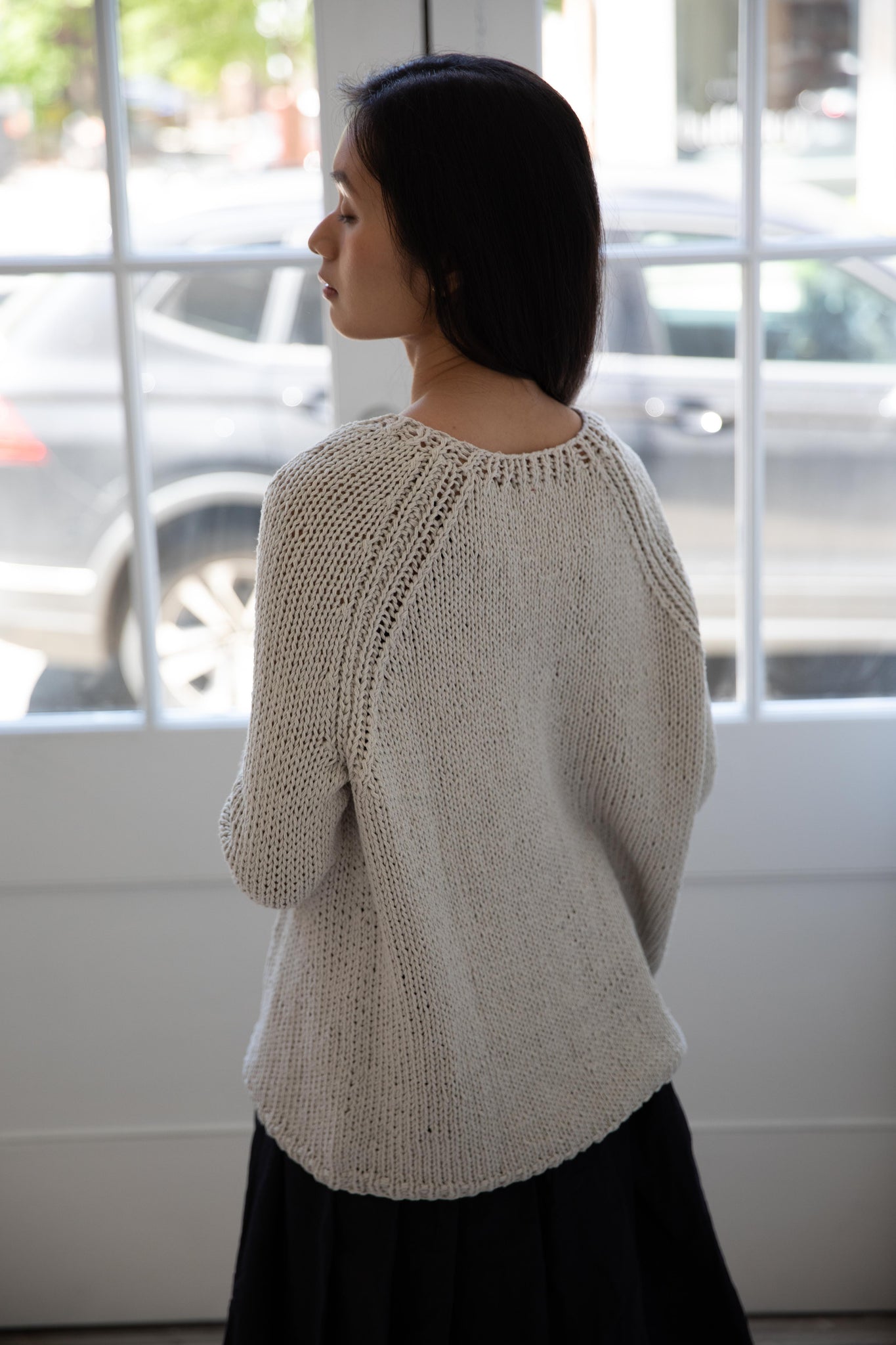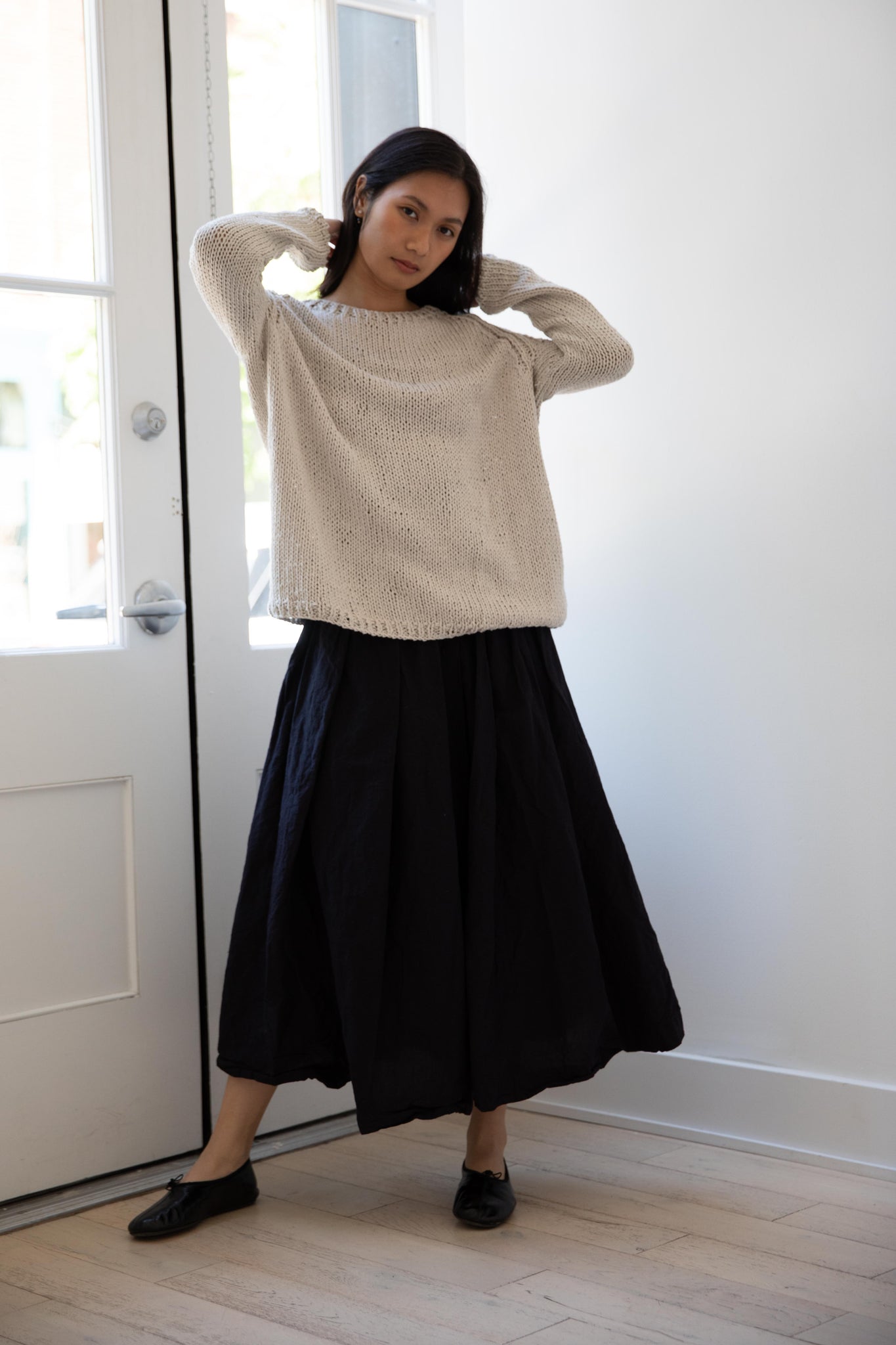 This loose knit raw silk pullover is an ideal piece to layer throughout the year. Made from a nubby and textured yarn, the oversized fit combined with the drapey quality of the textile makes for a great sweater to combine with a skirt in the warmer season. The off white color has a grey misty hue.