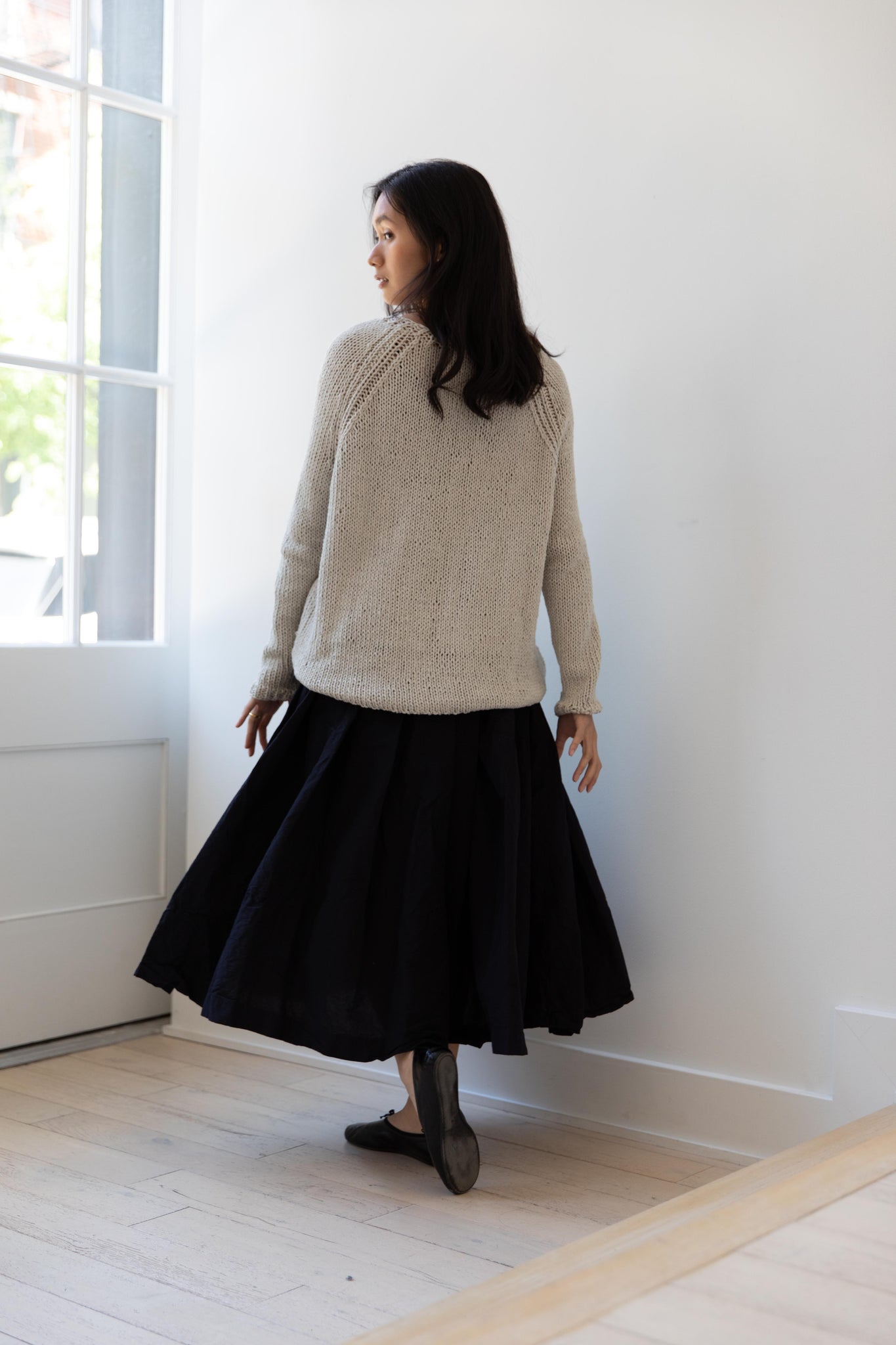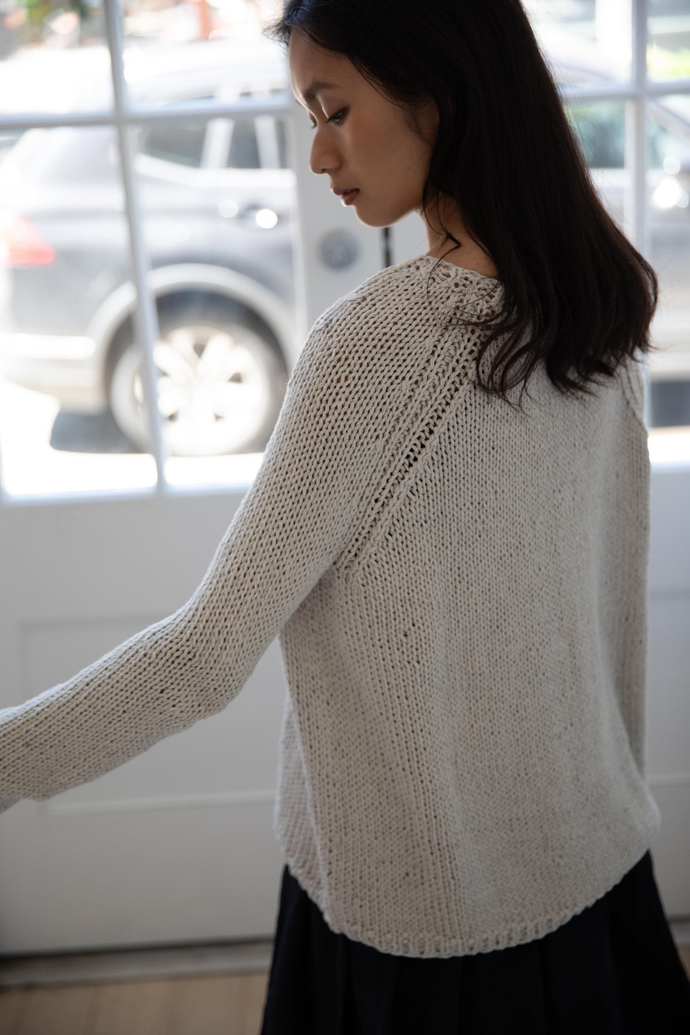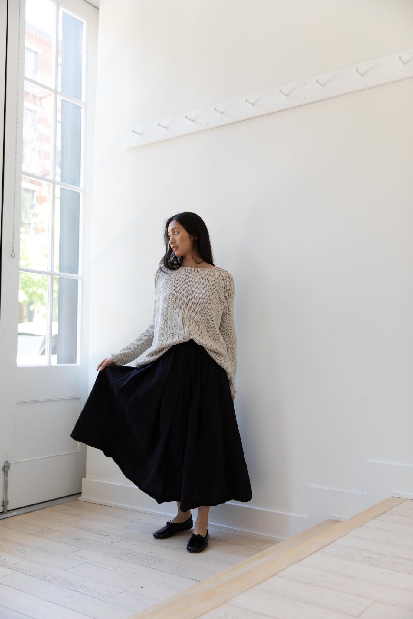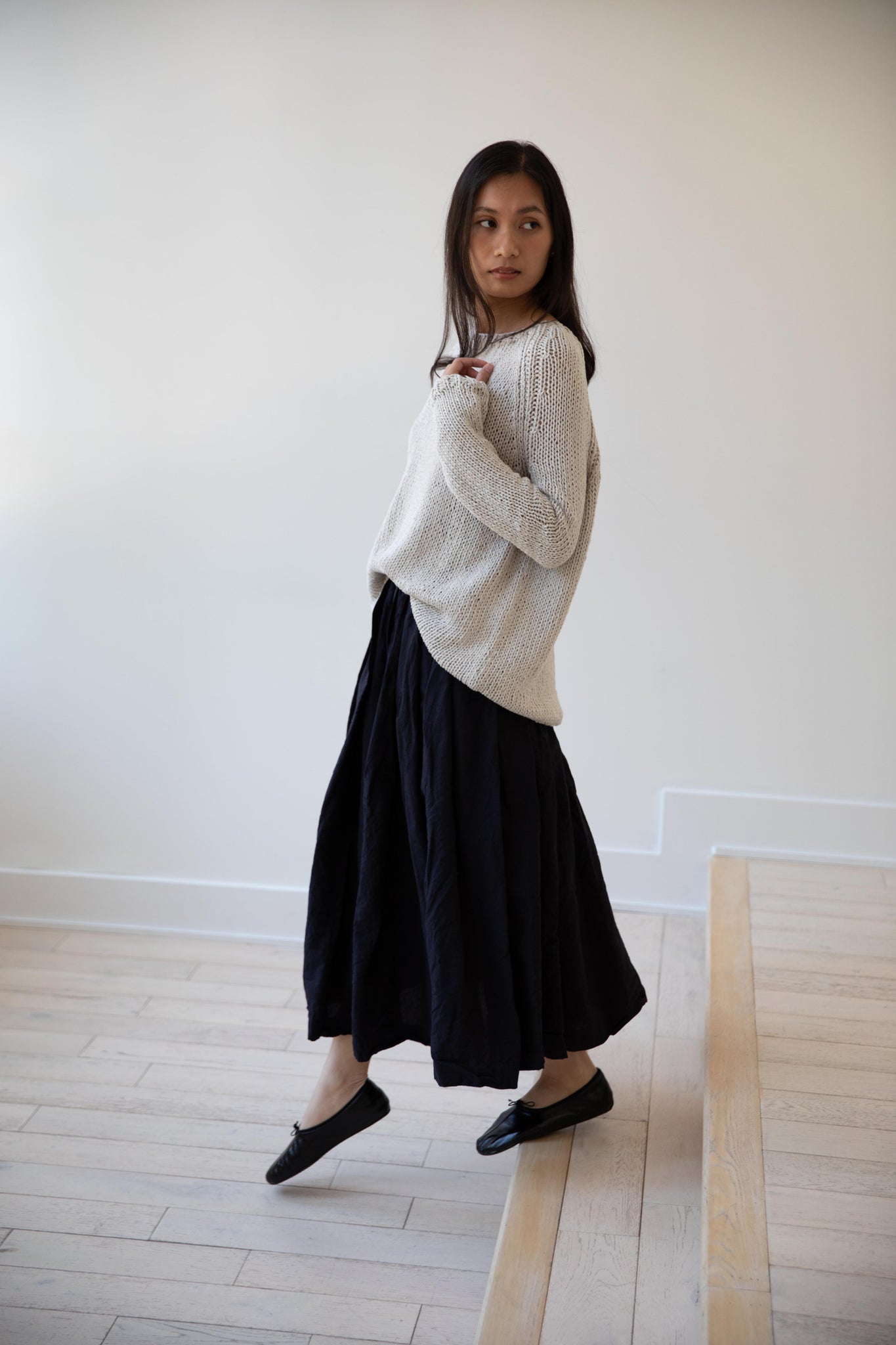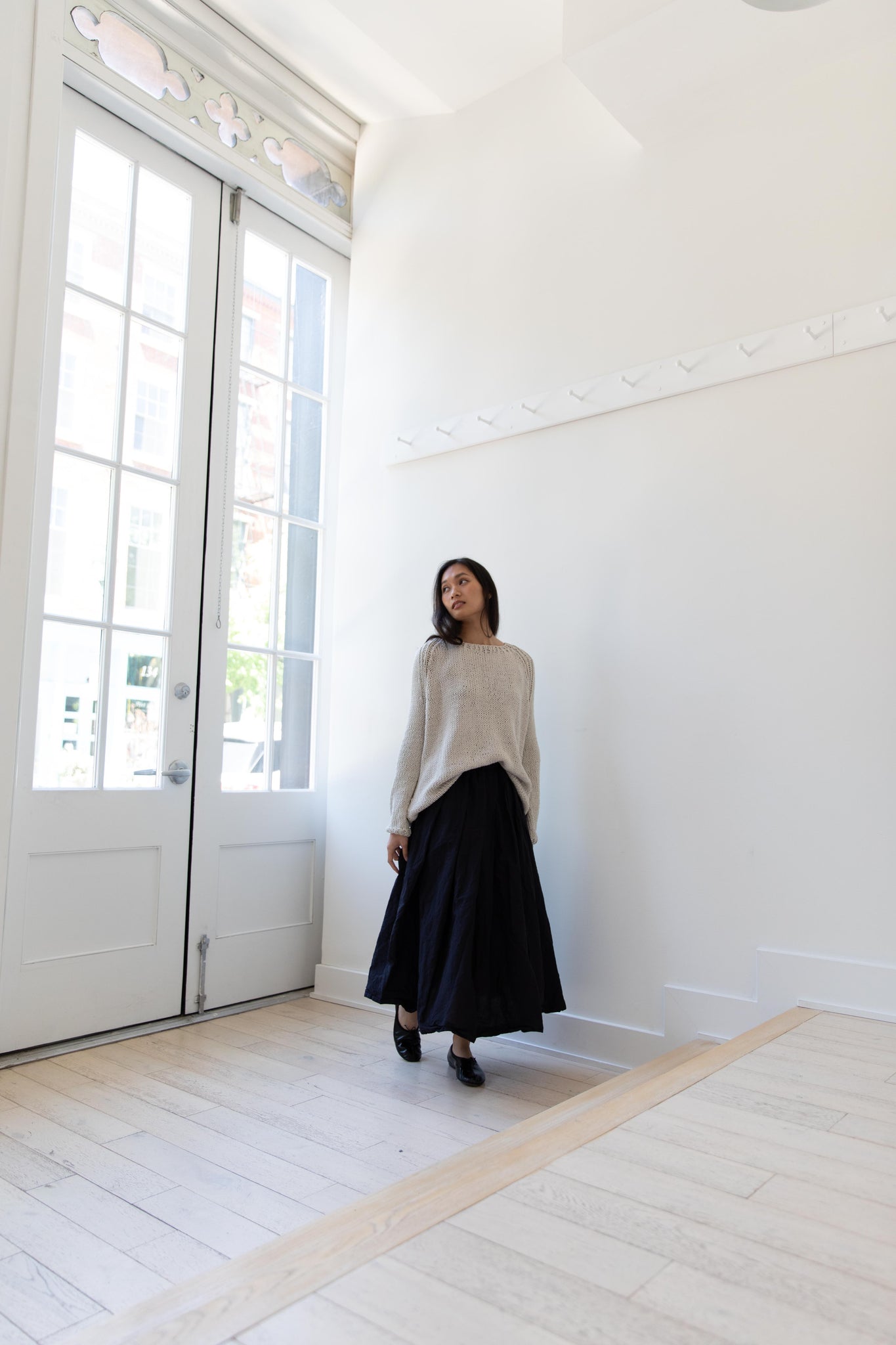 This loose knit raw silk pullover is an ideal piece to layer throughout the year. Made from a nubby and textured yarn, the oversized fit combined with the drapey quality of the textile makes for a great sweater to combine with a skirt in the warmer season. The off white color has a grey misty hue.