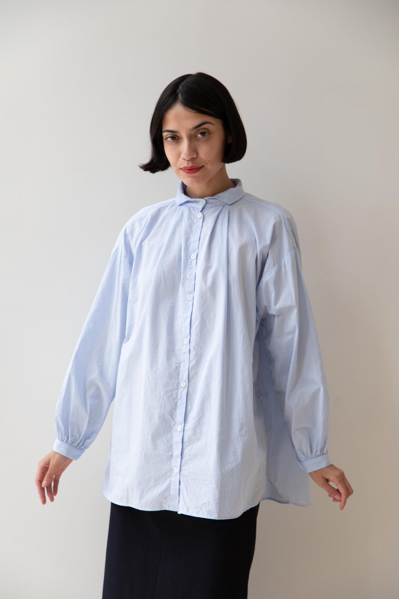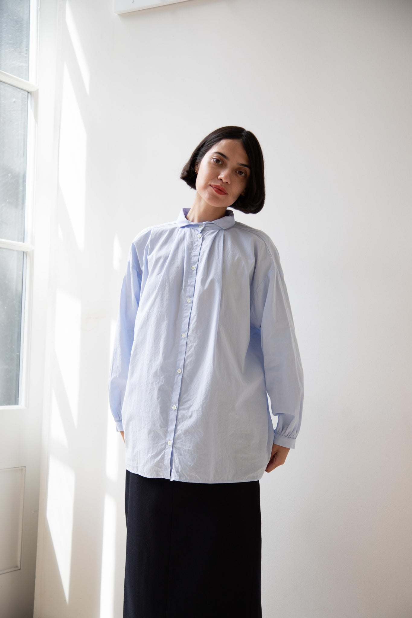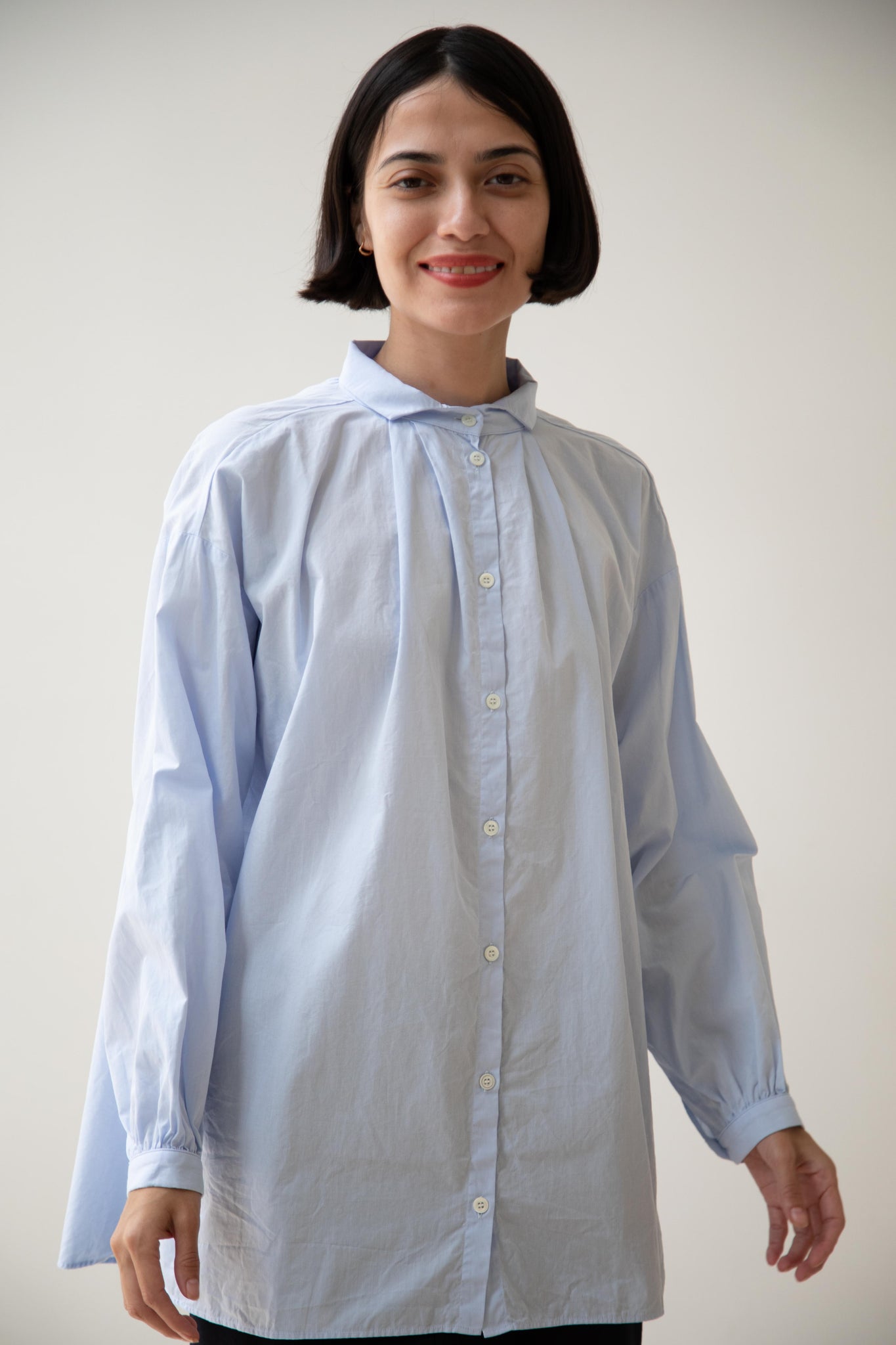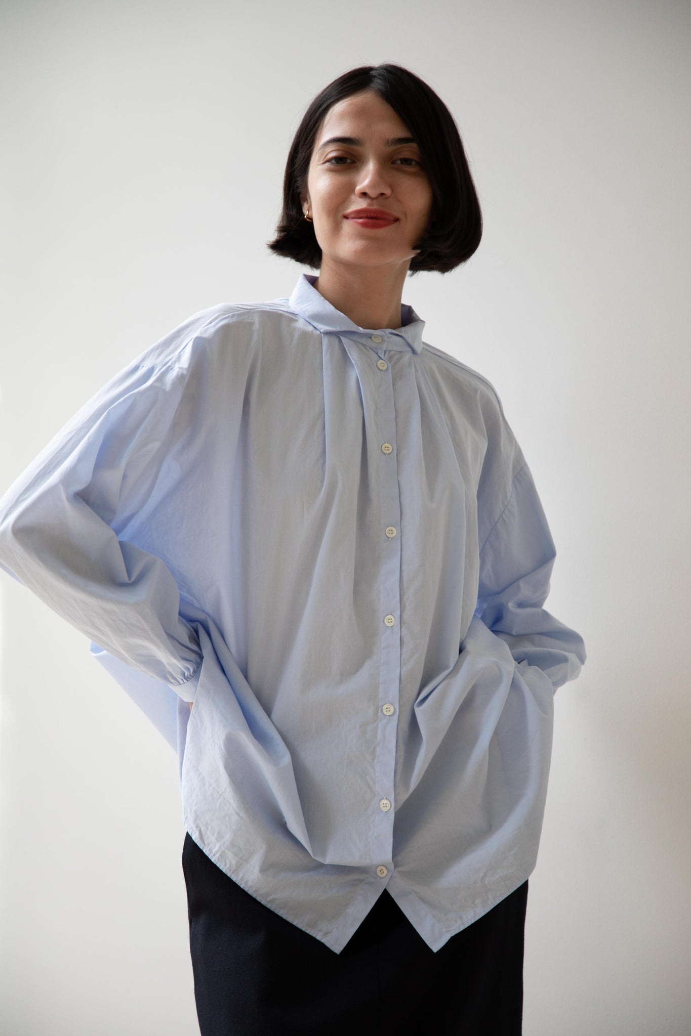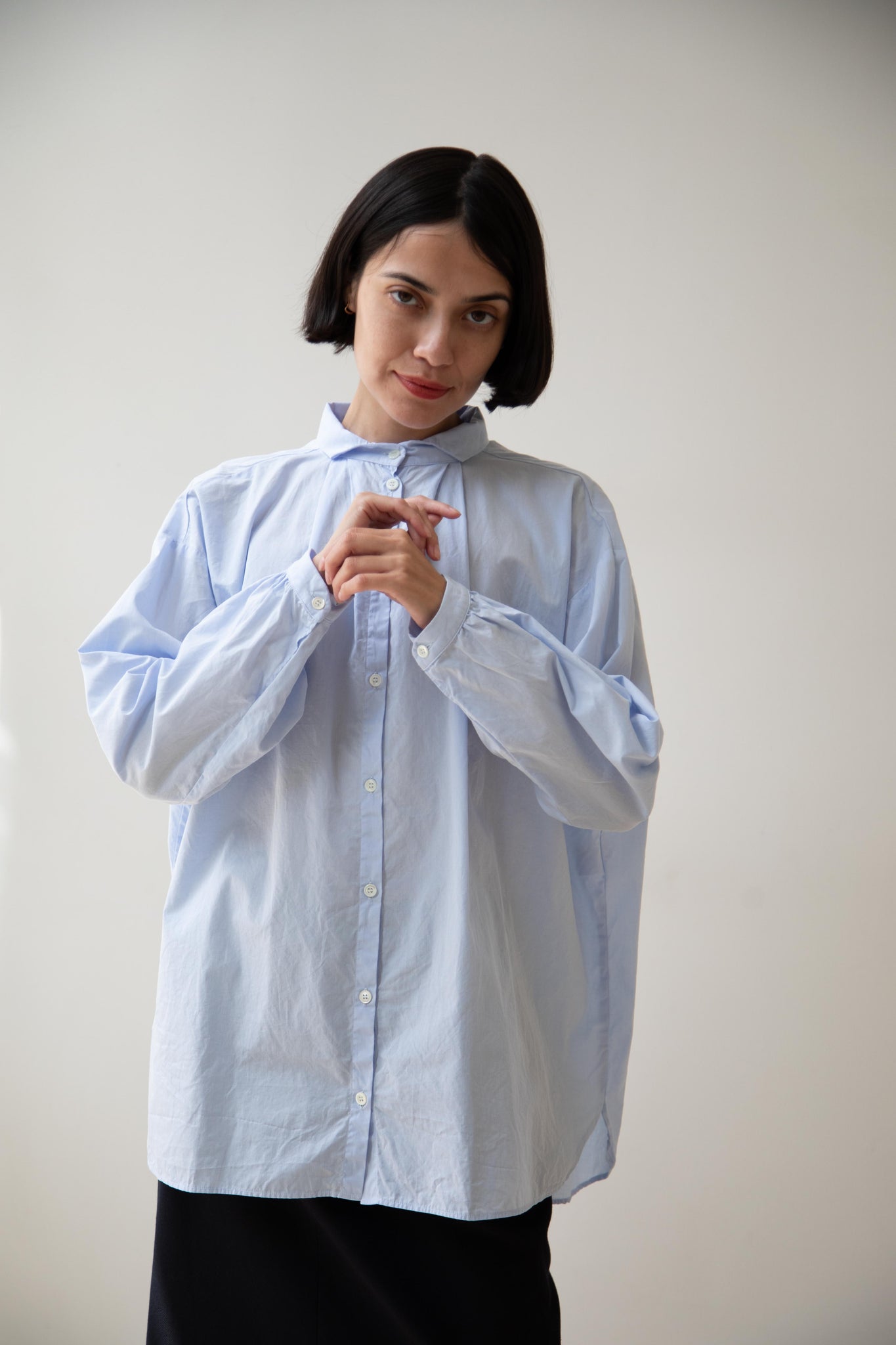 This top is so lovely and an instant spring classic with an easy, slightly oversized shape through the body. We love that this is a slightly different take on the classic button-down top. Made from cotton poplin, it gathers around the collar and the sleeve giving it a slight balloon to its shape. It looks great with skirts, pants, and dresses!