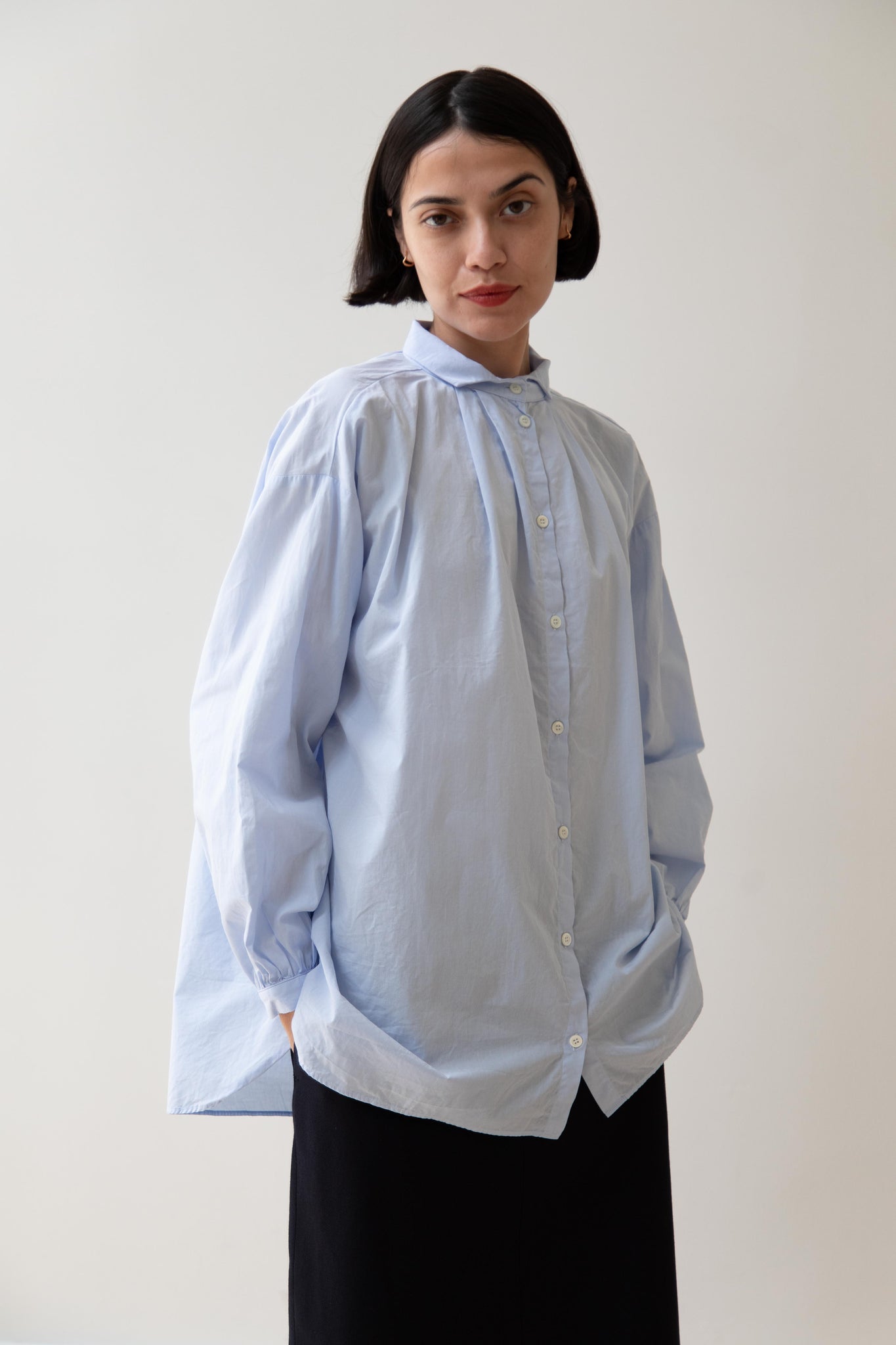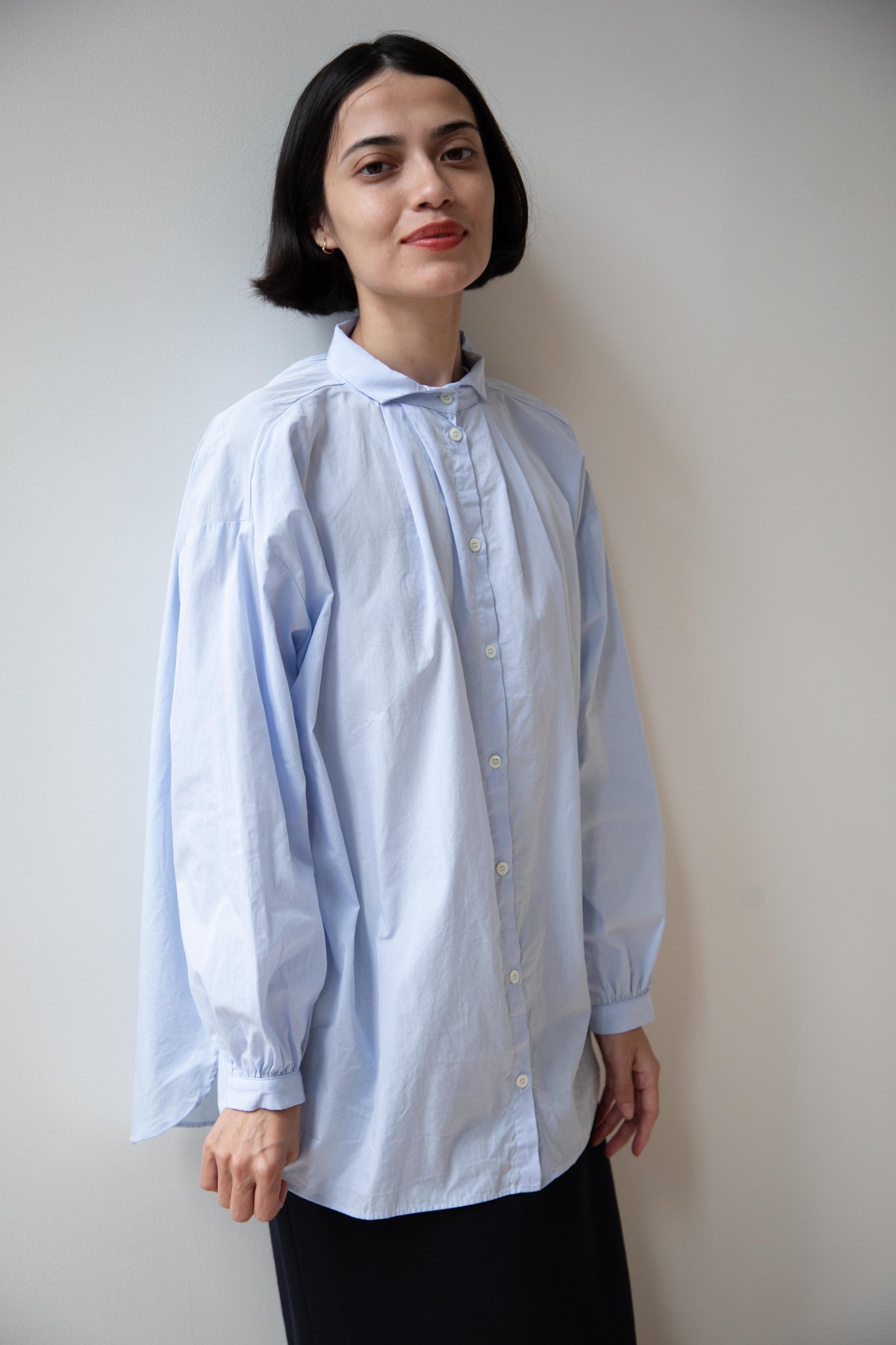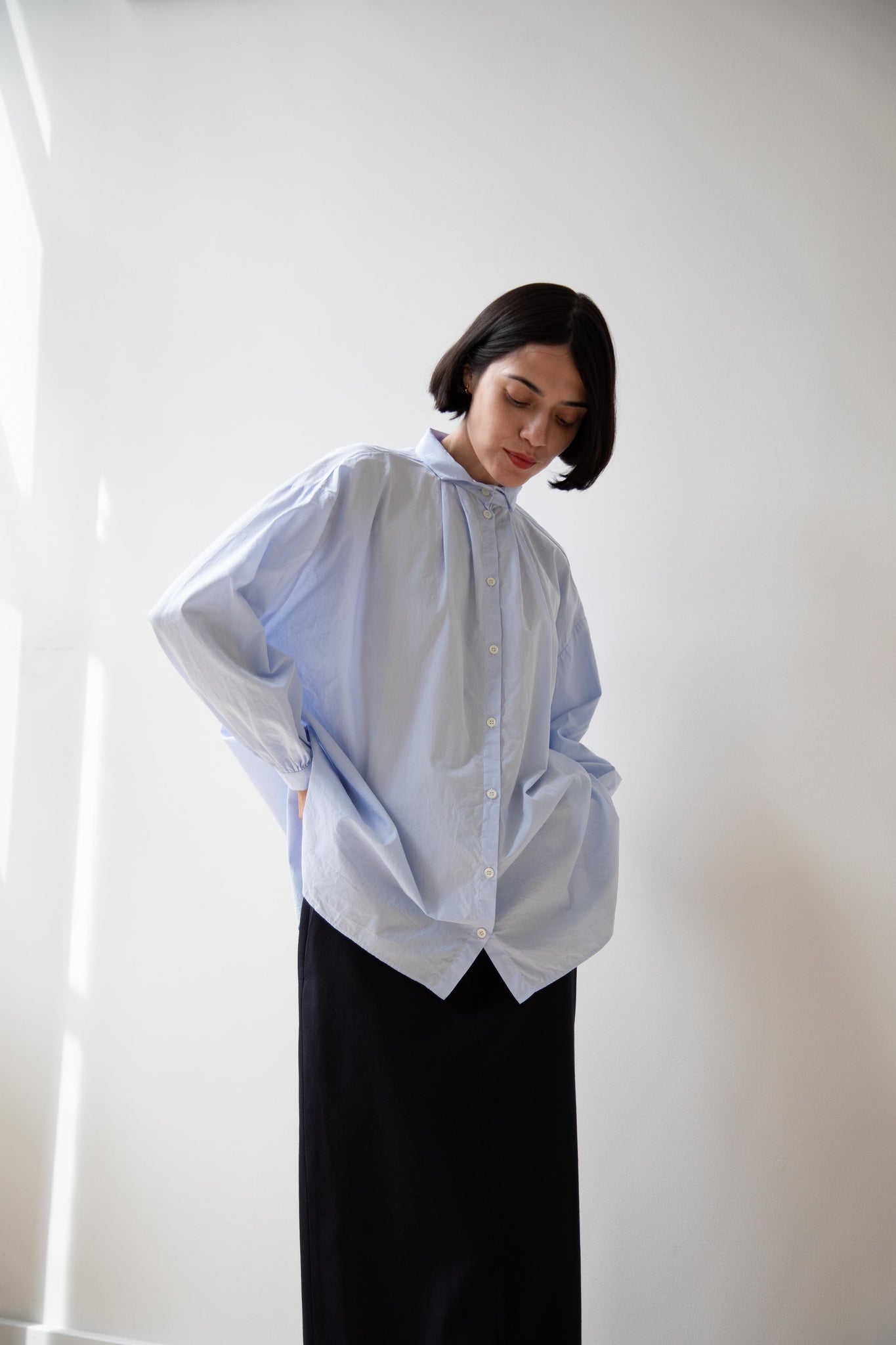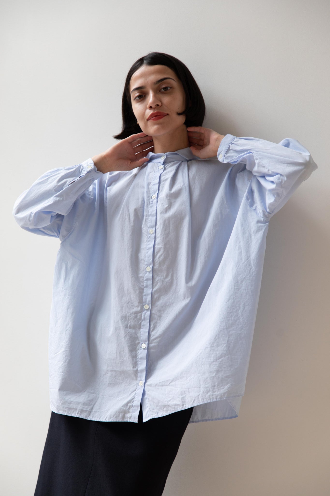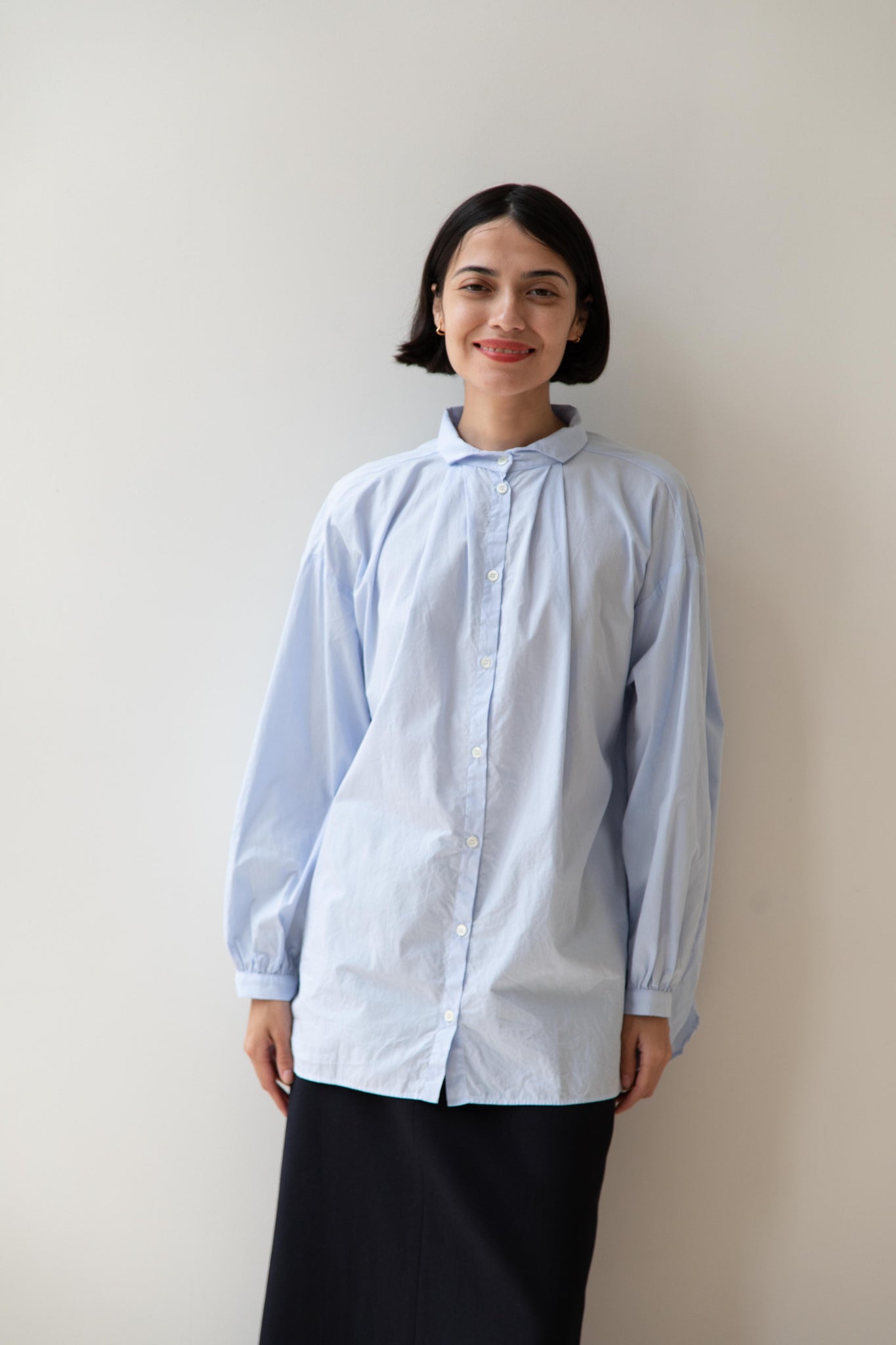 This top is so lovely and an instant spring classic with an easy, slightly oversized shape through the body. We love that this is a slightly different take on the classic button-down top. Made from cotton poplin, it gathers around the collar and the sleeve giving it a slight balloon to its shape. It looks great with skirts, pants, and dresses!
