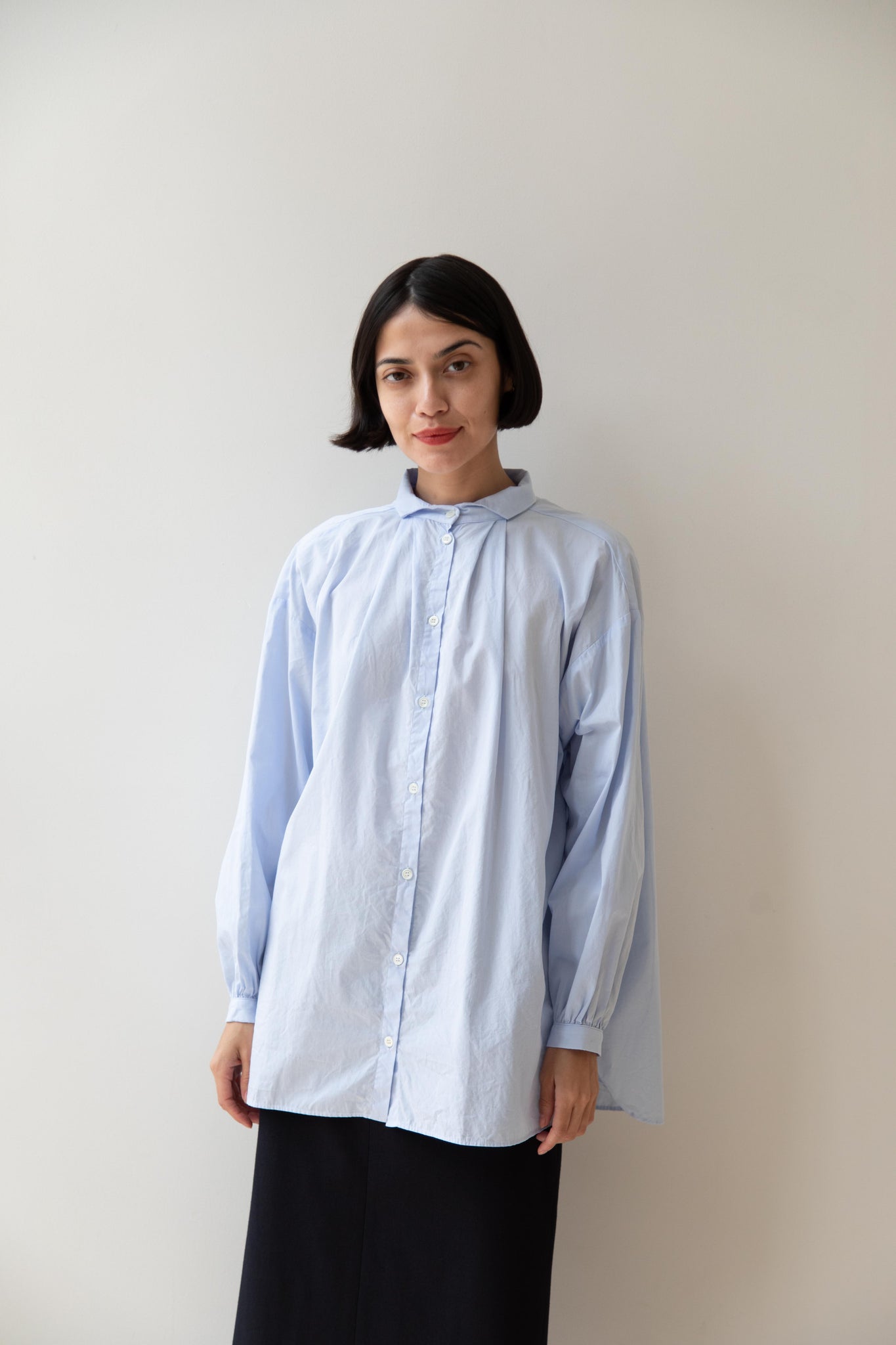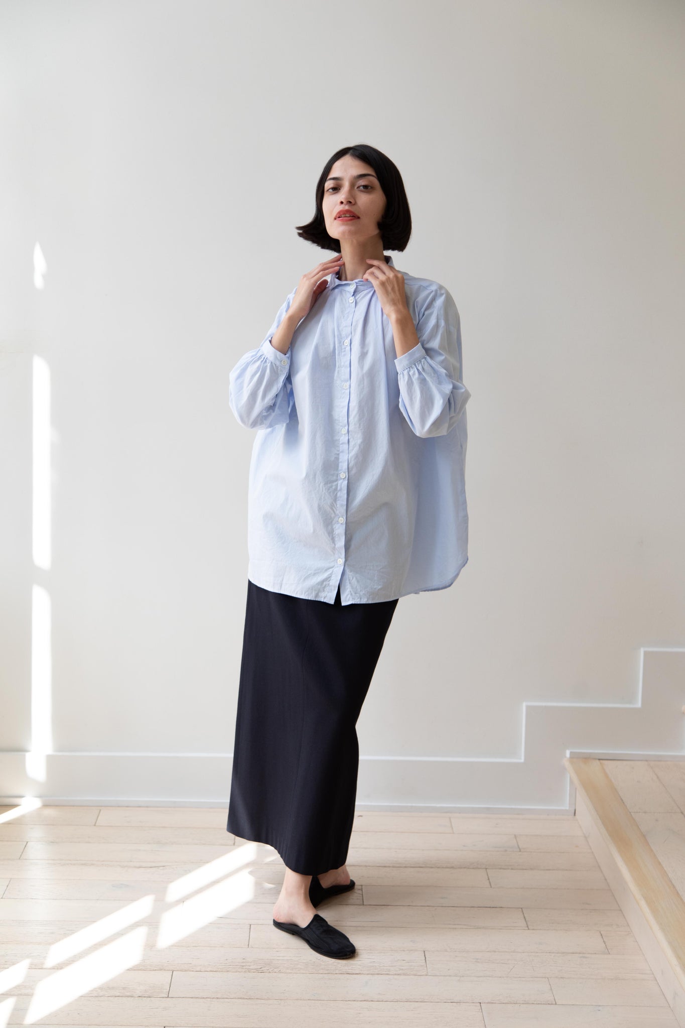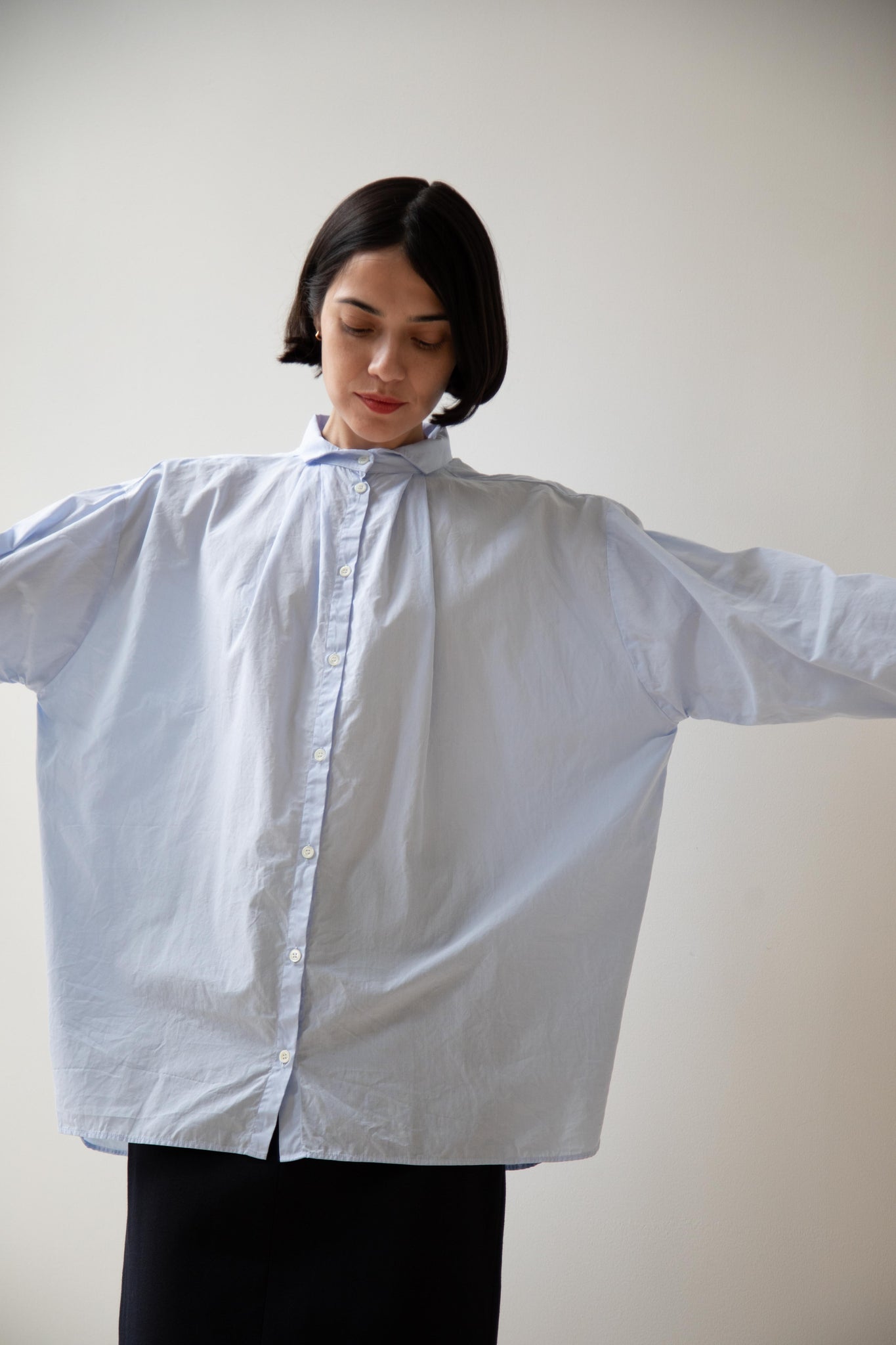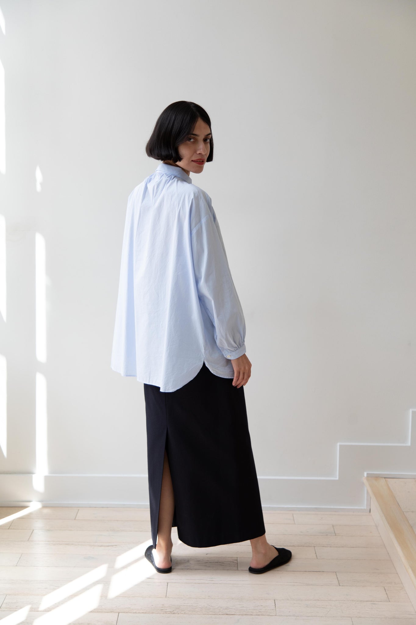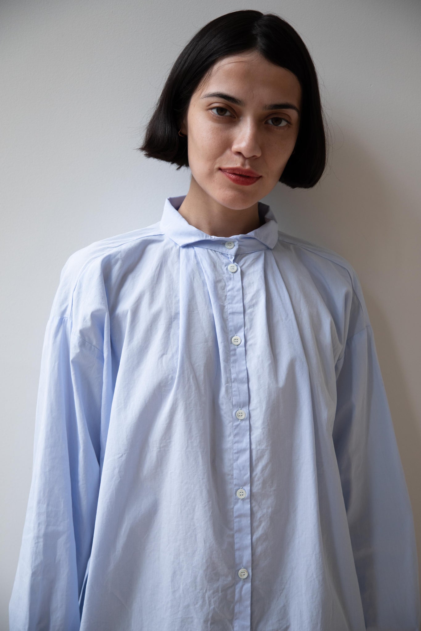 This top is so lovely and an instant spring classic with an easy, slightly oversized shape through the body. We love that this is a slightly different take on the classic button-down top. Made from cotton poplin, it gathers around the collar and the sleeve giving it a slight balloon to its shape. It looks great with skirts, pants, and dresses!
