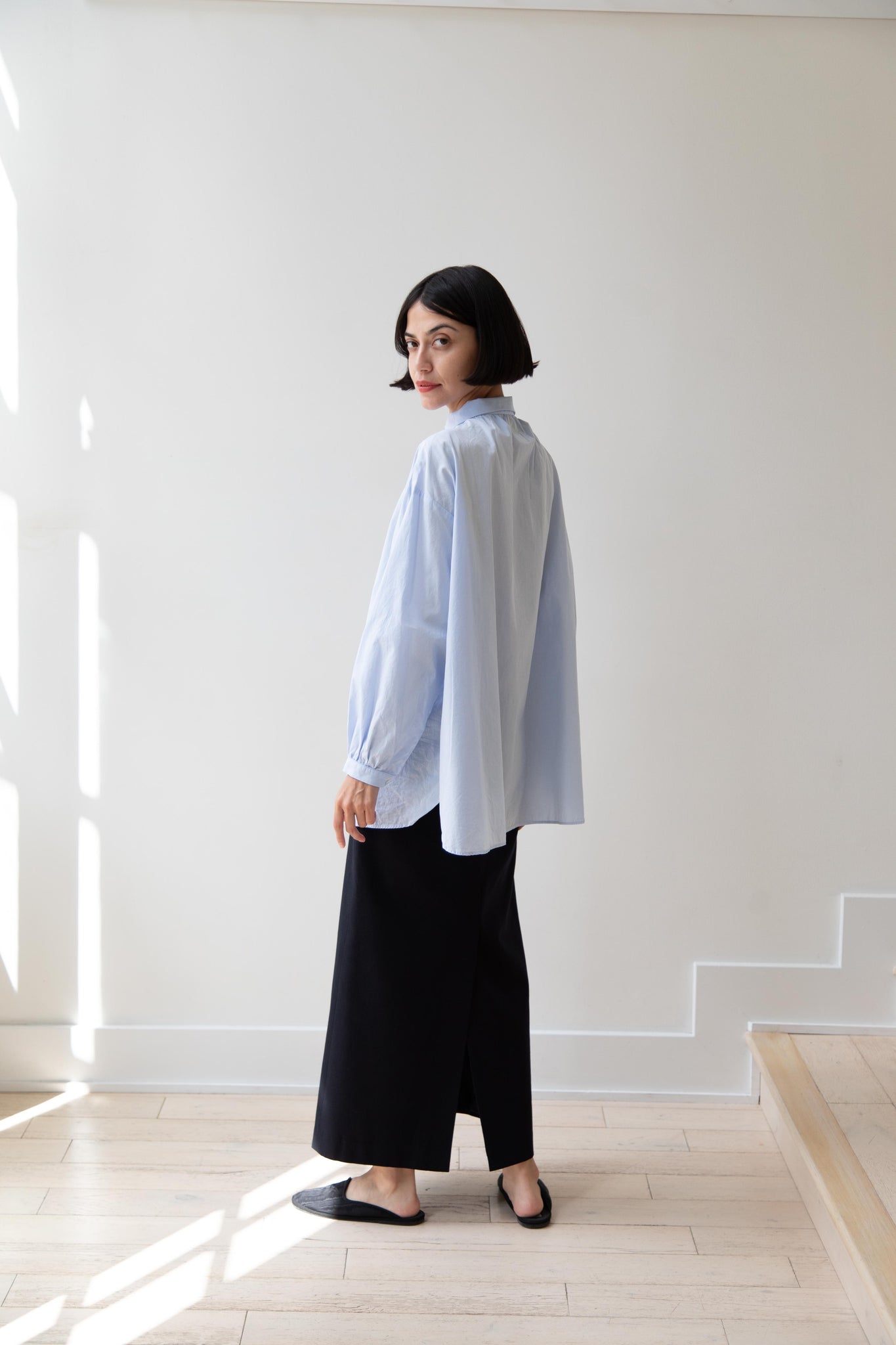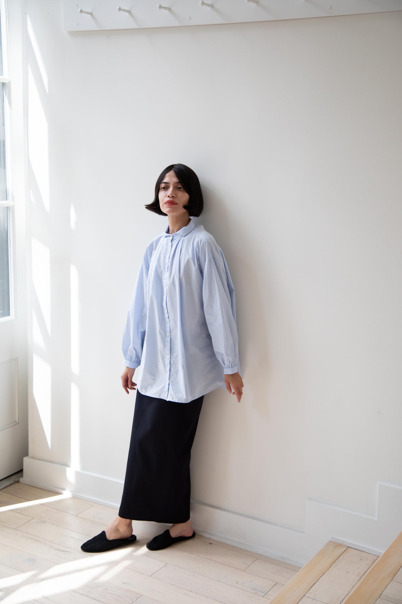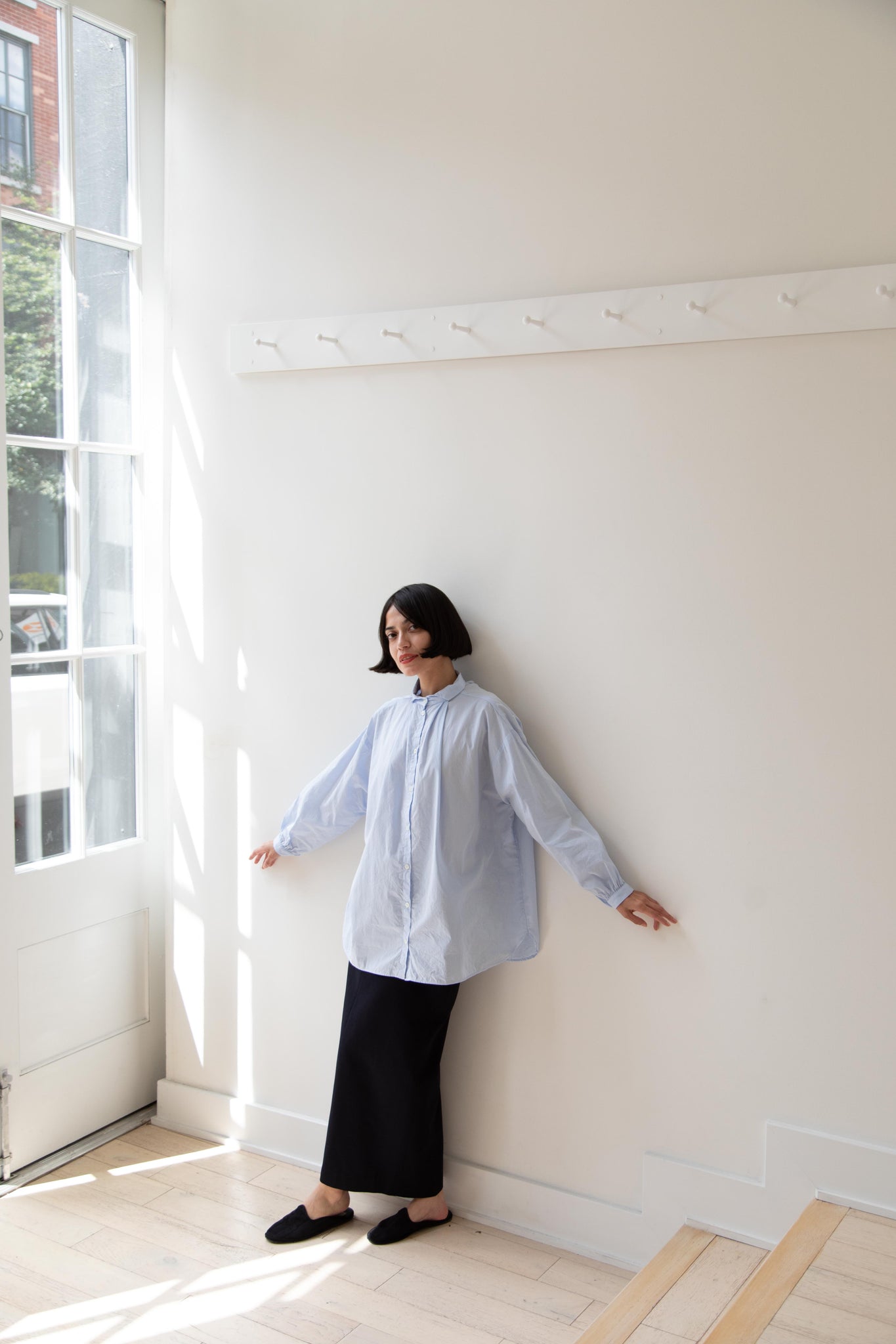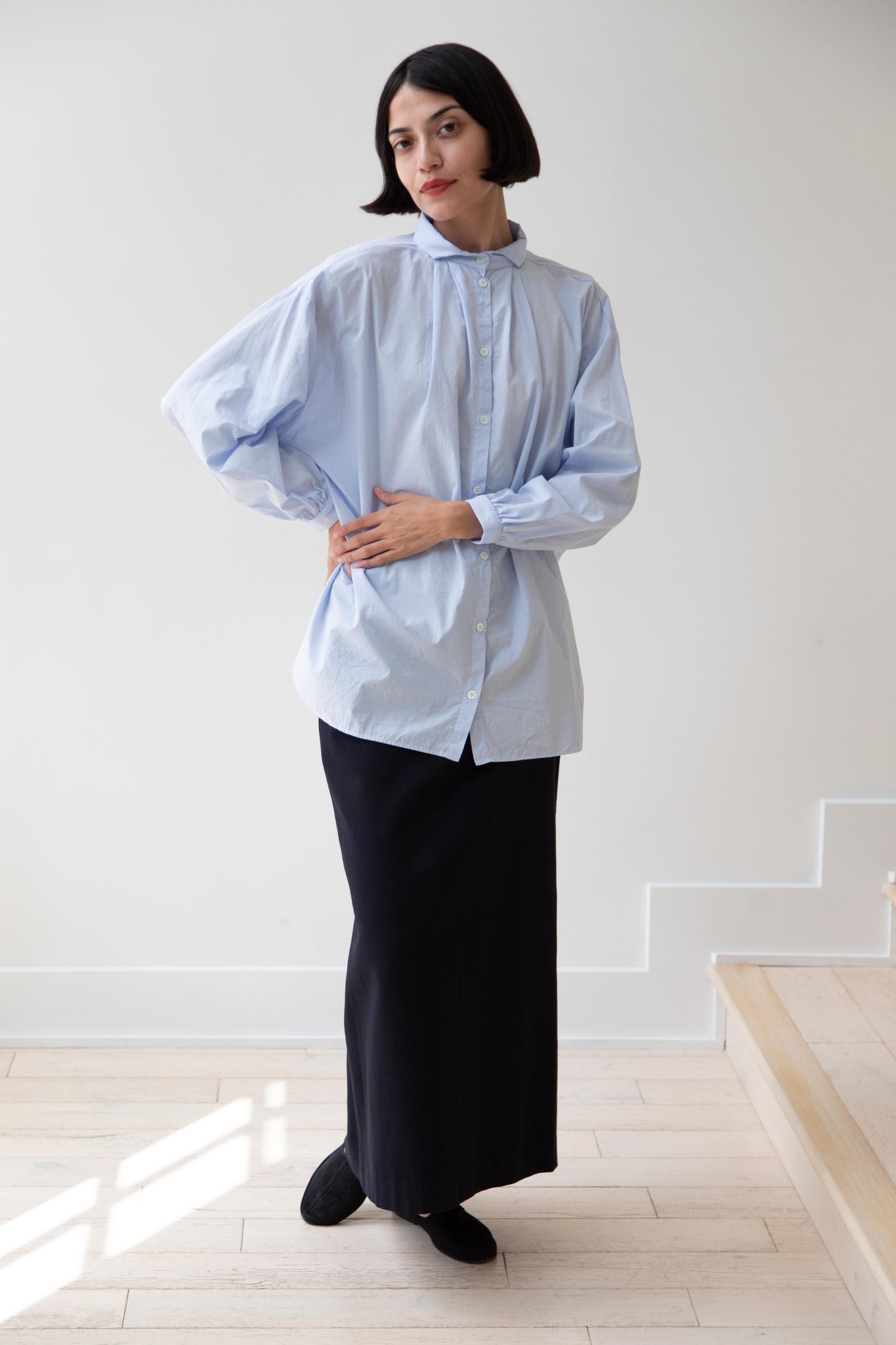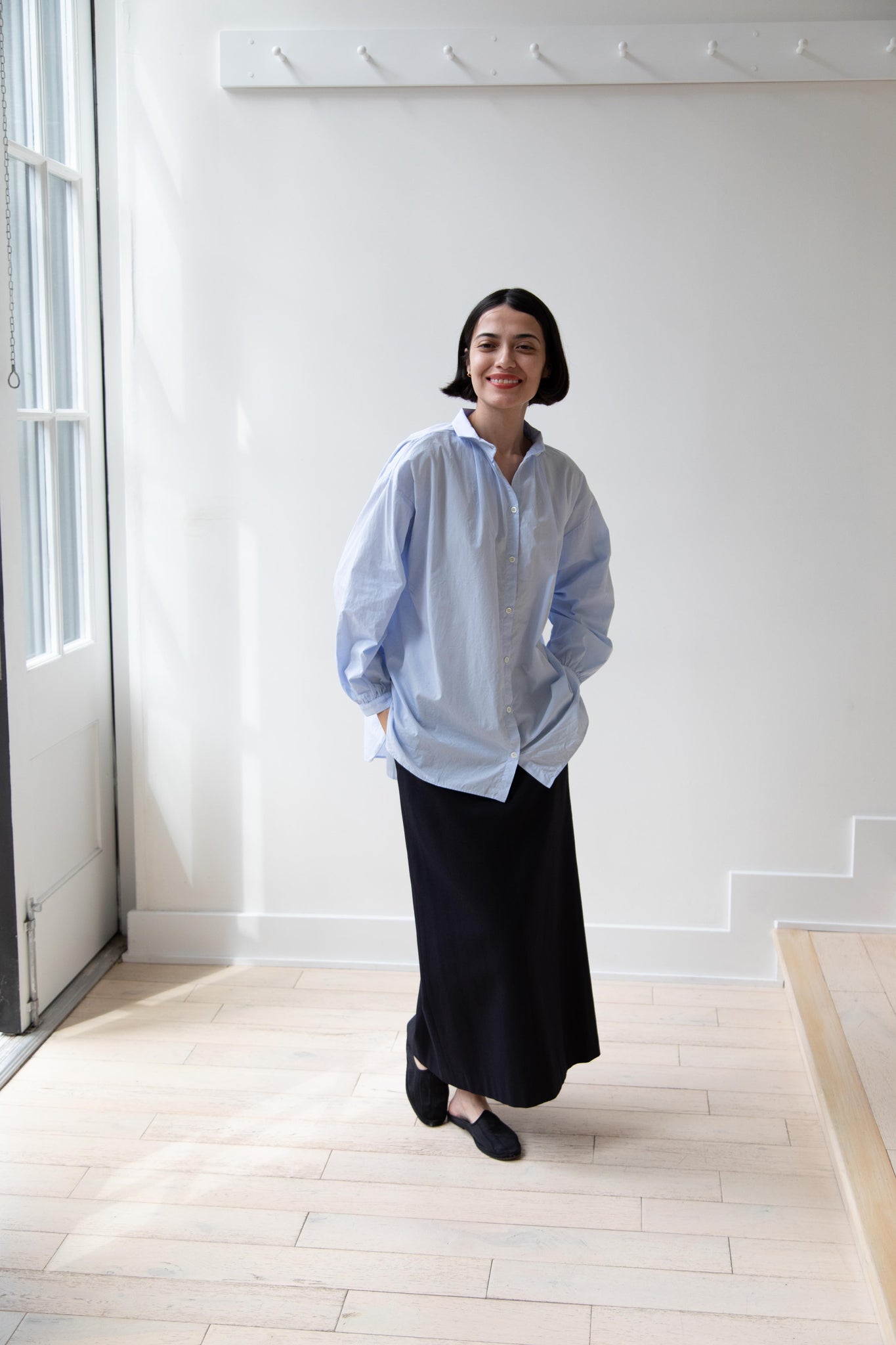 This top is so lovely and an instant spring classic with an easy, slightly oversized shape through the body. We love that this is a slightly different take on the classic button-down top. Made from cotton poplin, it gathers around the collar and the sleeve giving it a slight balloon to its shape. It looks great with skirts, pants, and dresses!