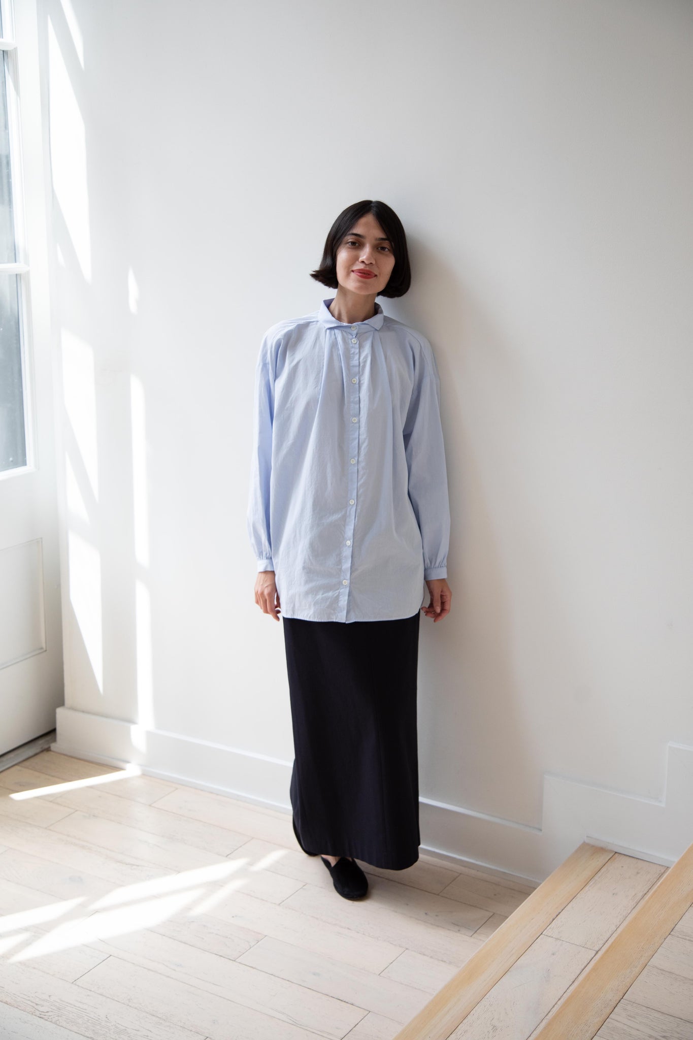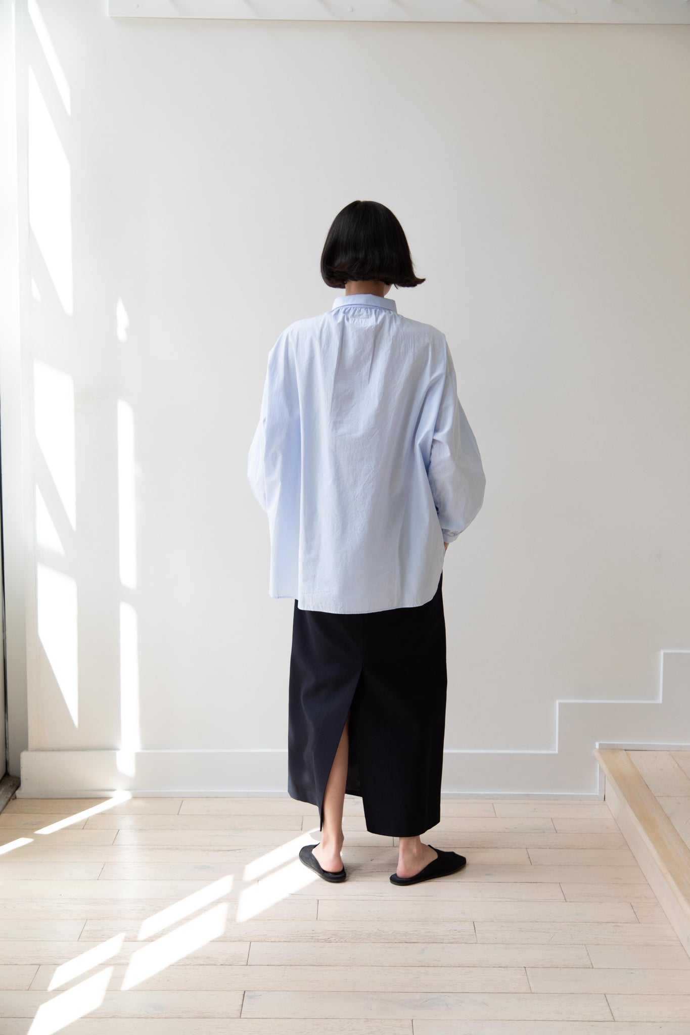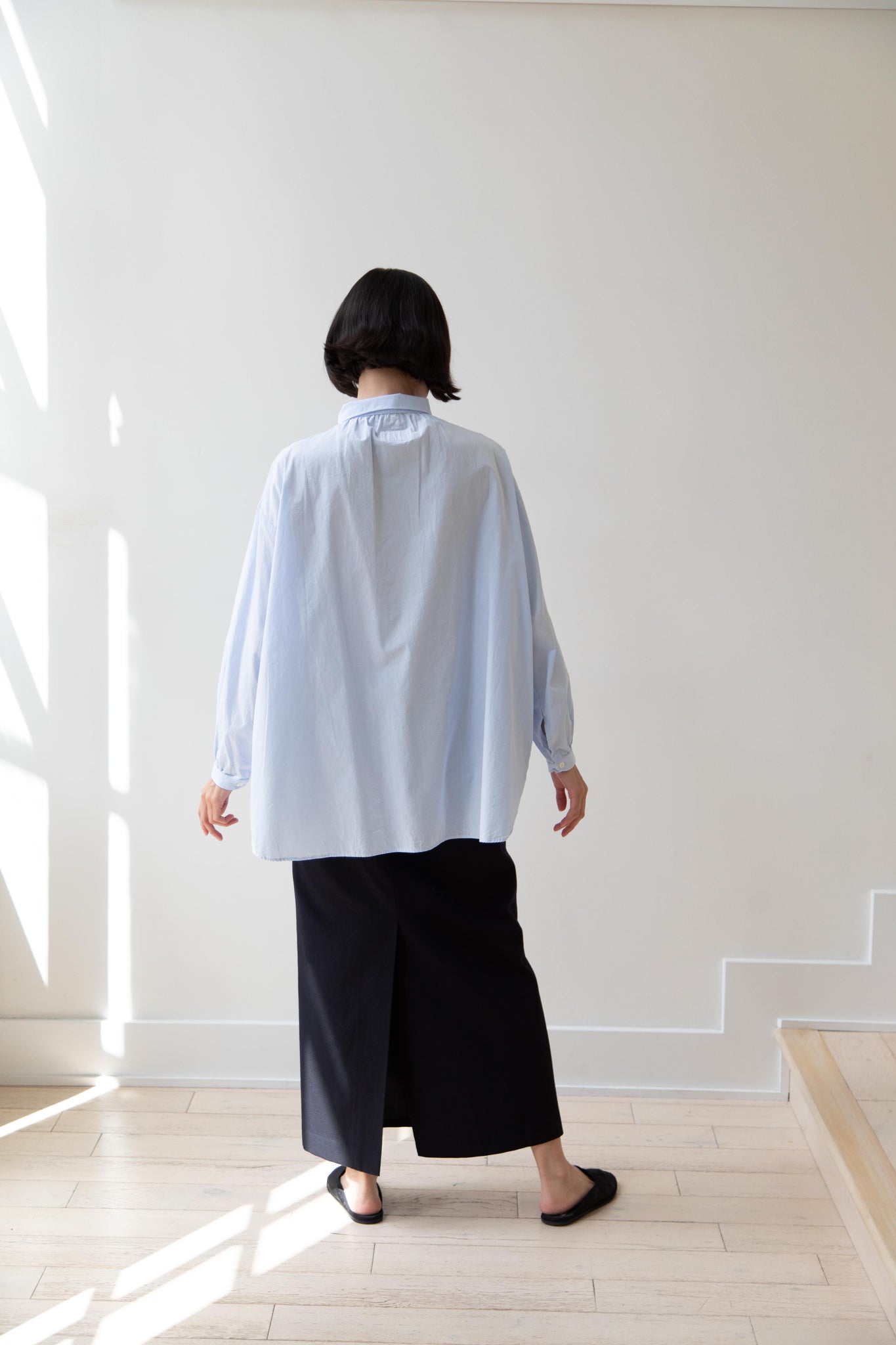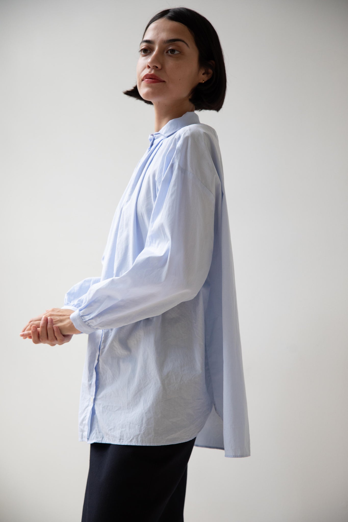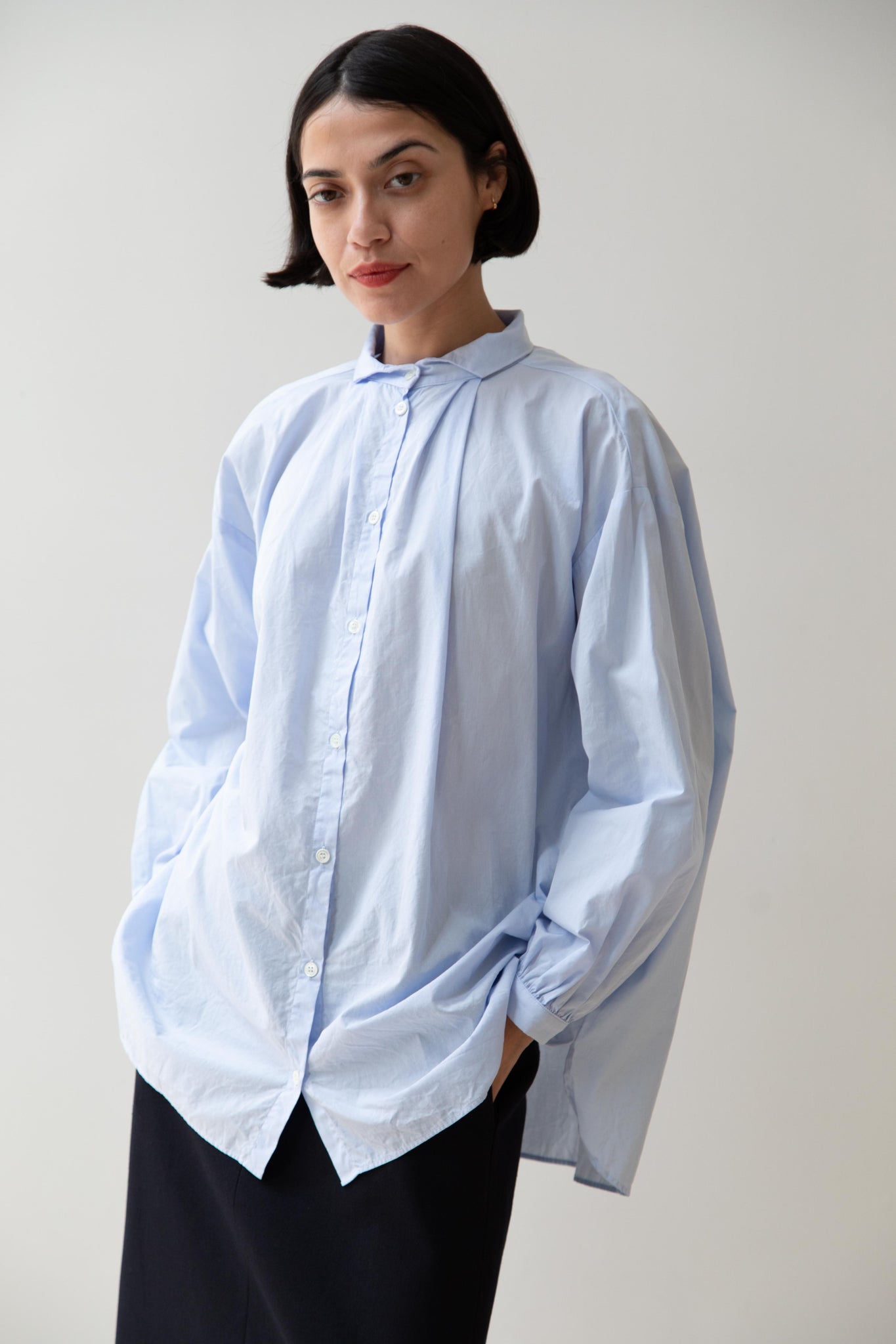 This top is so lovely and an instant spring classic with an easy, slightly oversized shape through the body. We love that this is a slightly different take on the classic button-down top. Made from cotton poplin, it gathers around the collar and the sleeve giving it a slight balloon to its shape. It looks great with skirts, pants, and dresses!