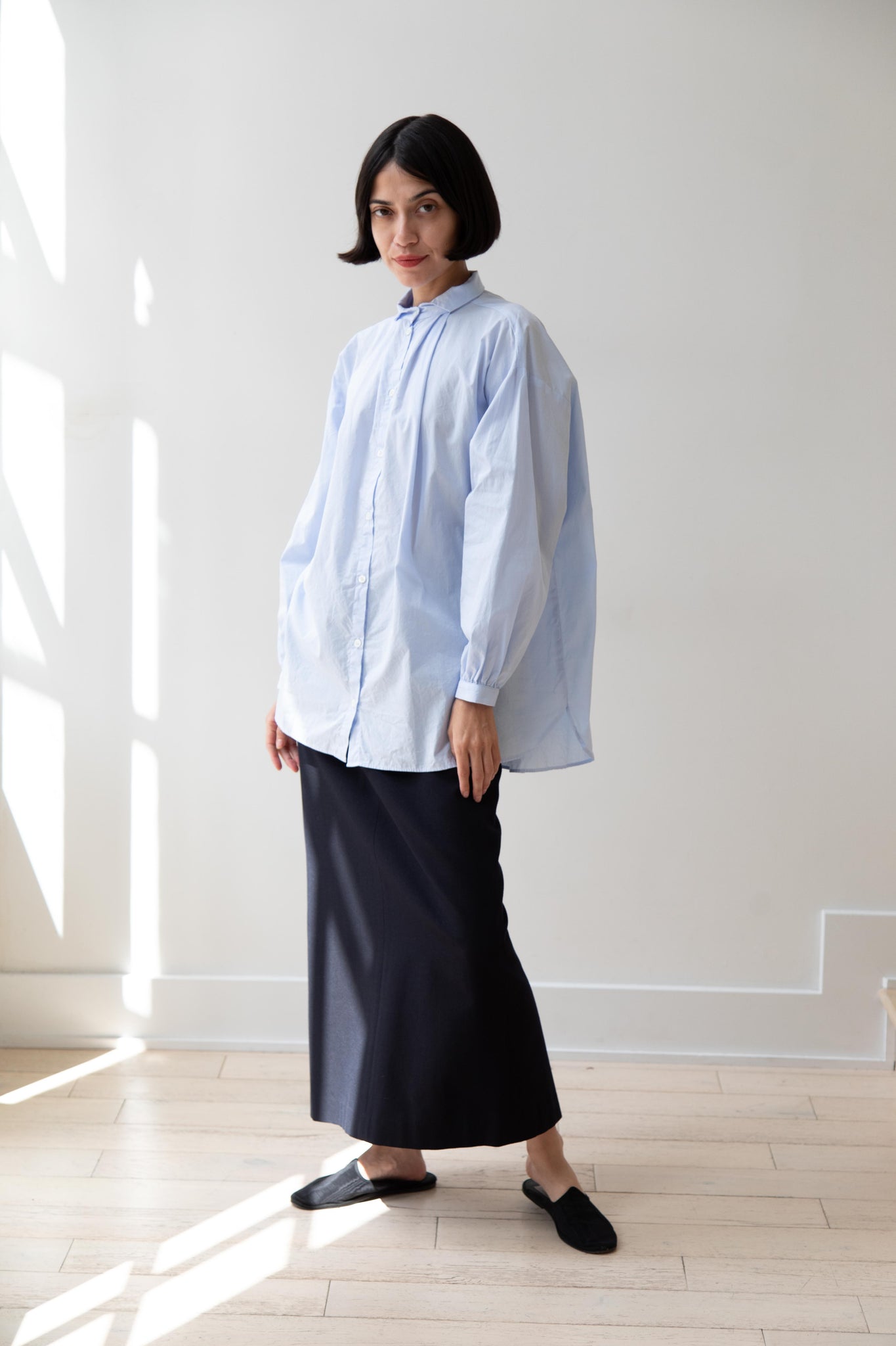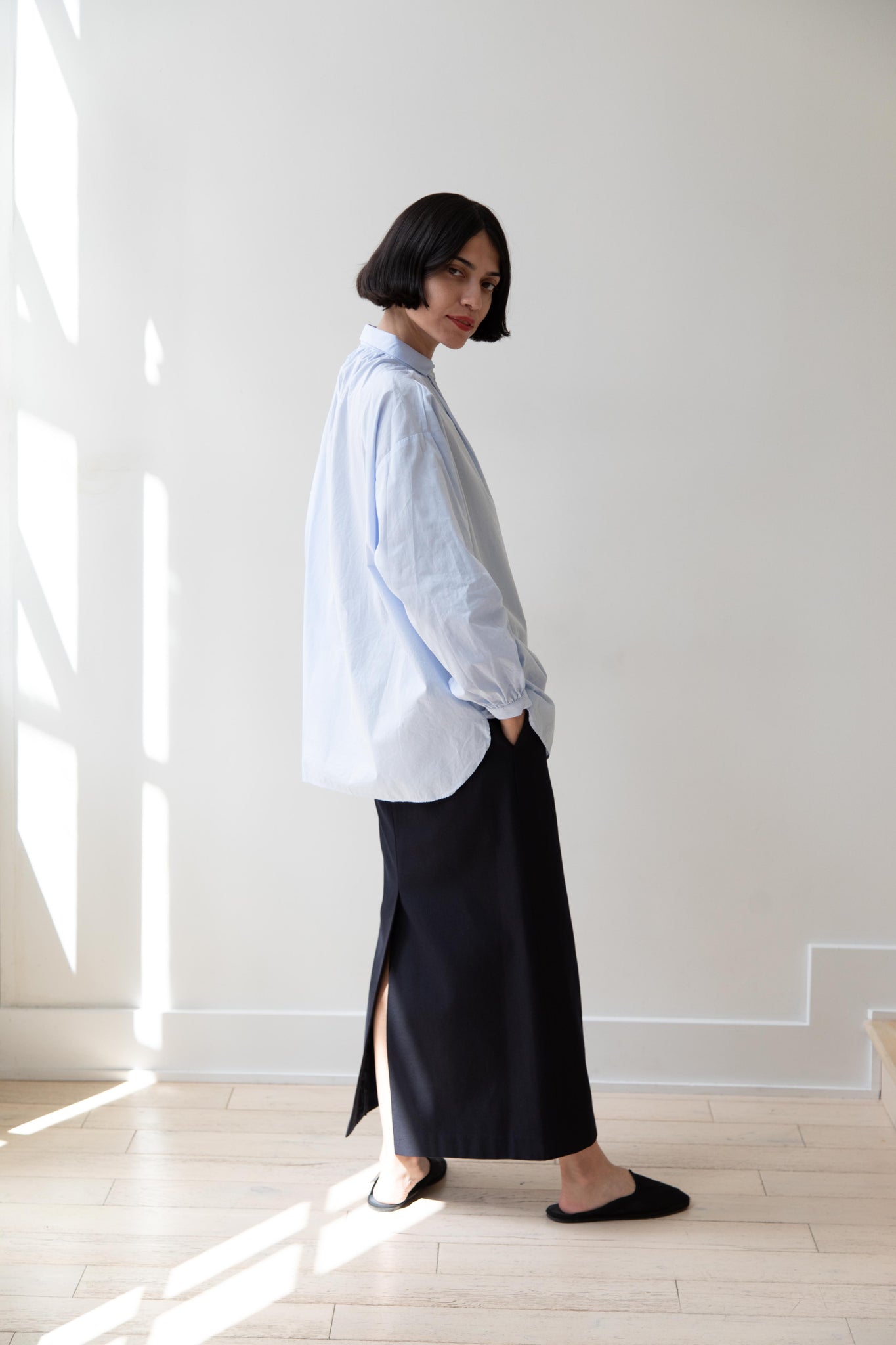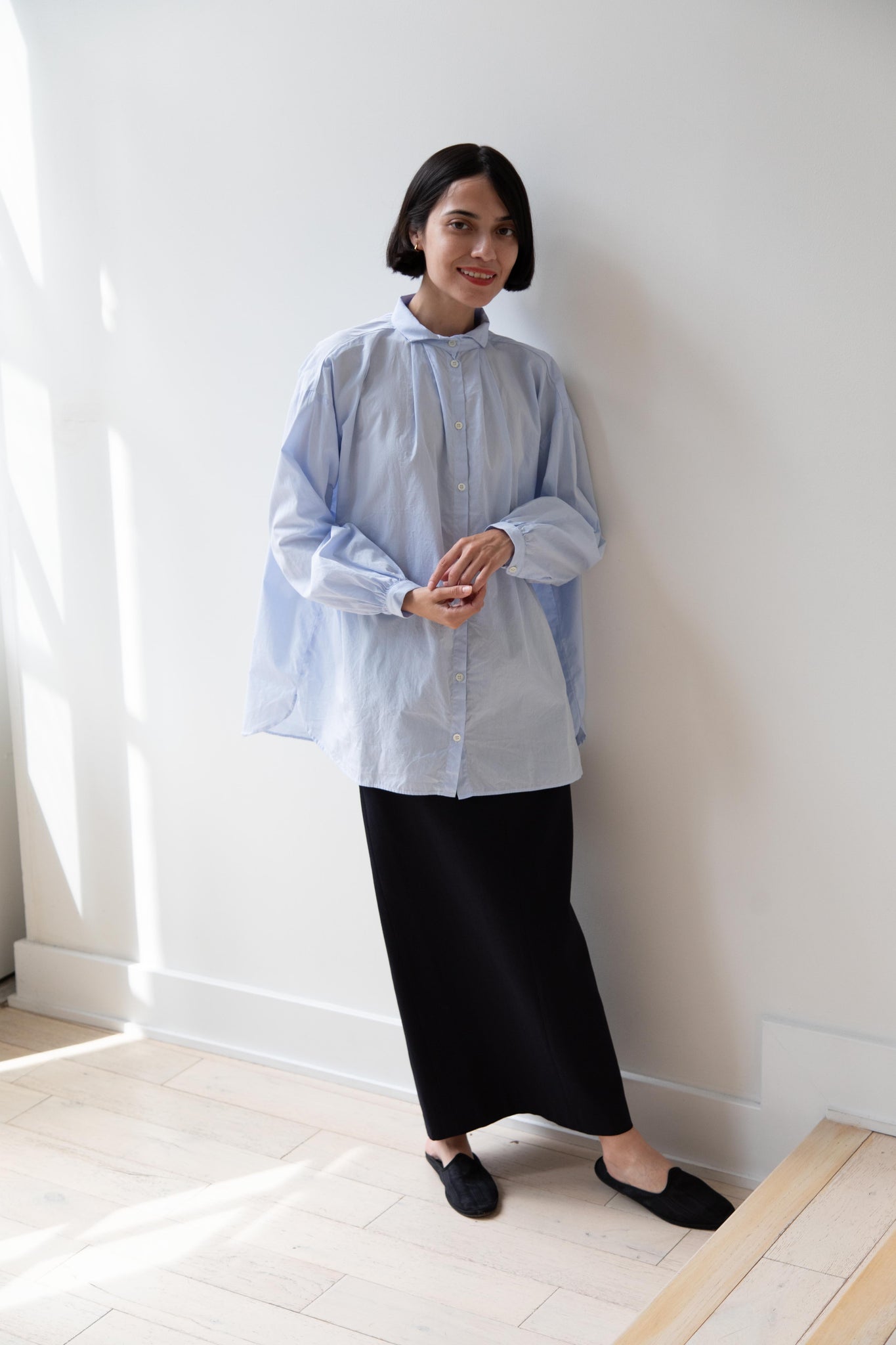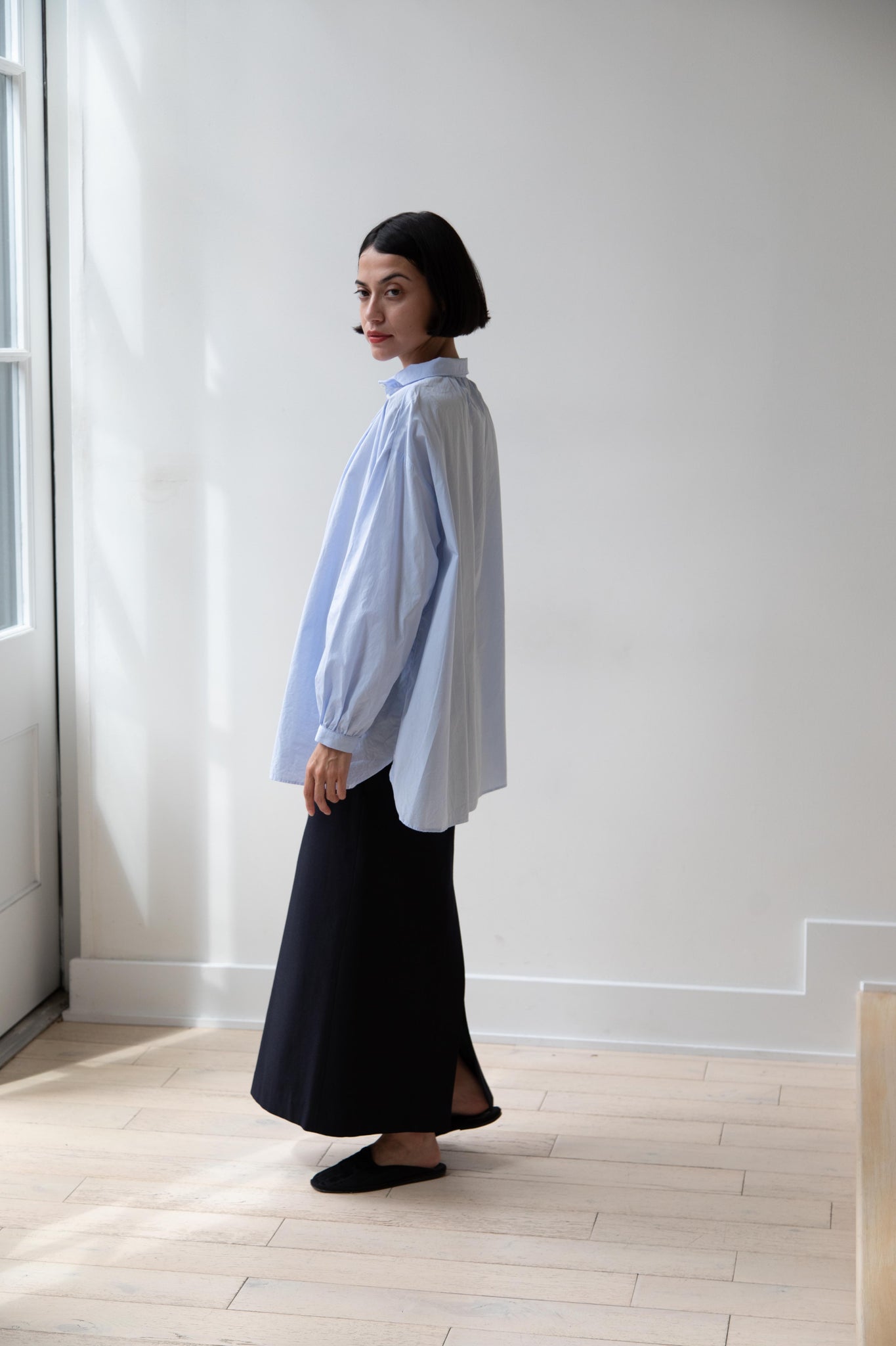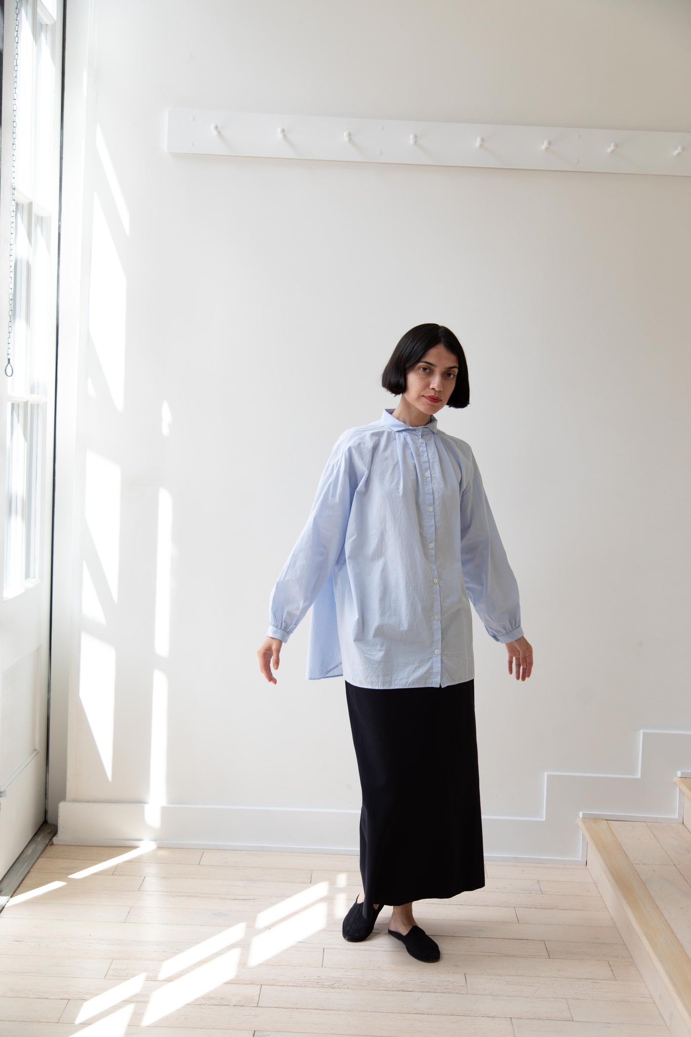 This top is so lovely and an instant spring classic with an easy, slightly oversized shape through the body. We love that this is a slightly different take on the classic button-down top. Made from cotton poplin, it gathers around the collar and the sleeve giving it a slight balloon to its shape. It looks great with skirts, pants, and dresses!